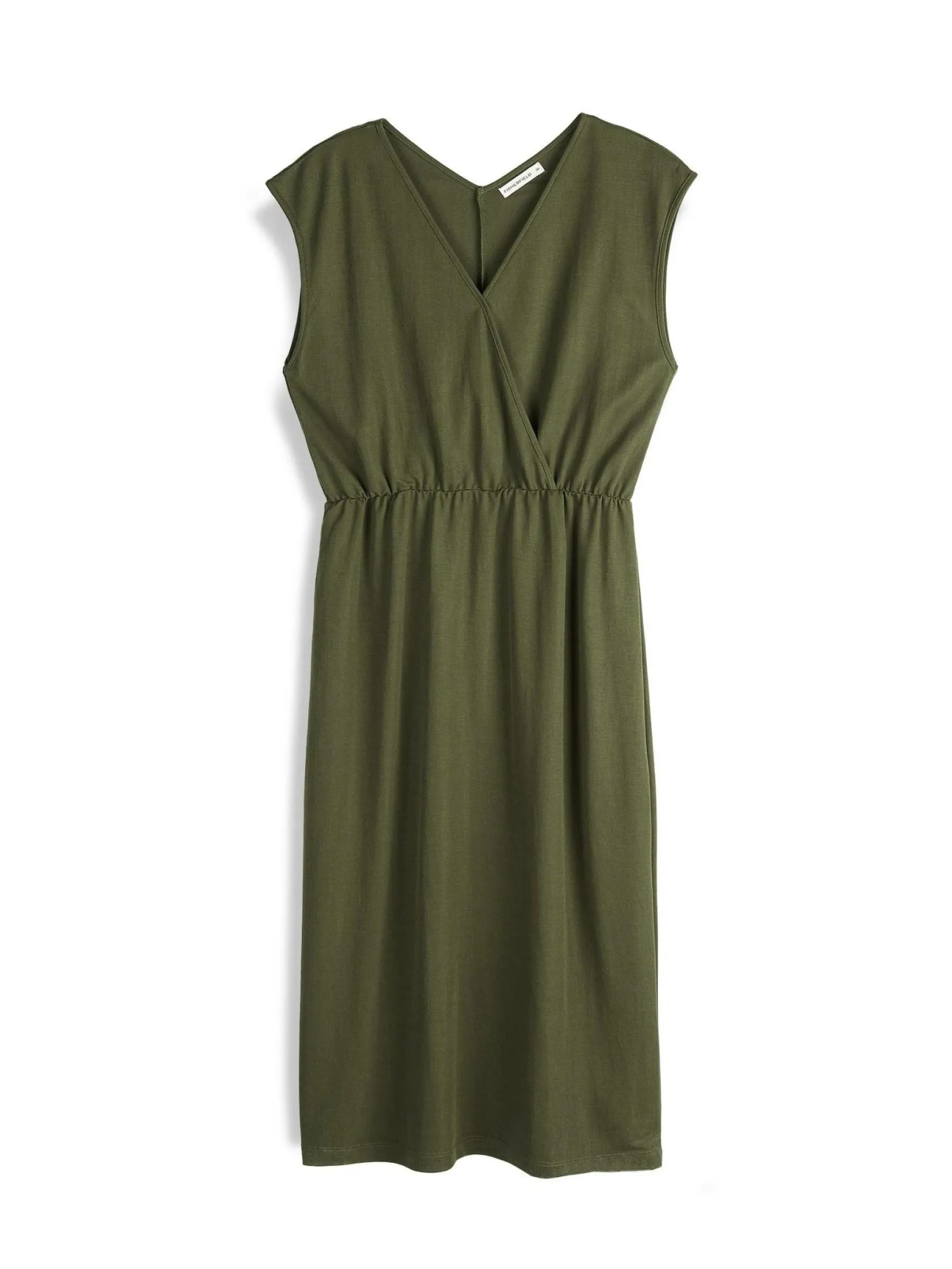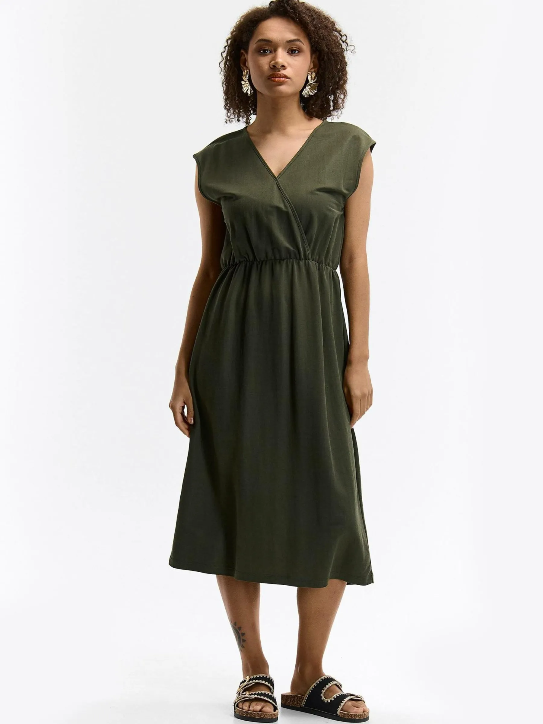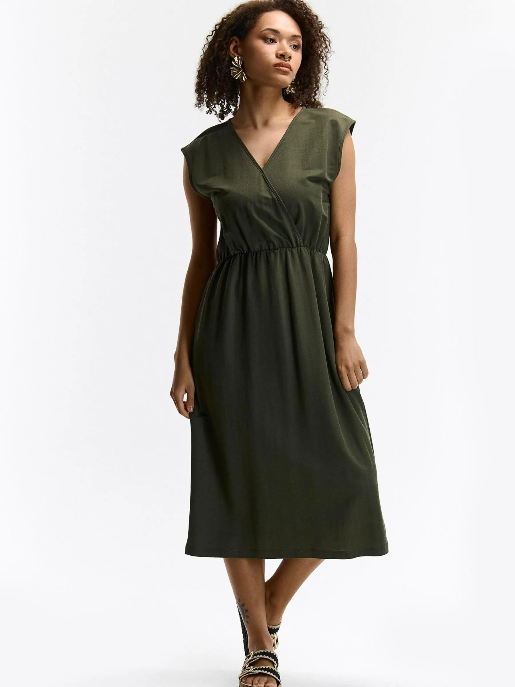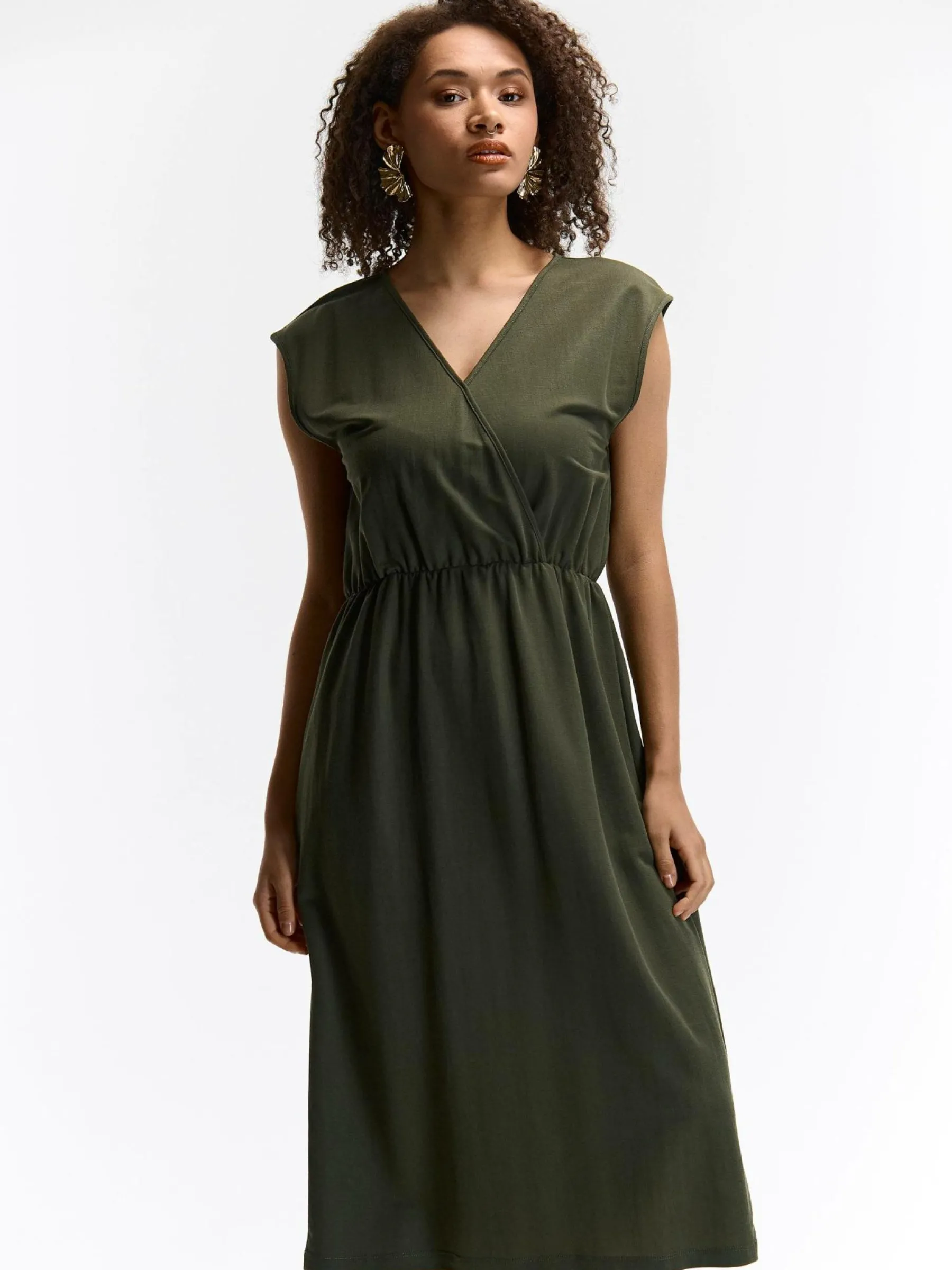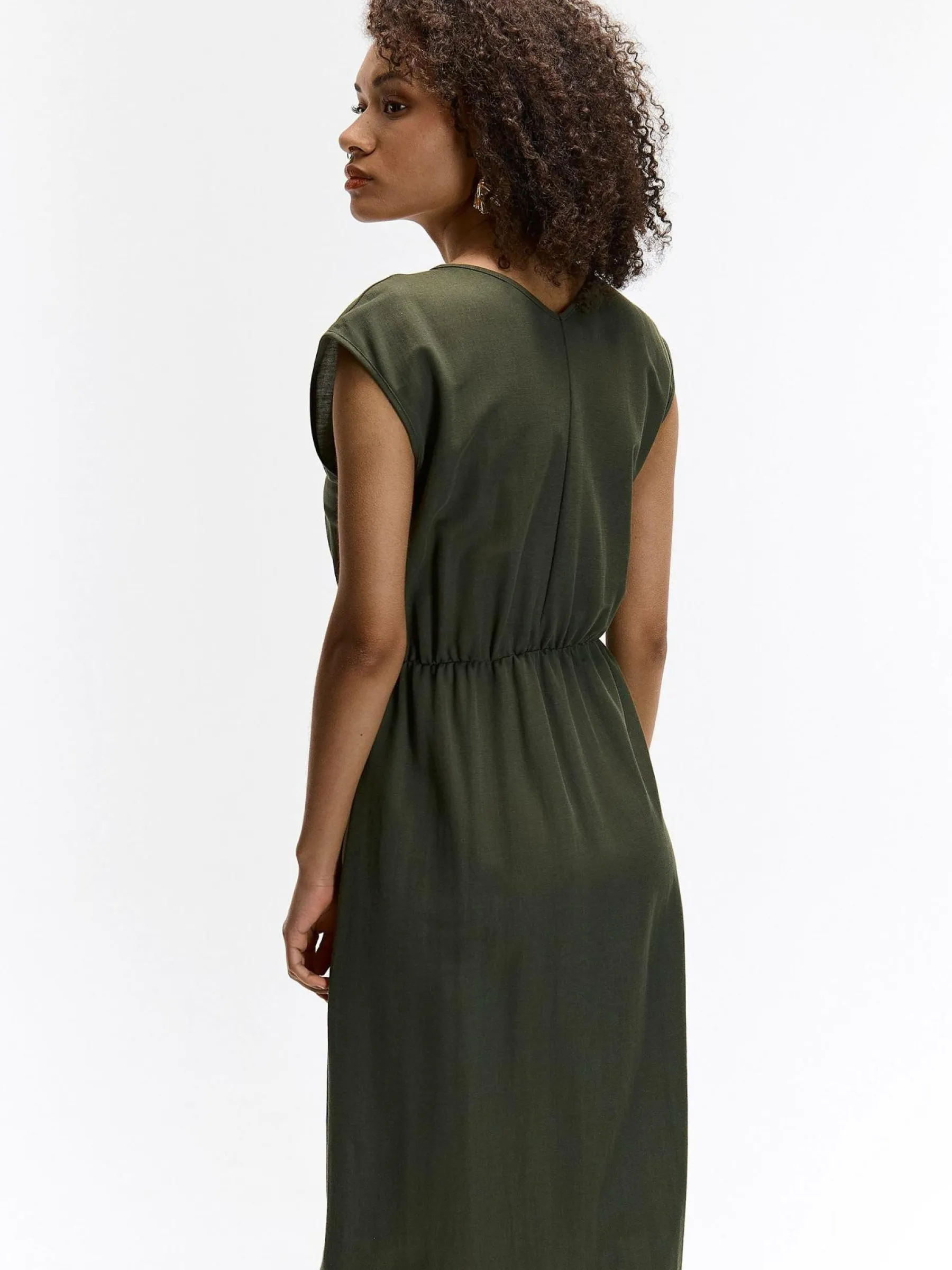 Kolor: khakiKrój: kopertówkiTyp: sukienkaRekaw: bez rękawówDługość: midiPattern style: pojedynczy kolorDetal: v-n…