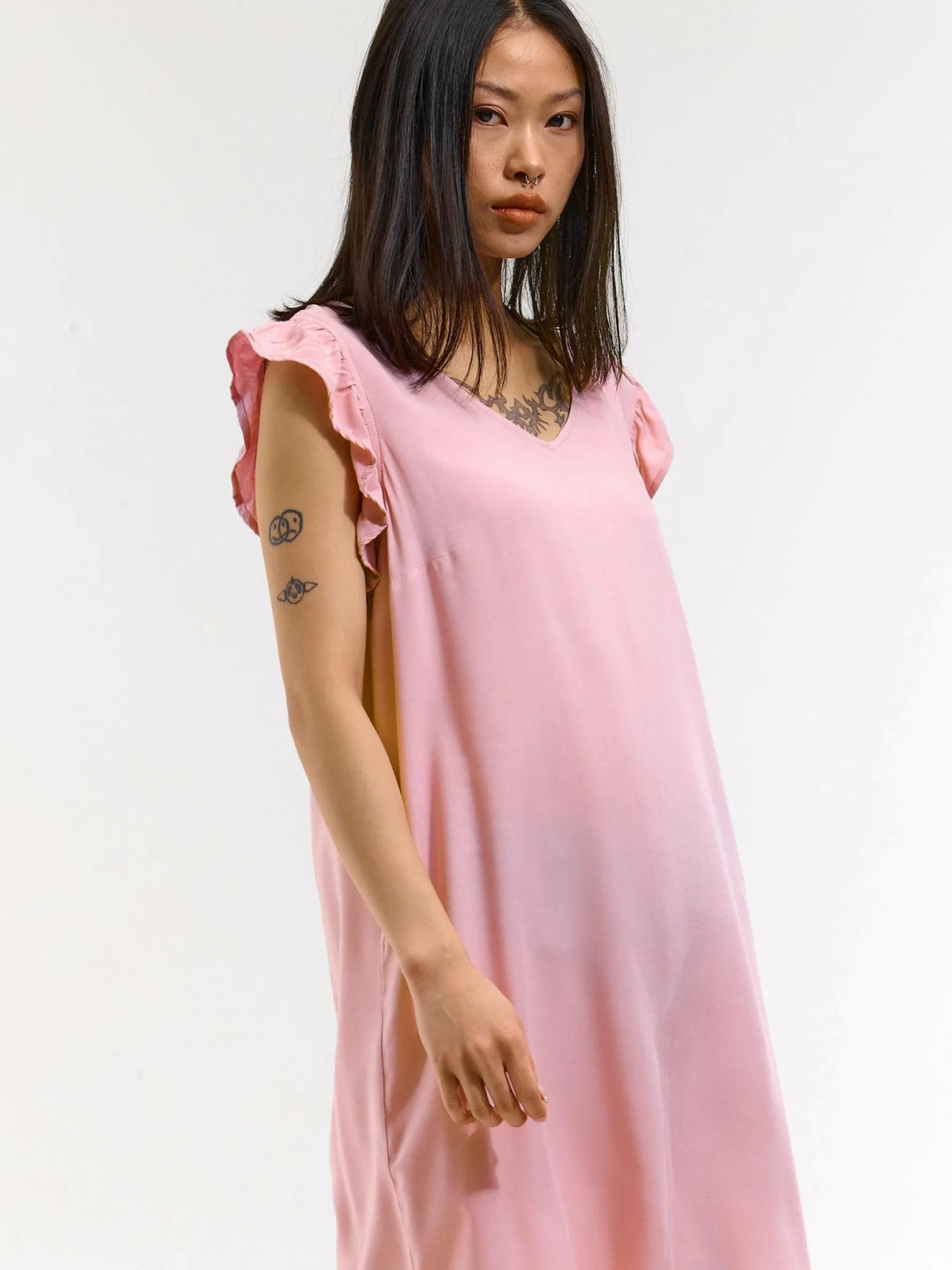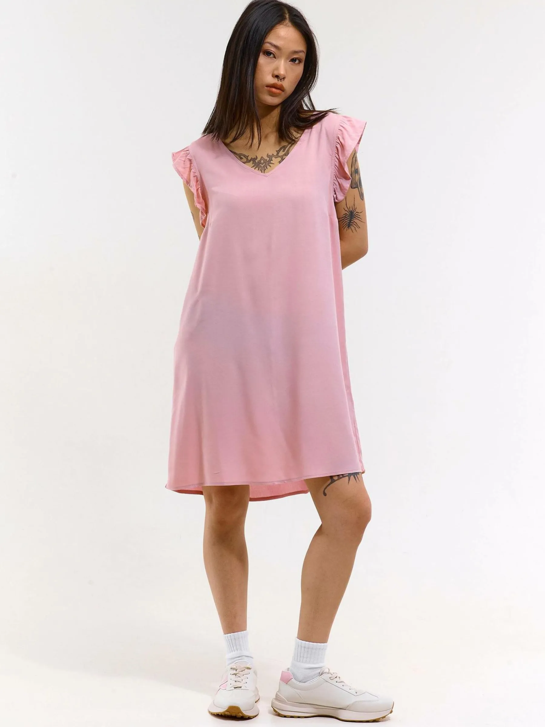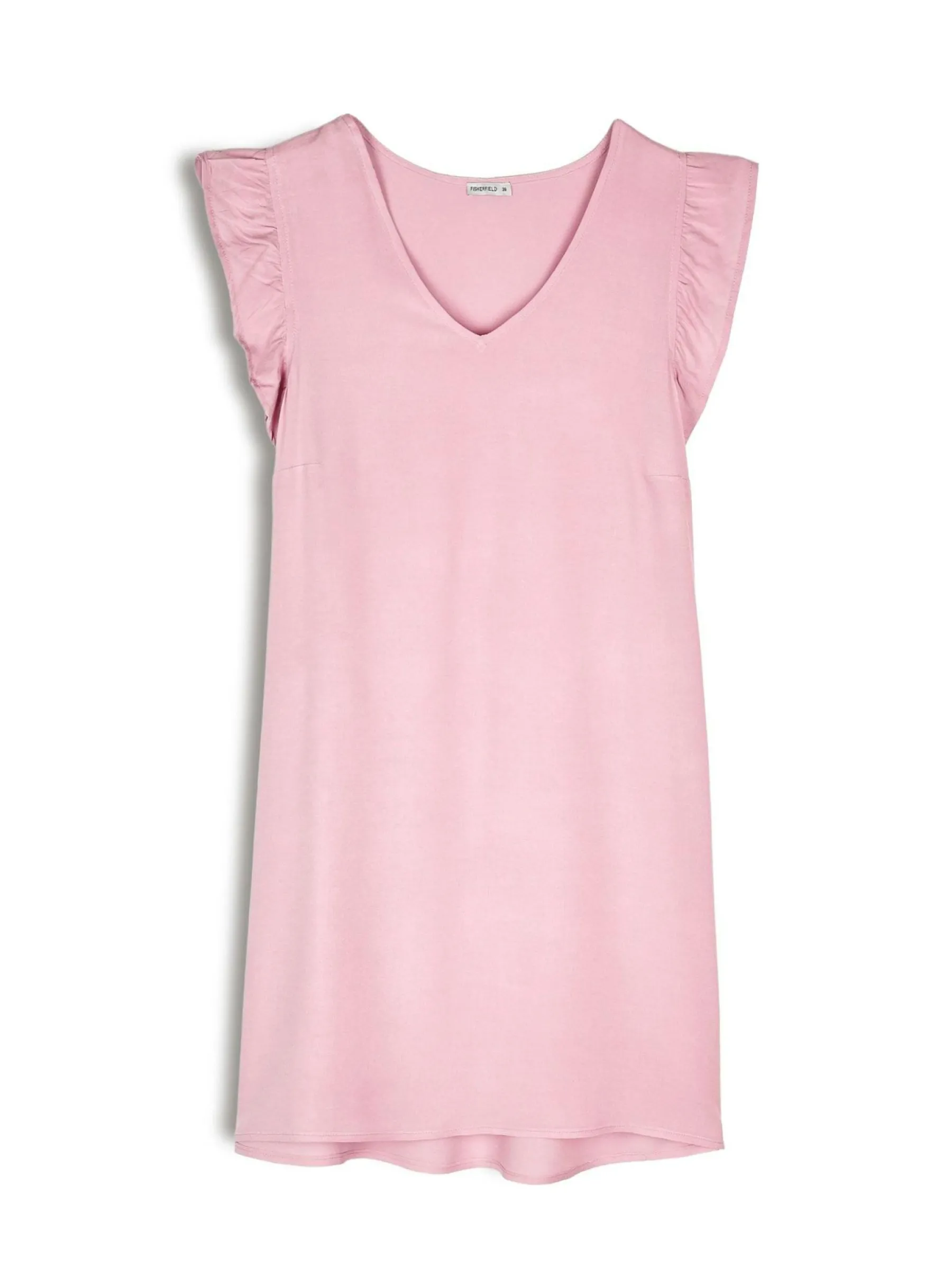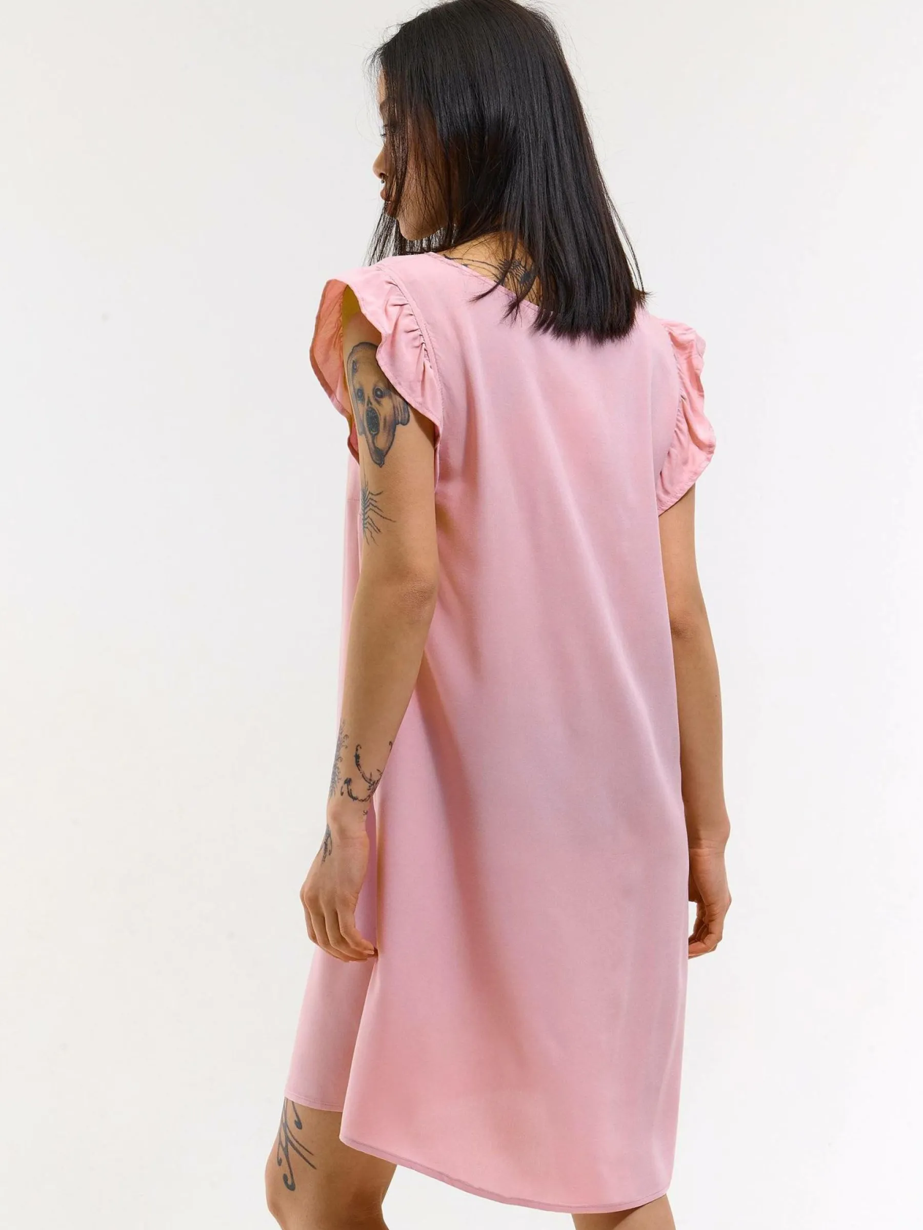 Kolor: różowyKrój: regular, z falbanąTyp: sukienkaRekaw: krótki rękawDługość: miniPattern style: pojedynczy kol…