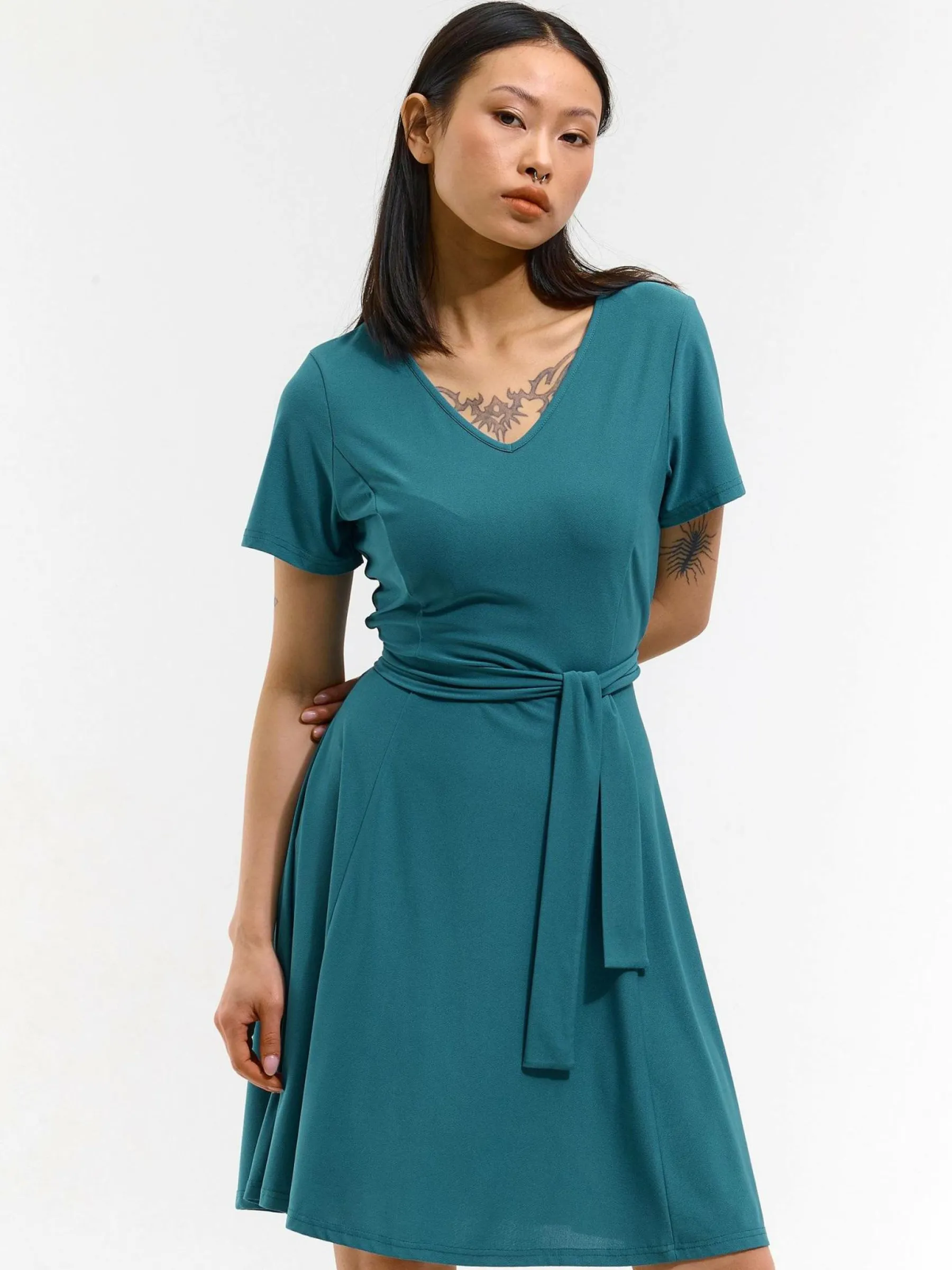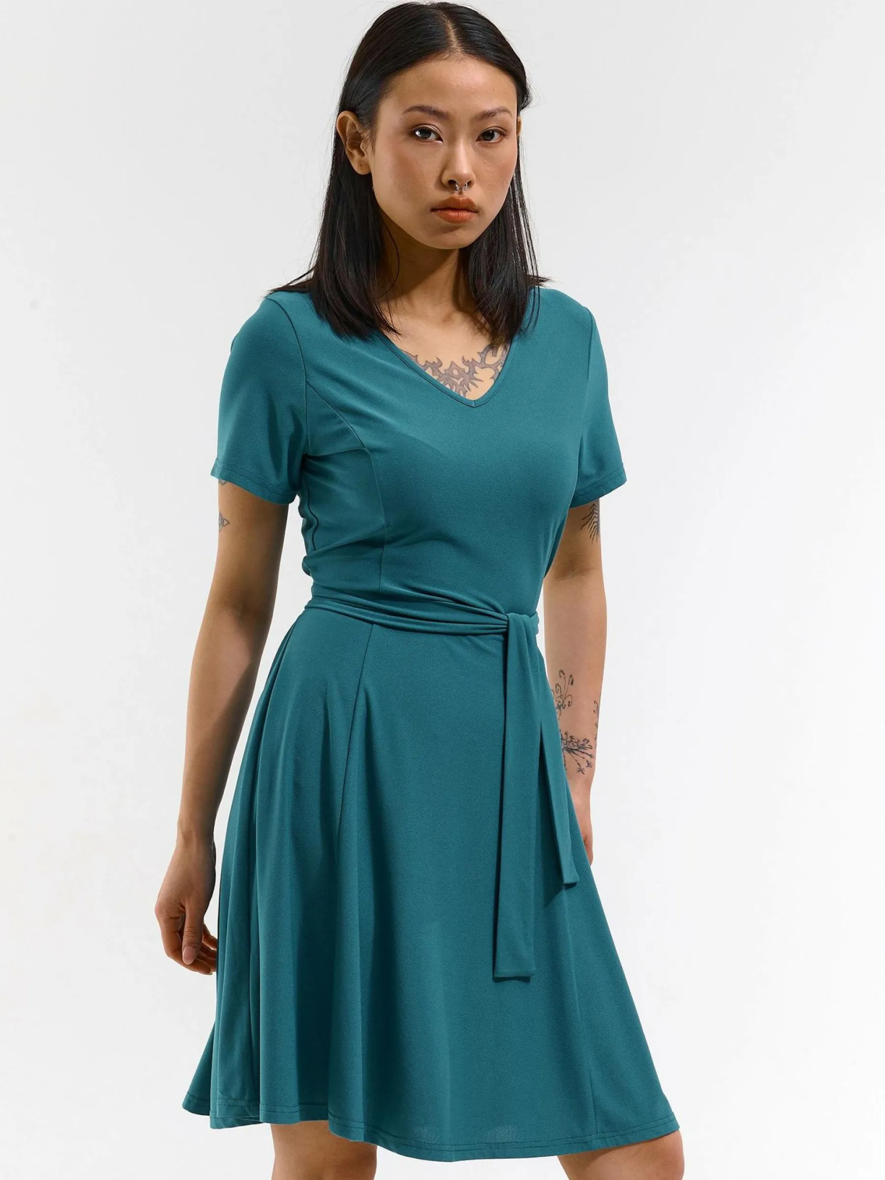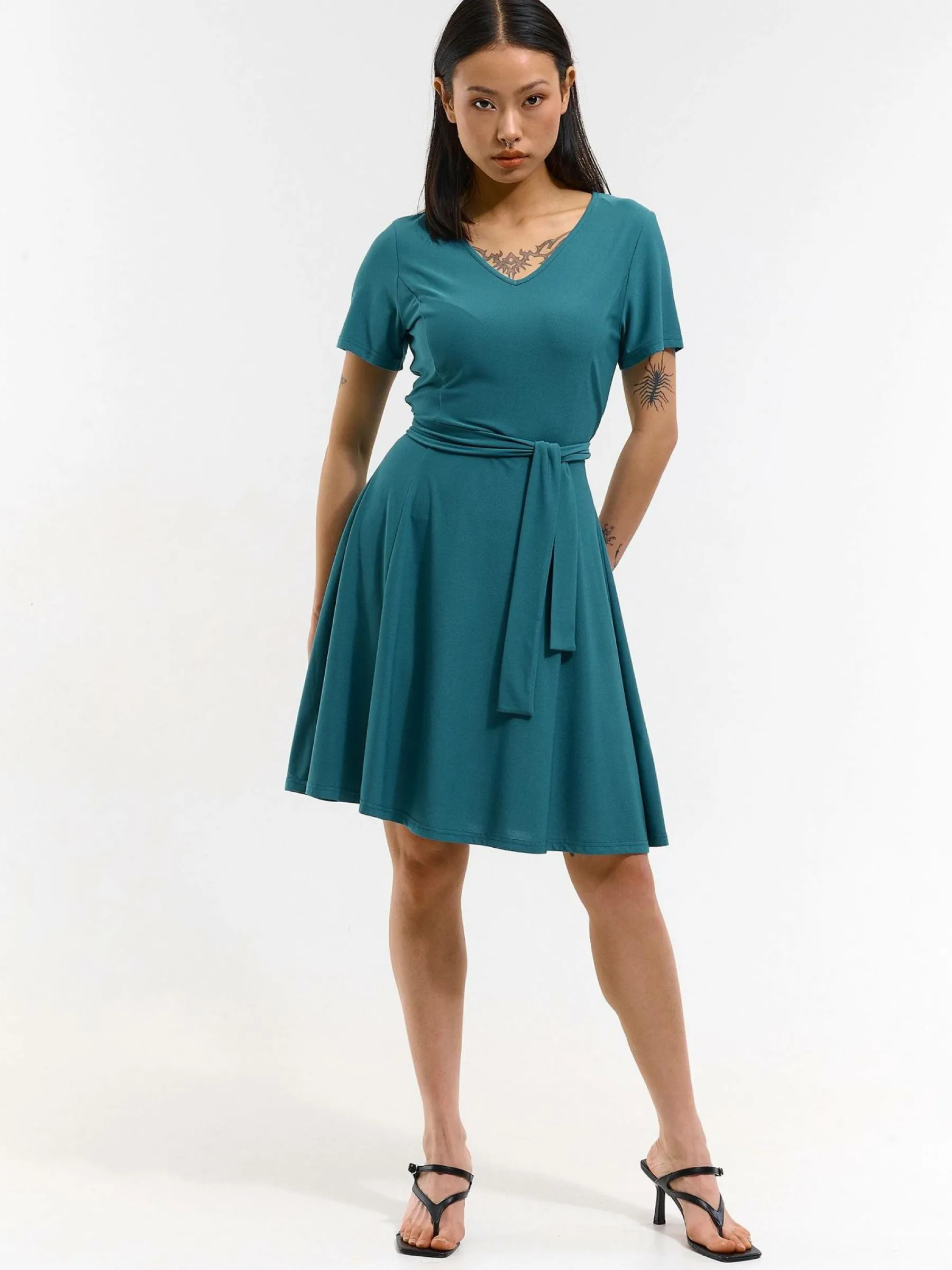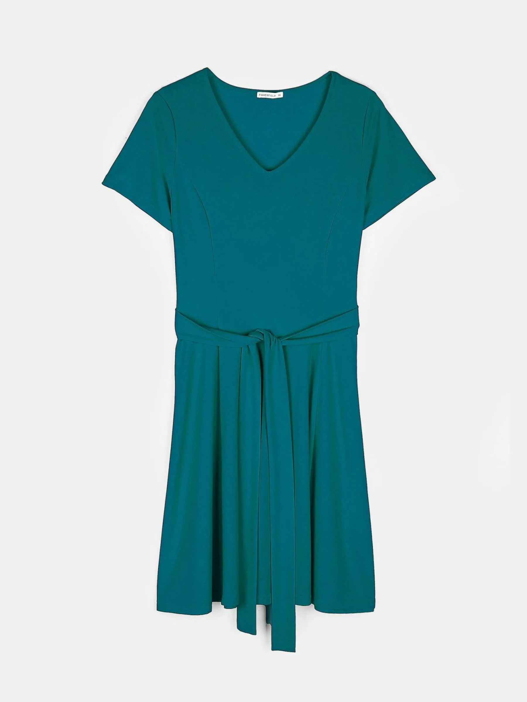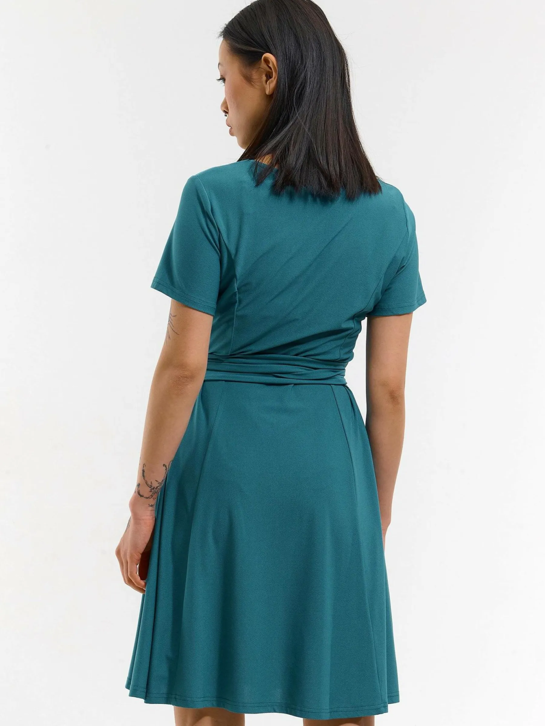 Kolor: zielonyKrój: asyTyp: sukienkaRekaw: krótki rękawDługość: miniPattern style: pojedynczy kolorDetal: v-neck, …