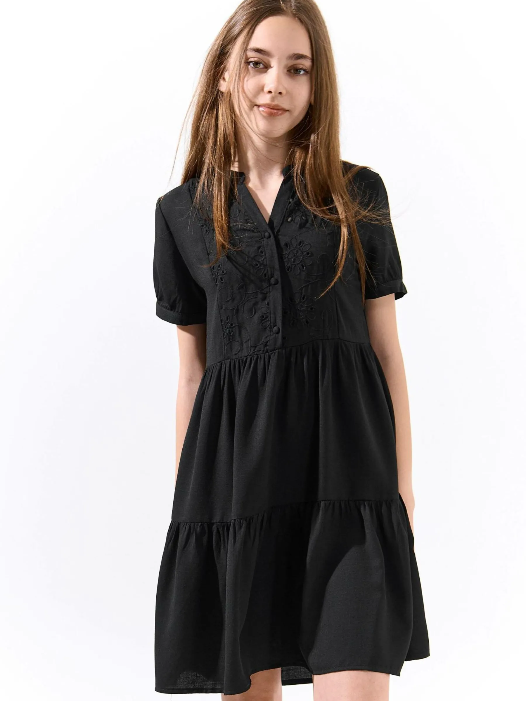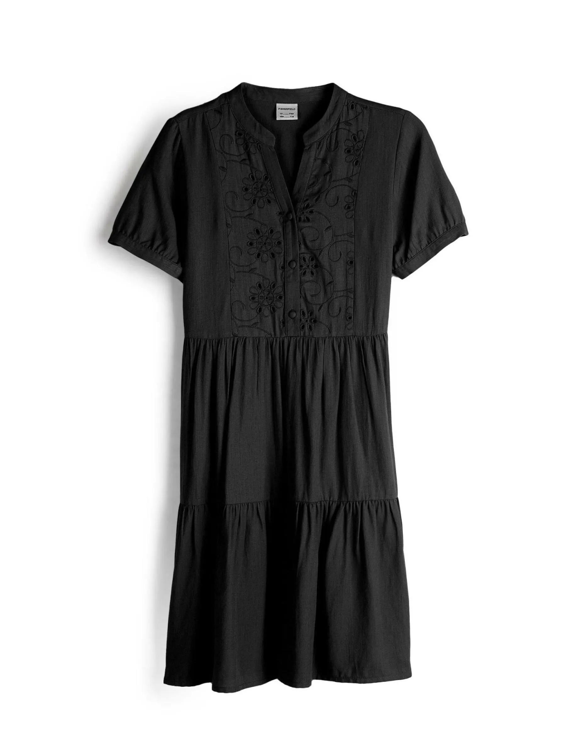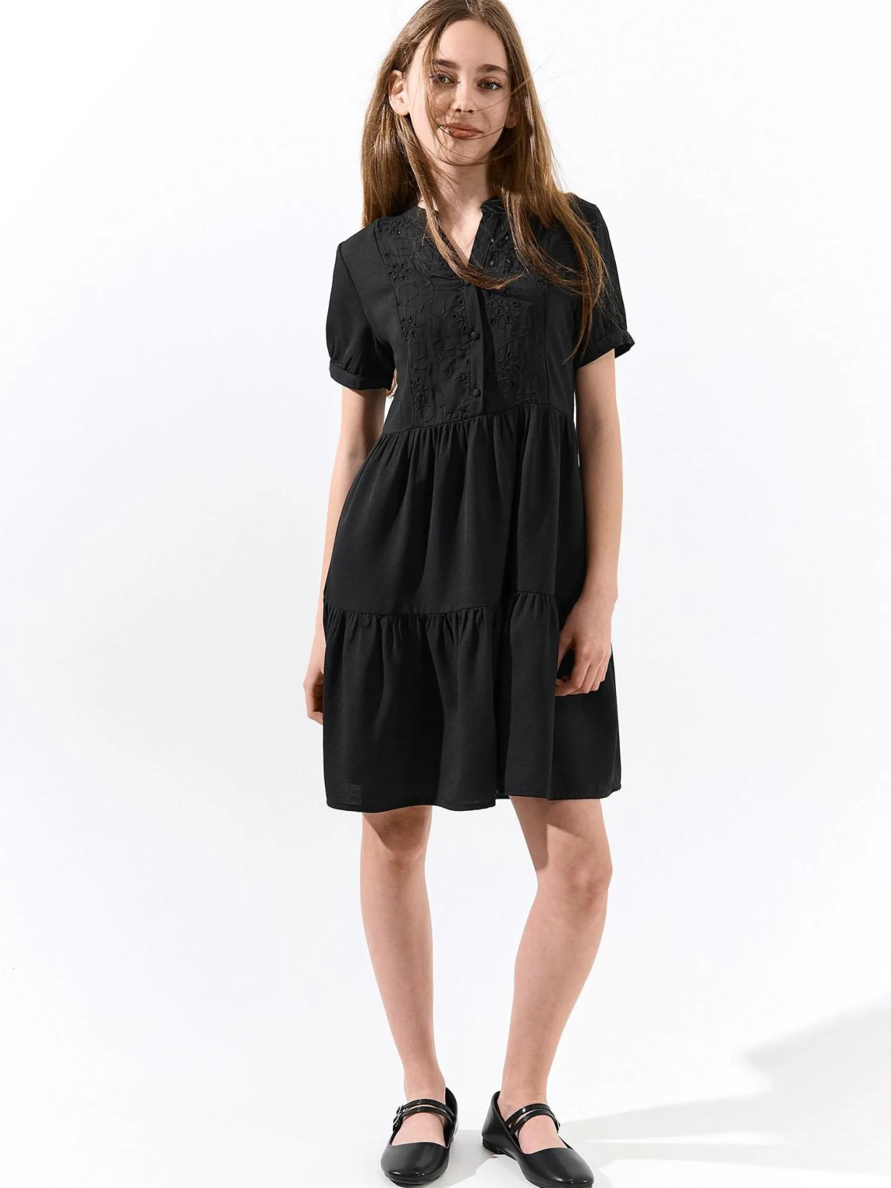 Kolor: czarnyKrój: z falbanąTyp: sukienkaRekaw: krótki rękawDługość: miniPattern style: pojedynczy kolor, haftowa…