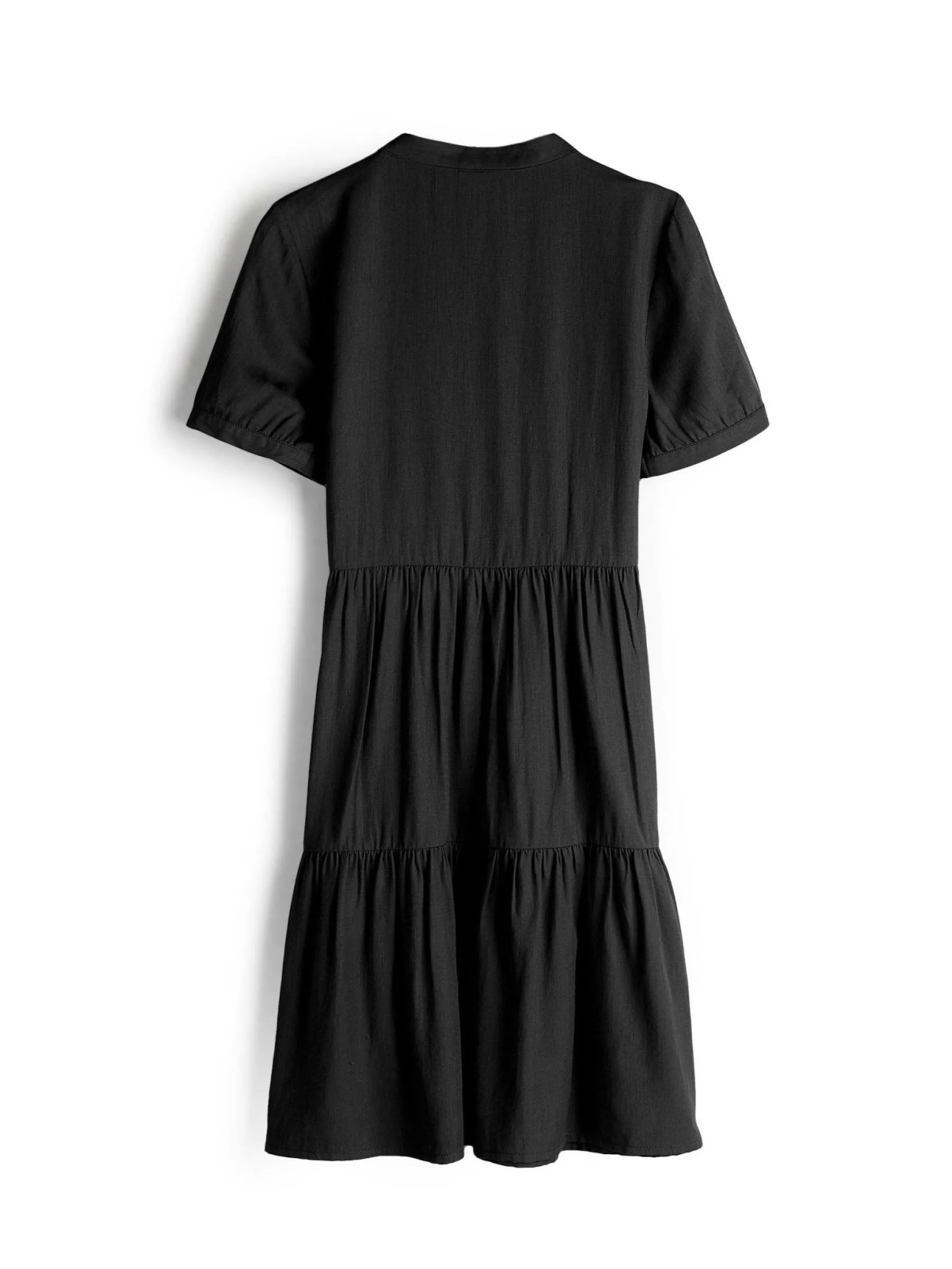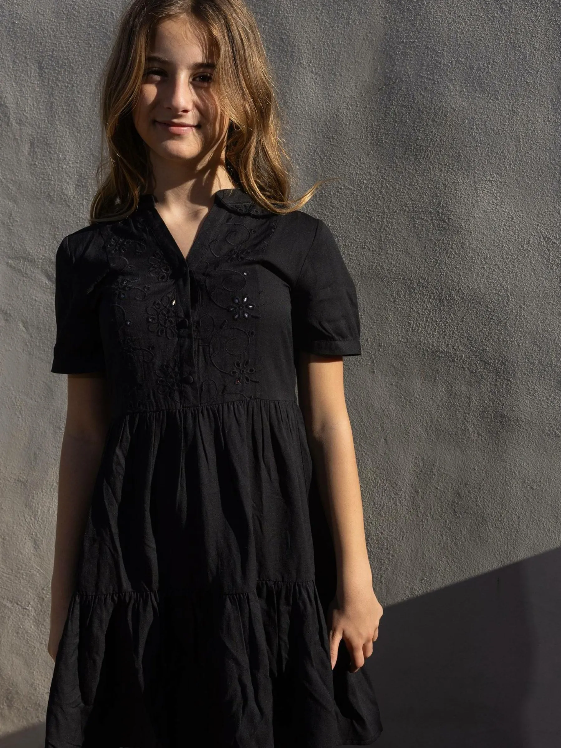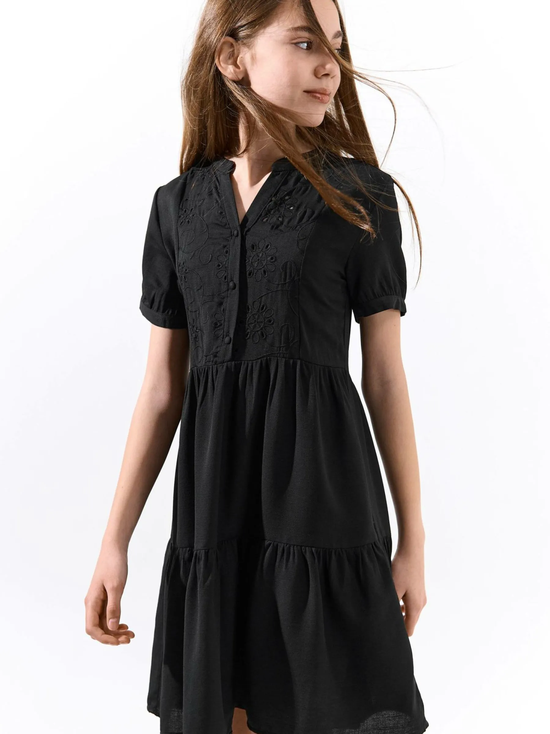 Kolor: czarnyKrój: z falbanąTyp: sukienkaRekaw: krótki rękawDługość: miniPattern style: pojedynczy kolor, haftowa…