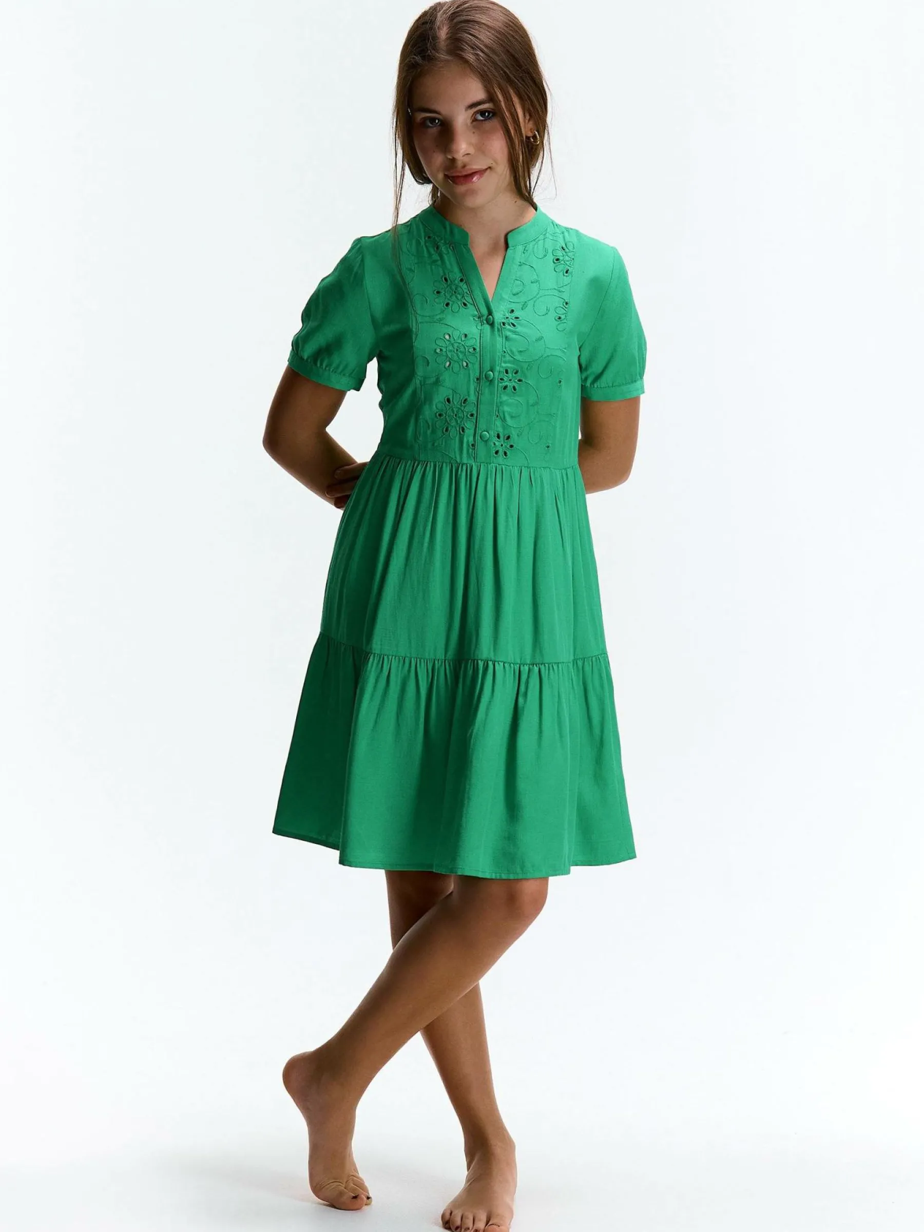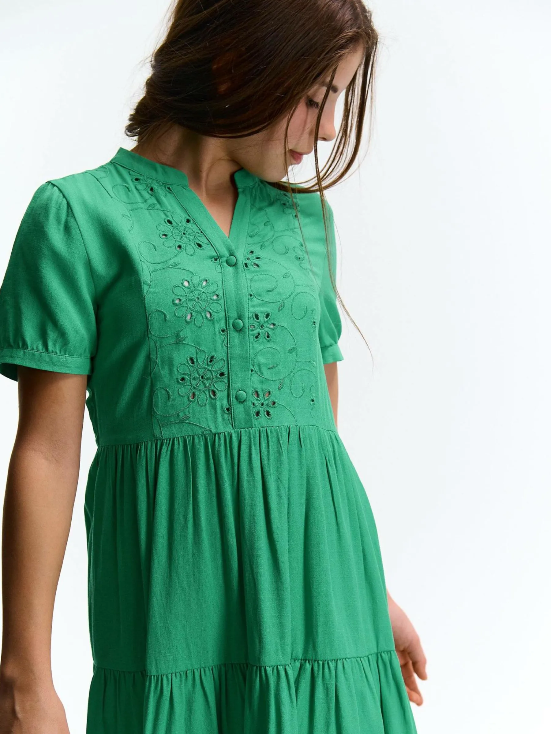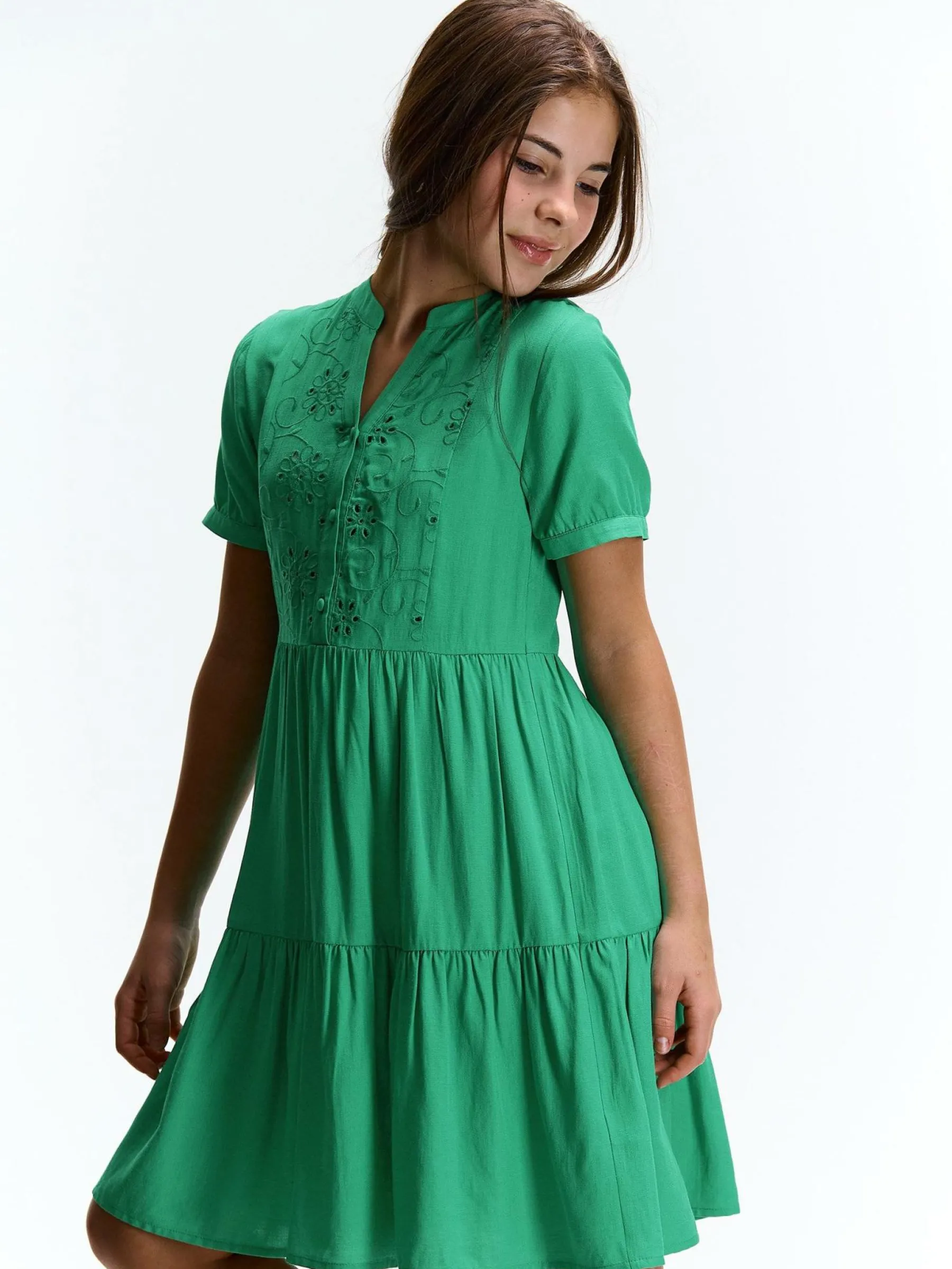 Kolor: zielonyKrój: z falbanąTyp: sukienkaRekaw: krótki rękawDługość: miniPattern style: pojedynczy kolor, haftow…
