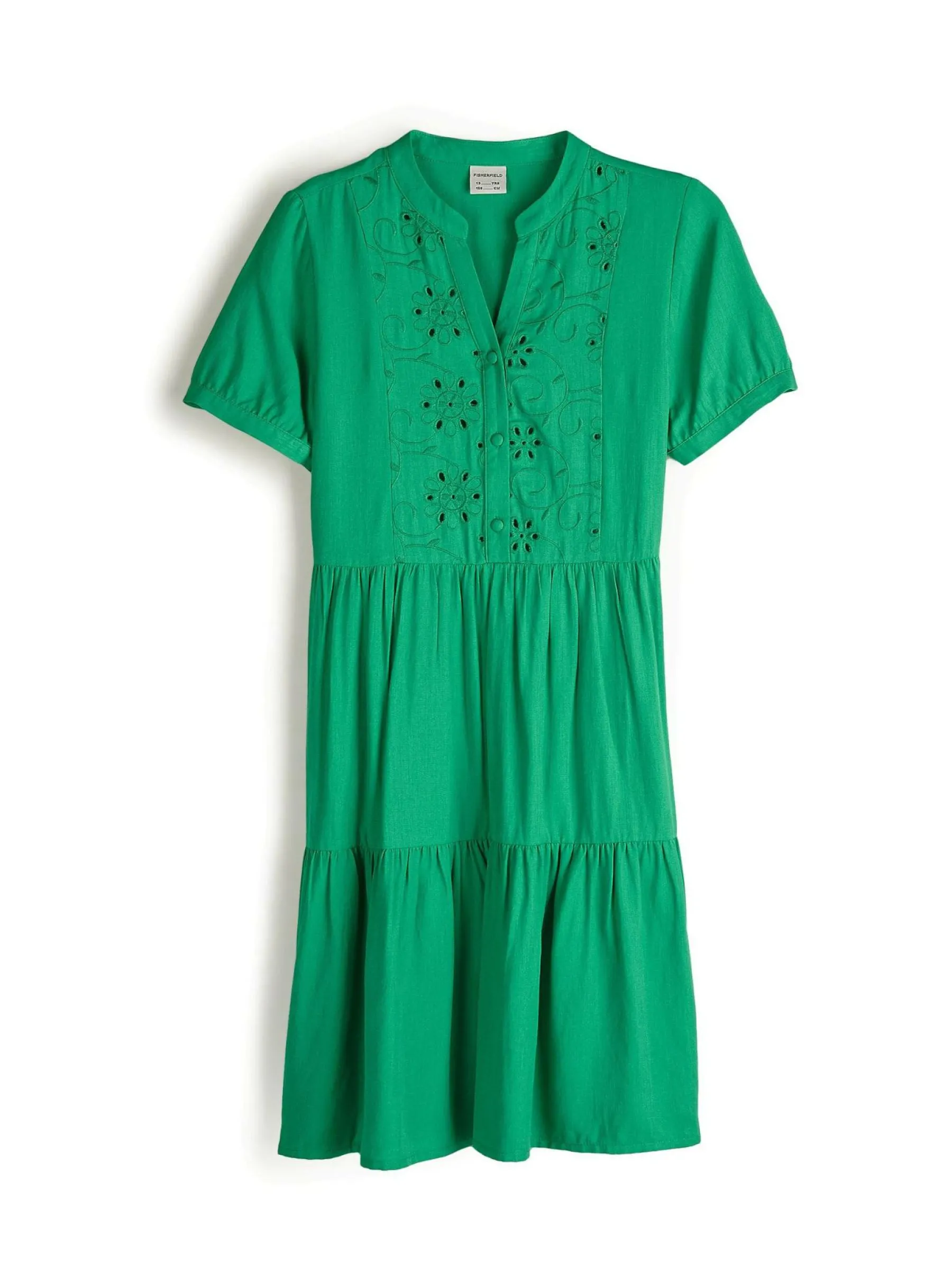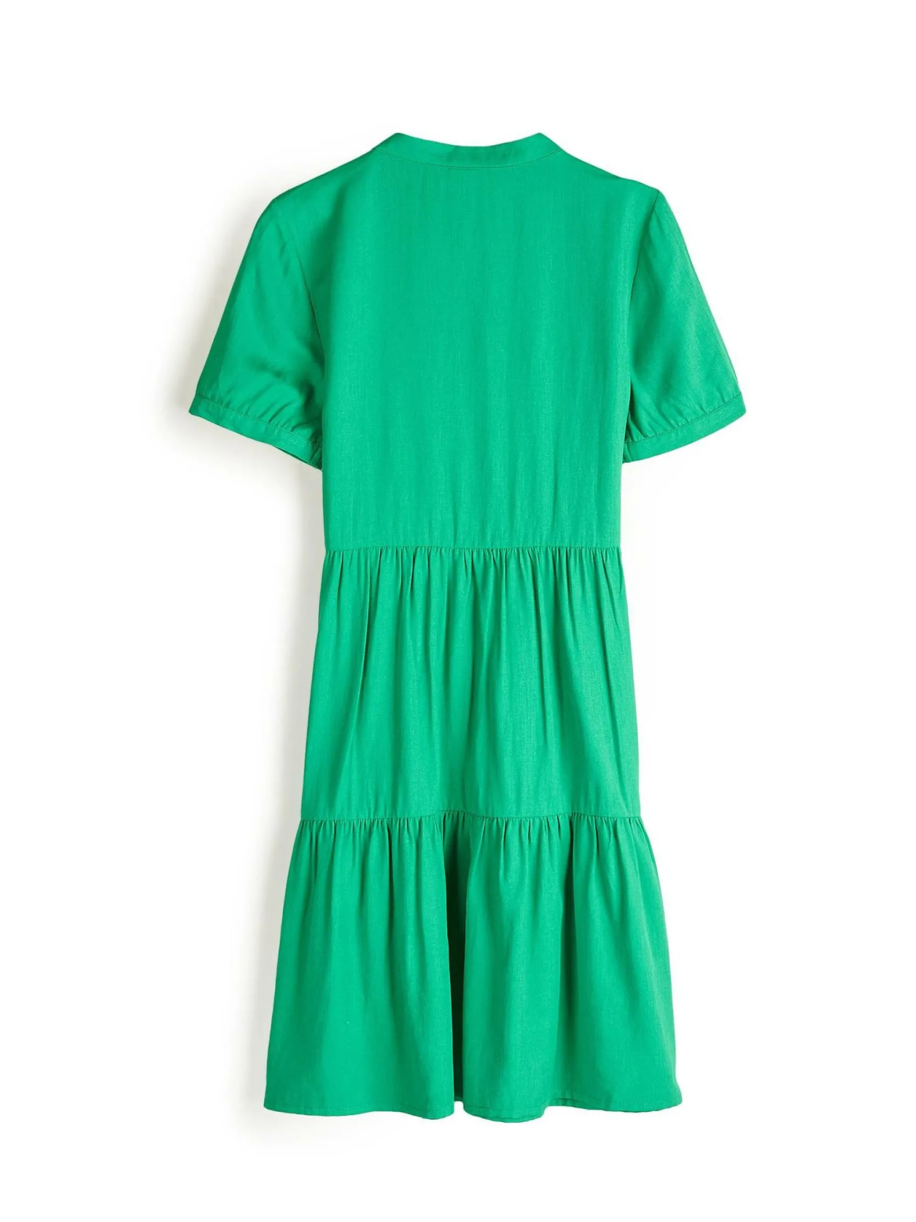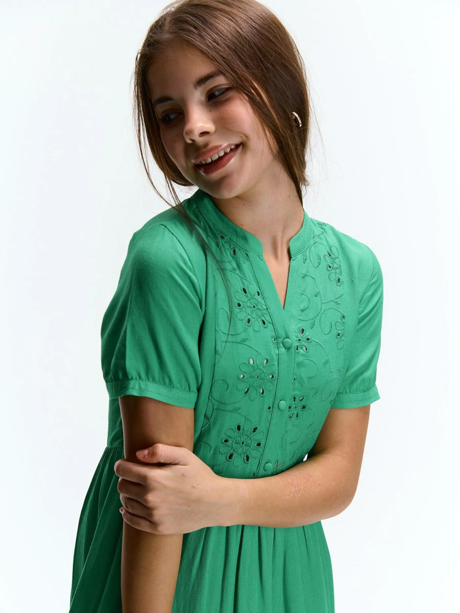 Kolor: zielonyKrój: z falbanąTyp: sukienkaRekaw: krótki rękawDługość: miniPattern style: pojedynczy kolor, haftow…