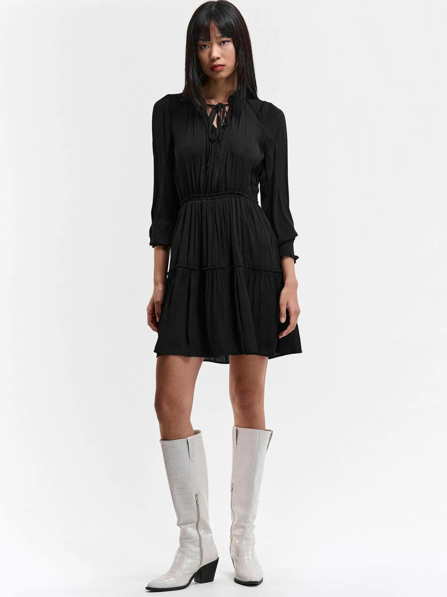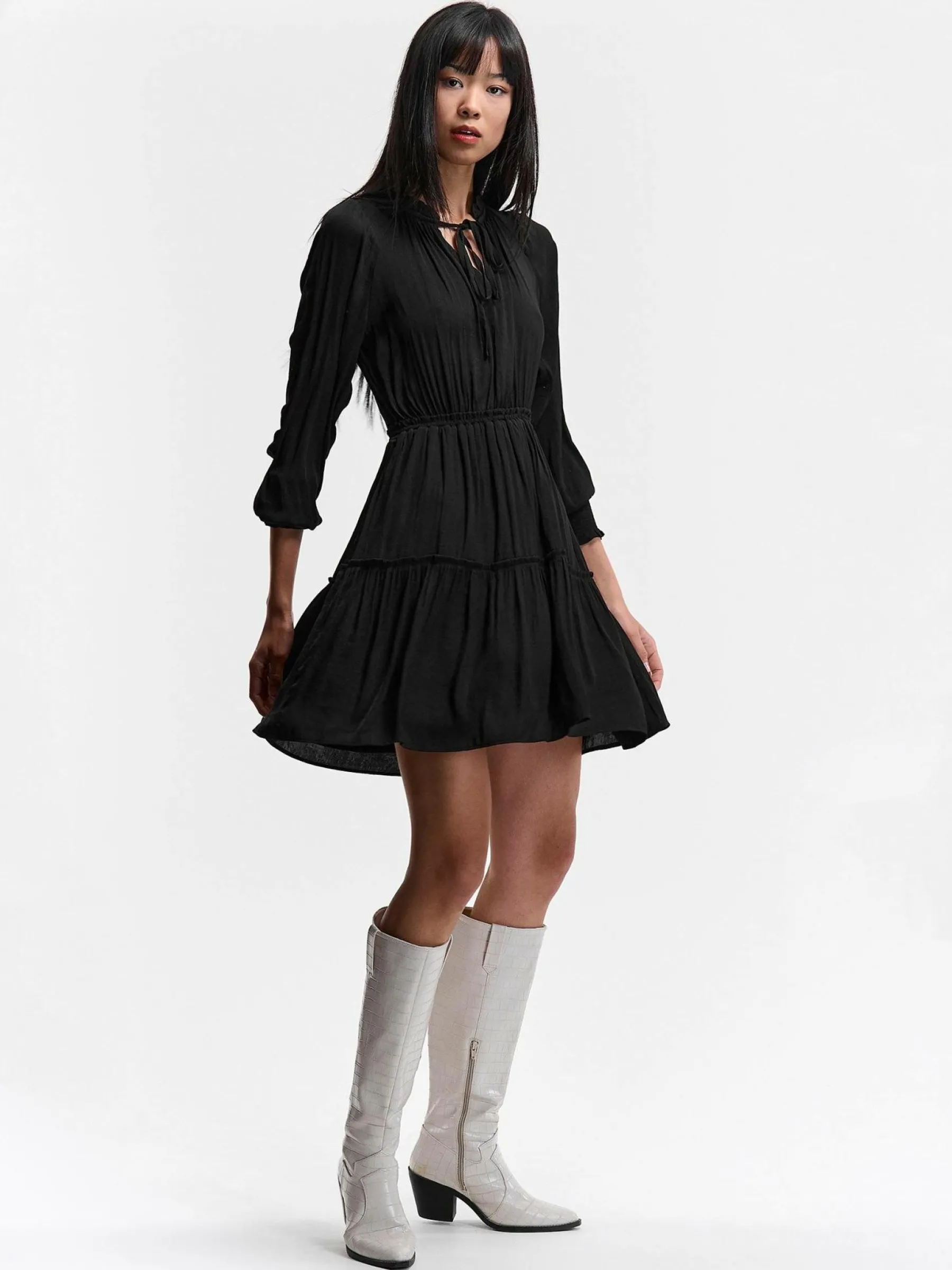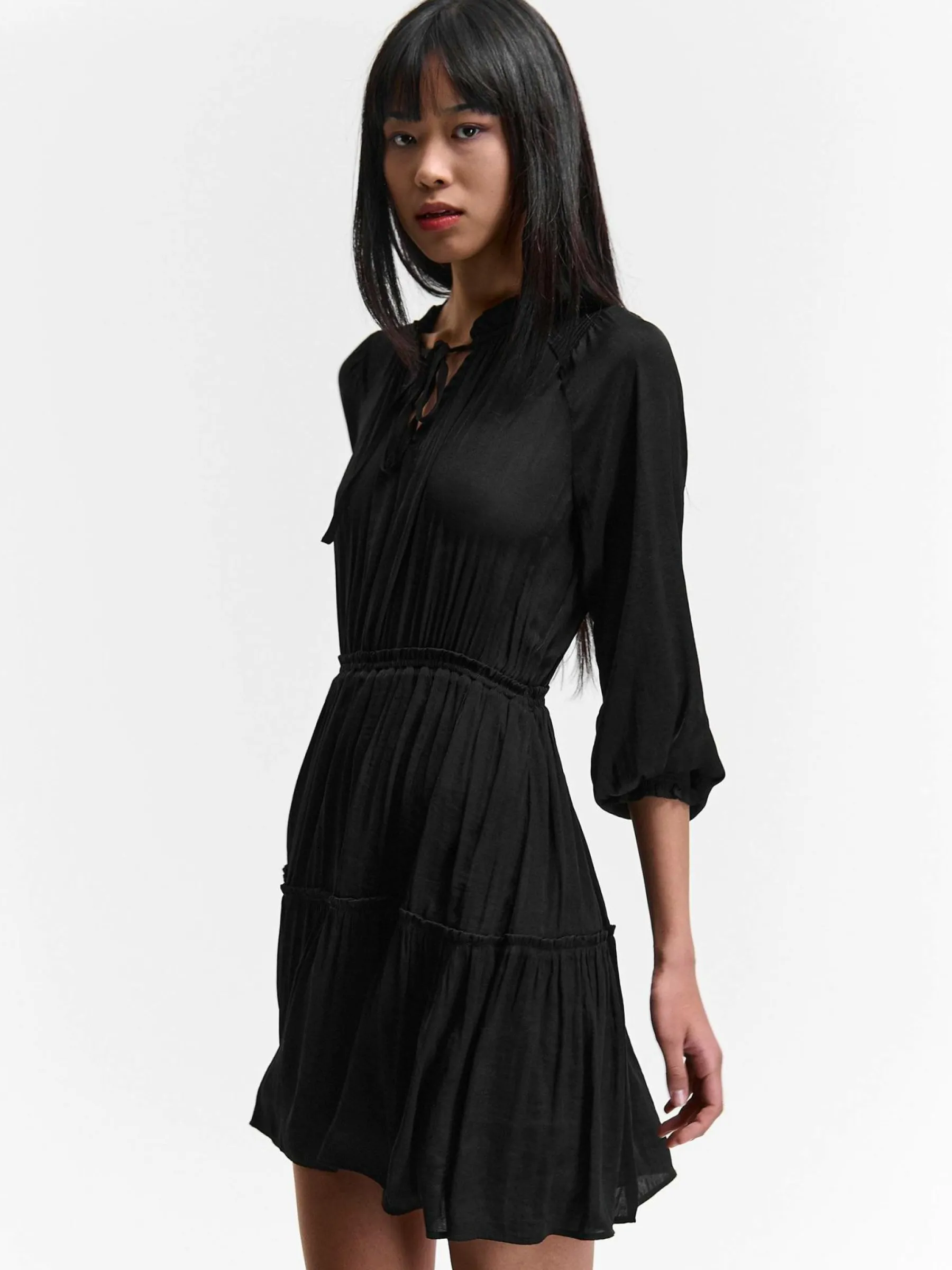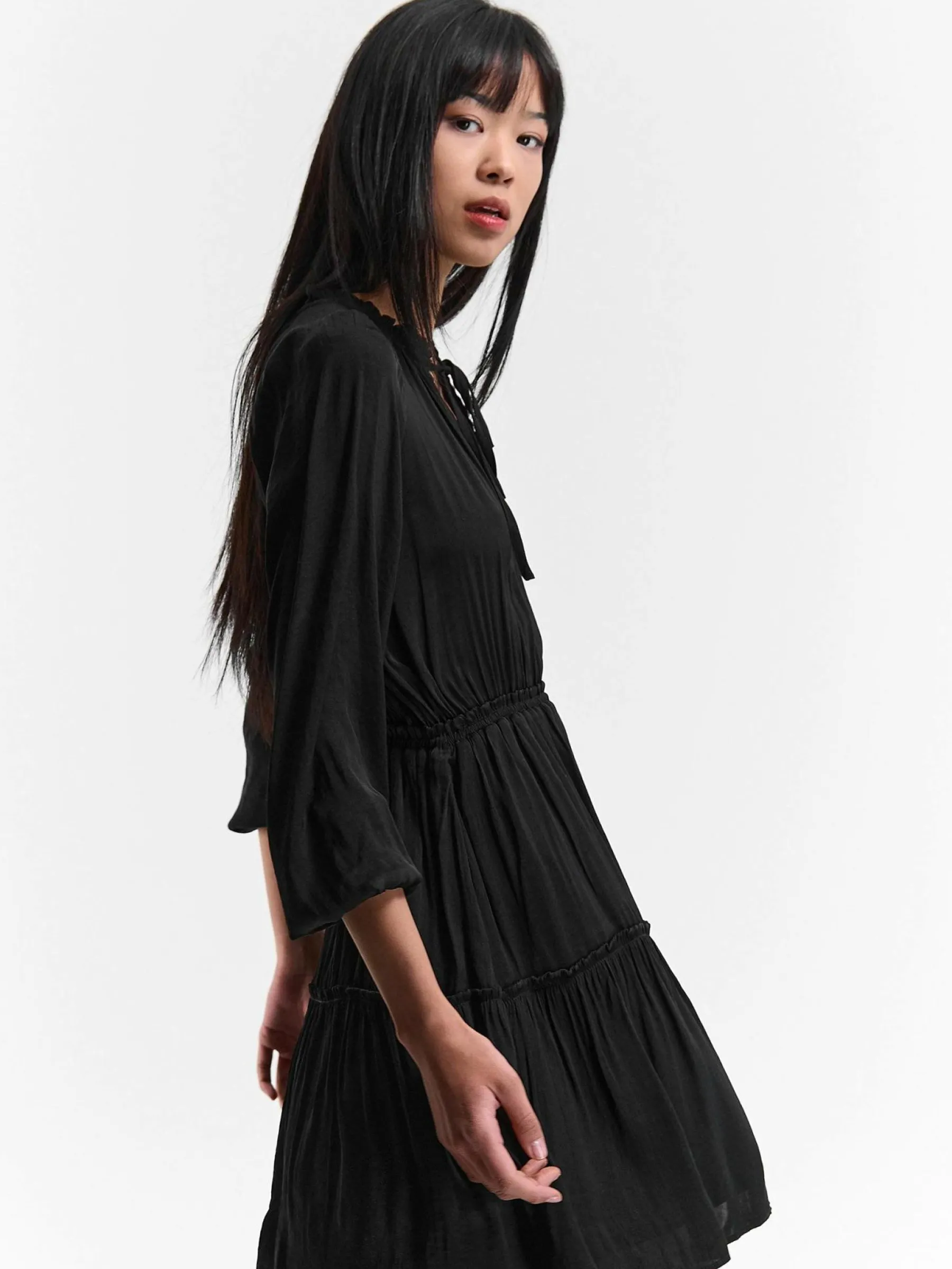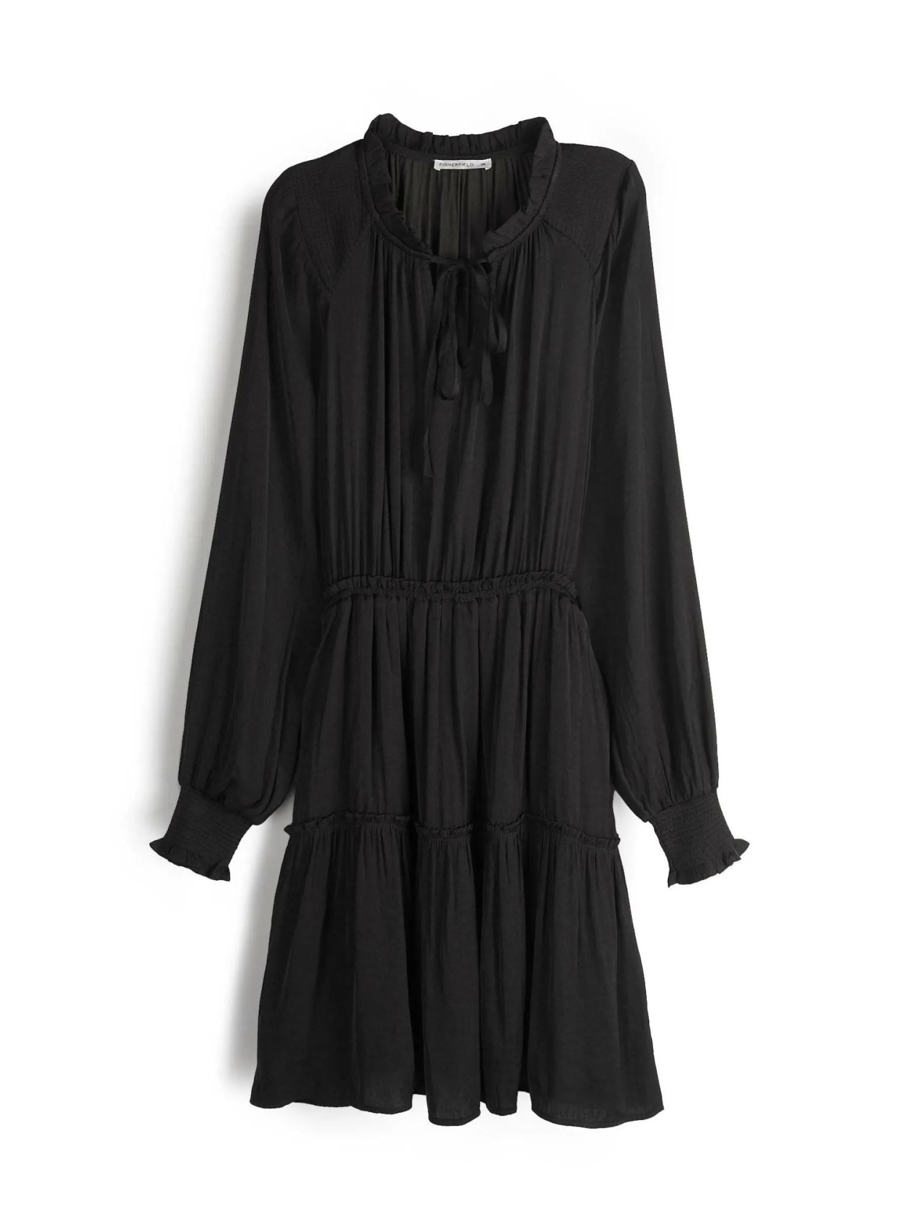 Kolor: czarnyKrój: z falbanąTyp: sukienkaRekaw: długi rękawDługość: miniPattern style: pojedynczy kolorDetal: z f…