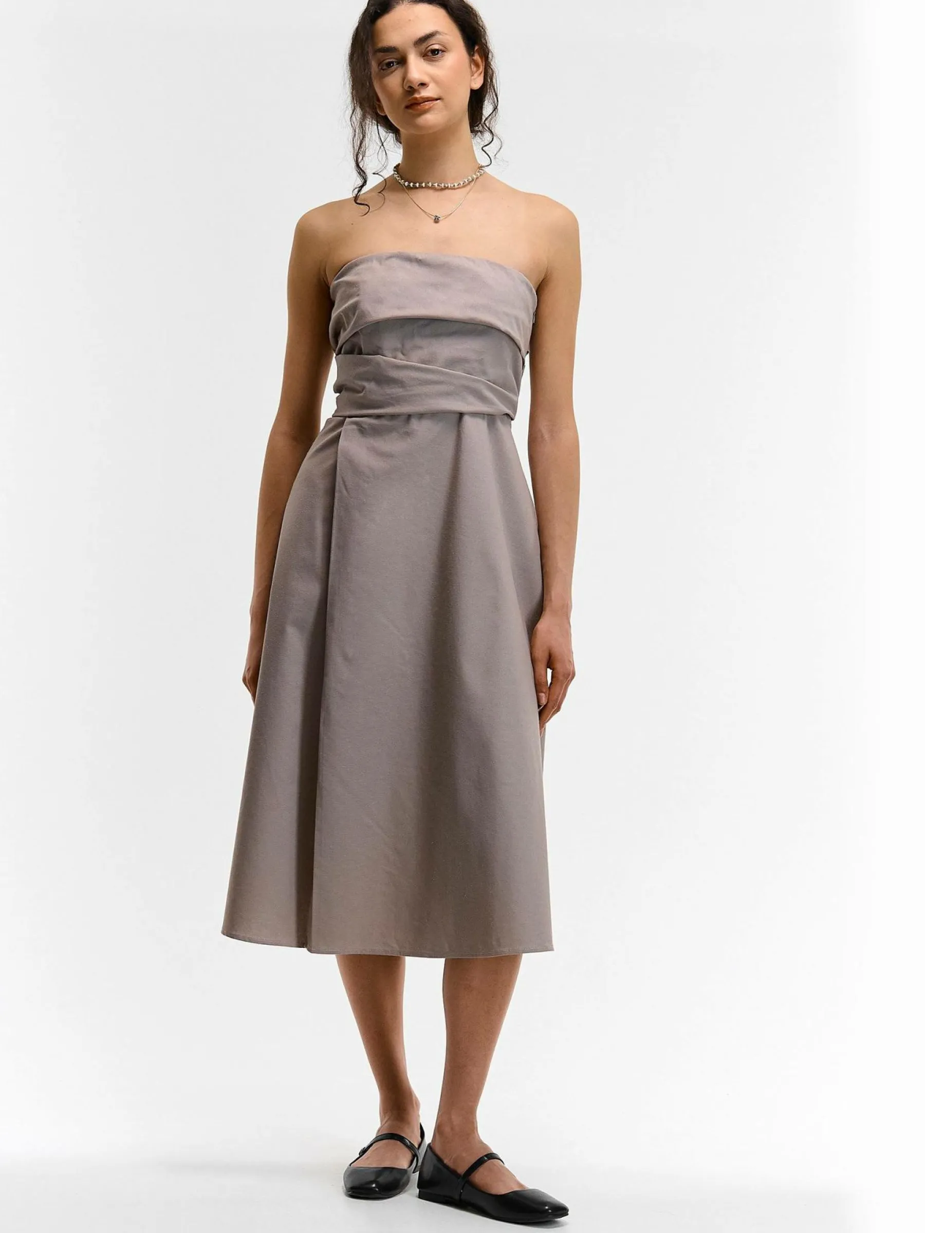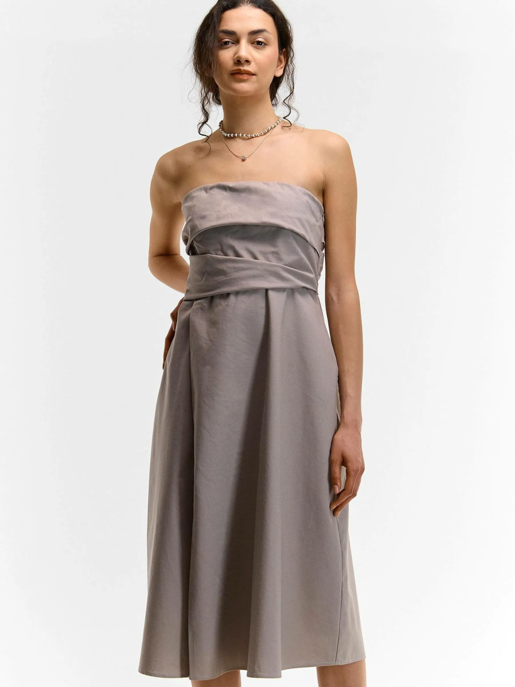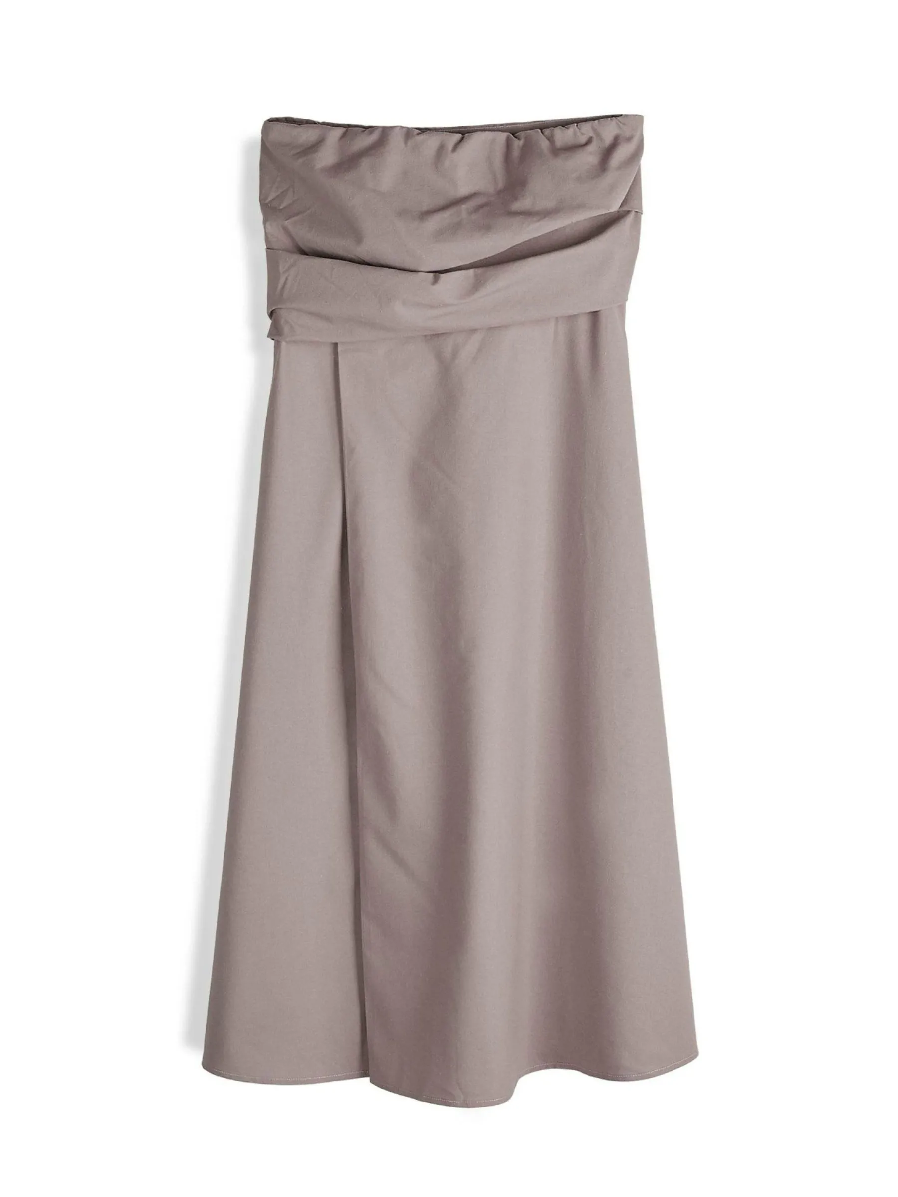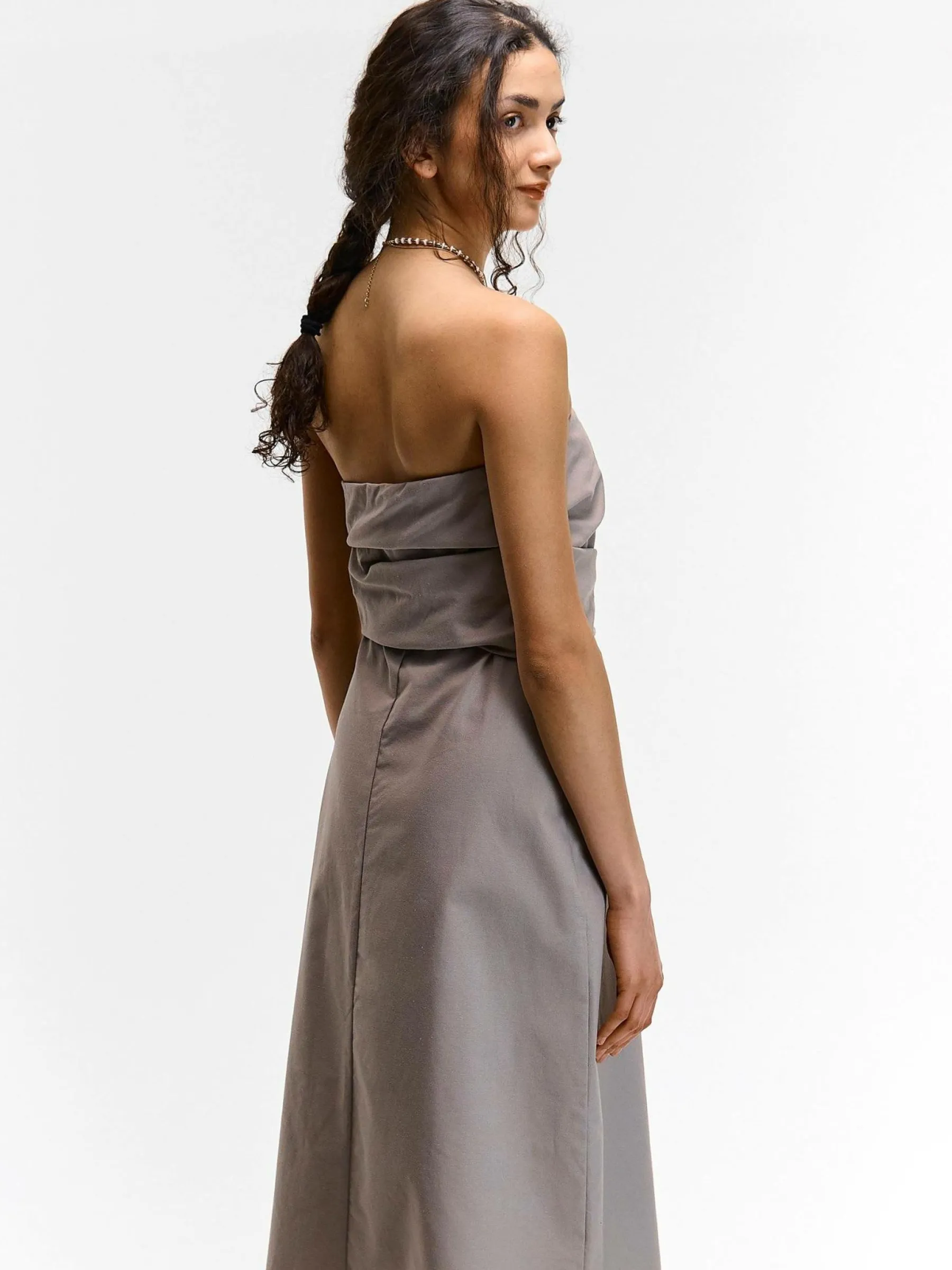 Kolor: szaryKrój: z odkrytymi ramionamiTyp: sukienkaRekaw: bez rękawówDługość: midiPattern style: pojedynczy kolor…