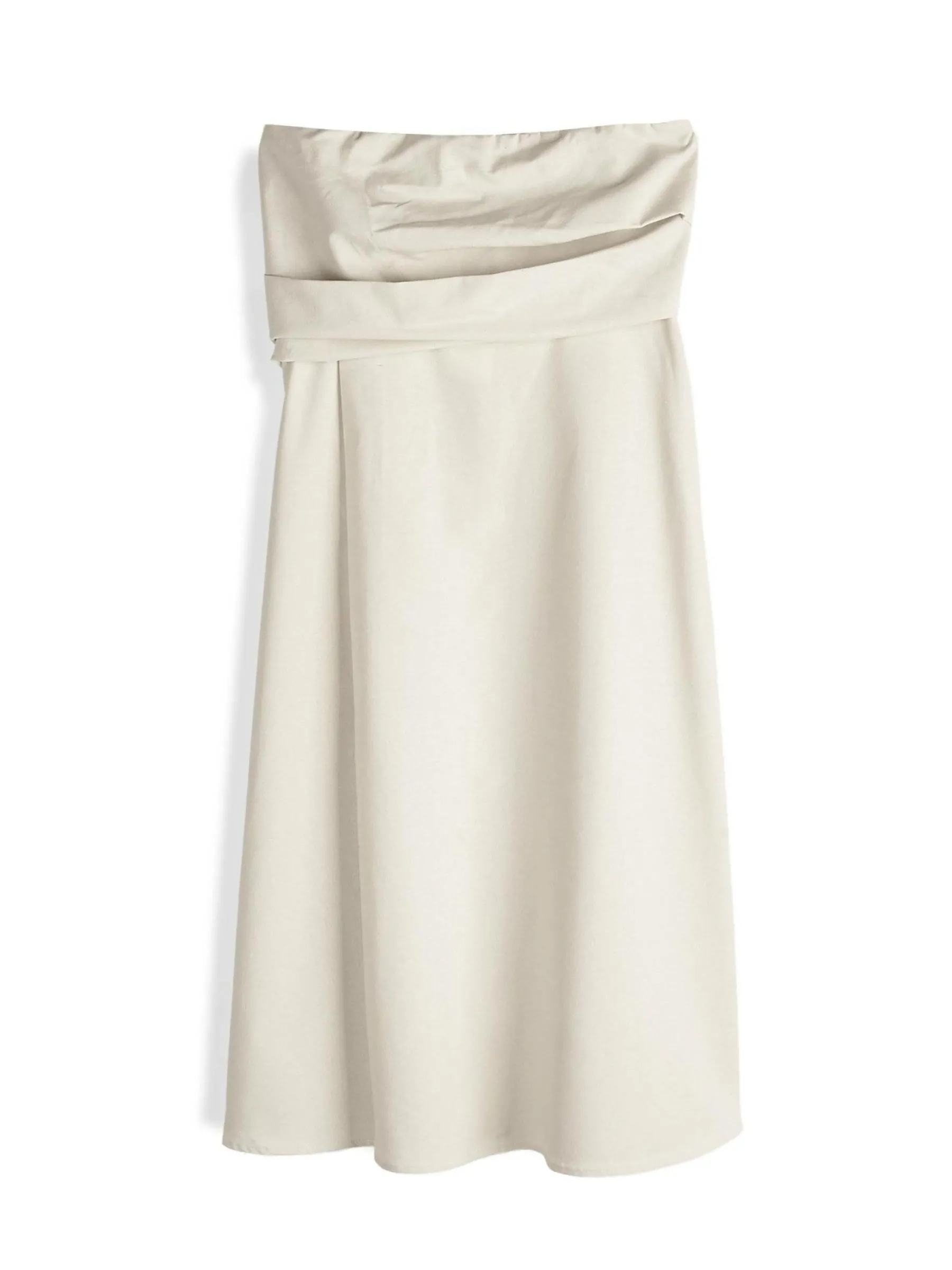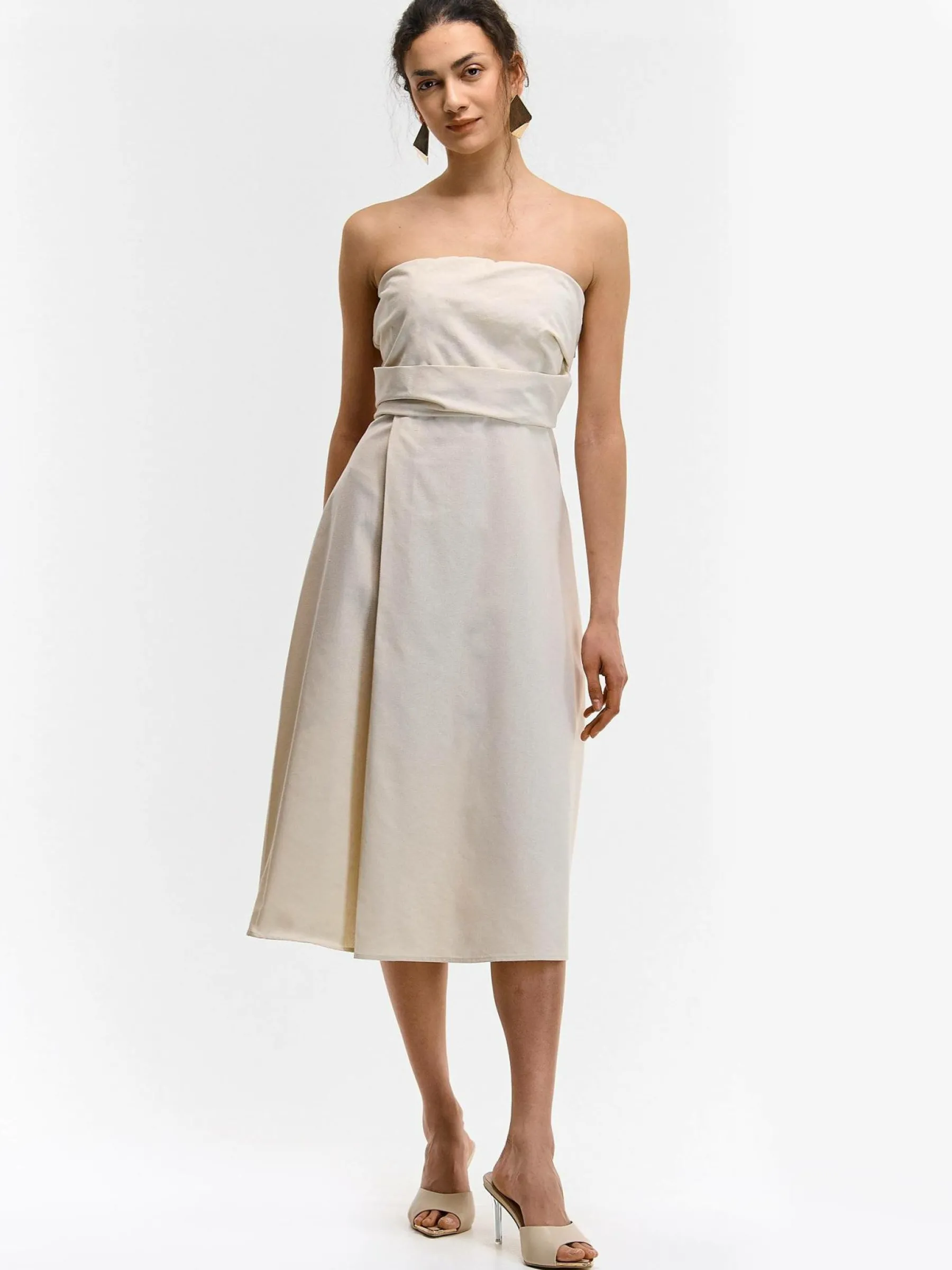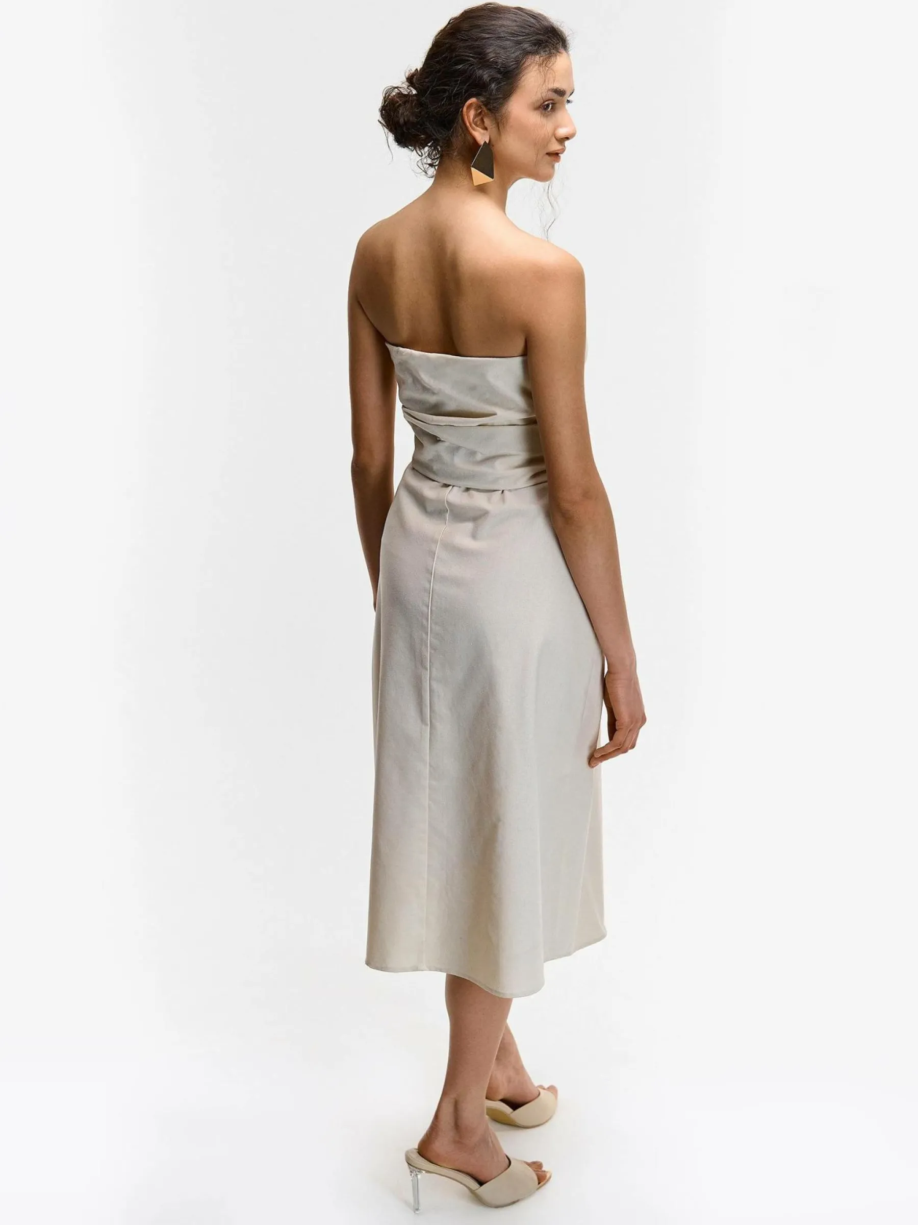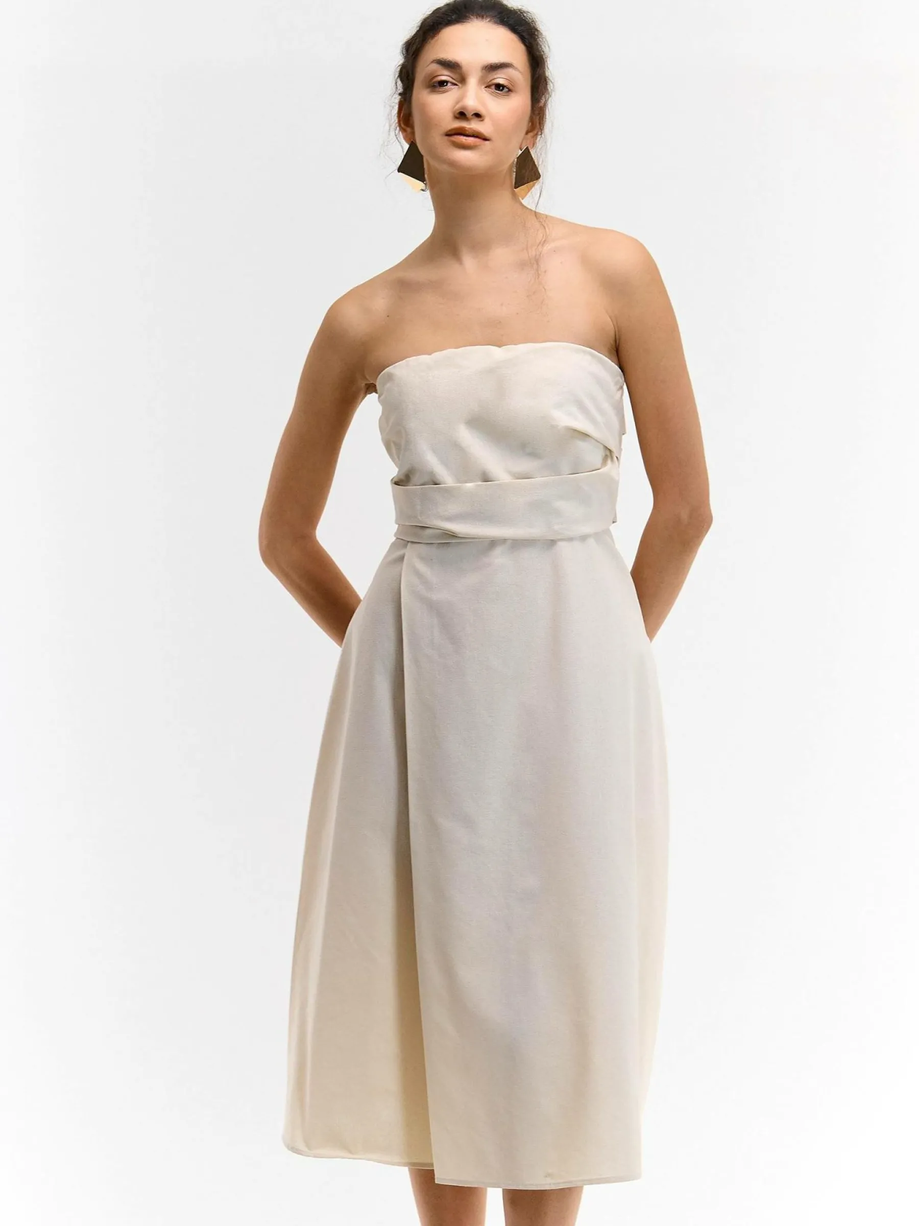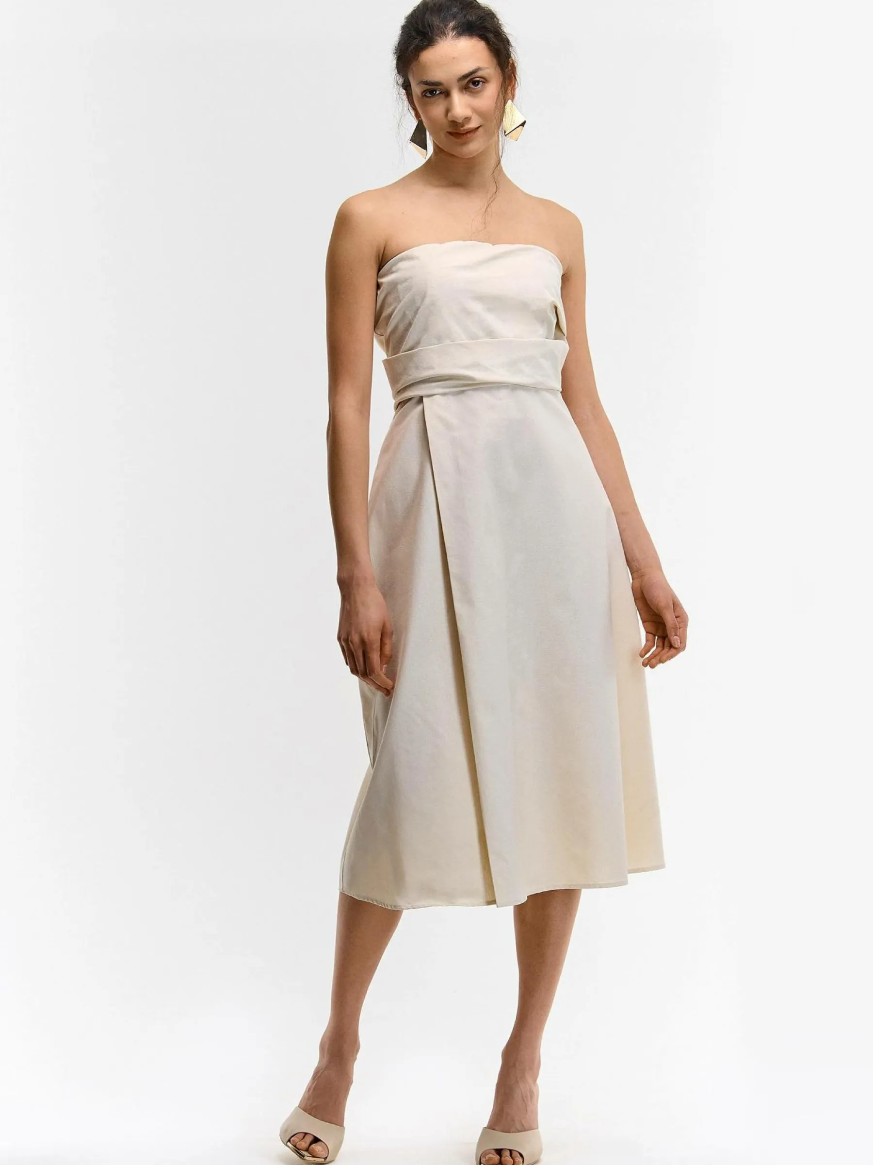 Kolor: beżowyKrój: z odkrytymi ramionamiTyp: sukienkaRekaw: bez rękawówDługość: midiPattern style: pojedynczy kol…