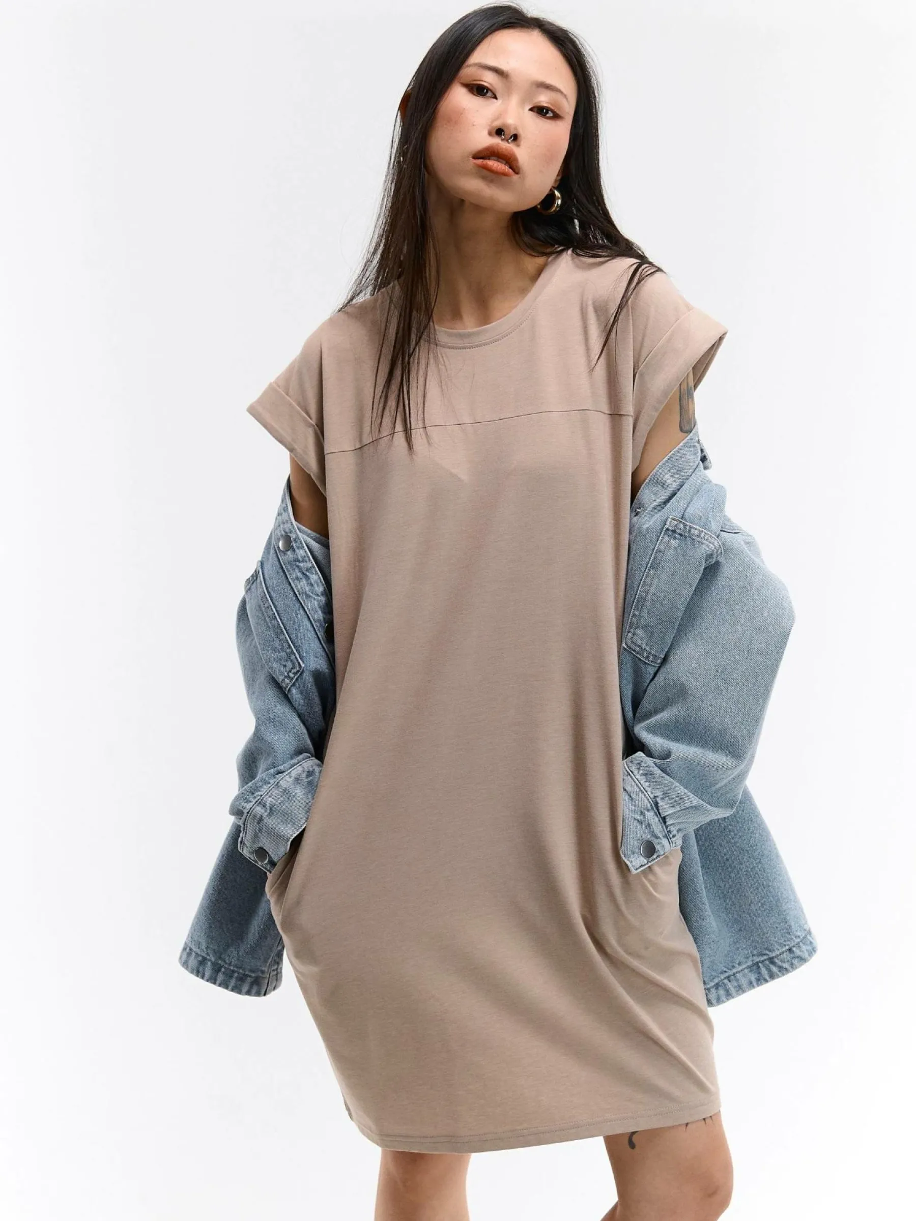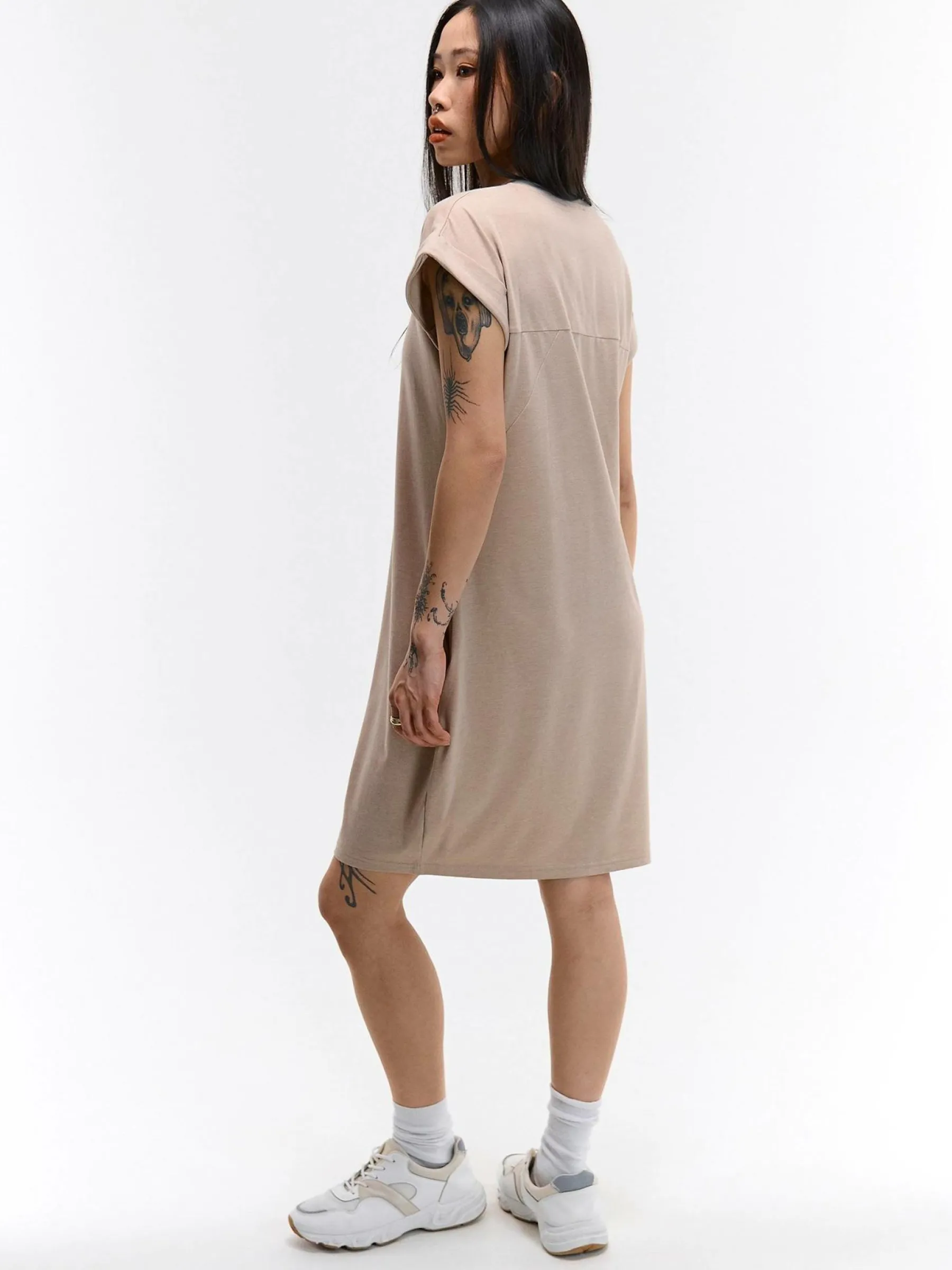Kolor: beżowyKrój: regularTyp: sukienkaRekaw: krótki rękawDługość: miniPattern style: pojedynczy kolorDetal: nad …