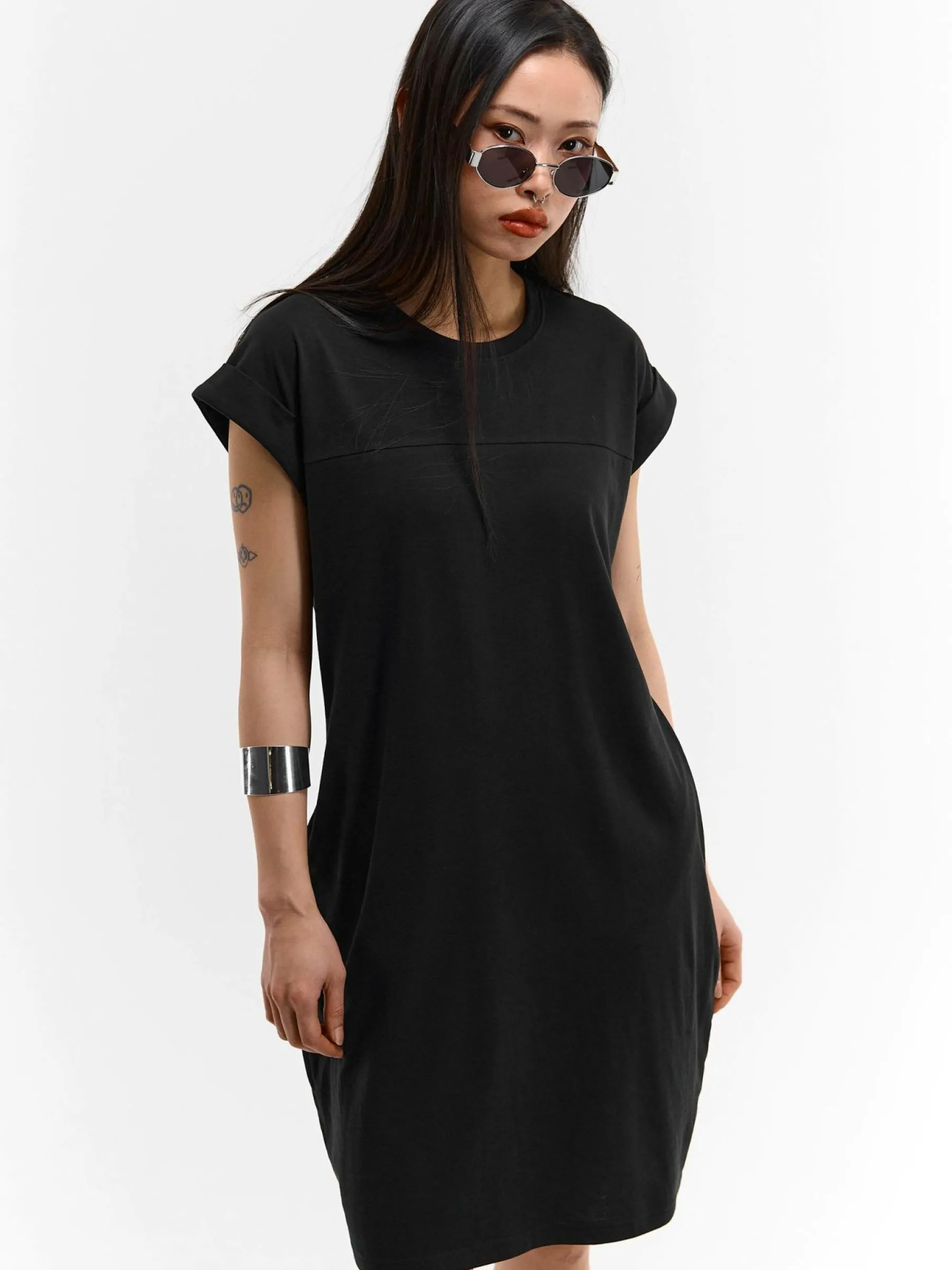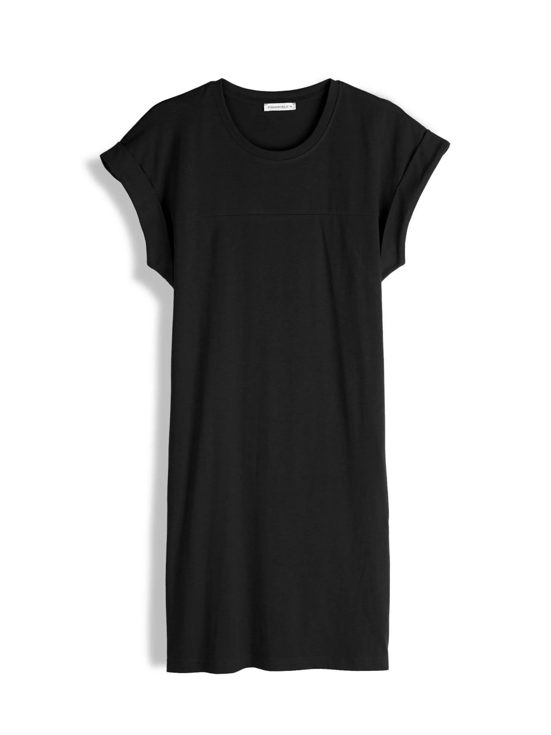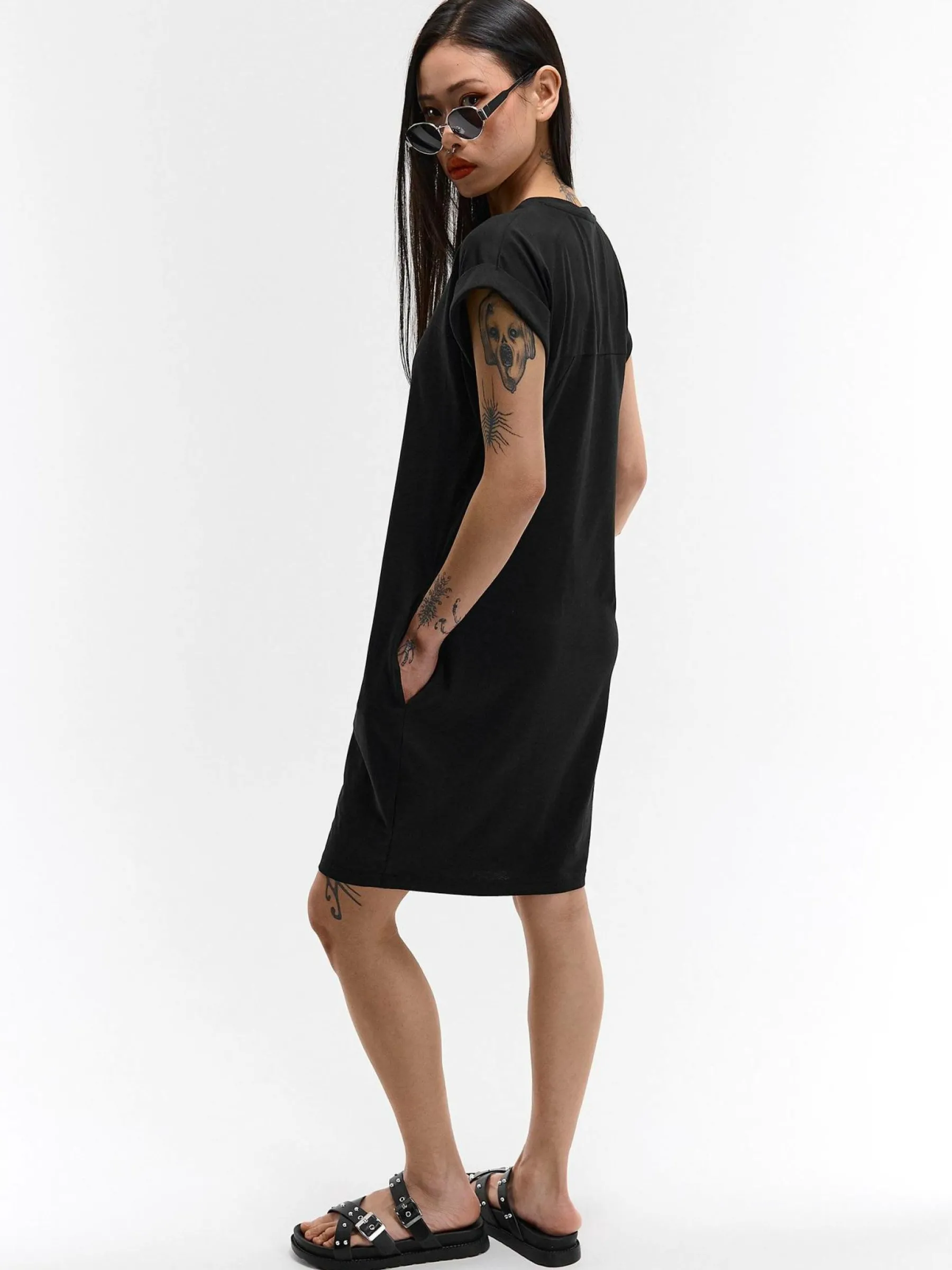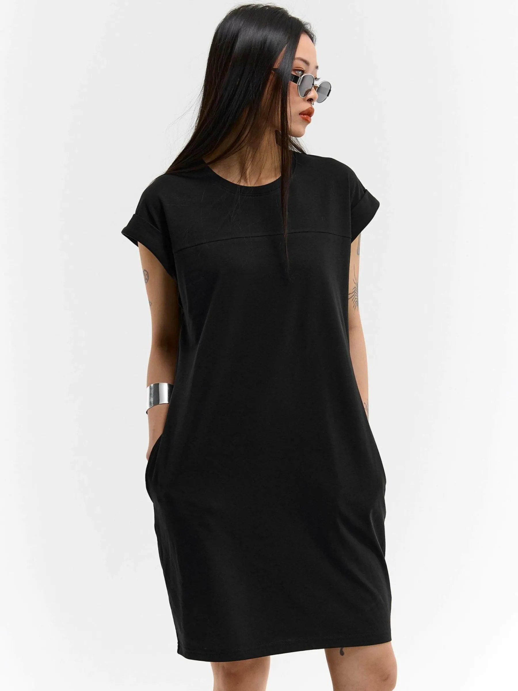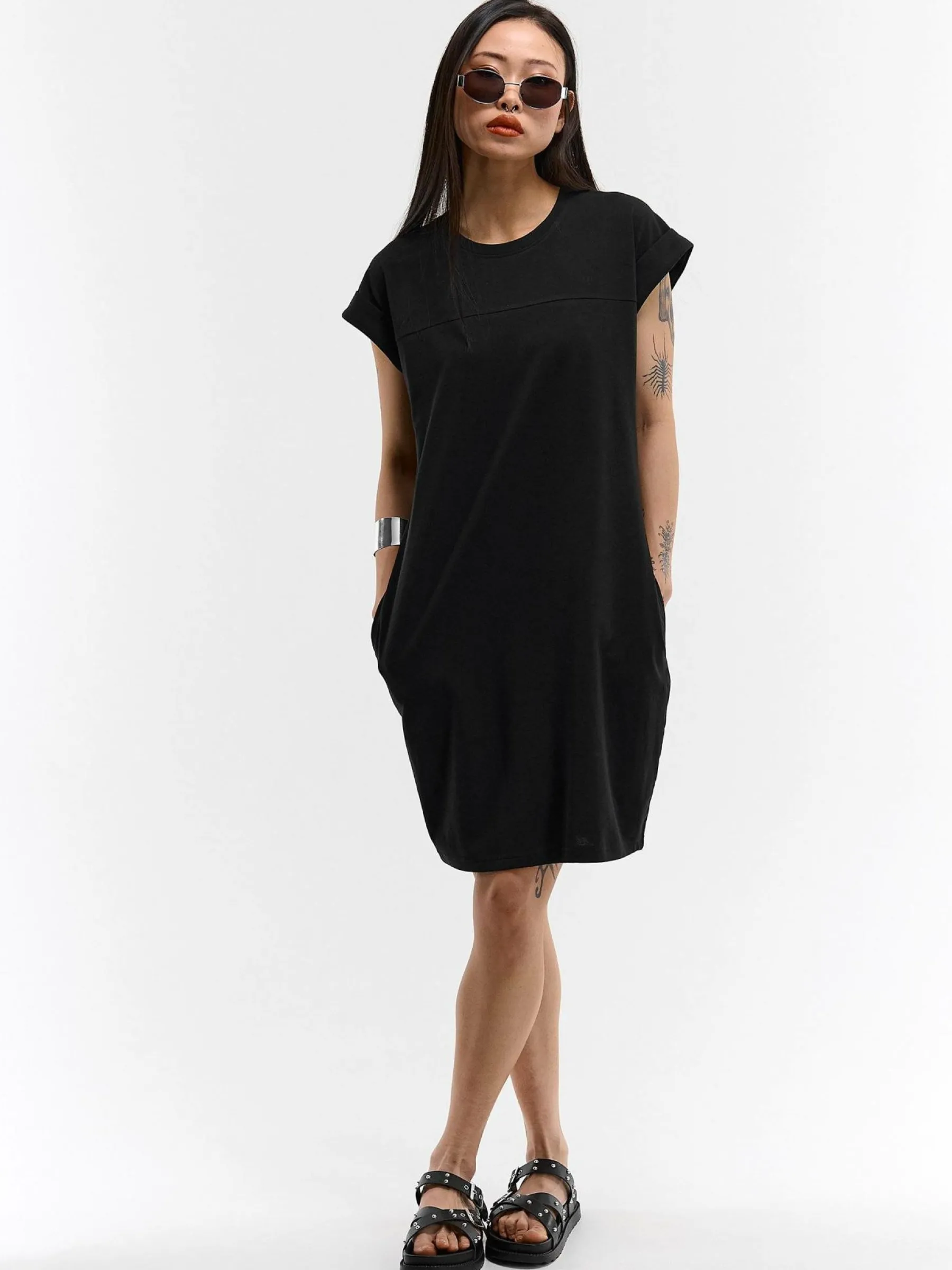 Kolor: czarnyKrój: regularTyp: sukienkaRekaw: krótki rękawDługość: miniPattern style: pojedynczy kolorDetal: nad g…