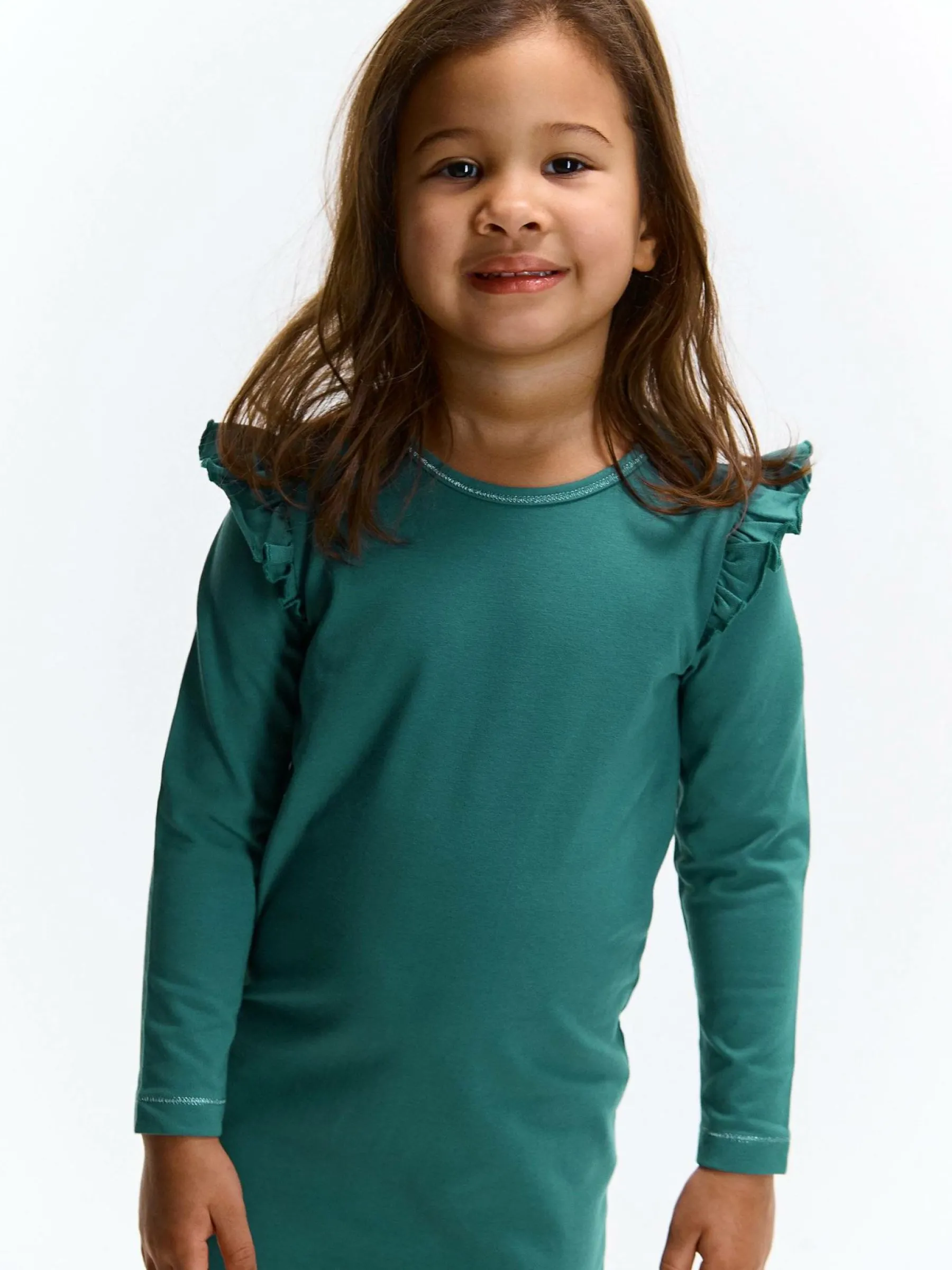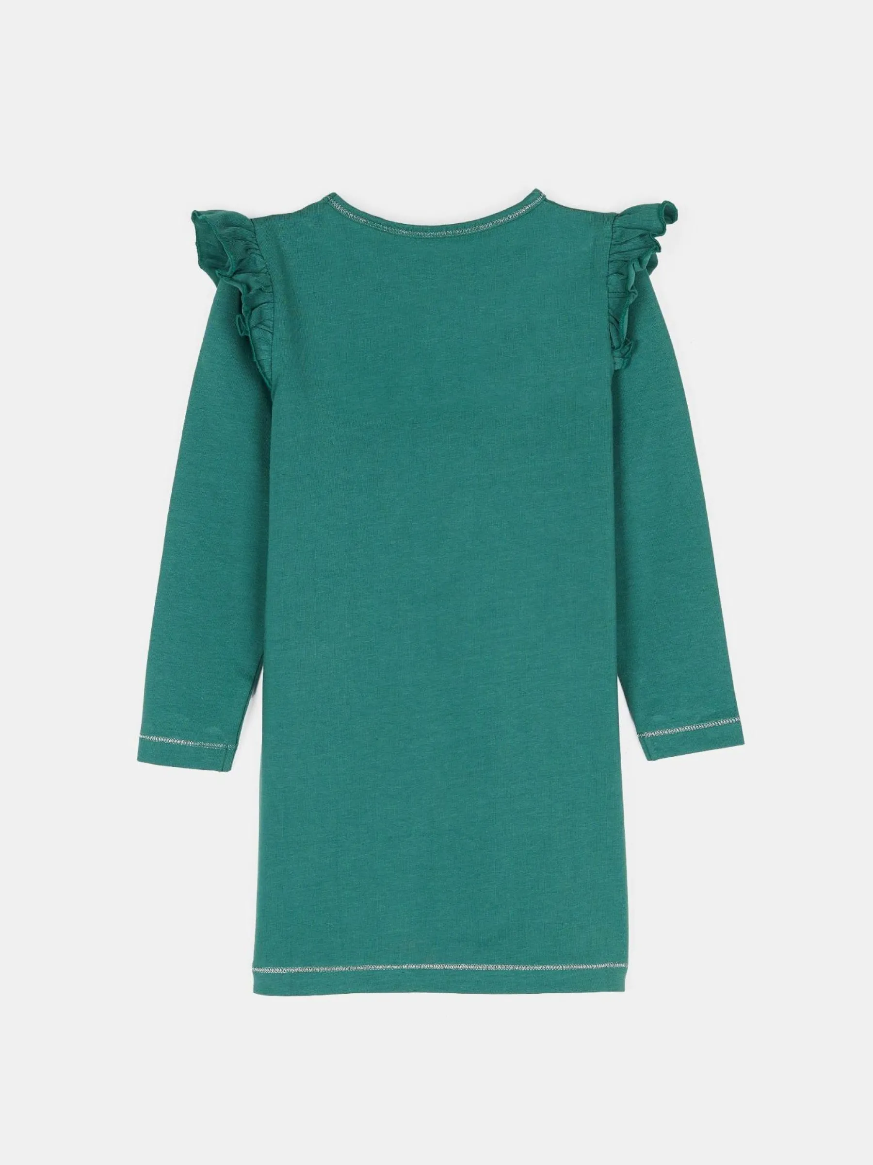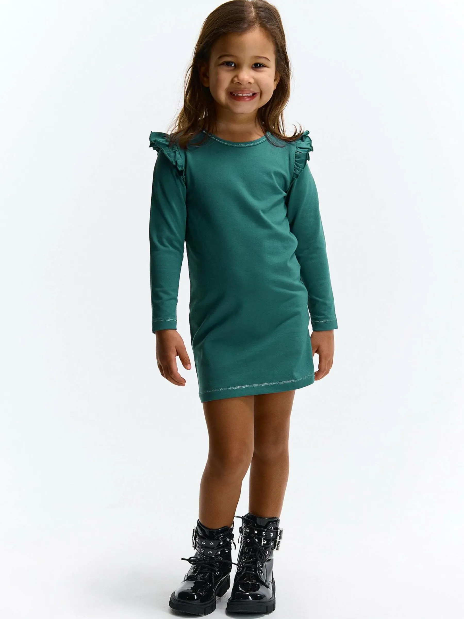 Kolor: zielonyKrój: z falbanąTyp: sukienkaRekaw: długi rękawDługość: miniPattern style: pojedynczy kolorDetal: na…