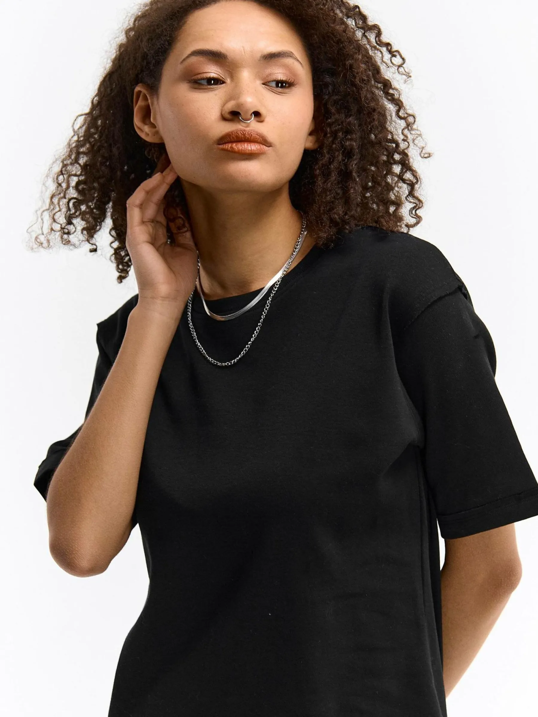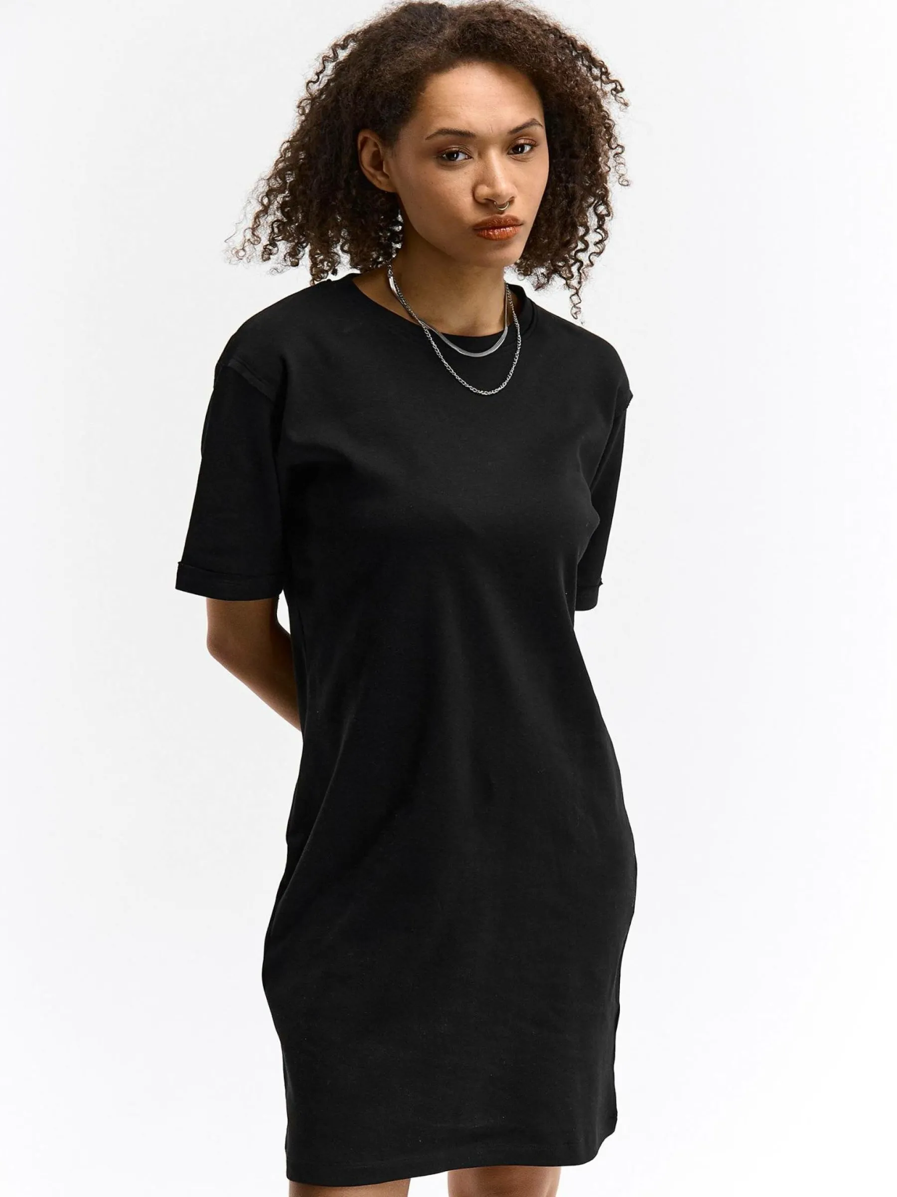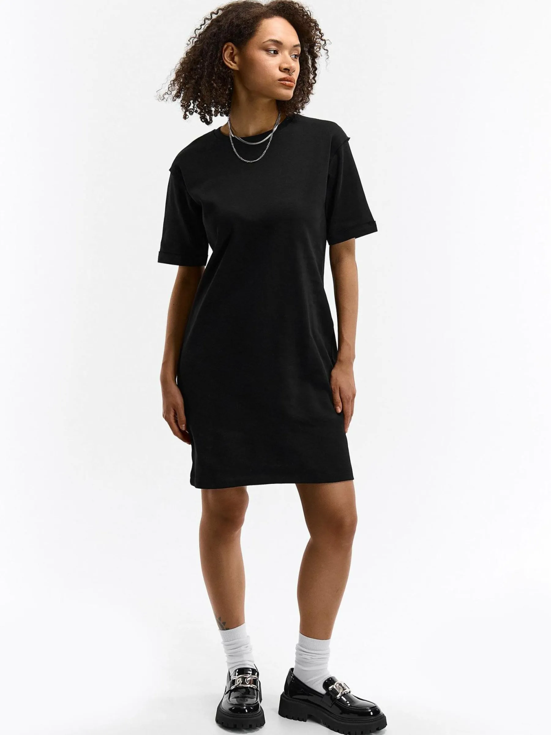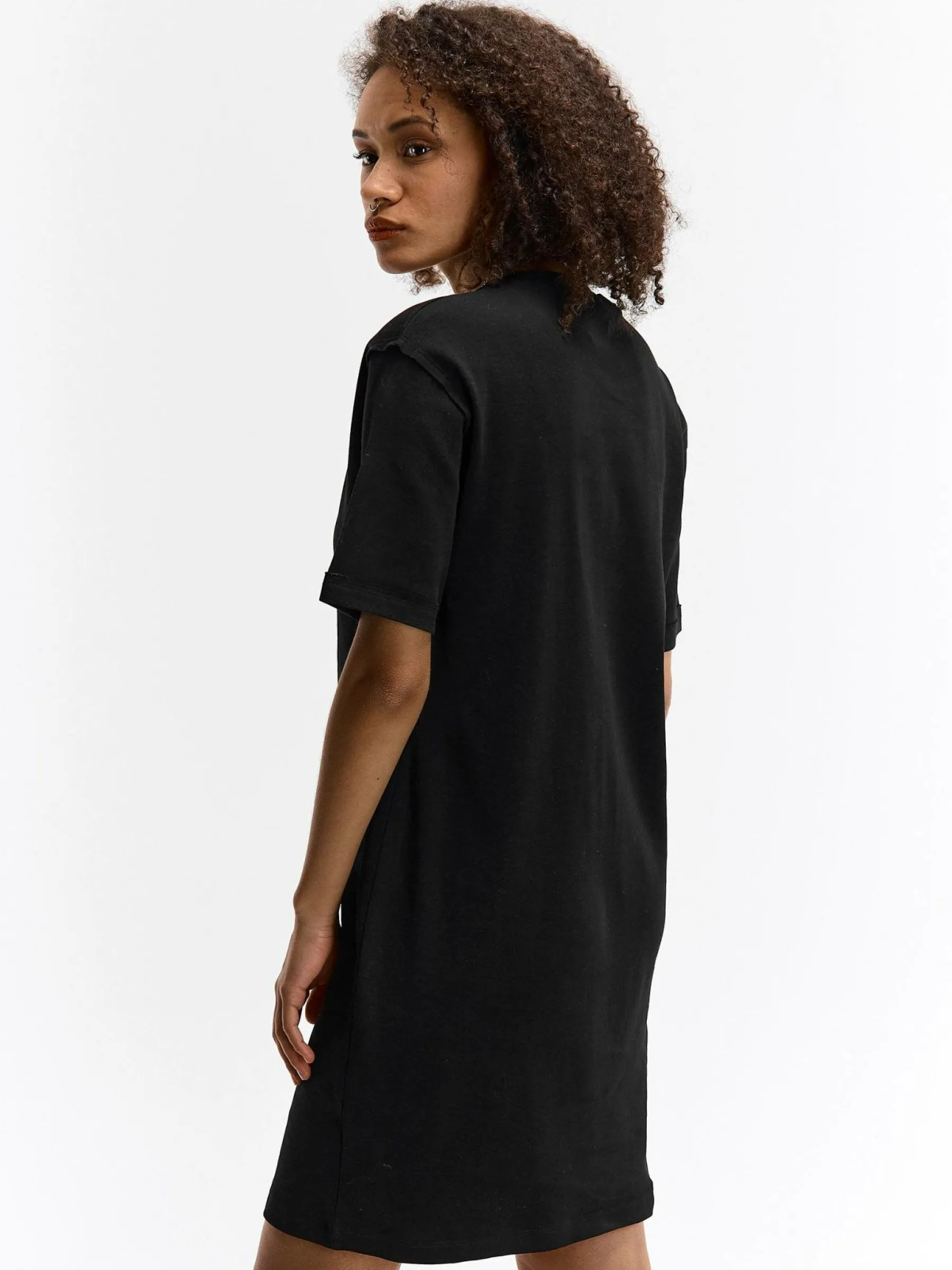Kolor: czarnyKrój: regularTyp: sukienkaRekaw: krótki rękawDługość: miniPattern style: pojedynczy kolorDetal: nad g…