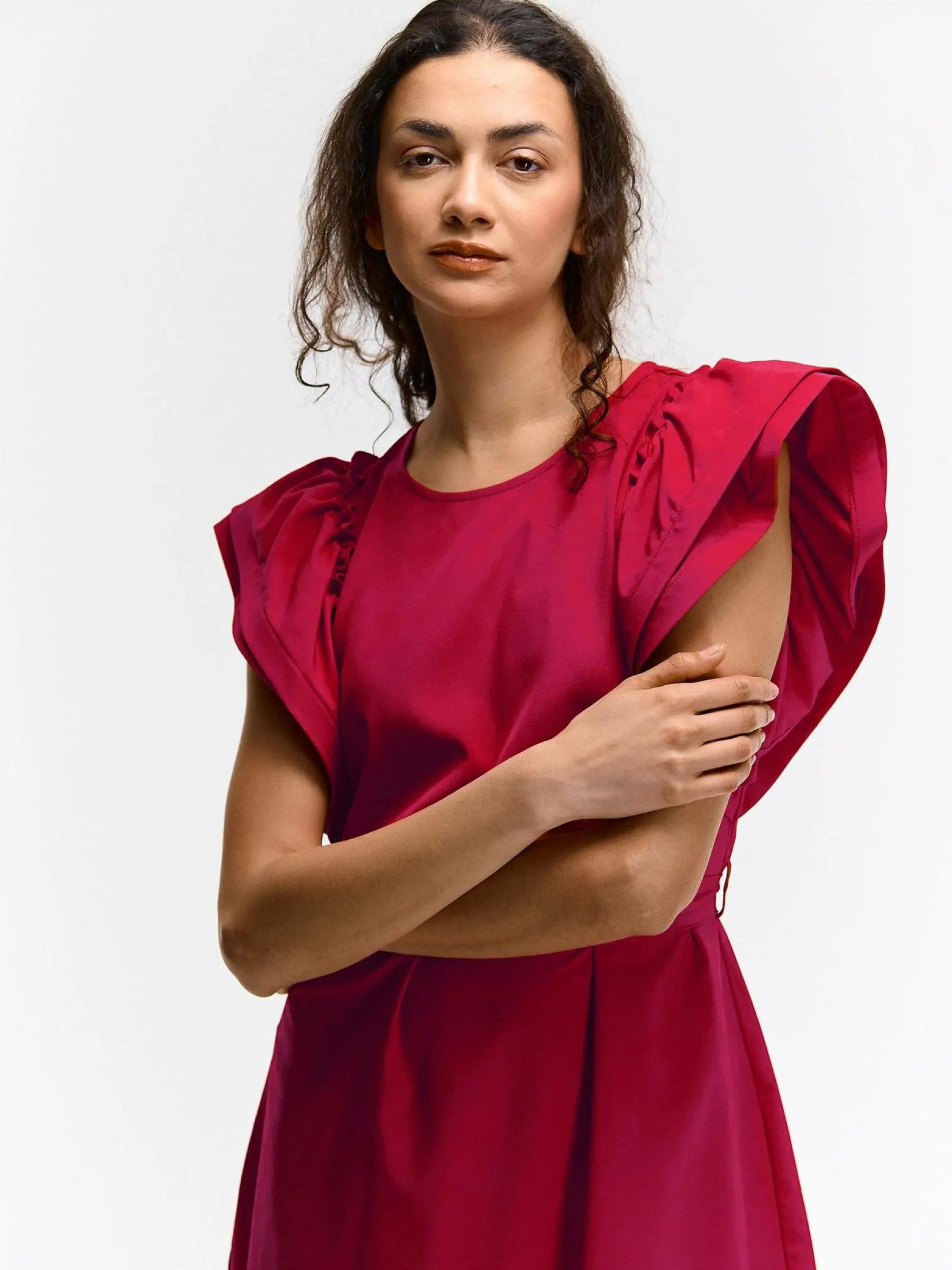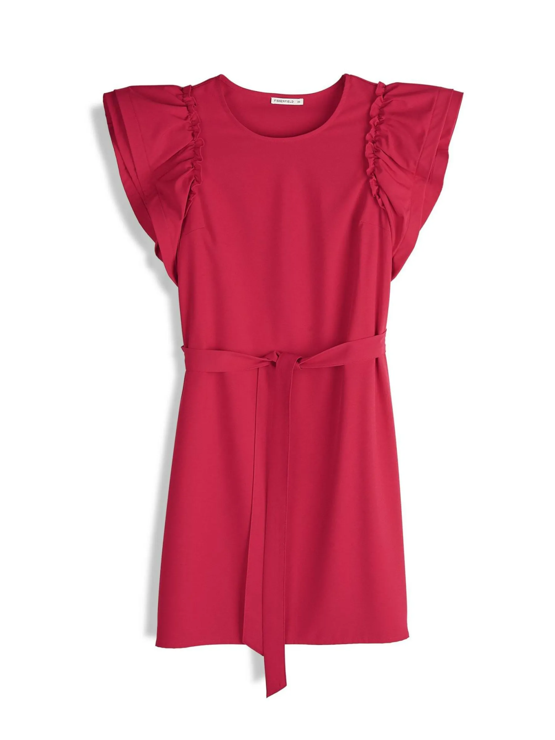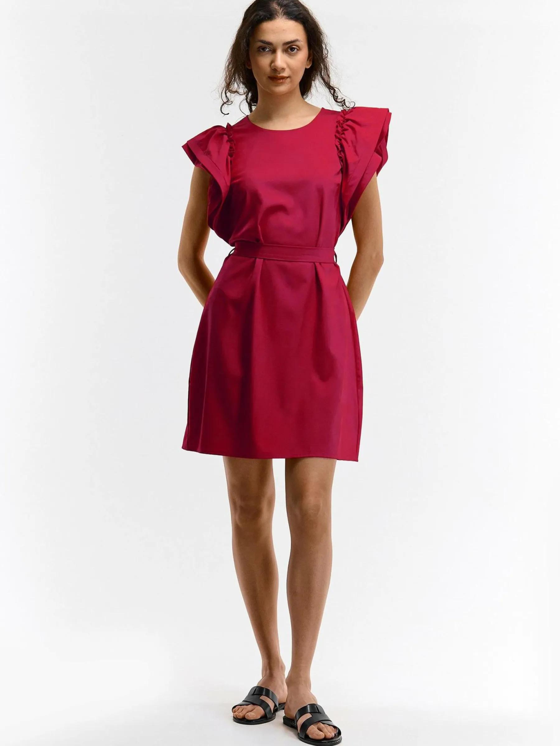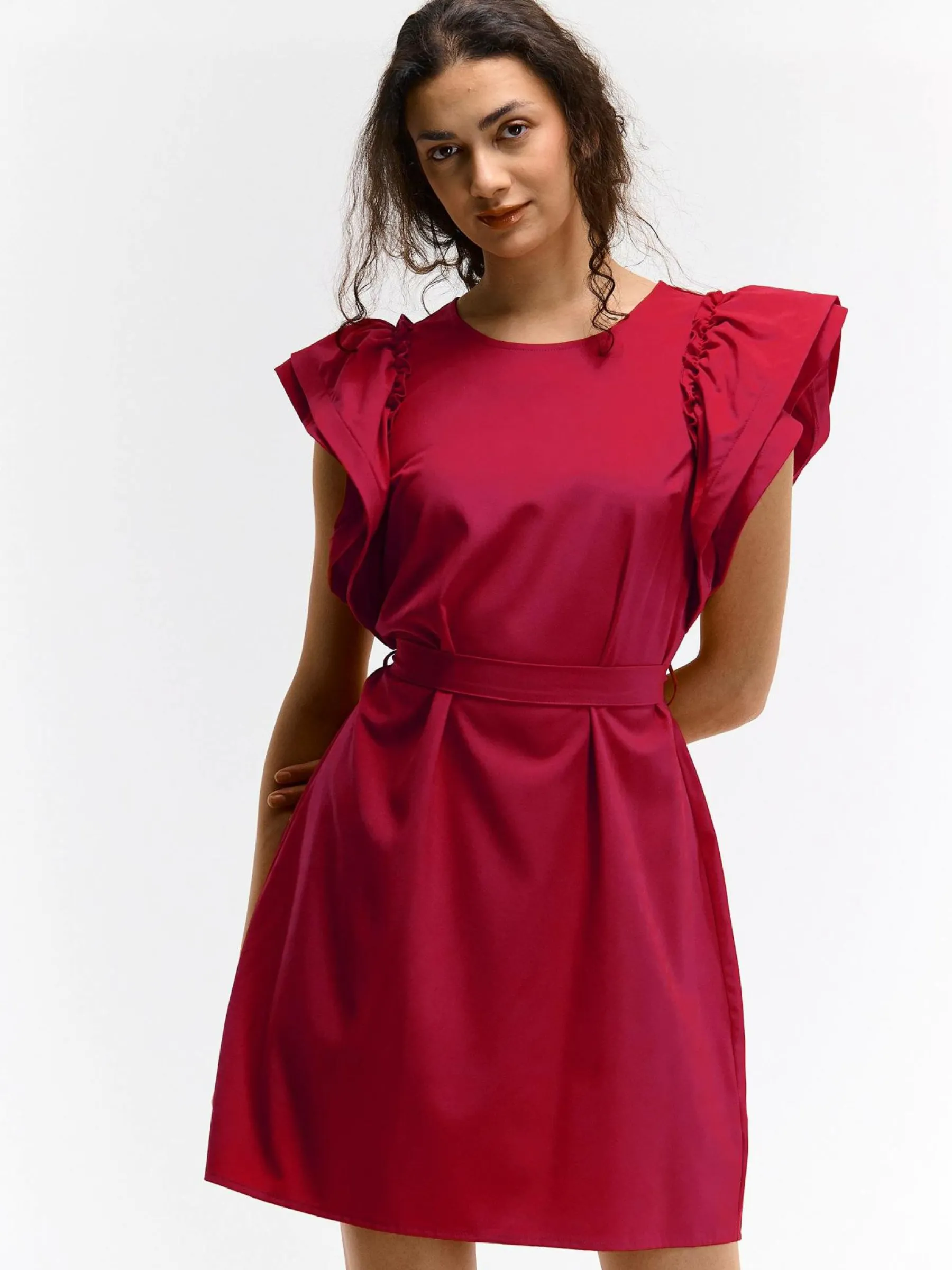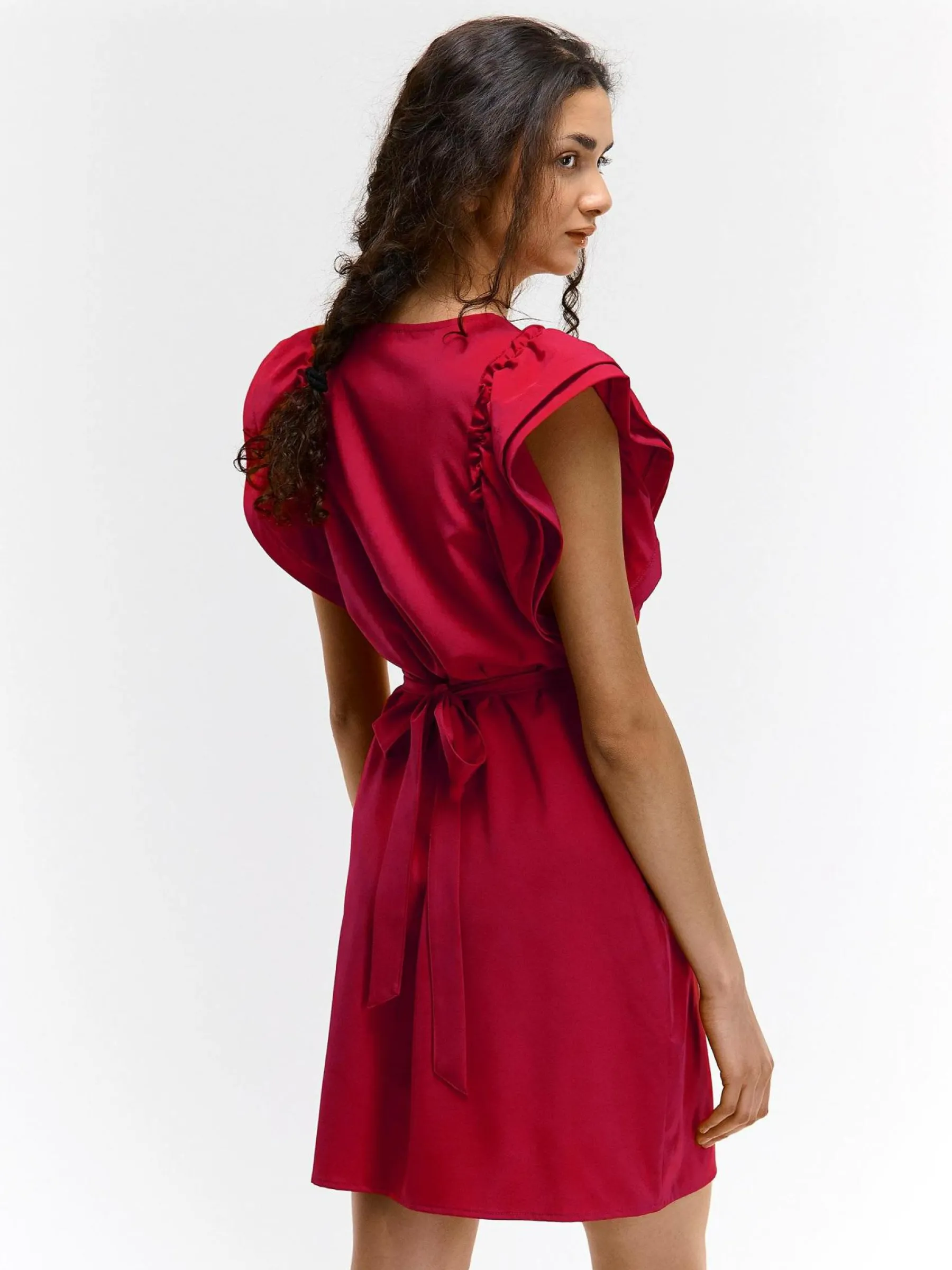 Kolor: czerwonyKrój: z falbanąTyp: sukienkaRekaw: krótki rękawDługość: miniPattern style: pojedynczy kolorDetal: …