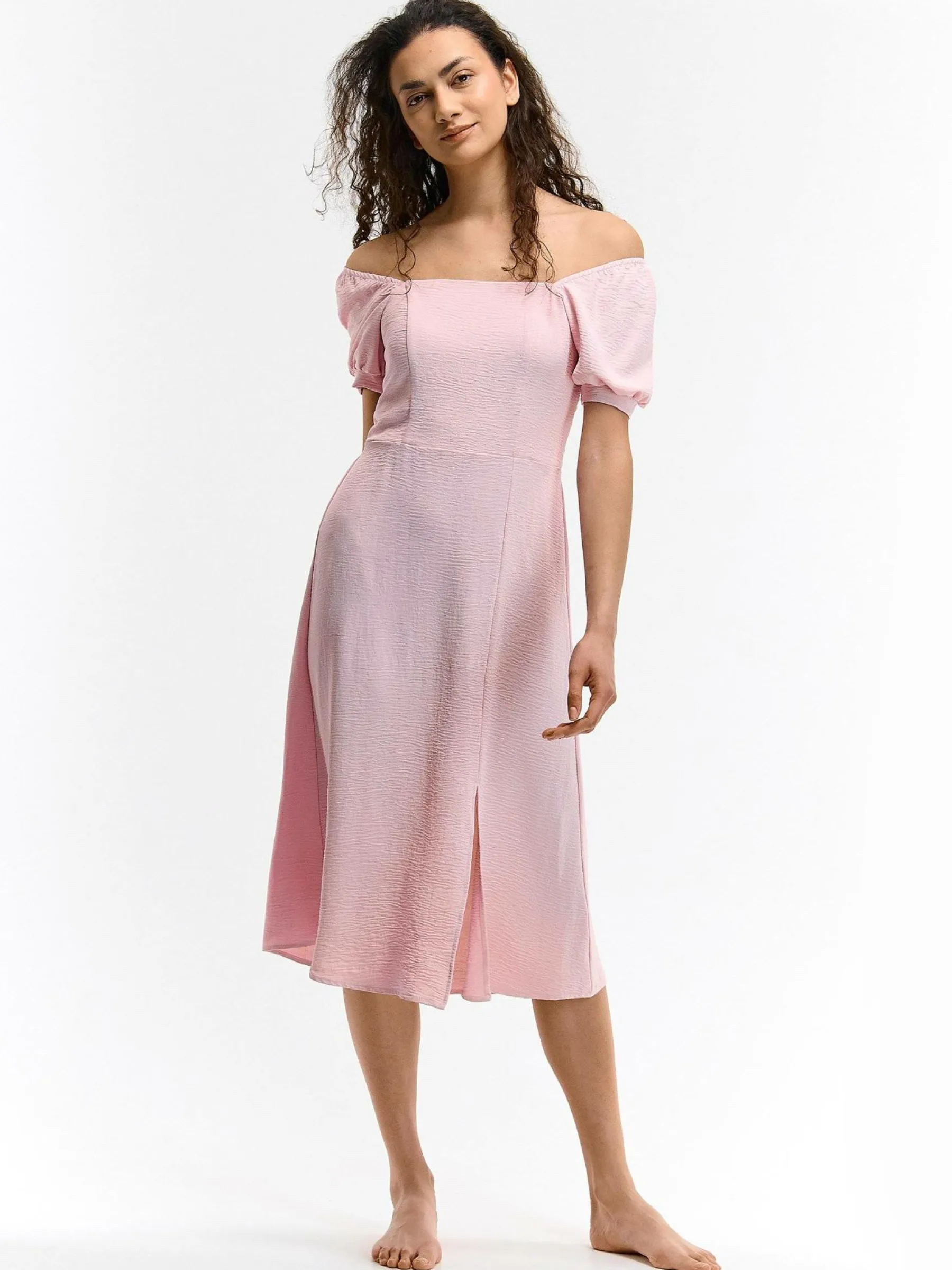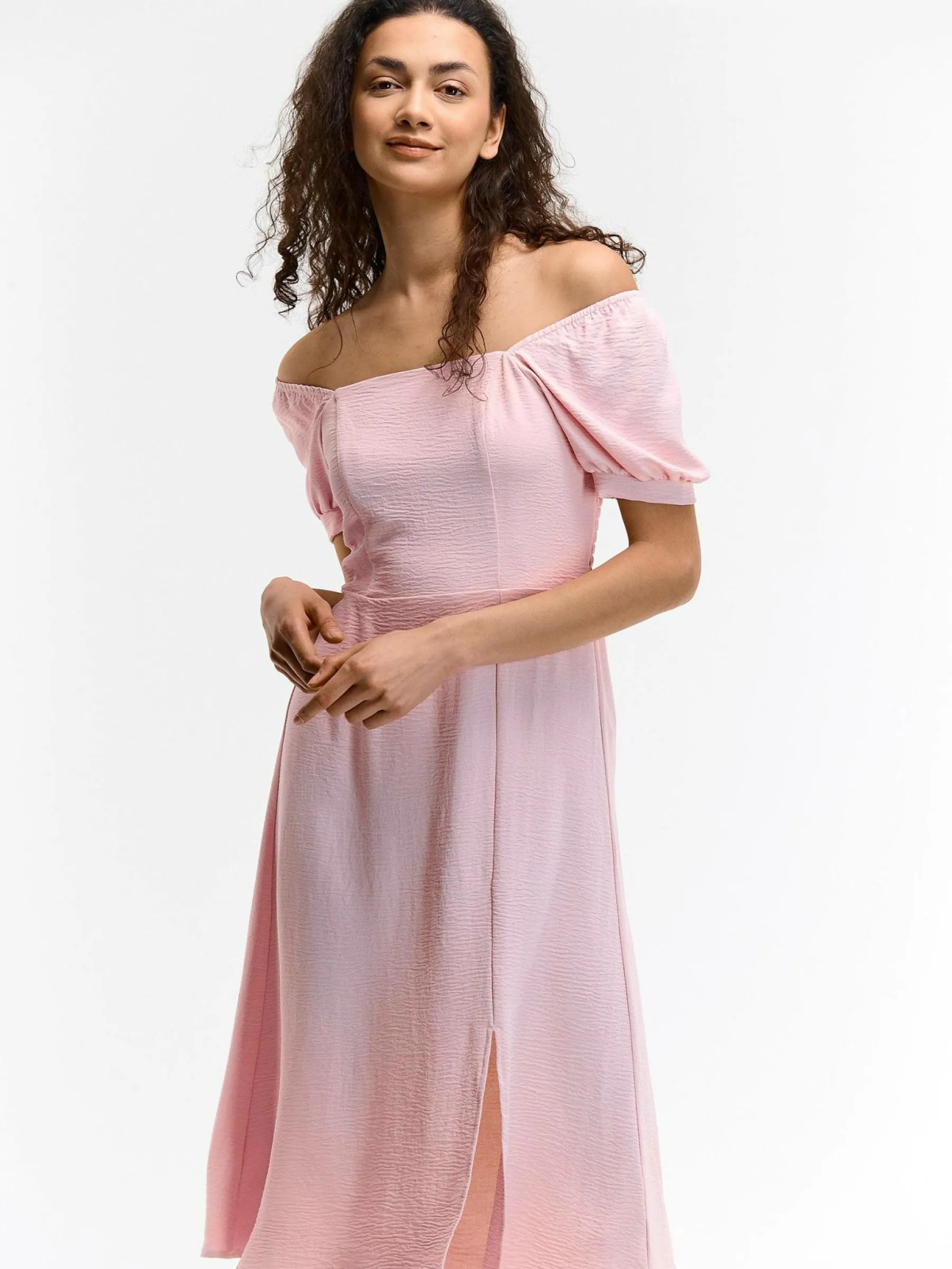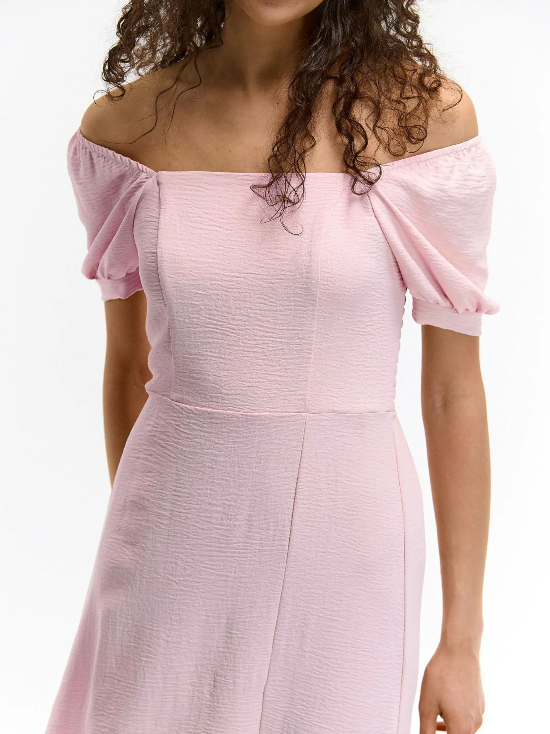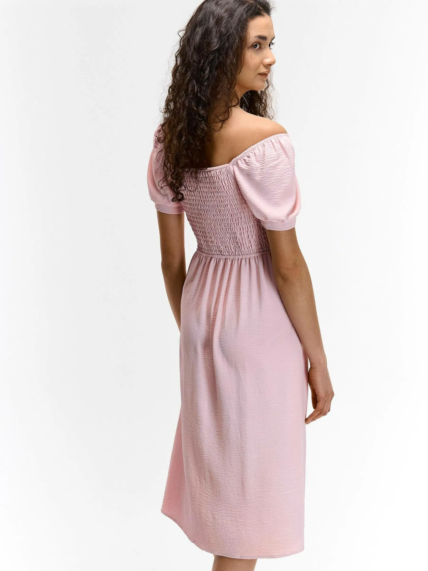 Kolor: różowyKrój: asyTyp: sukienkaRekaw: krótki rękawDługość: midiPattern style: pojedynczy kolorDetal: nad gł…