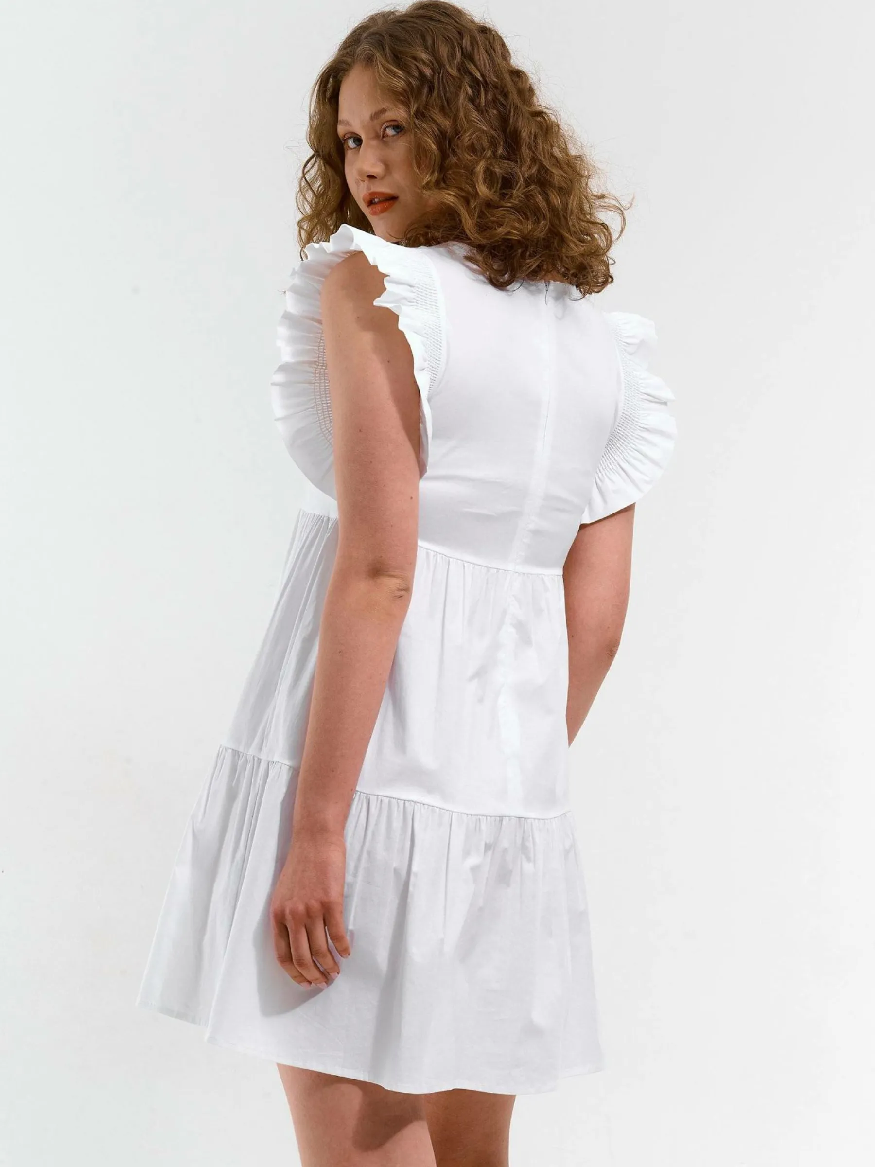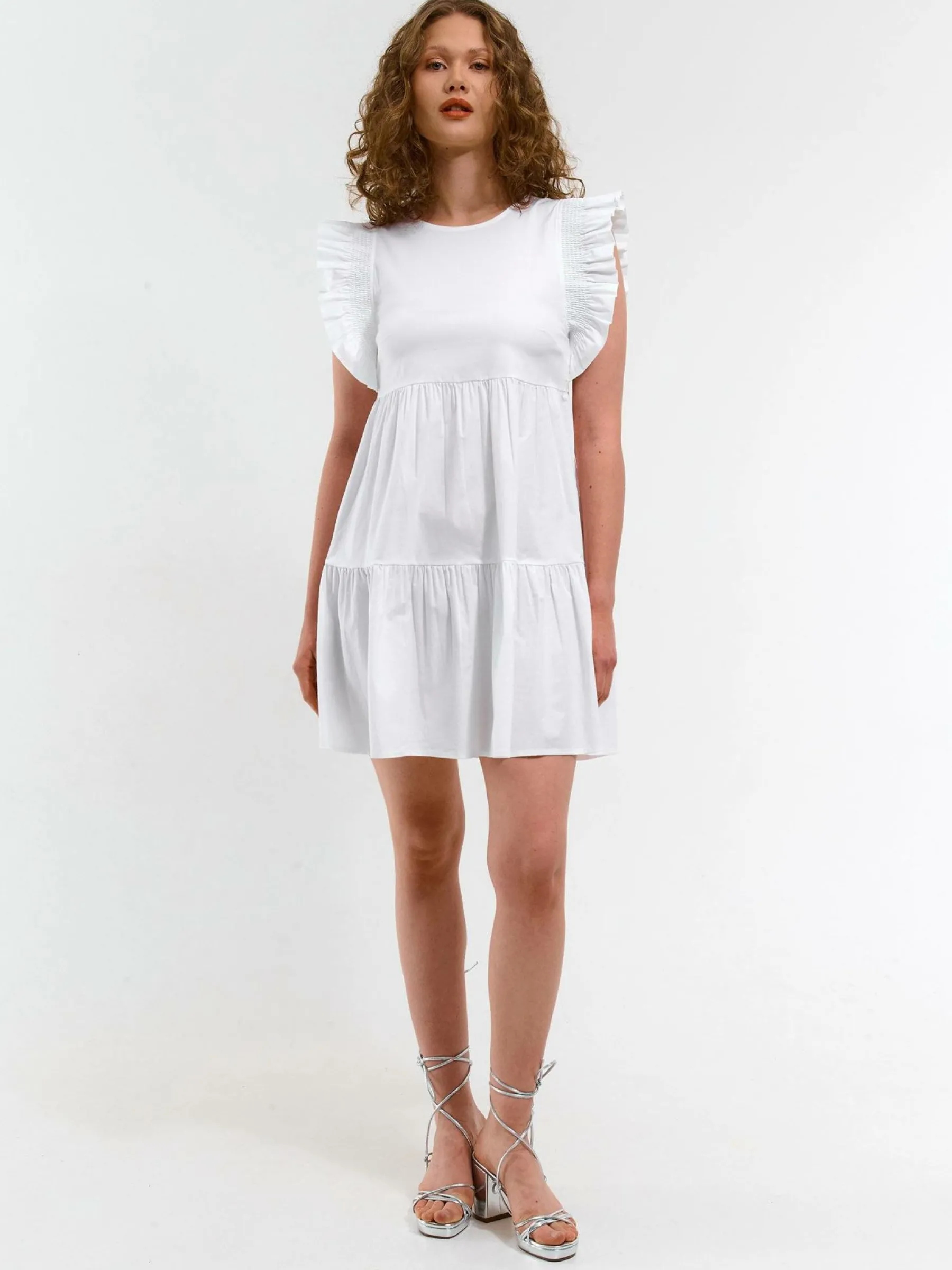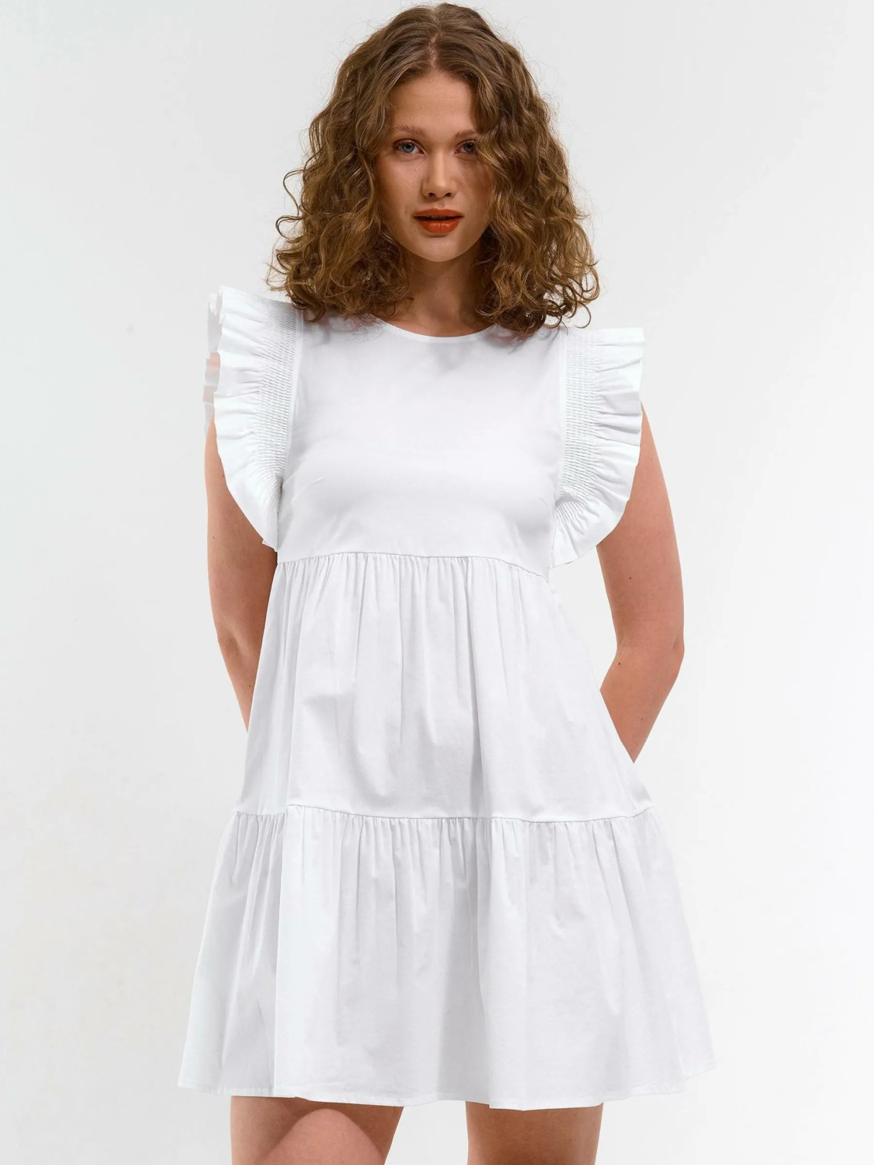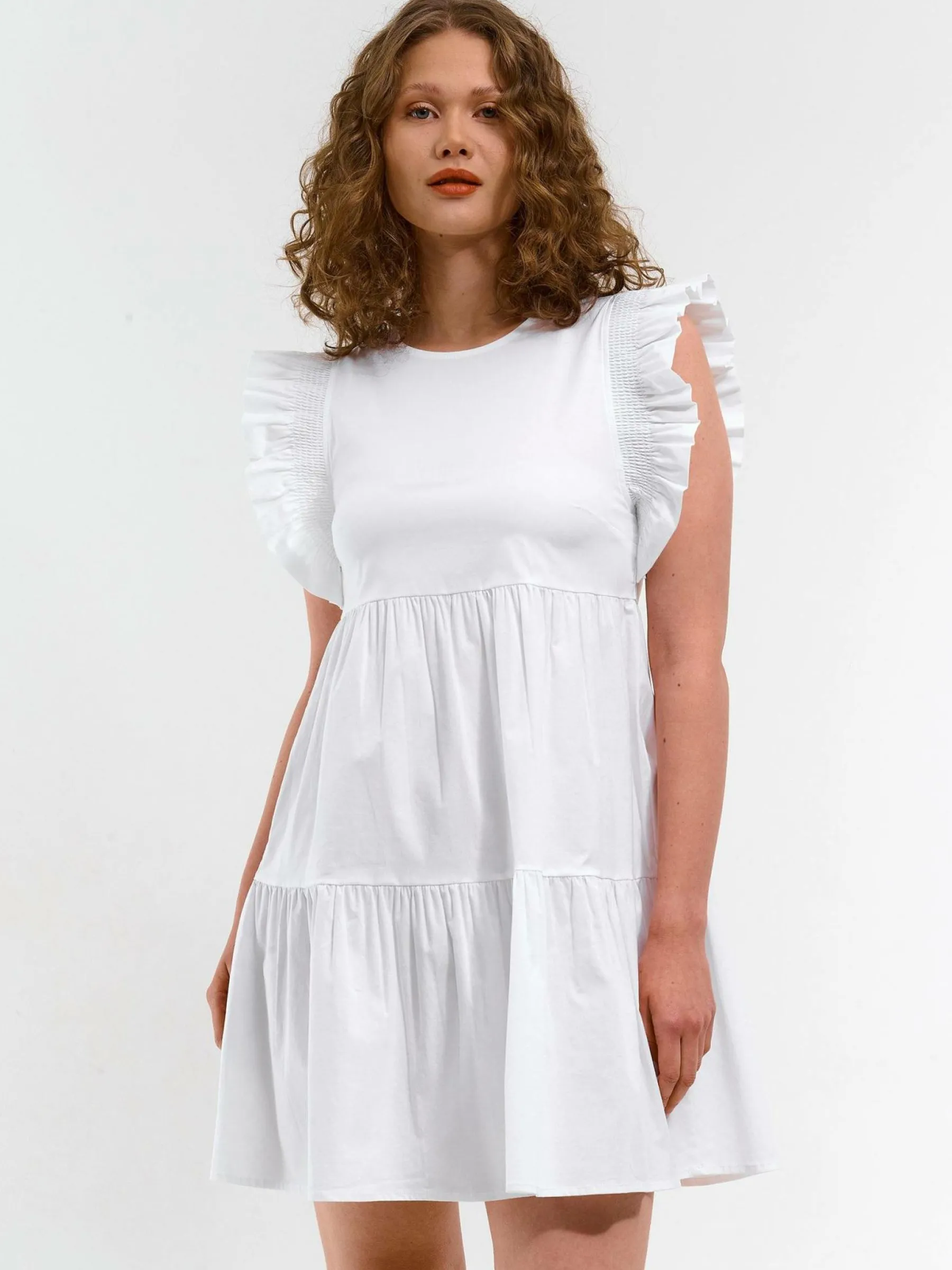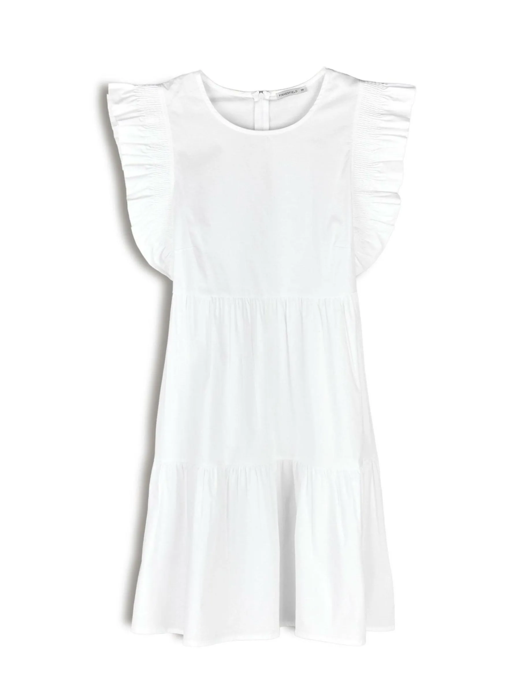 Kolor: białyKrój: z falbanąTyp: sukienkaRekaw: krótki rękawDługość: miniPattern style: pojedynczy kolorMateriał…