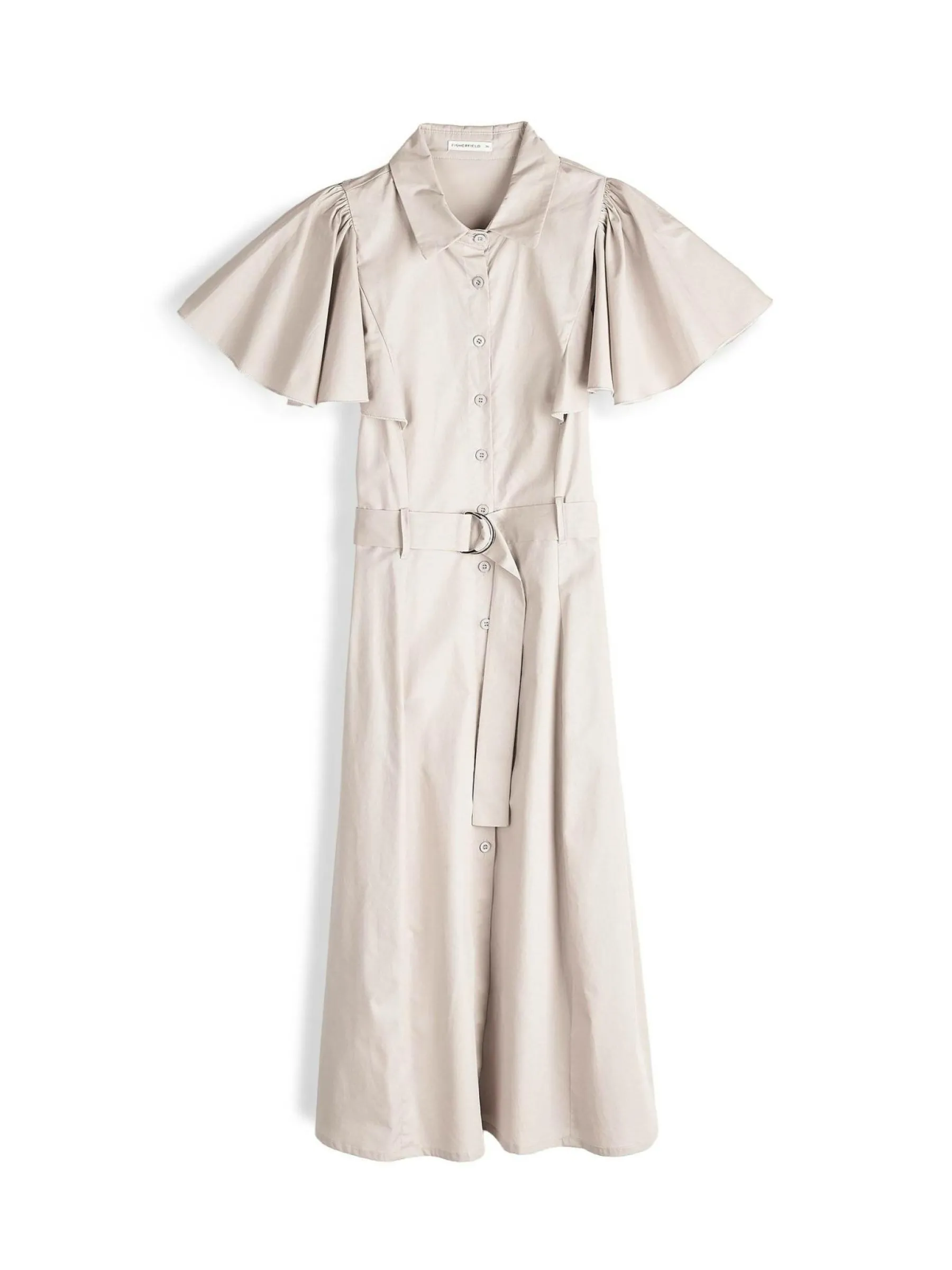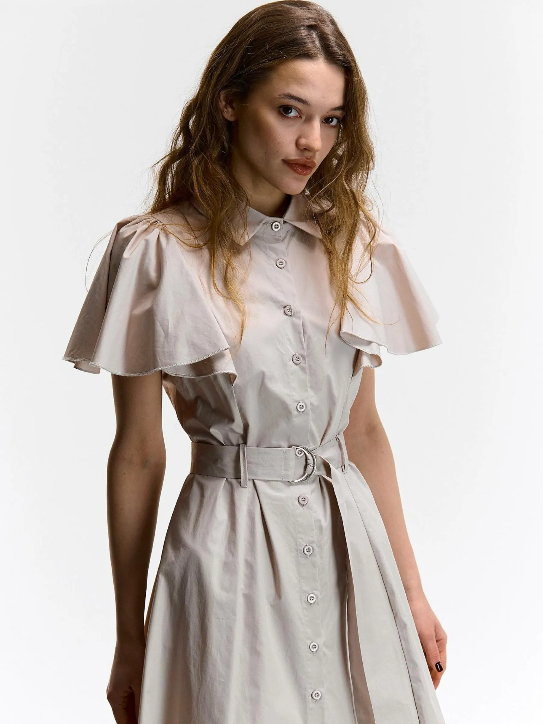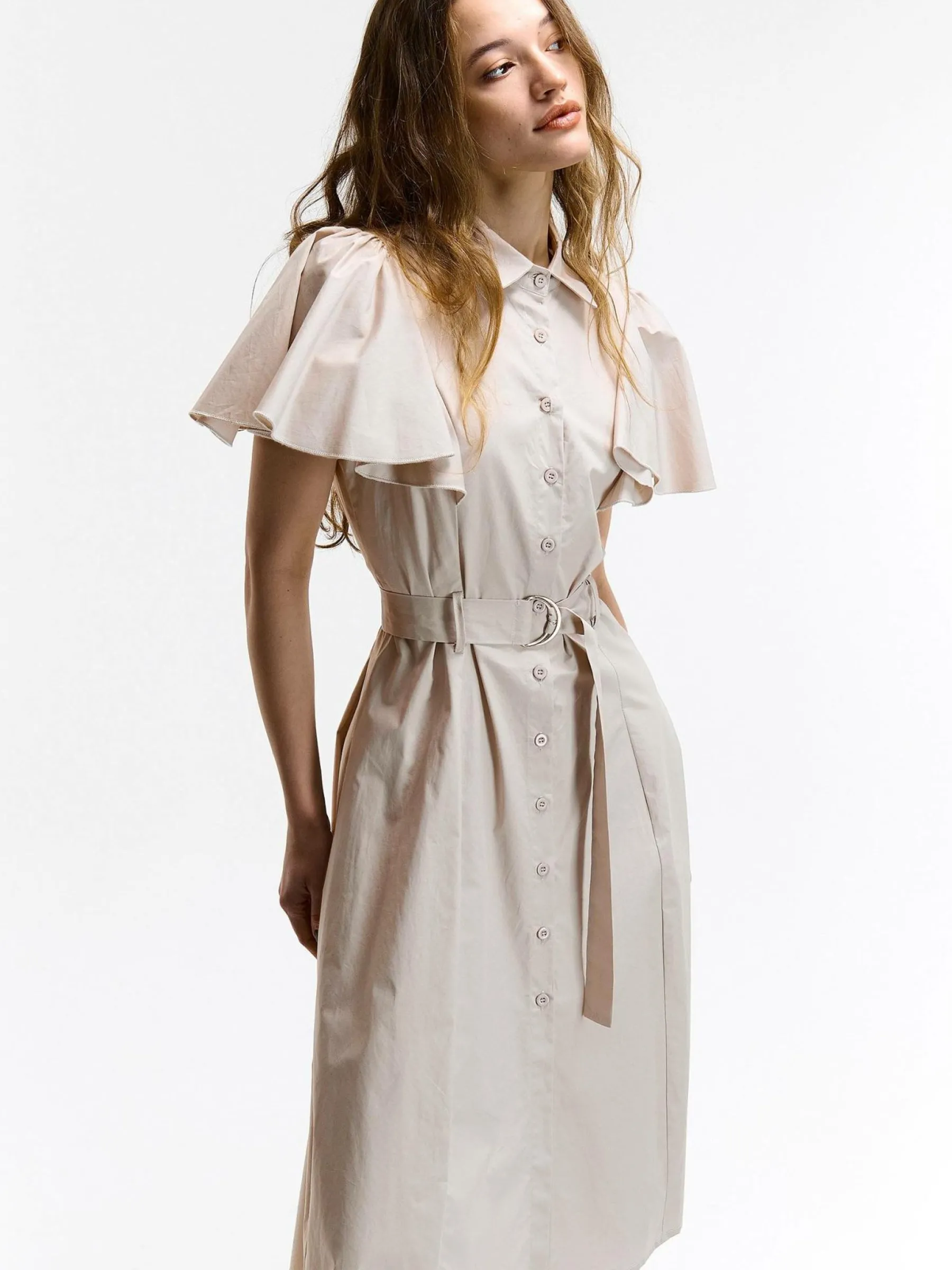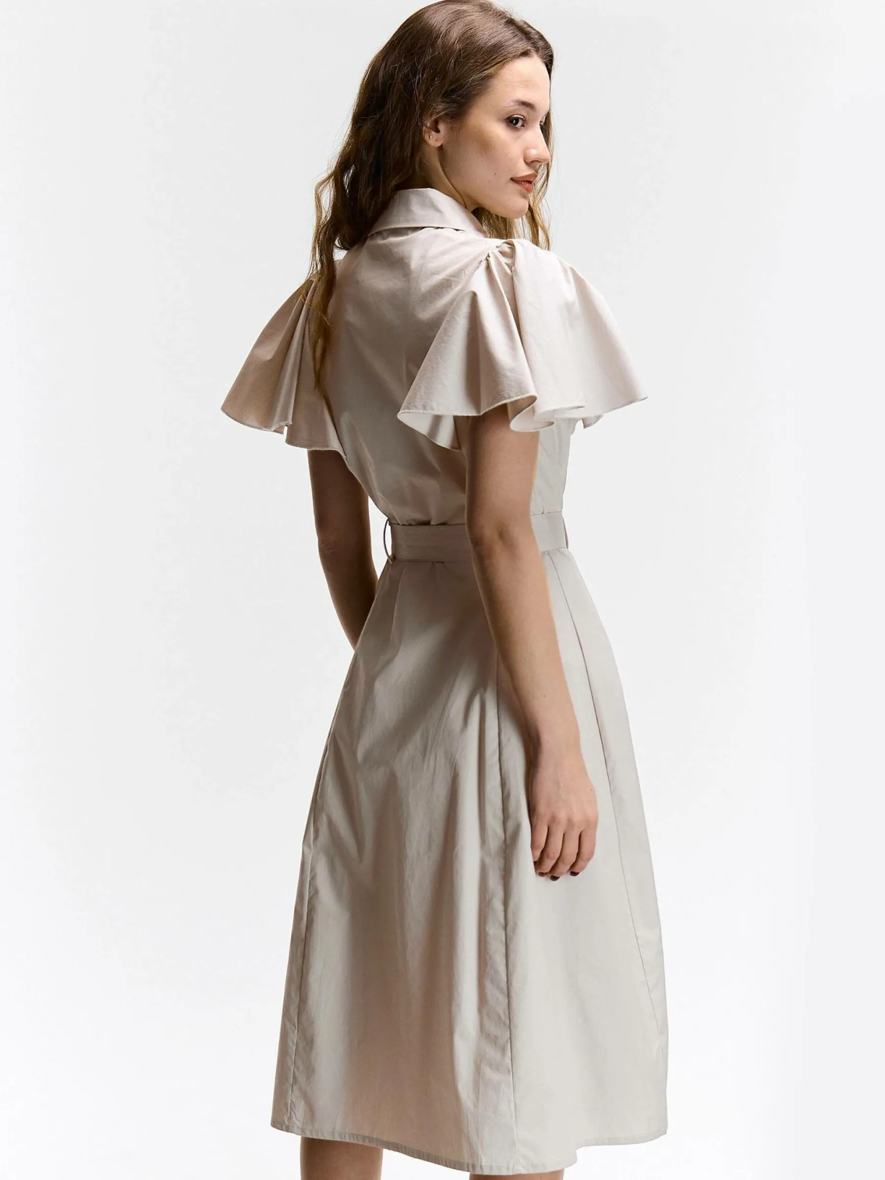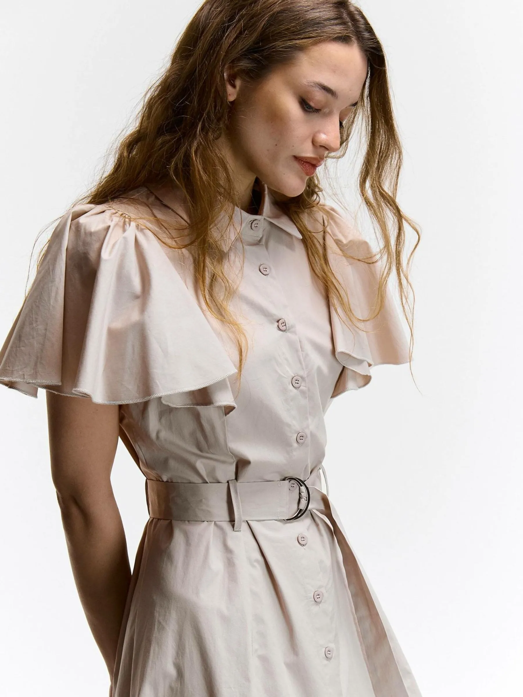 Kolor: beżowyKrój: koszulowe, z falbanąTyp: sukienkaRekaw: krótki rękawDługość: midiPattern style: pojedynczy ko…