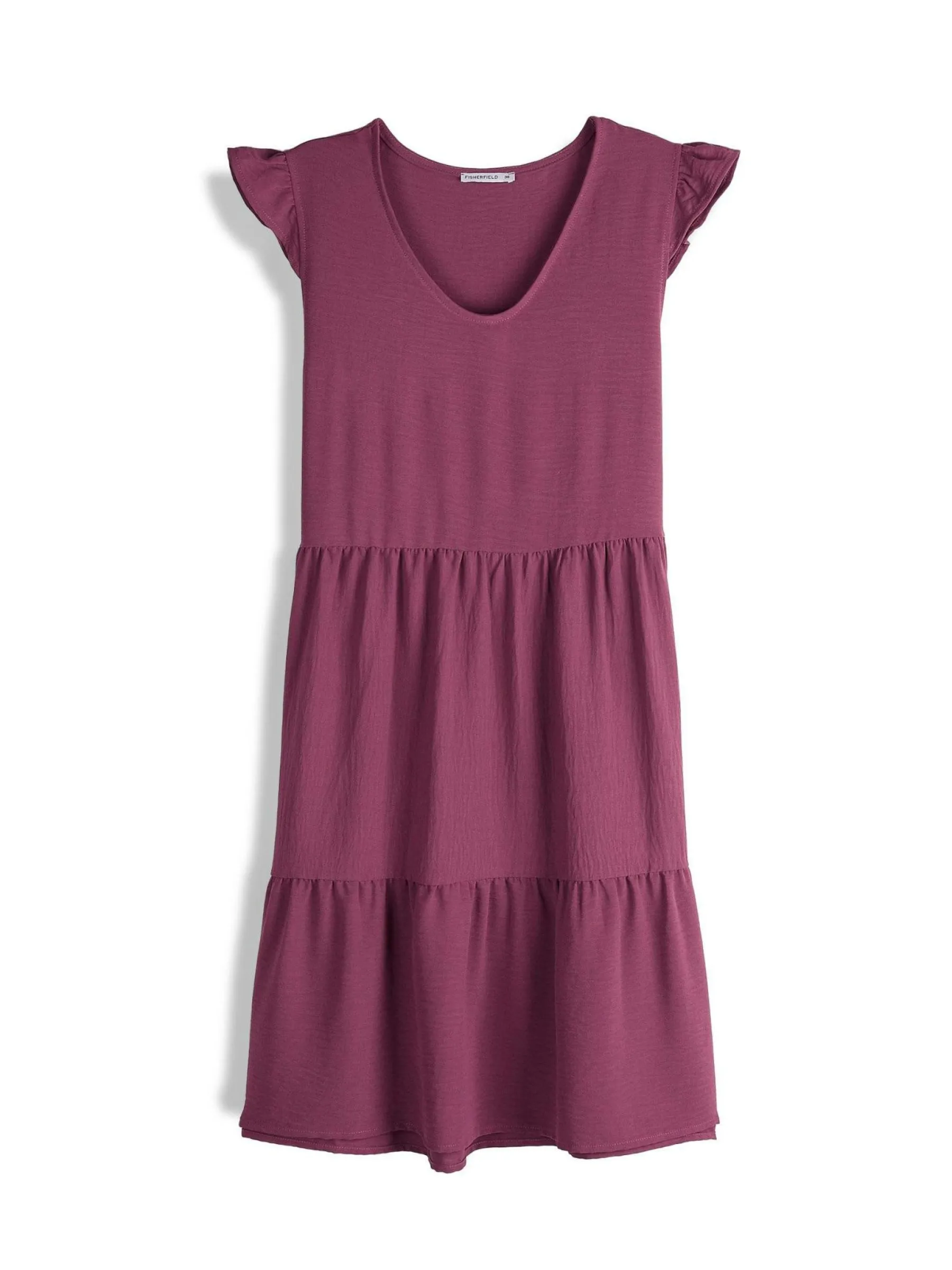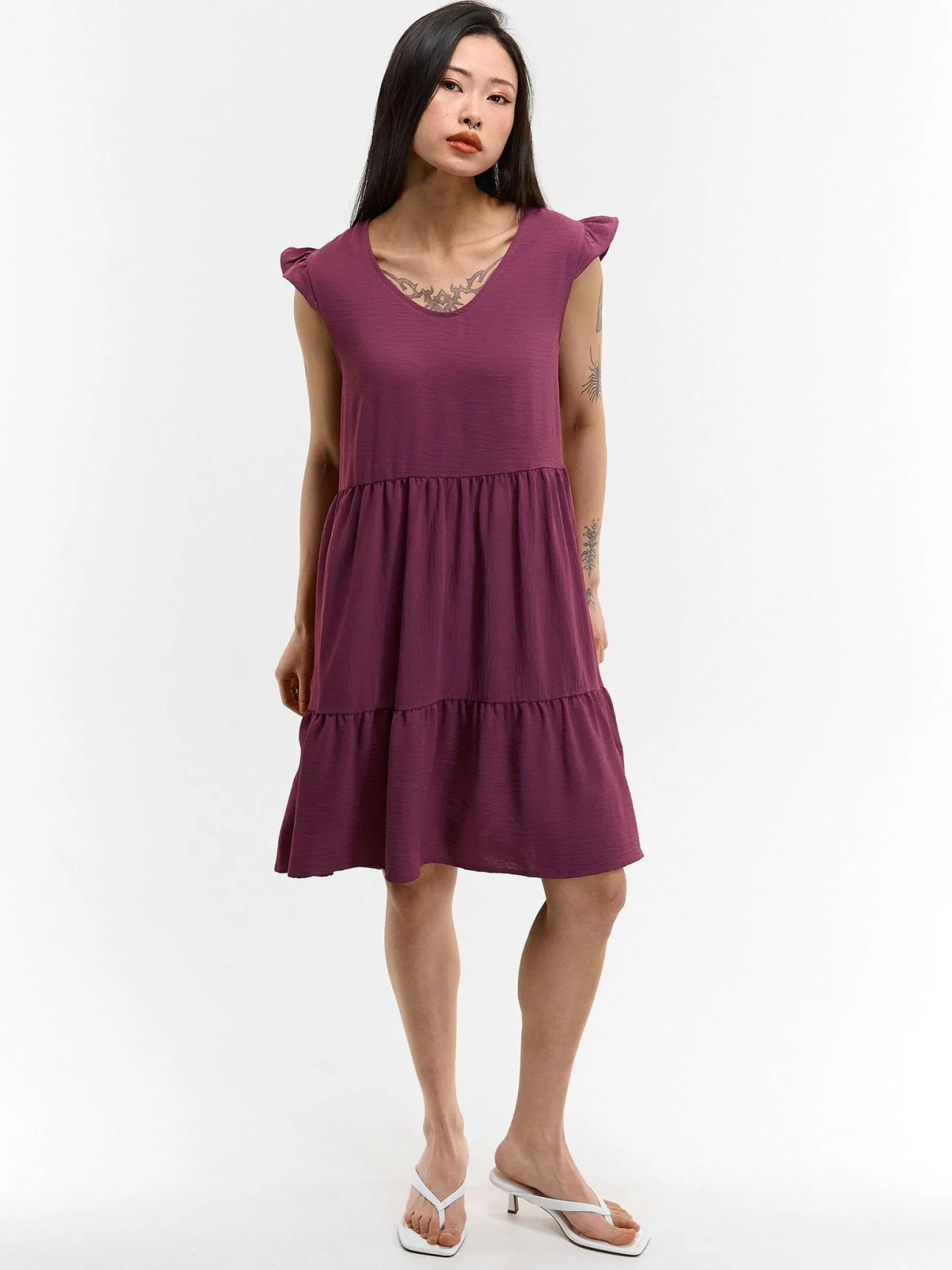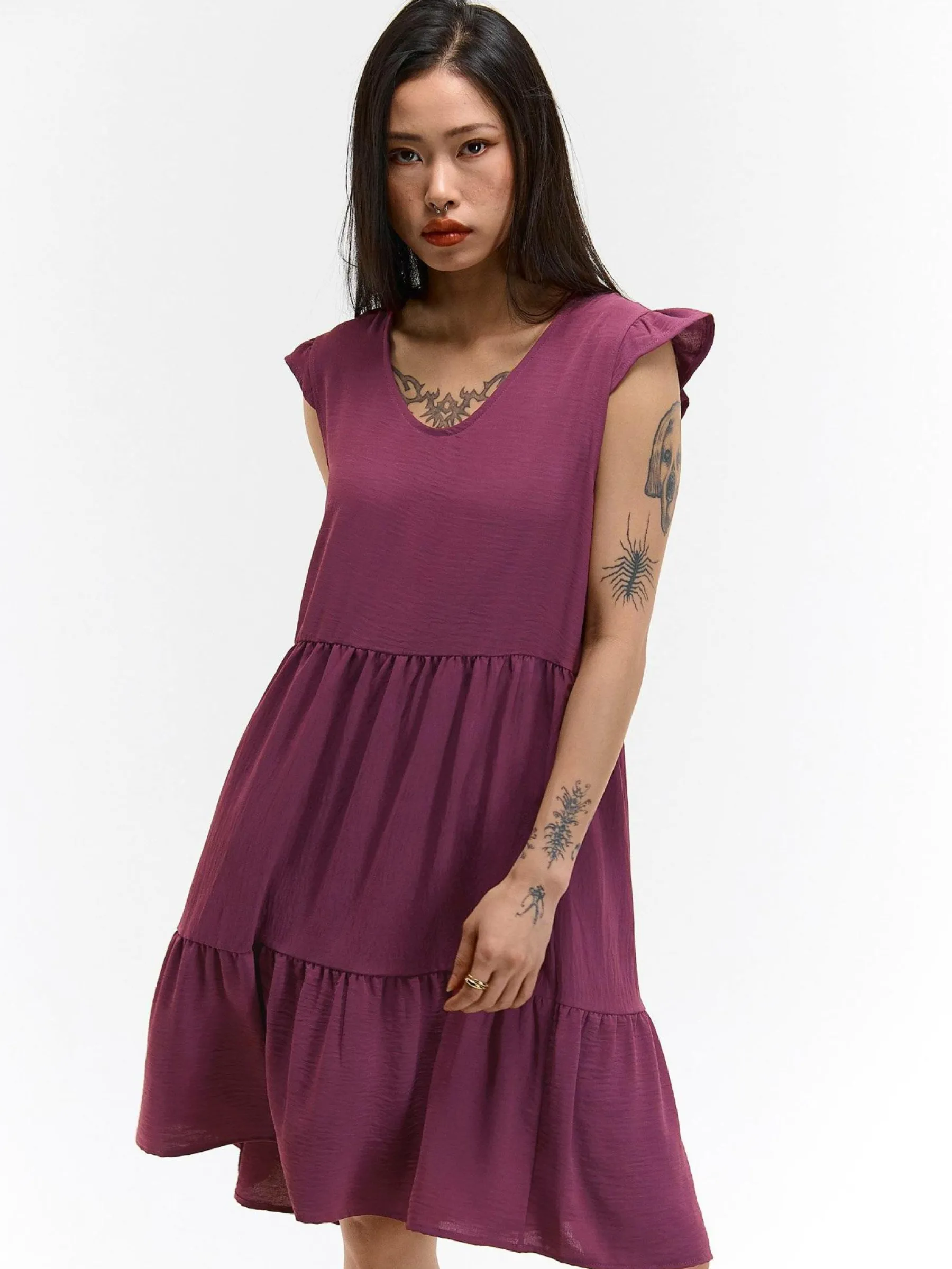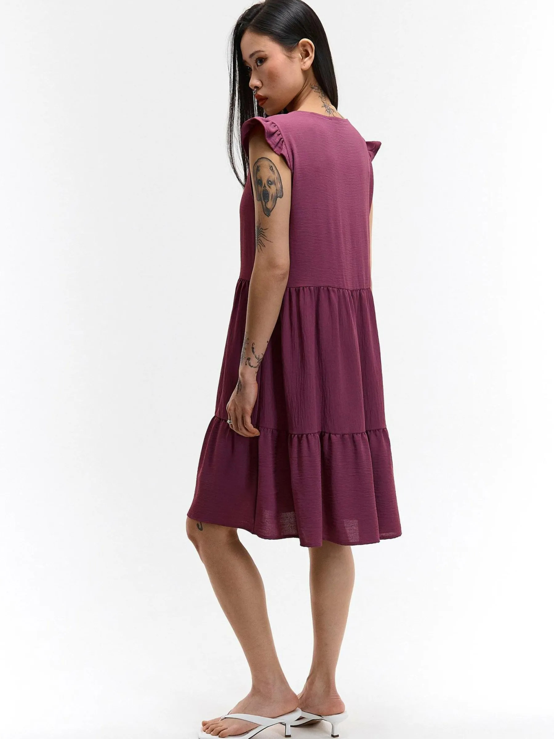 Kolor: purpurowyKrój: z falbanąTyp: sukienkaRekaw: krótki rękawDługość: miniPattern style: pojedynczy kolorDetal:…
