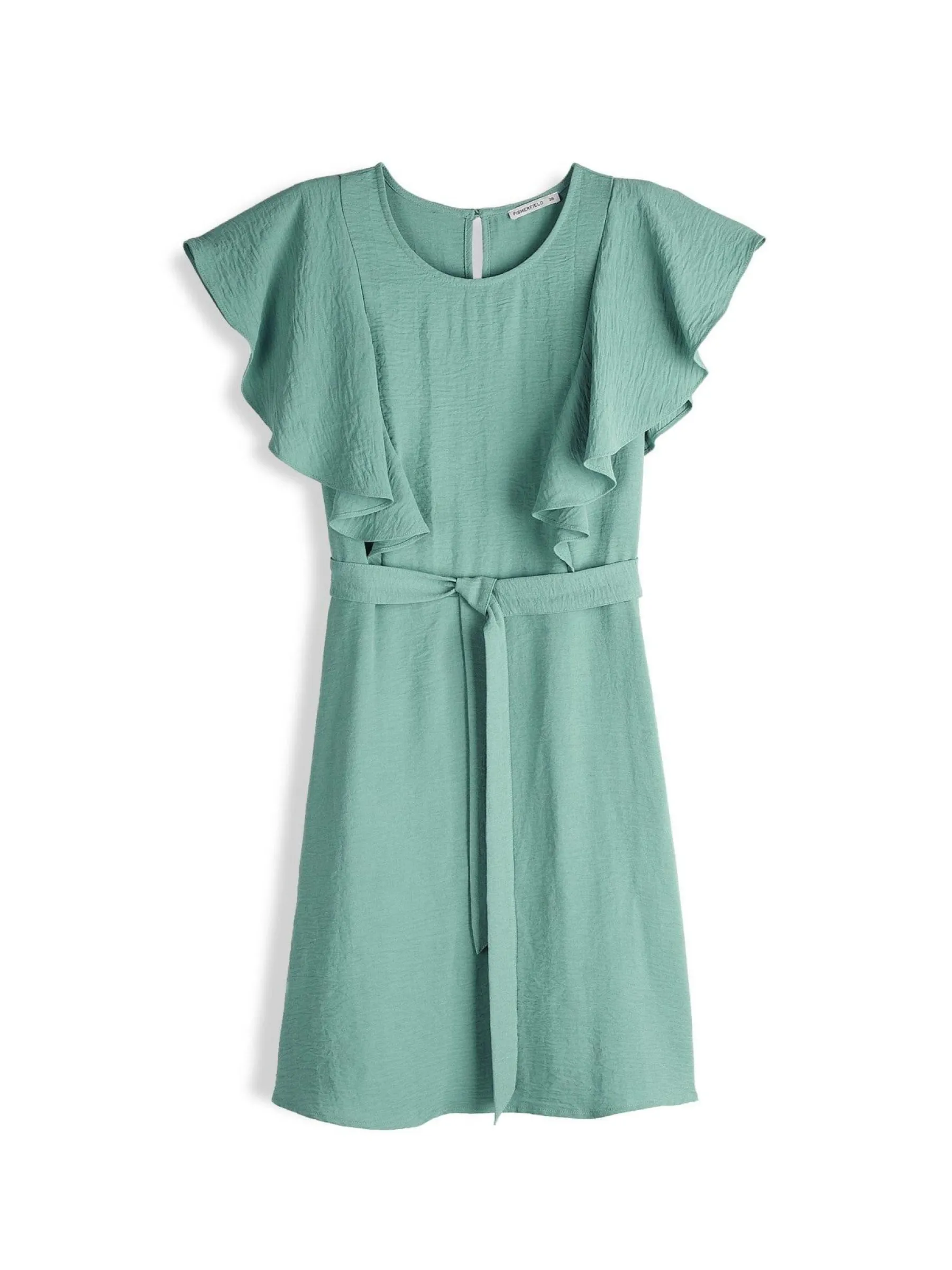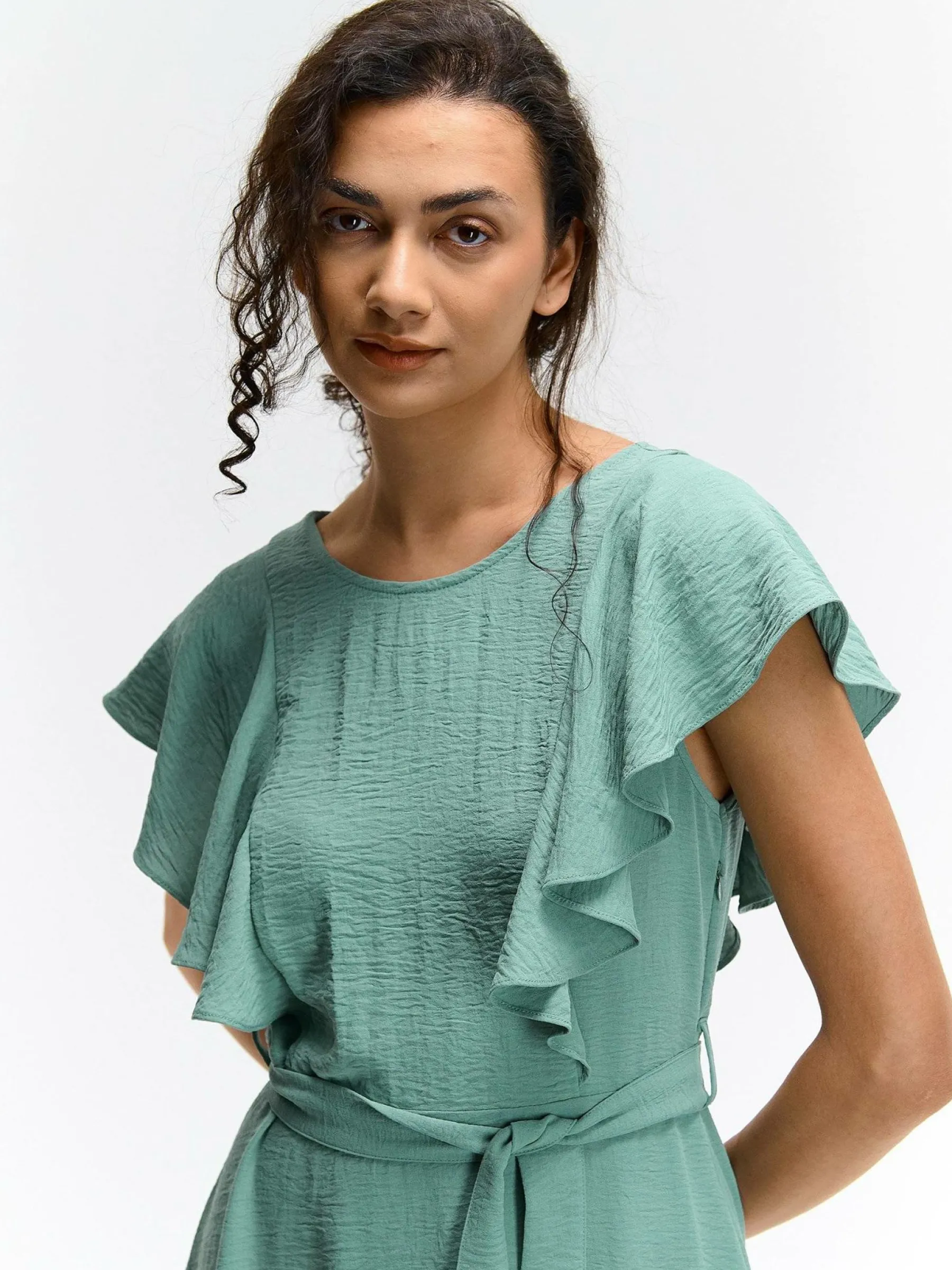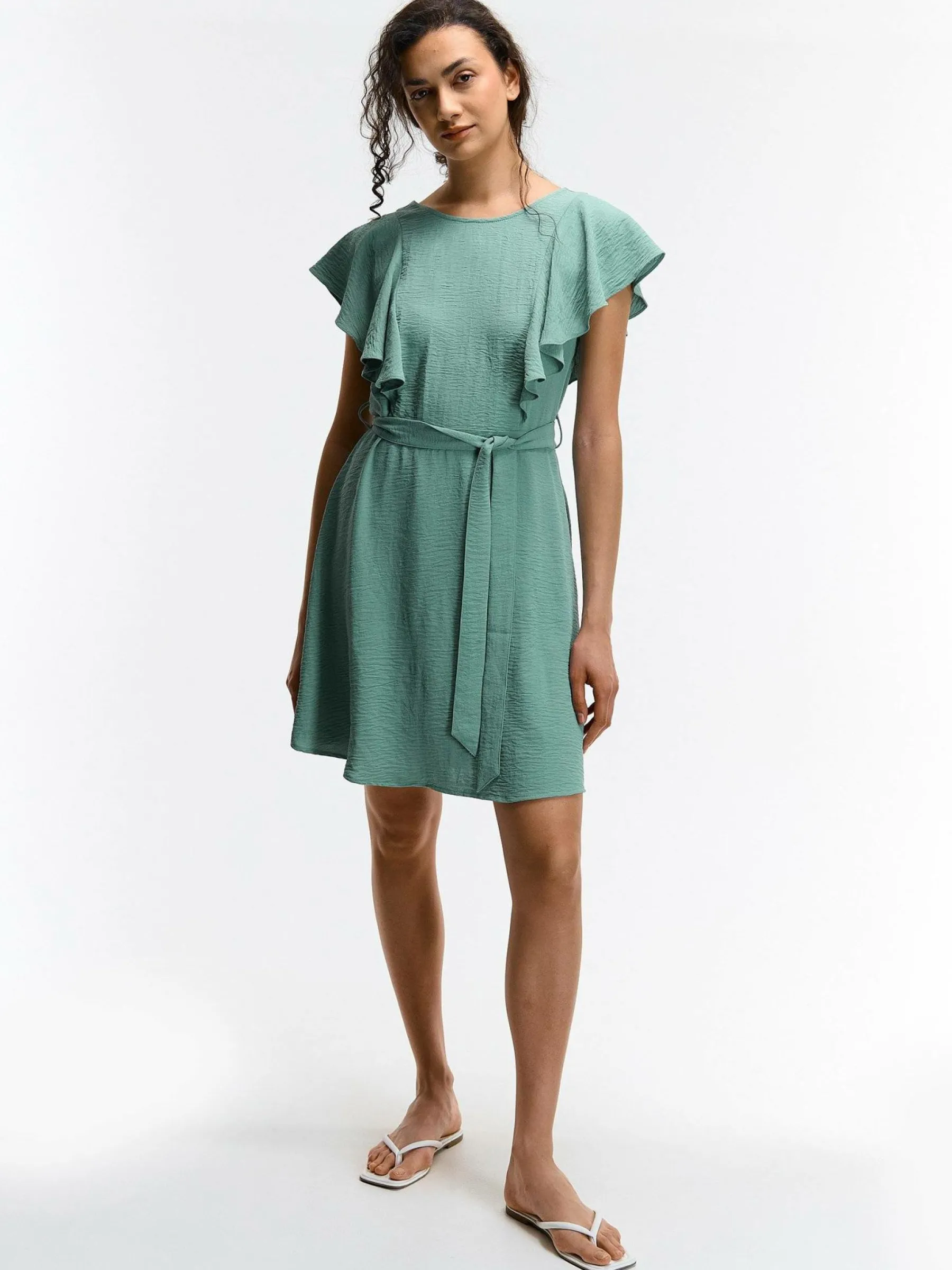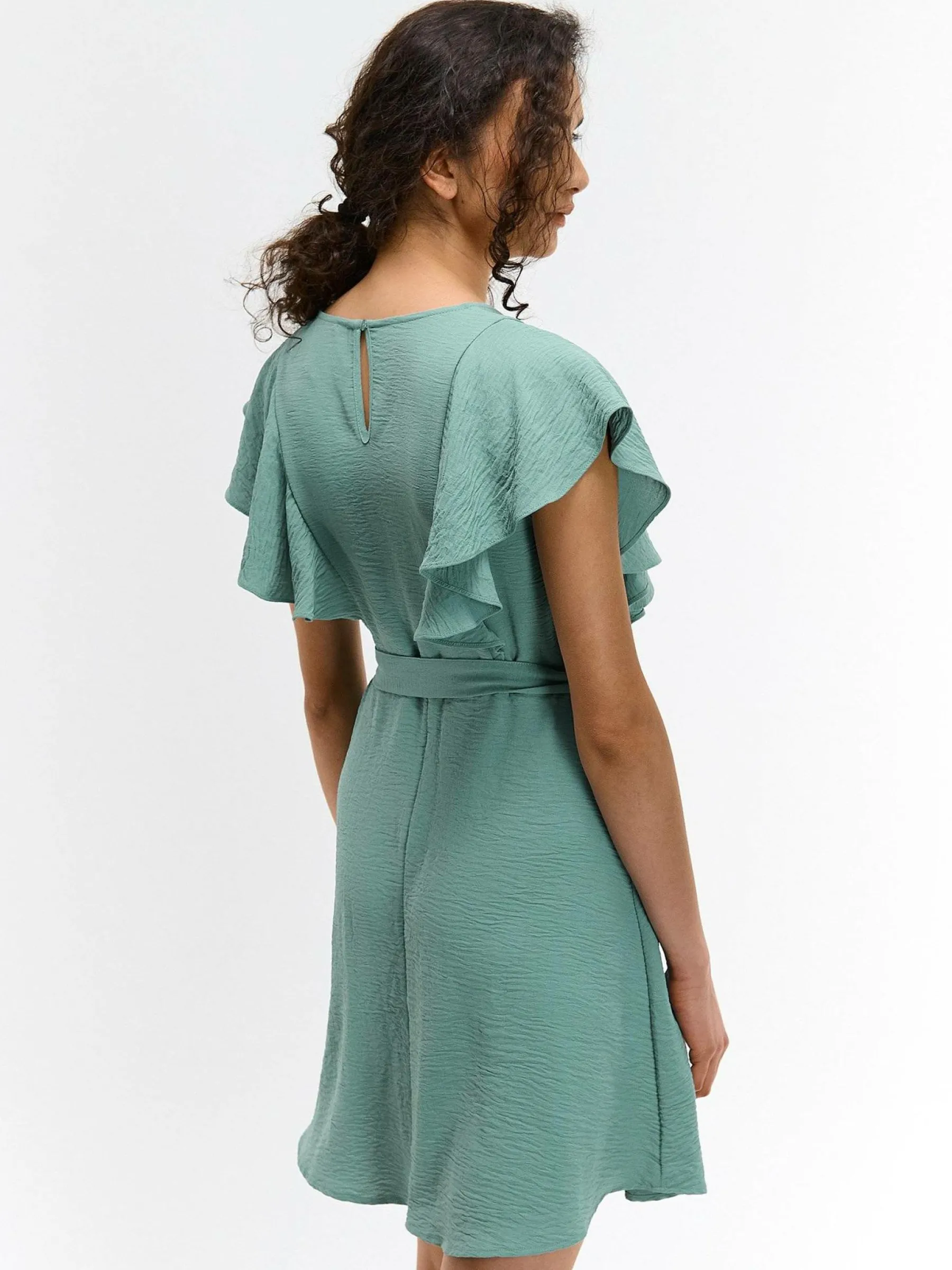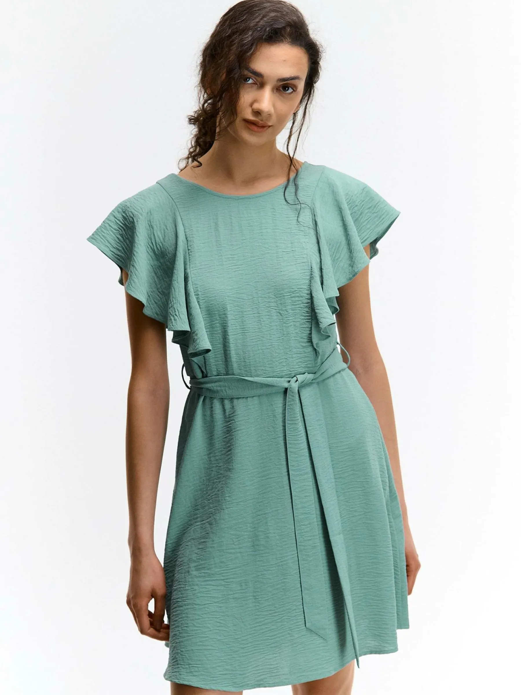 Kolor: zielonyKrój: z falbanąTyp: sukienkaRekaw: krótki rękawDługość: miniPattern style: pojedynczy kolorDetal: z…