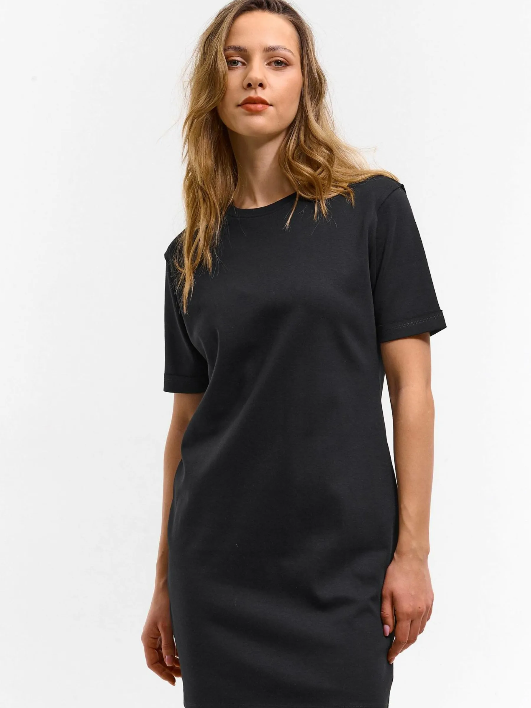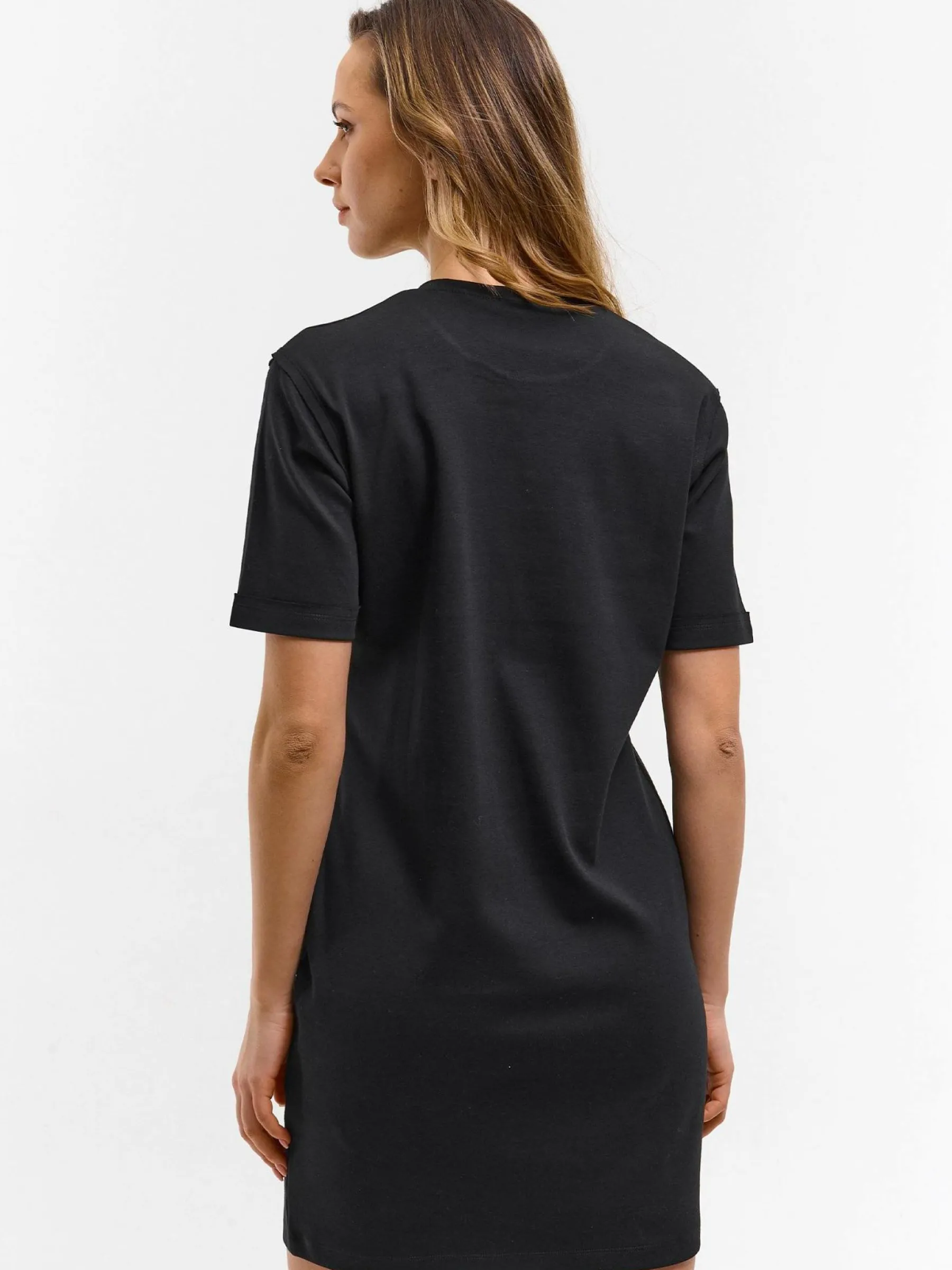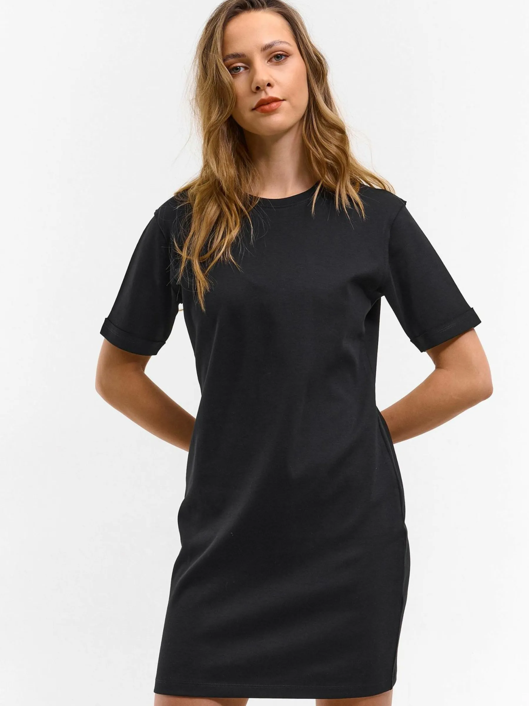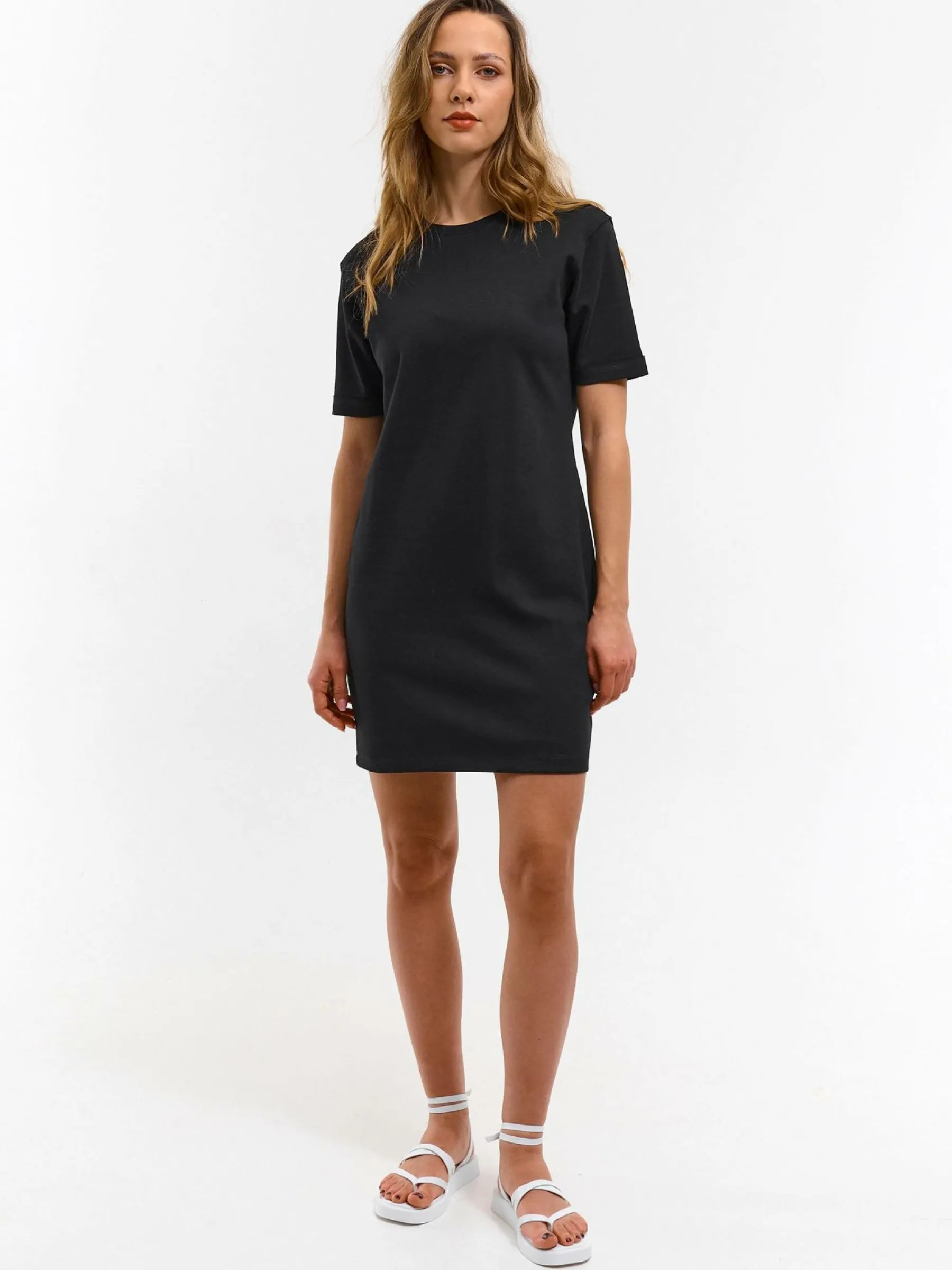 Kolor: czarnyKrój: regularTyp: sukienkaRekaw: krótki rękawDługość: miniPattern style: pojedynczy kolorDetal: nad g…