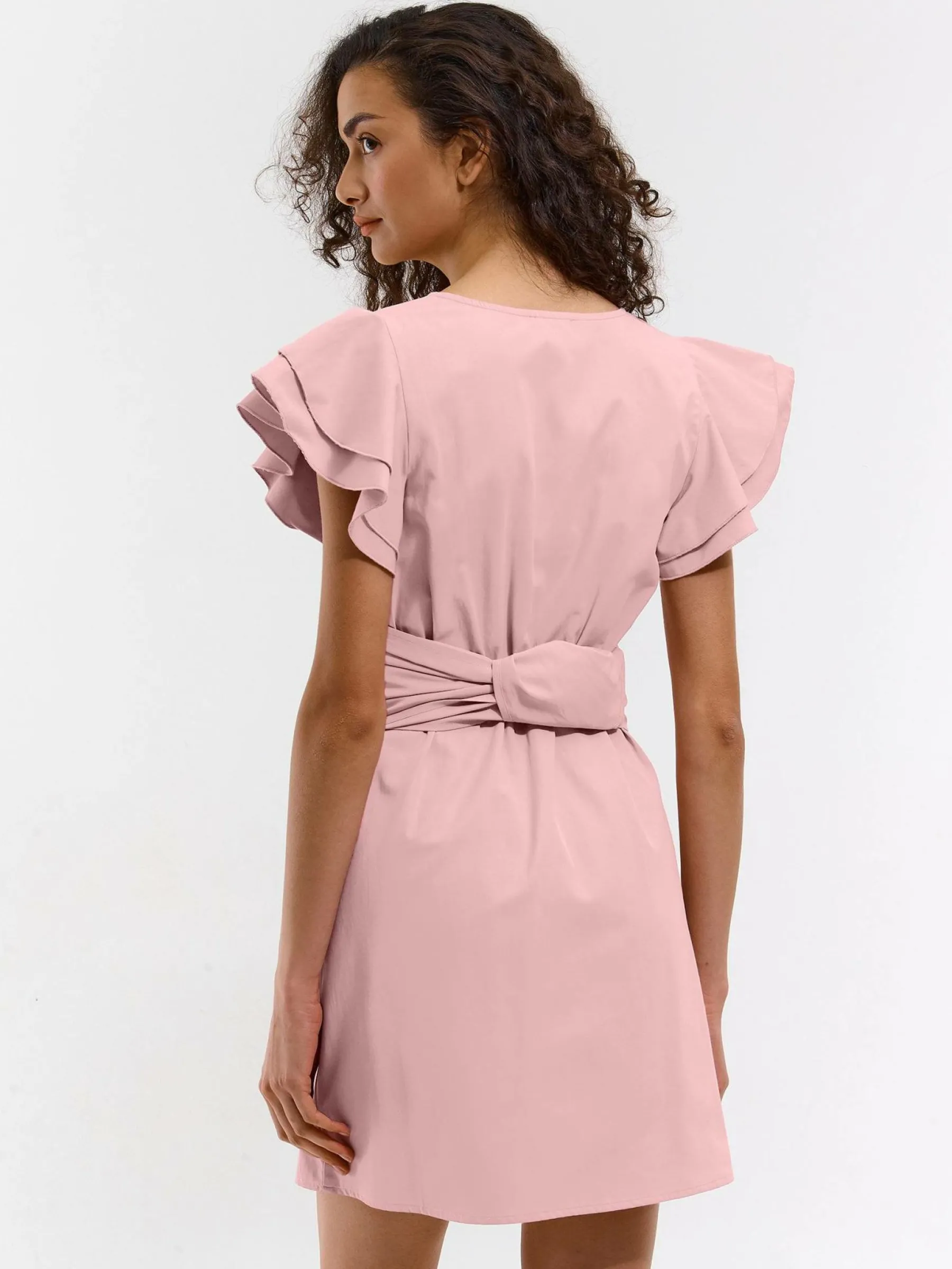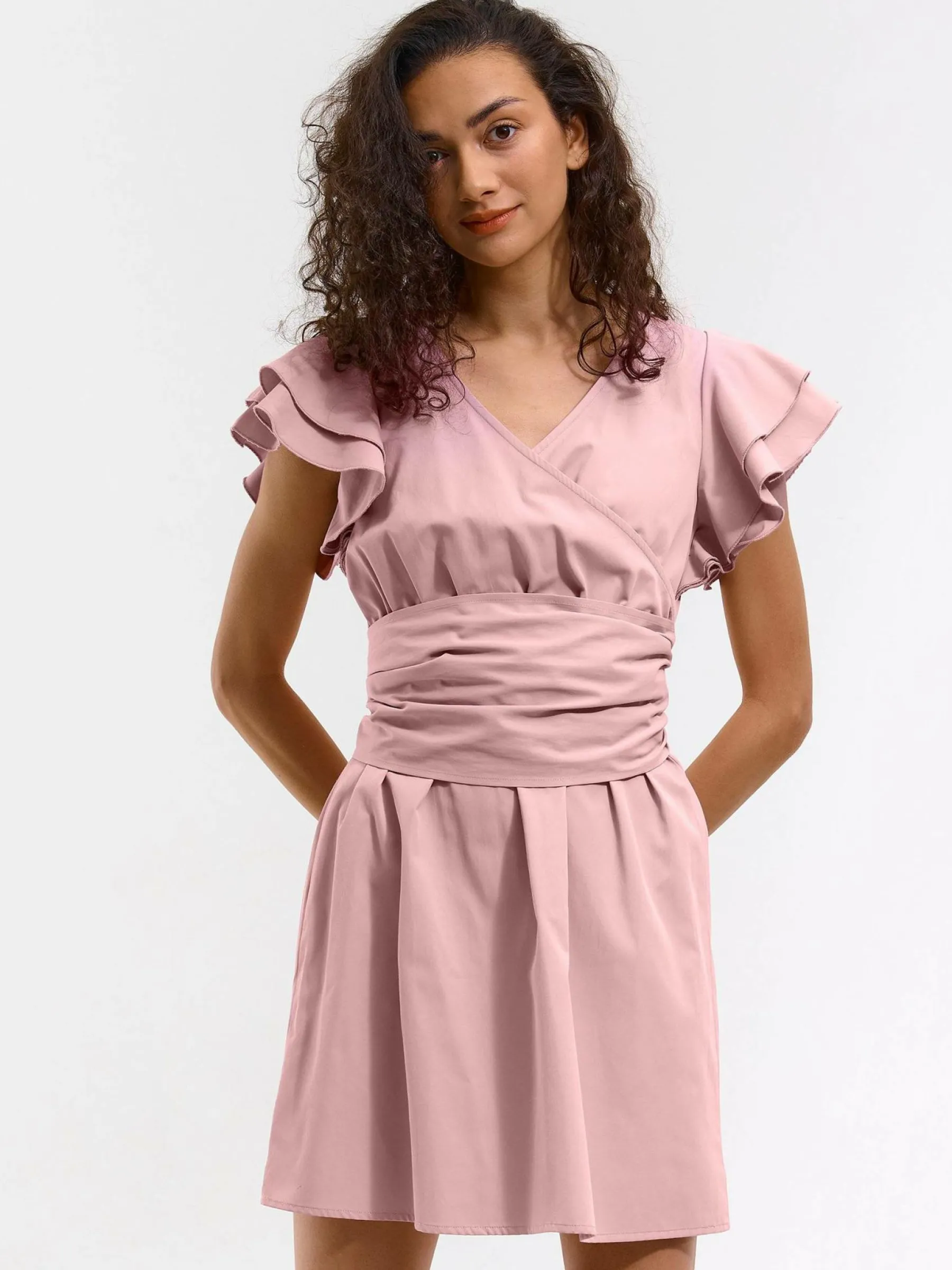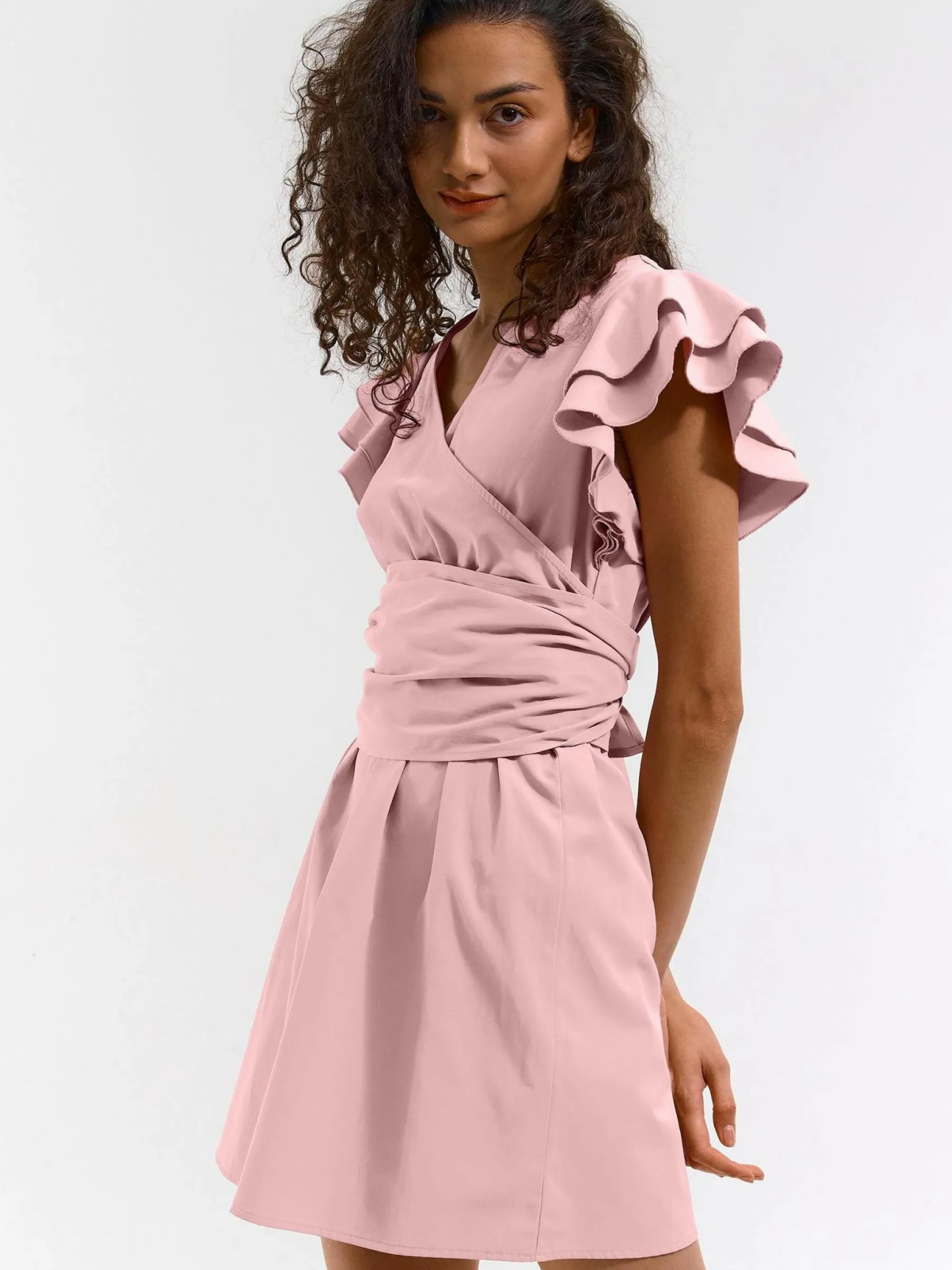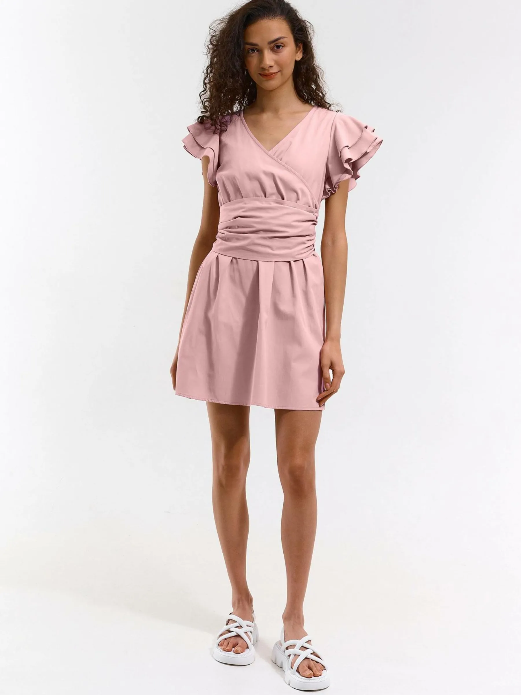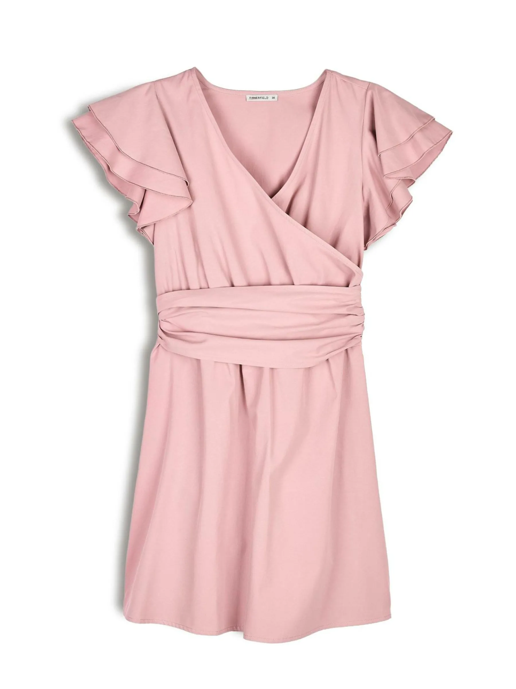Kolor: różowyKrój: z falbaną, kopertówkiTyp: sukienkaRekaw: krótki rękawDługość: miniPattern style: pojedynczy…