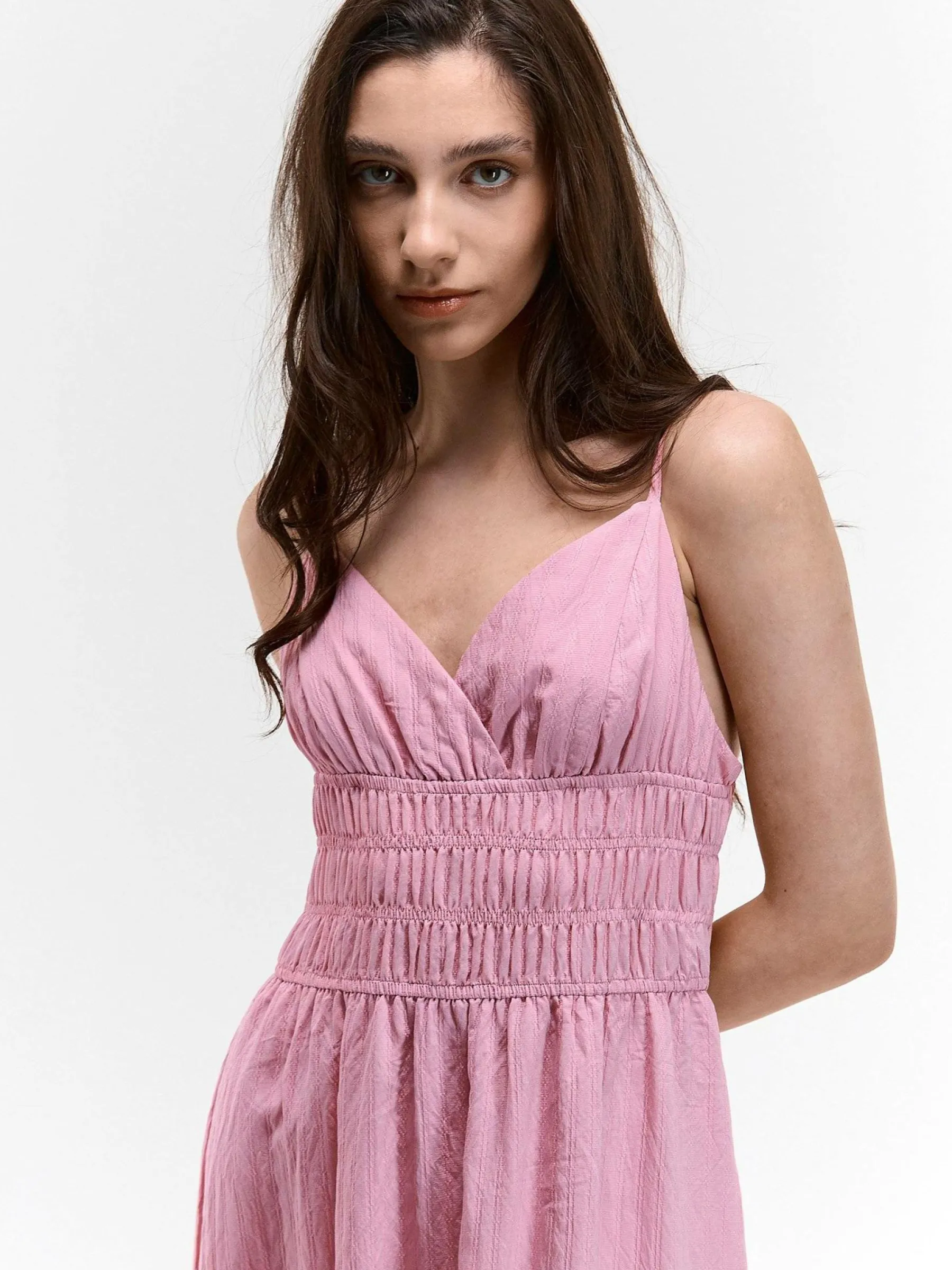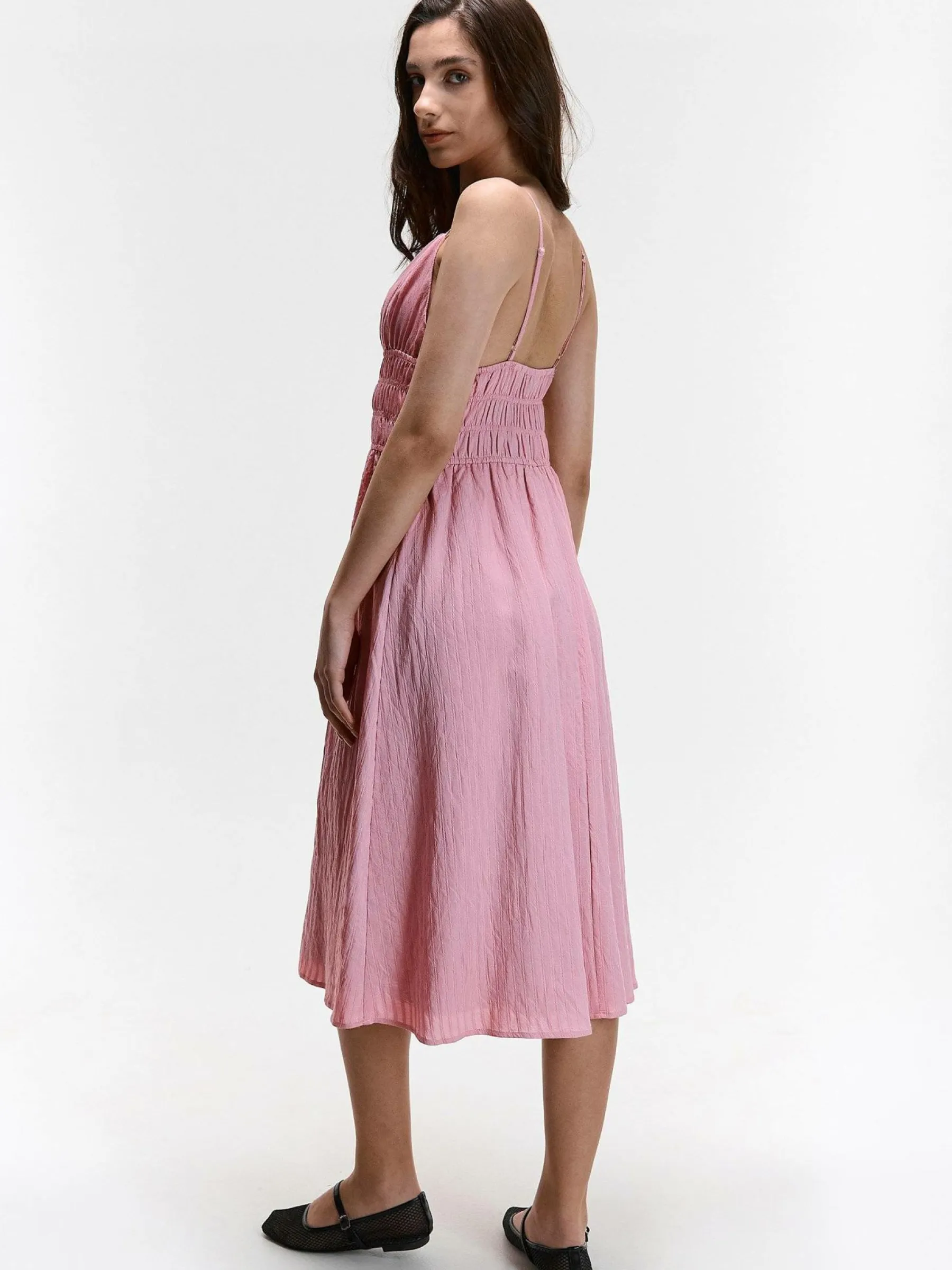 Kolor: różowyKrój: z marszczeniemTyp: sukienkaRekaw: bez rękawówDługość: midiPattern style: pojedynczy kolorDeta…