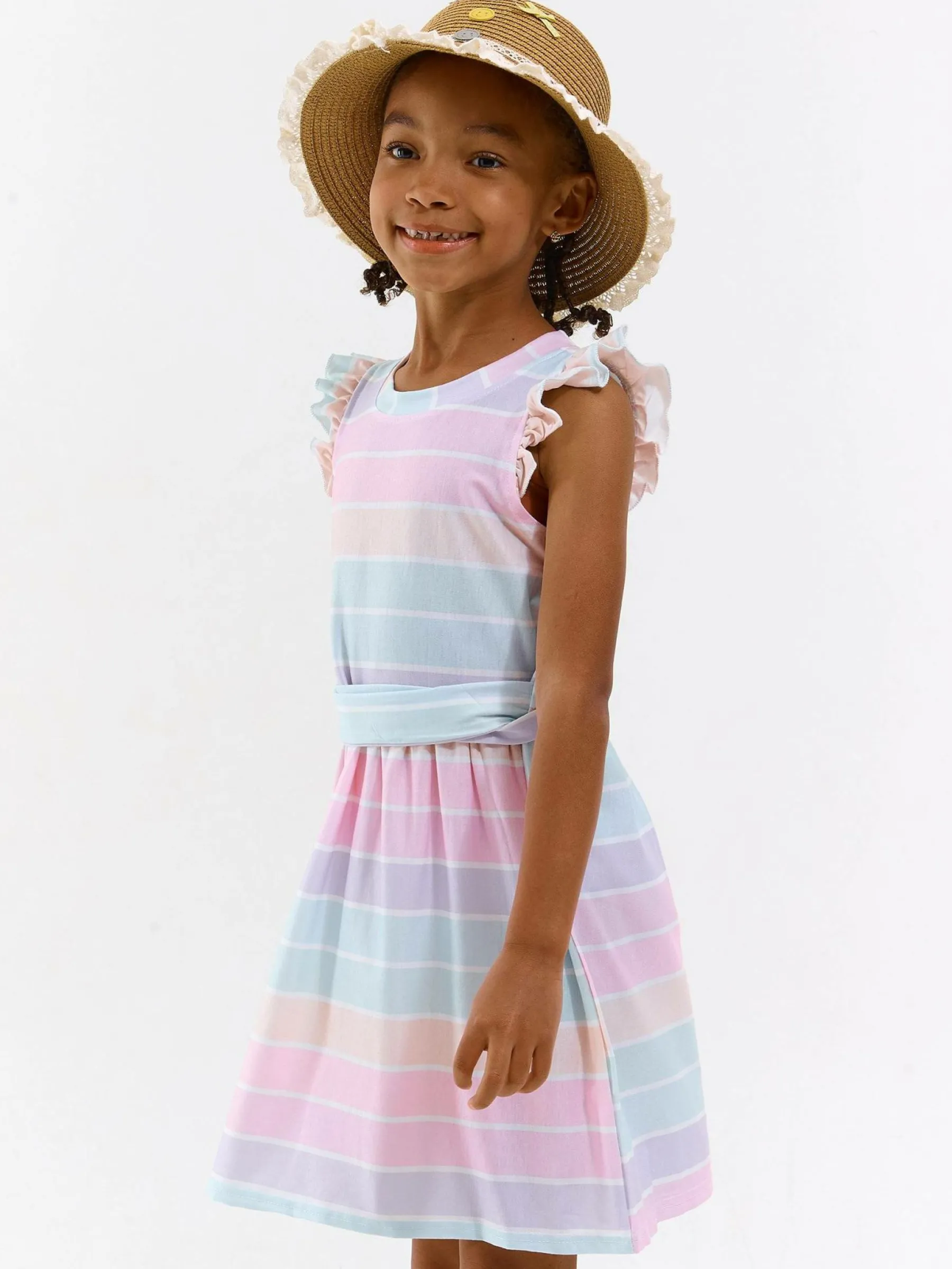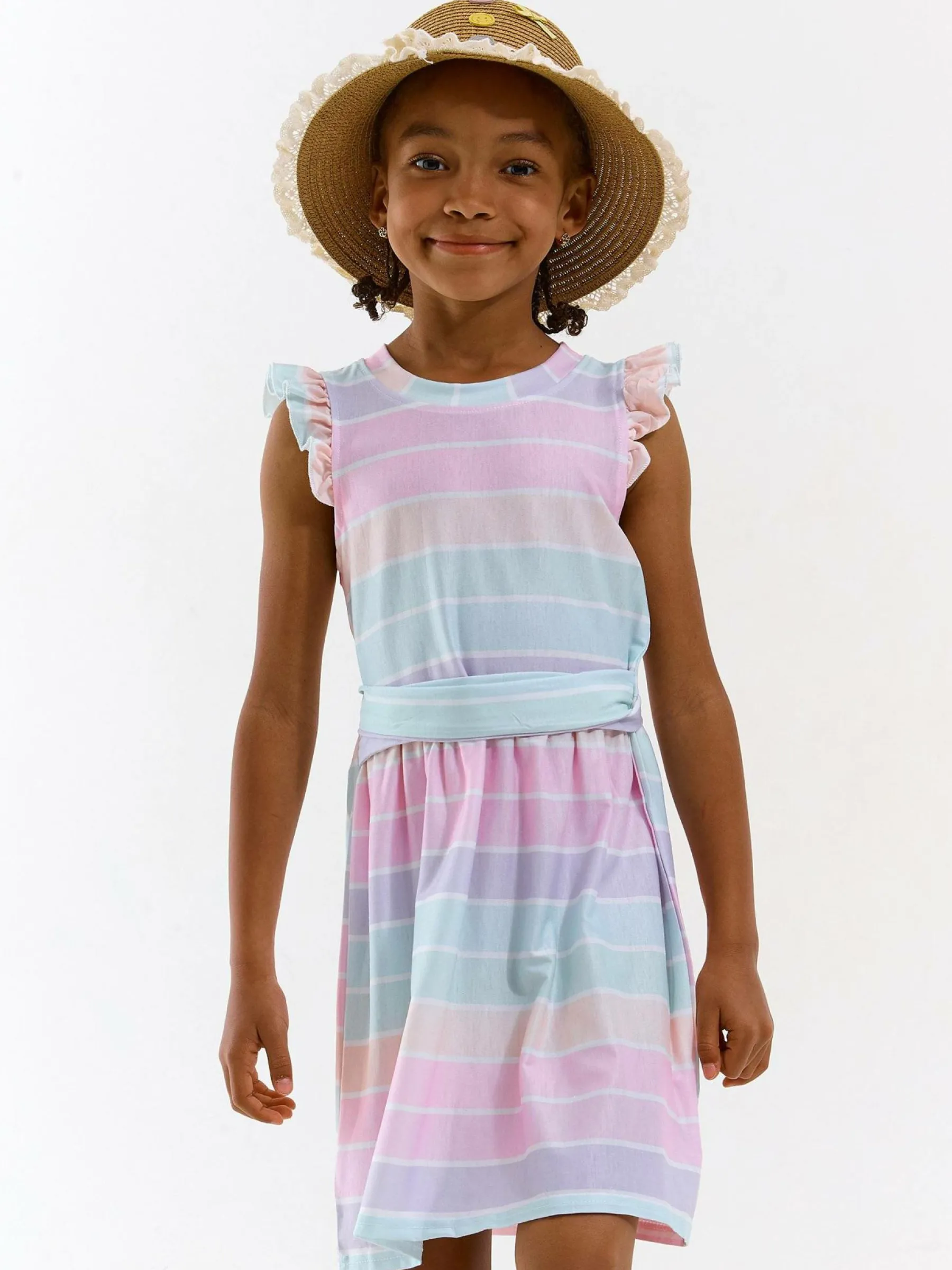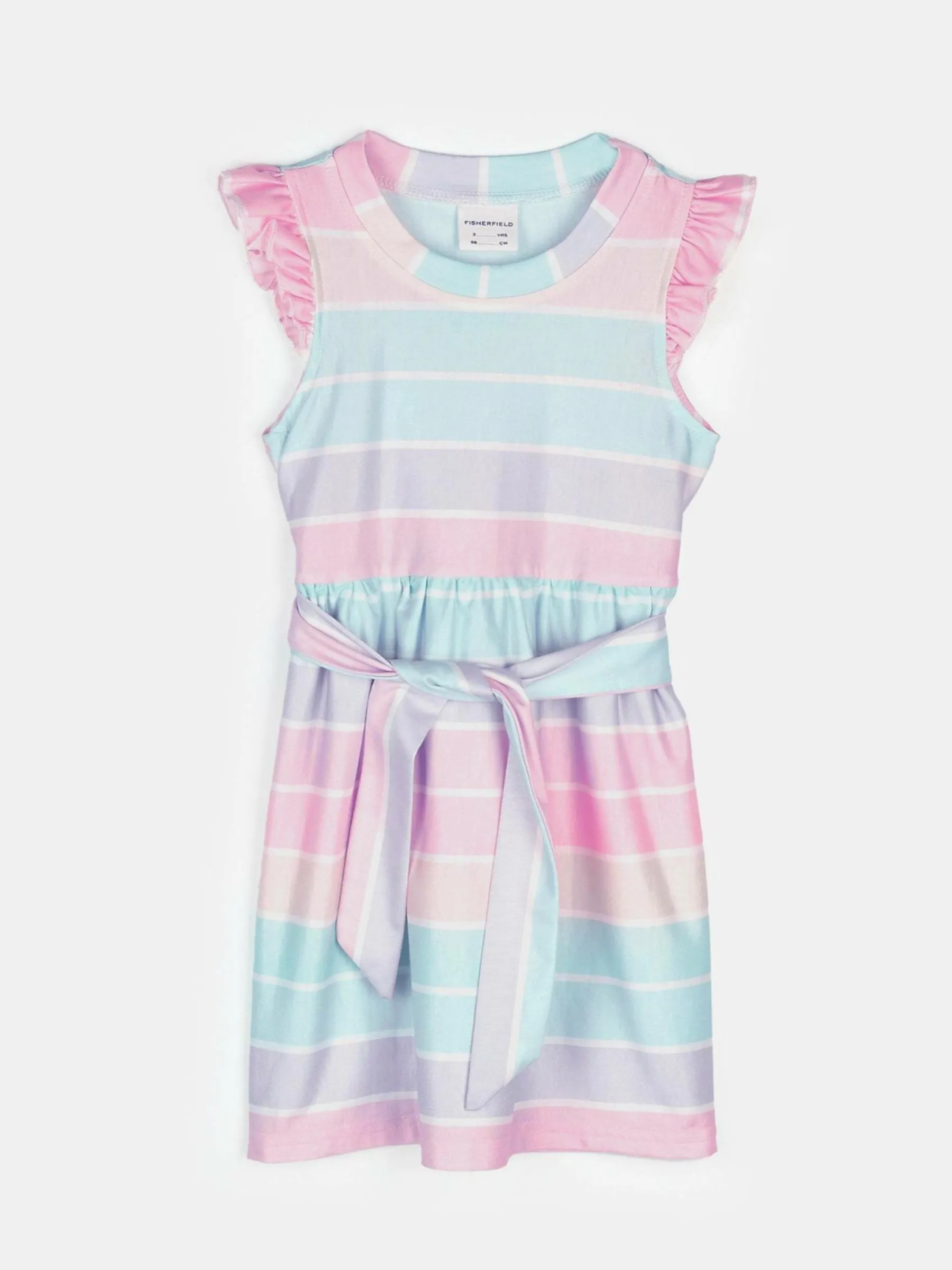 Kolor: różowyKrój: z falbanąTyp: sukienkaRekaw: bez rękawówDługość: miniPattern style: w prążkiDetal: z paski…