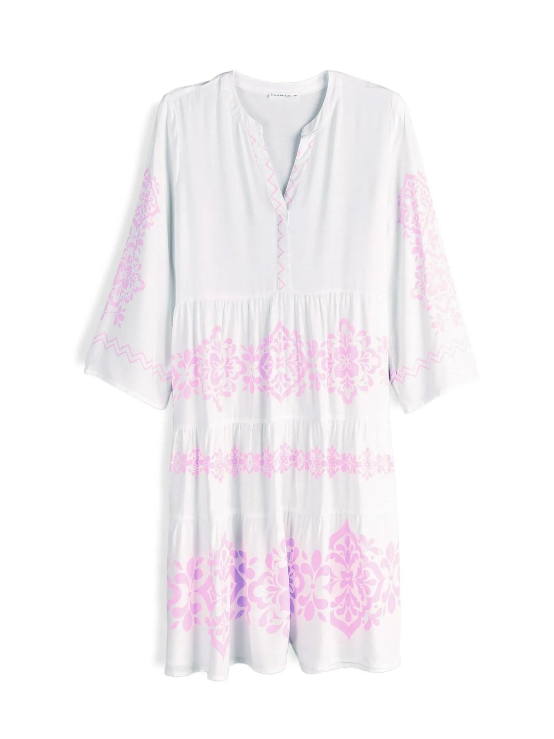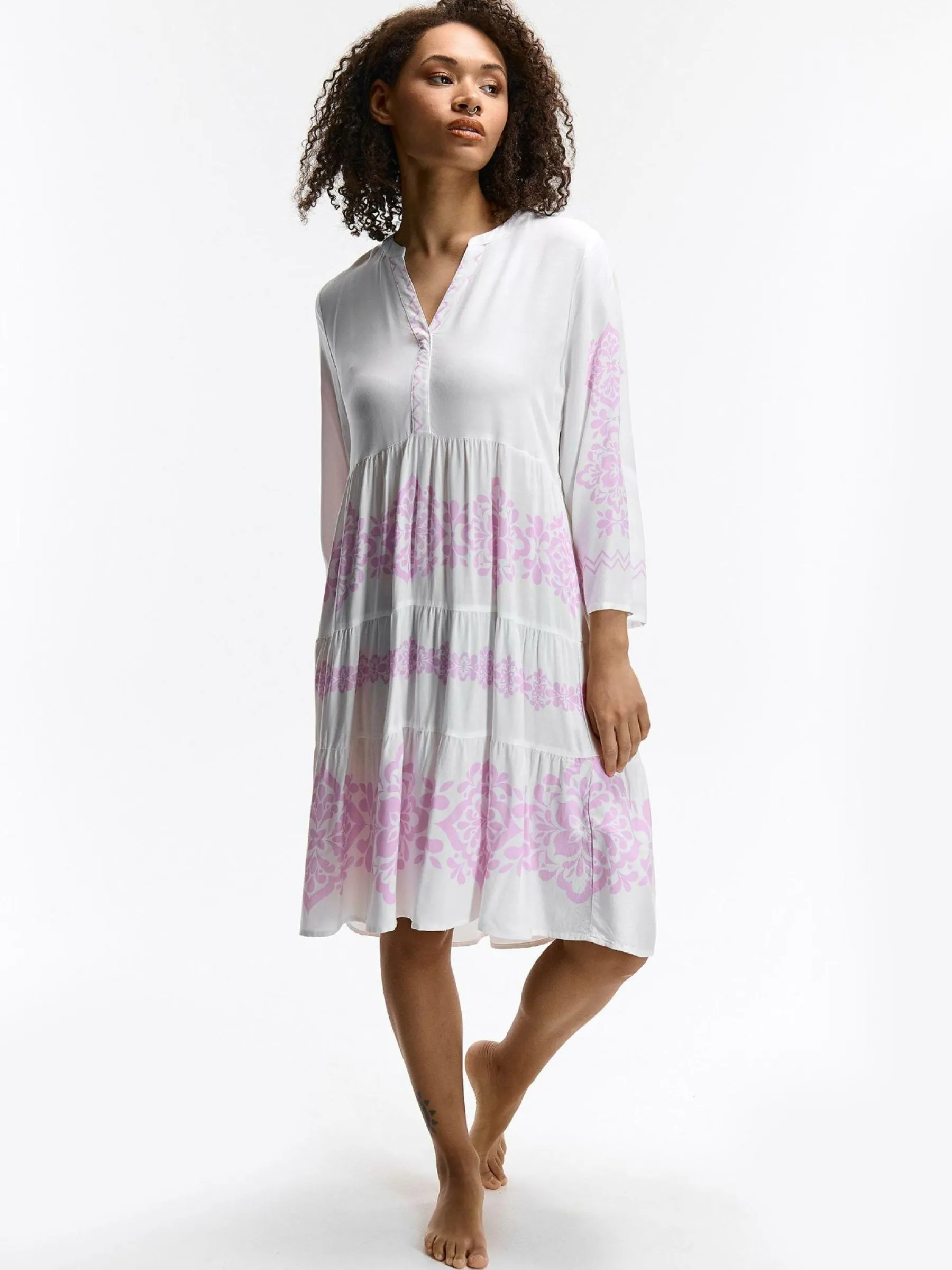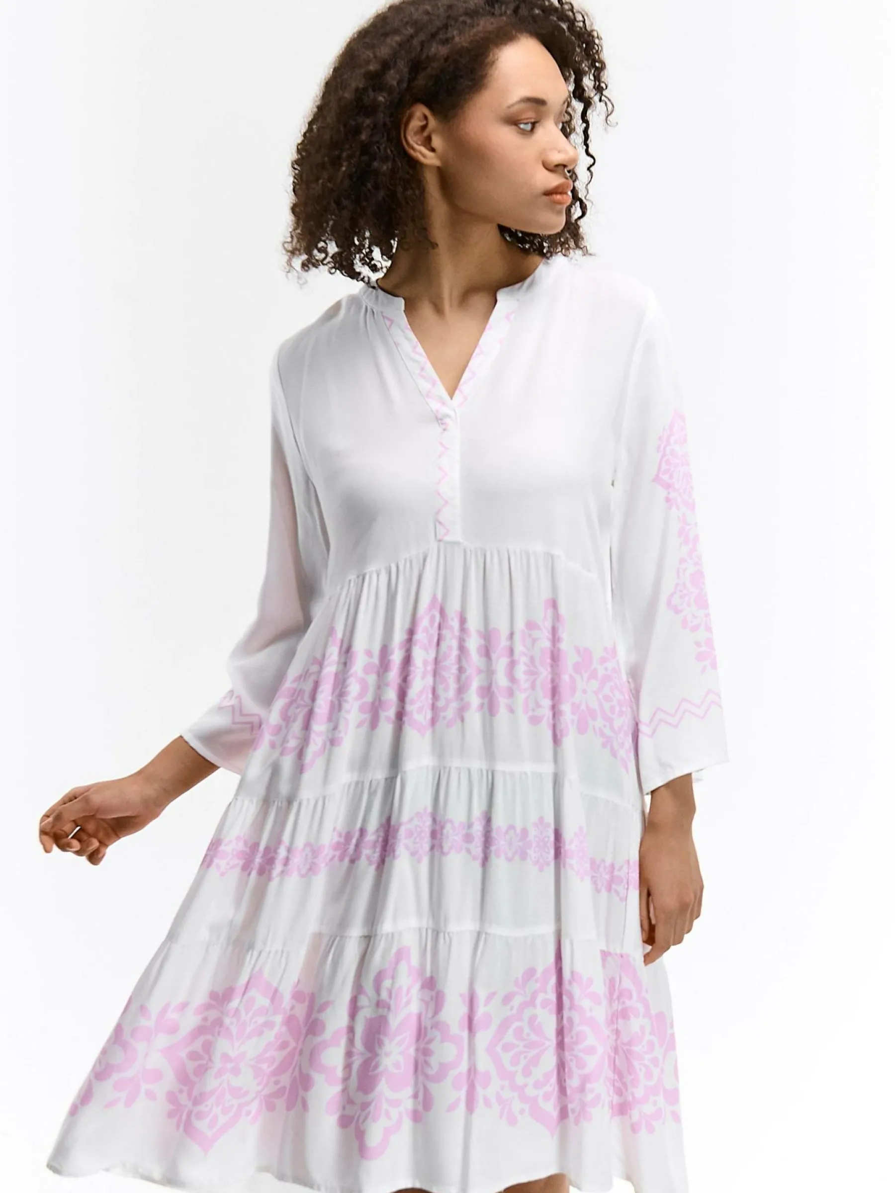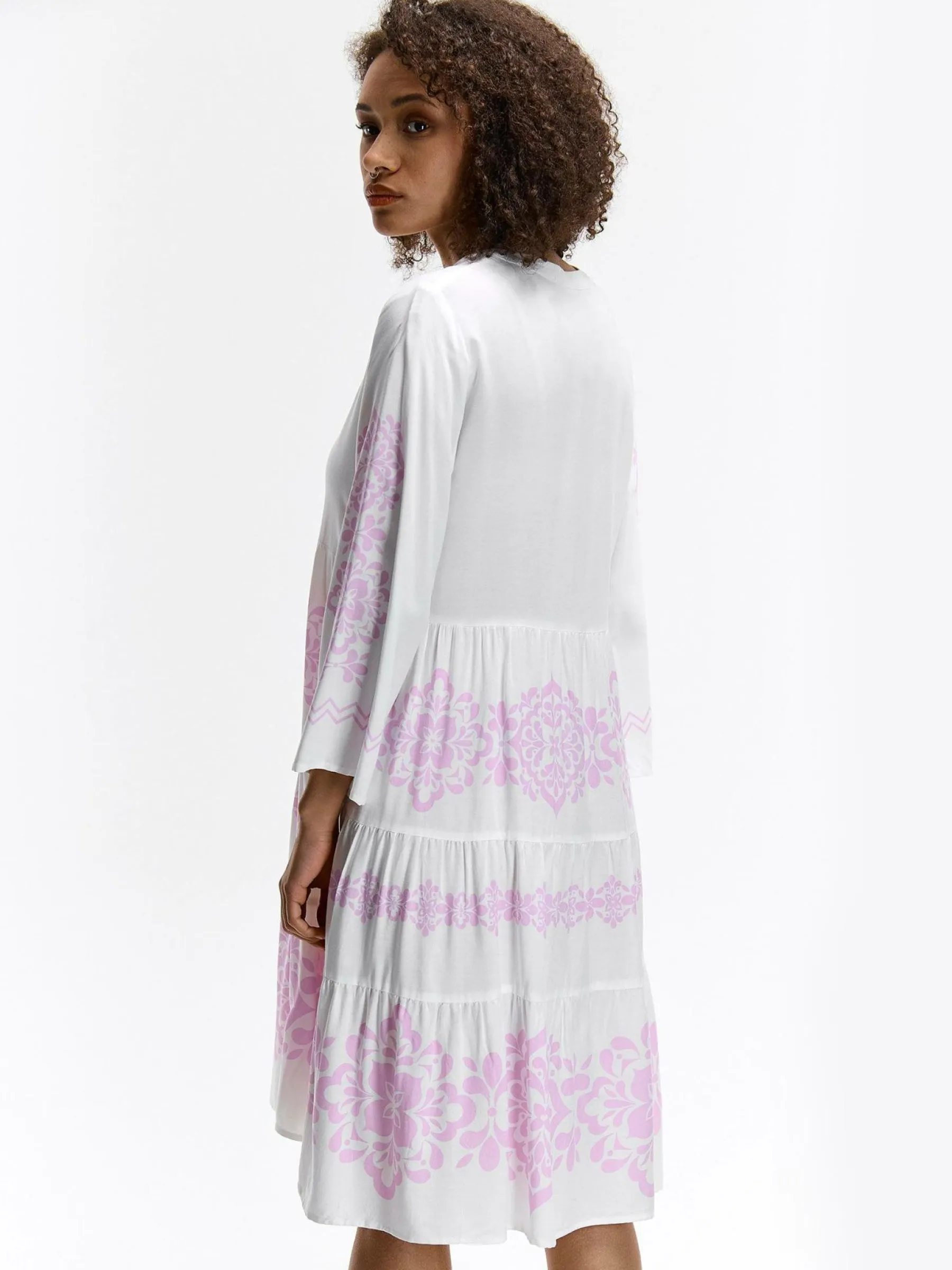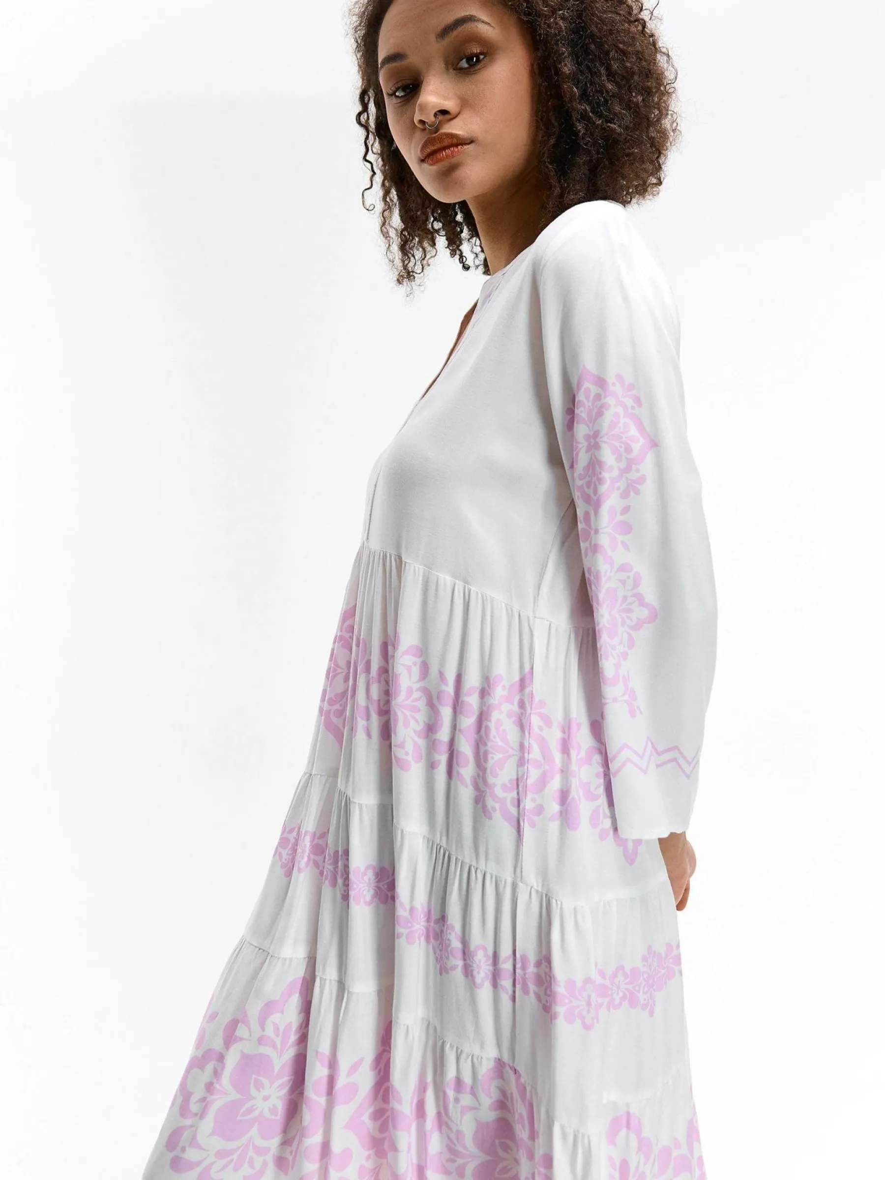 Kolor: różowyKrój: z falbanąTyp: sukienkaRekaw: długi rękawDługość: midiPattern style: wzorzysteDetal: v-neck, …