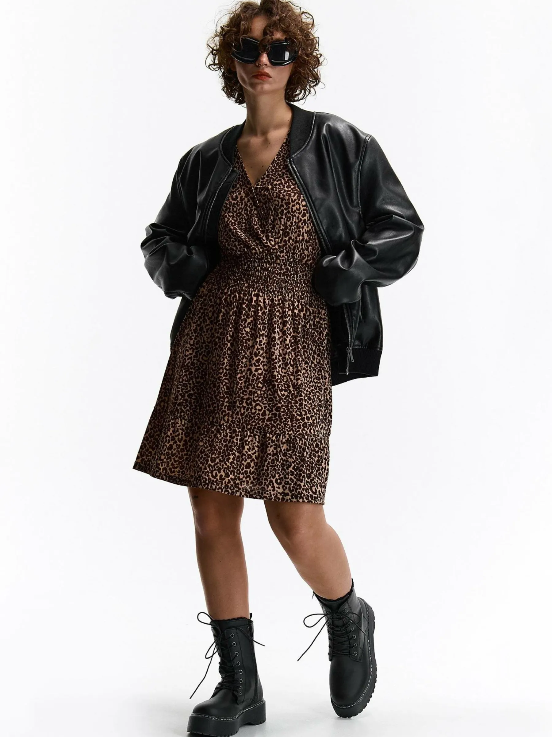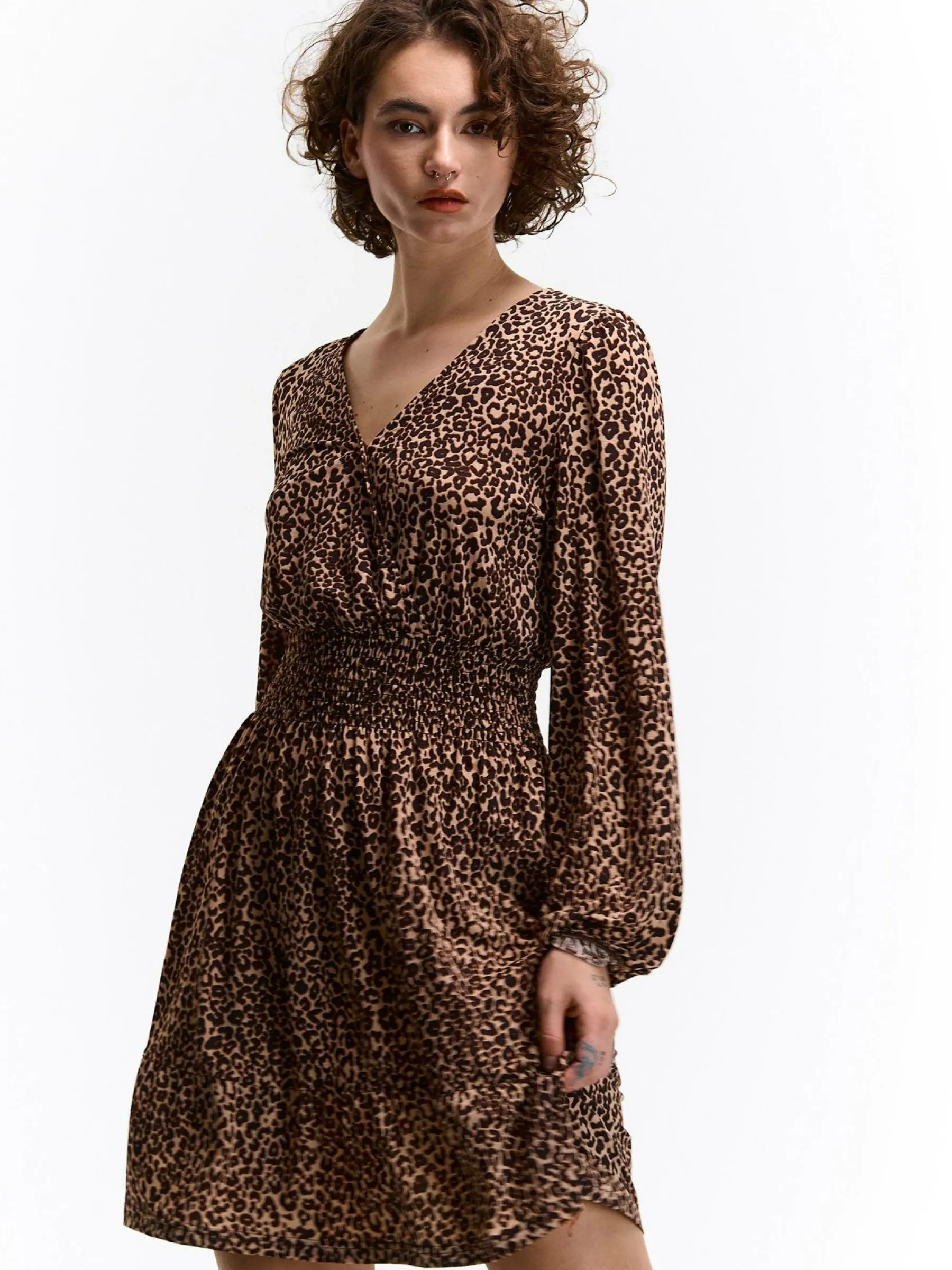 Kolor: beżowyKrój: asyTyp: sukienkaRekaw: długi rękawDługość: miniPattern style: zwierzecyDetal: v-neck, z falban…