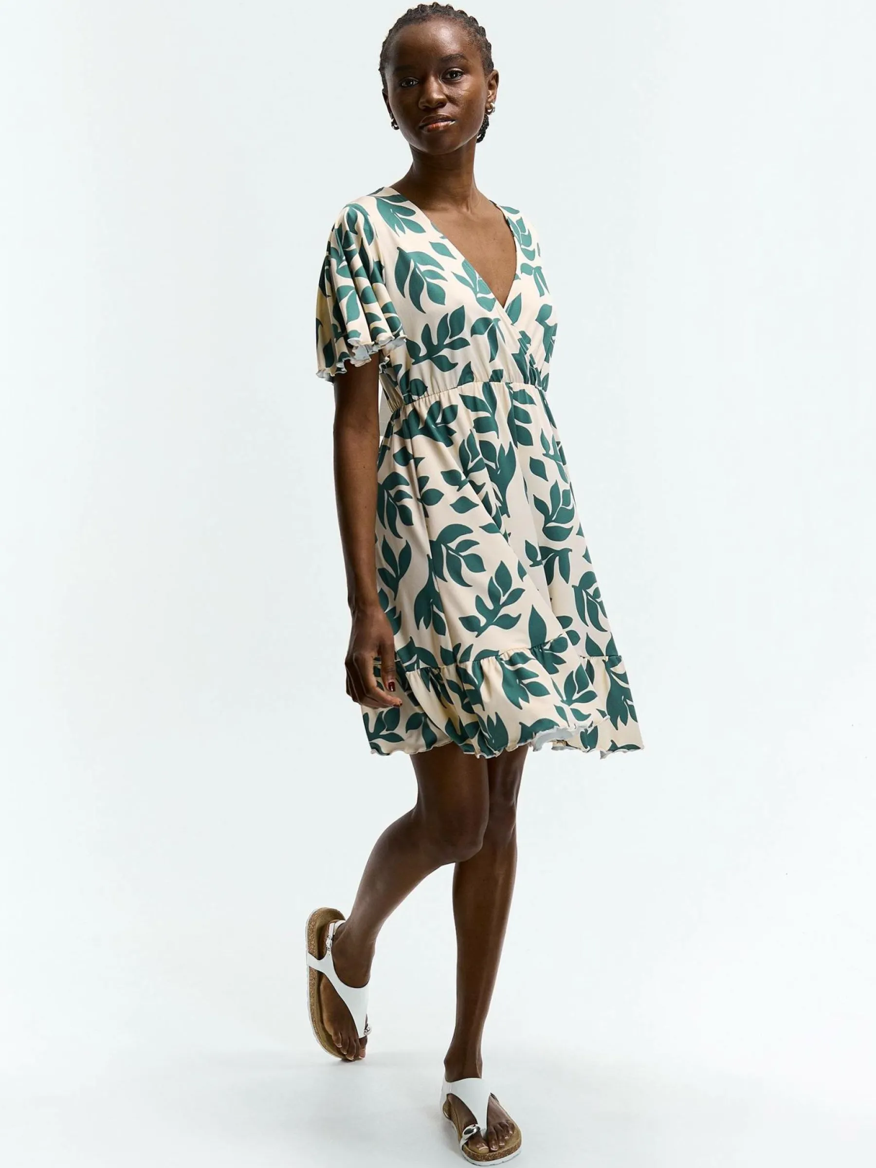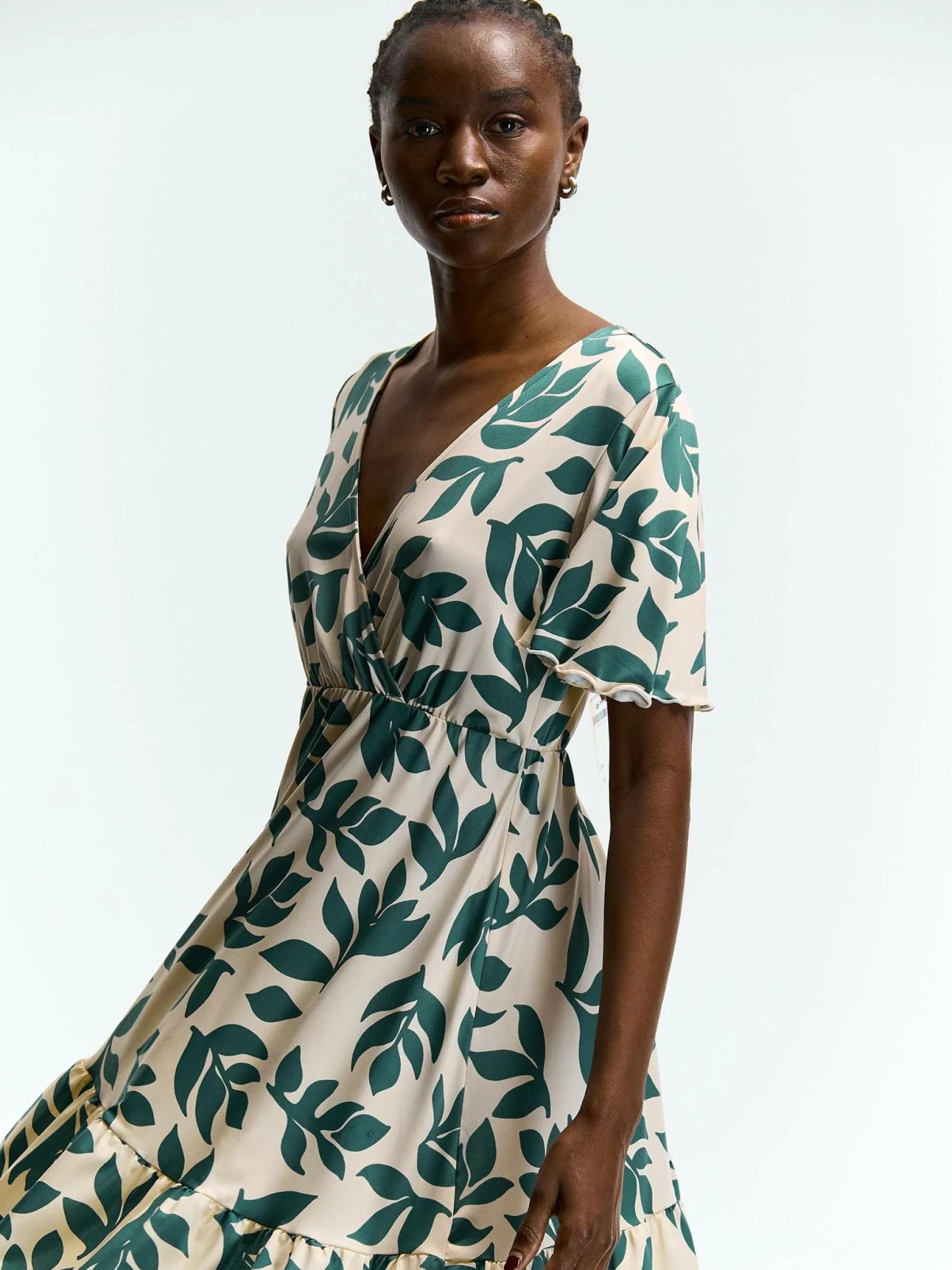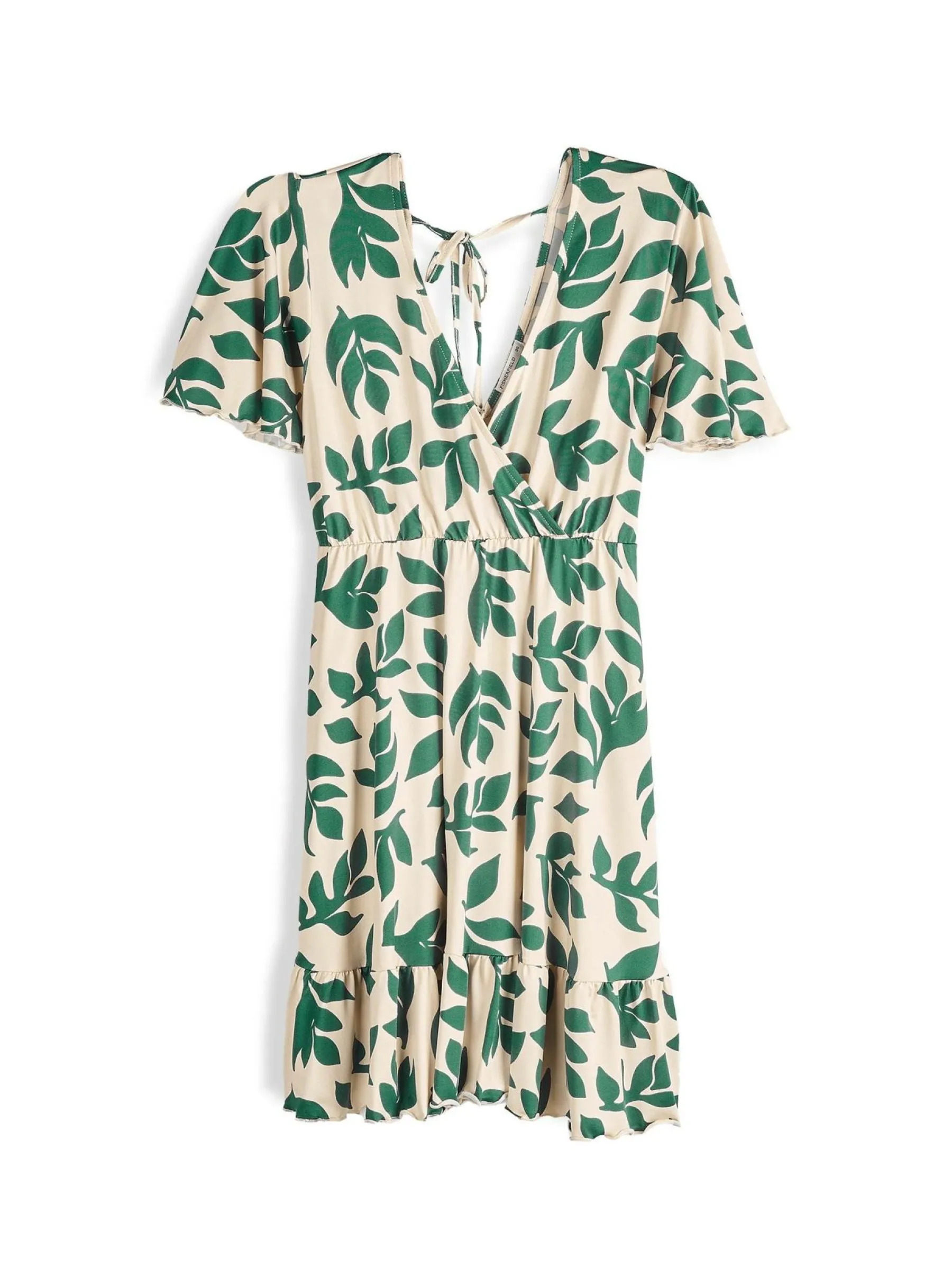 Kolor: beżowyKrój: kopertówkiTyp: sukienkaRekaw: krótki rękawDługość: miniPattern style: z nadrukiemDetal: v-nec…