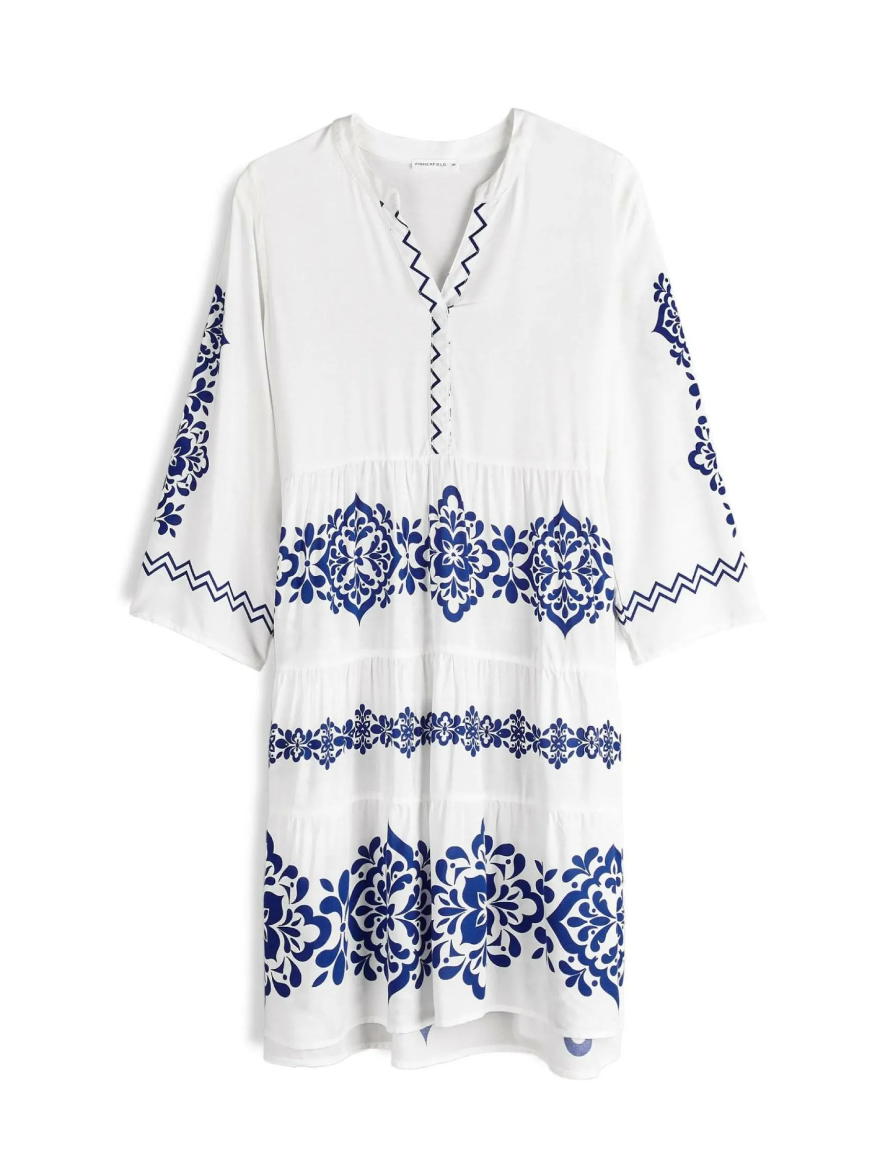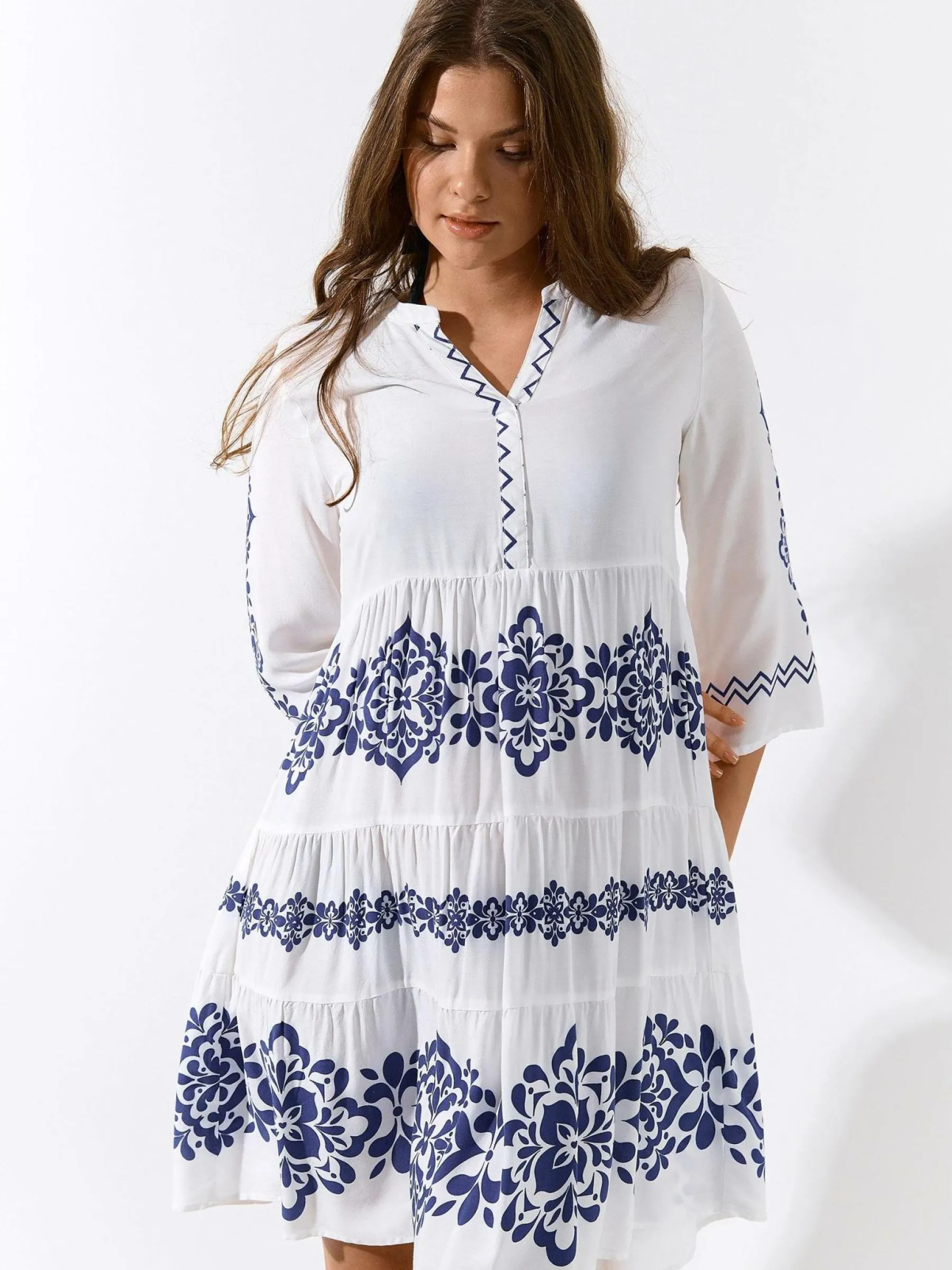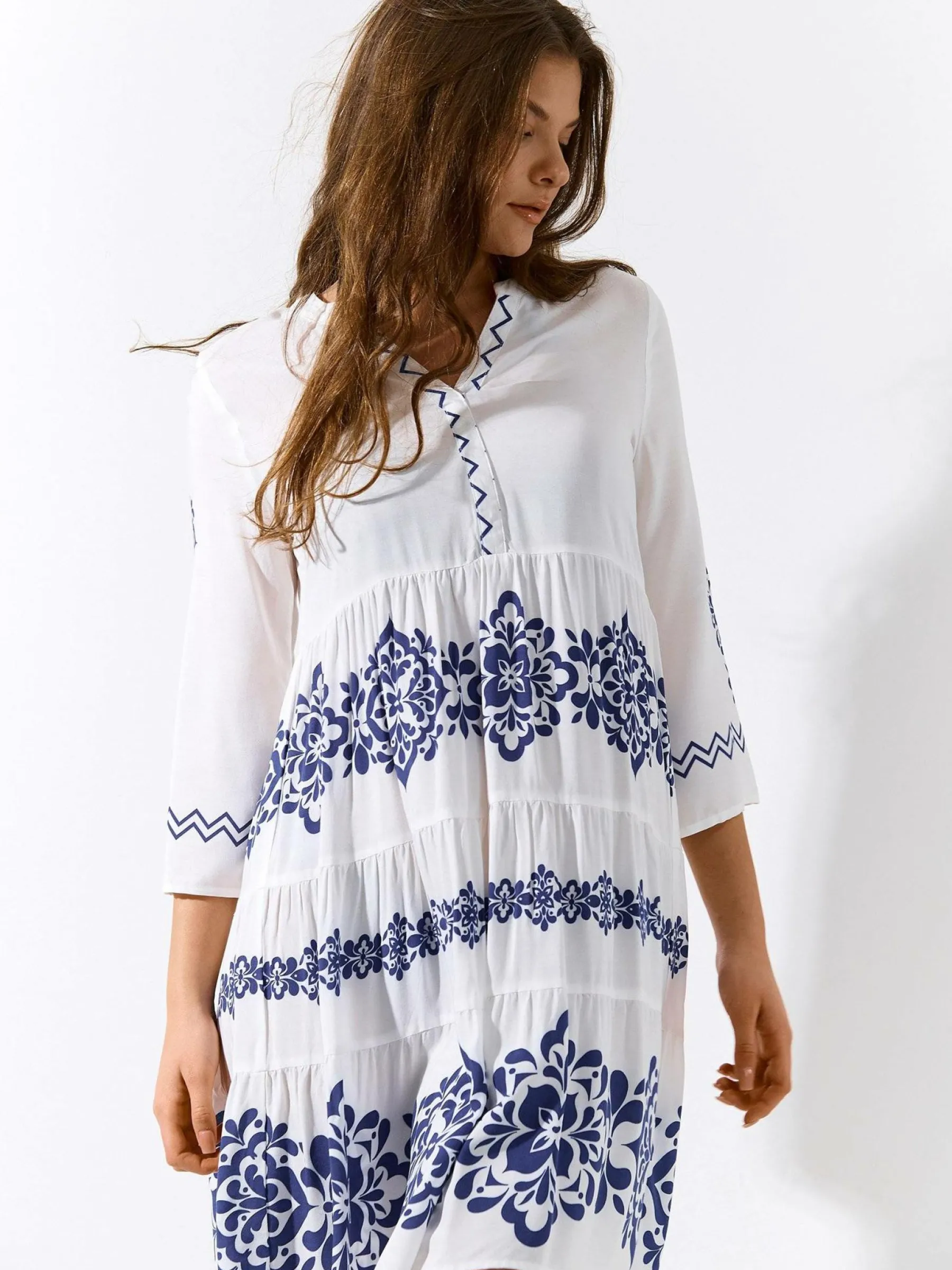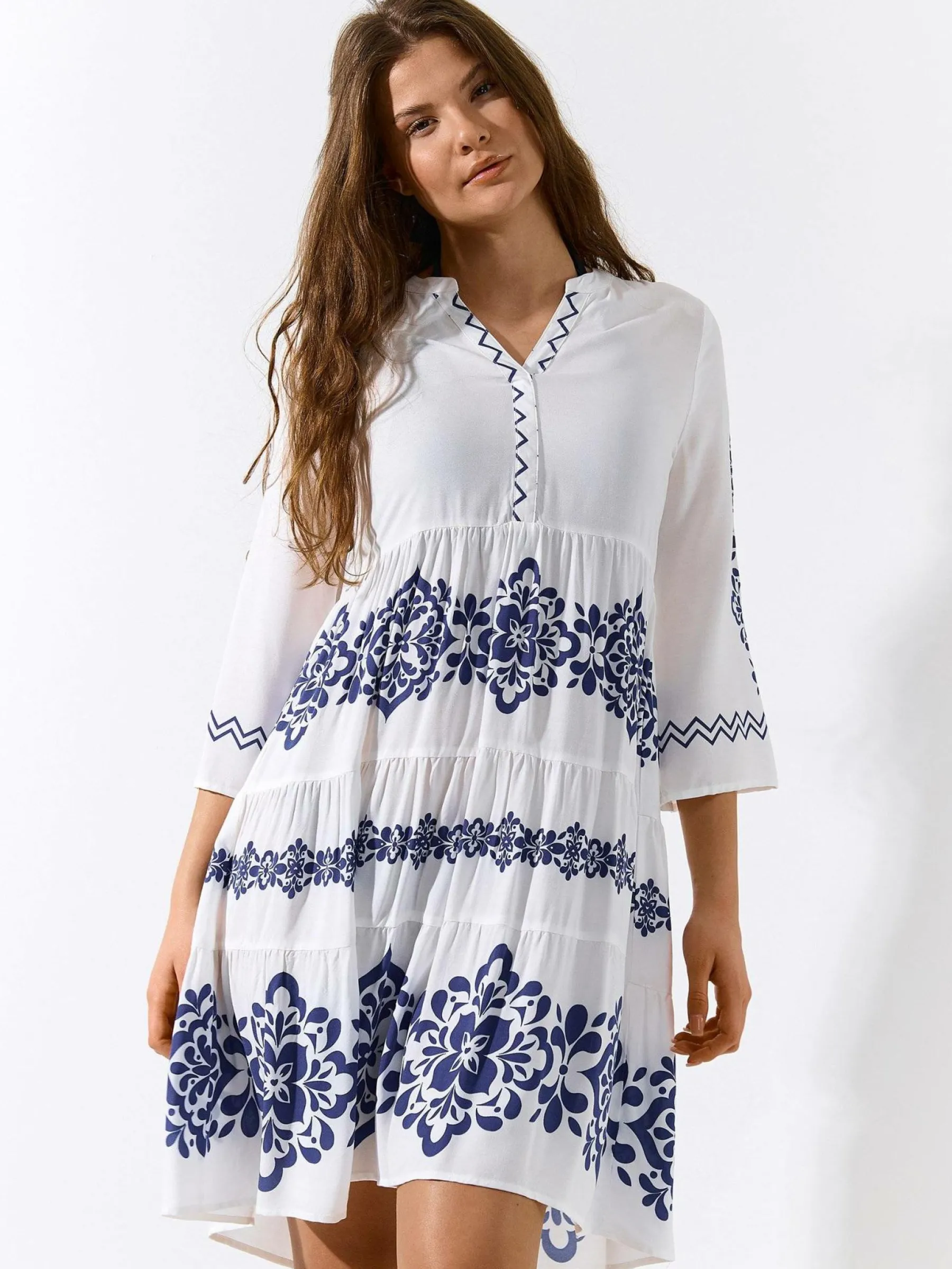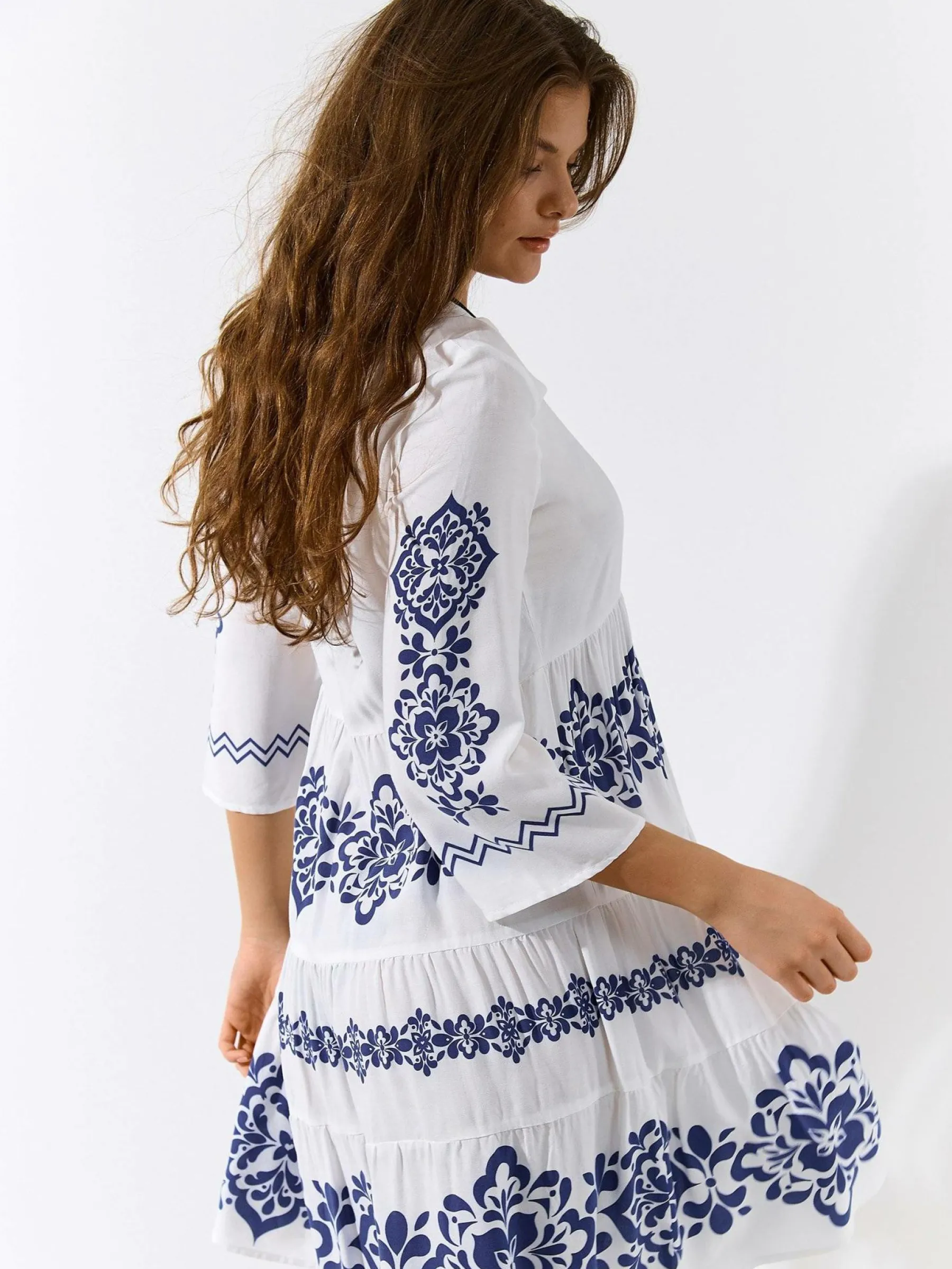 Kolor: granatowyKrój: z falbanąTyp: sukienkaRekaw: rękaw 3/4Długość: midiPattern style: wzorzysteDetal: v-neck, na…