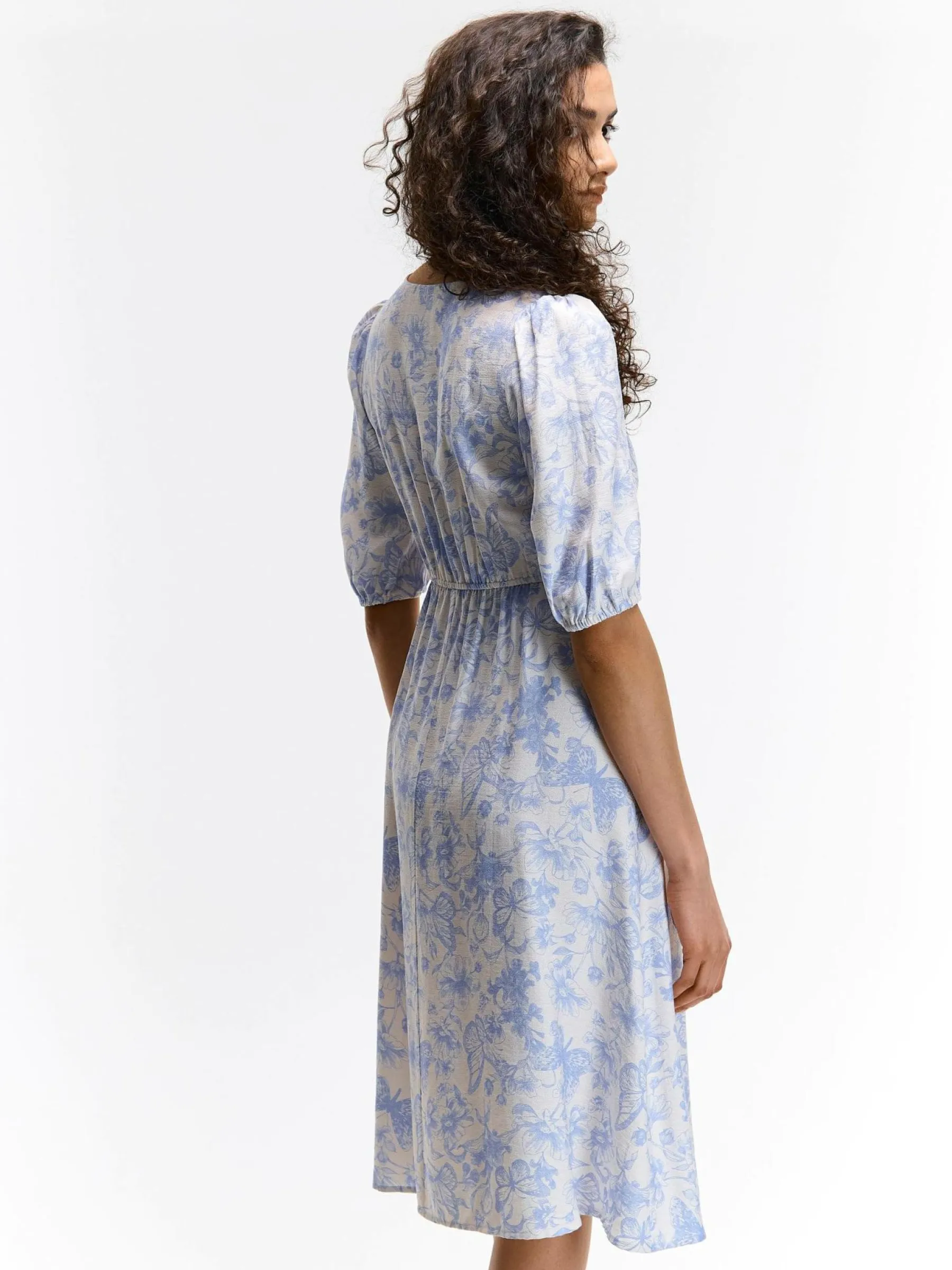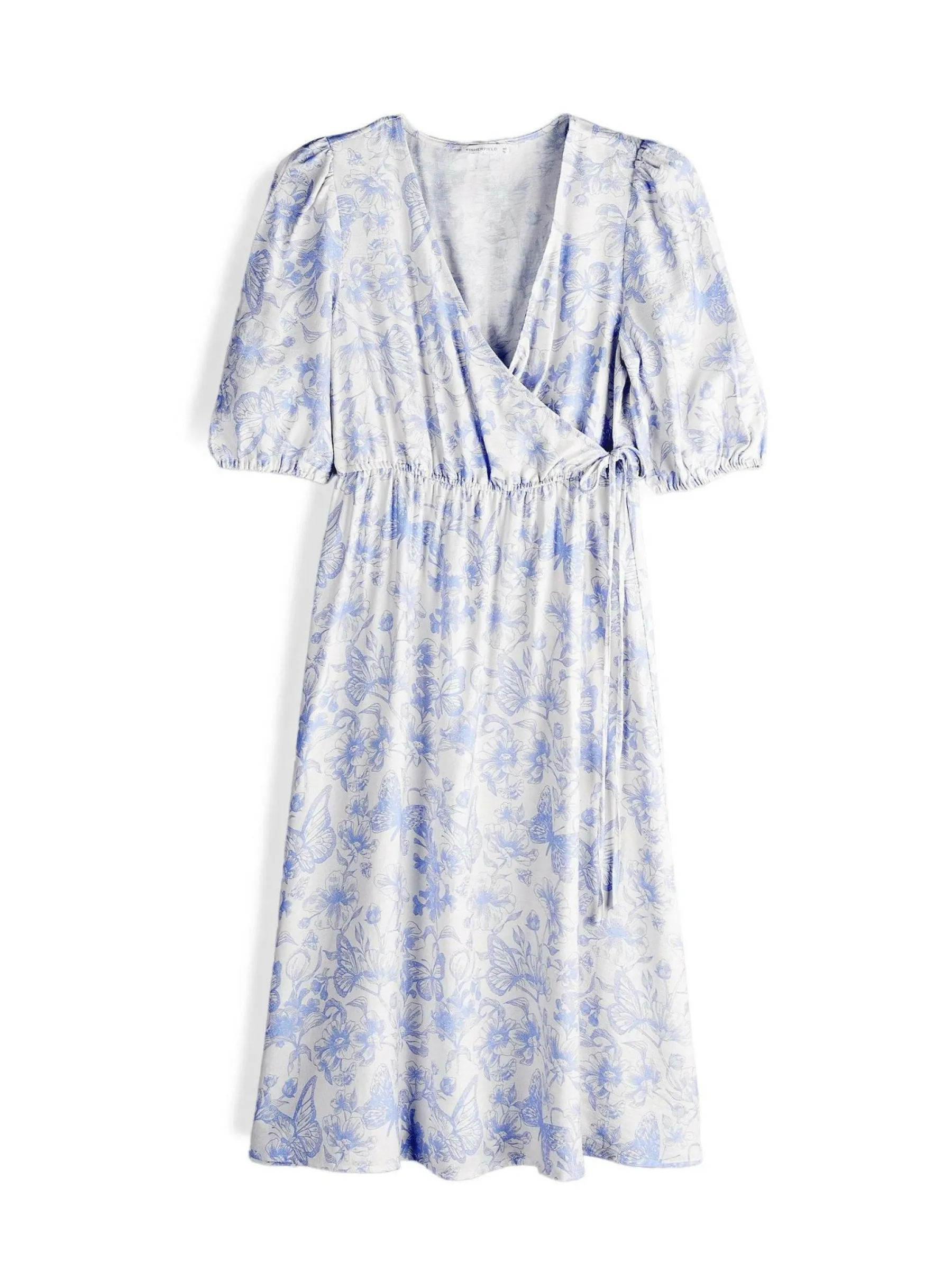 Kolor: beżowyKrój: kopertówki, asyTyp: sukienkaRekaw: krótki rękawDługość: midiPattern style: kwiatoweDetal: nad…