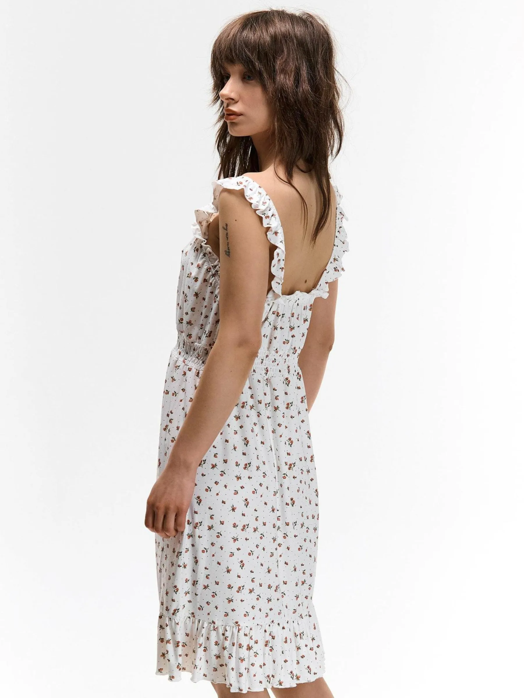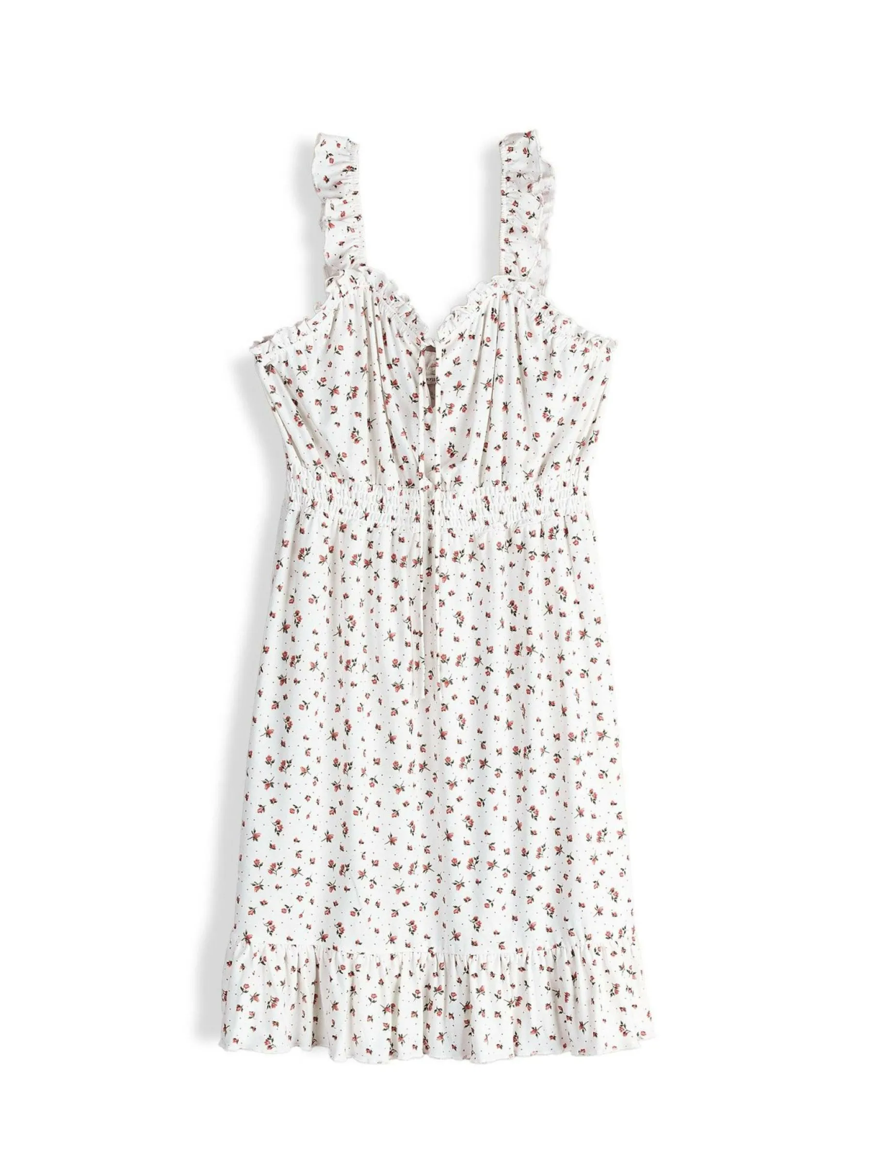 Kolor: białyKrój: z falbanąTyp: sukienkaRekaw: bez rękawówDługość: miniPattern style: kwiatoweDetal: z ramiączk…