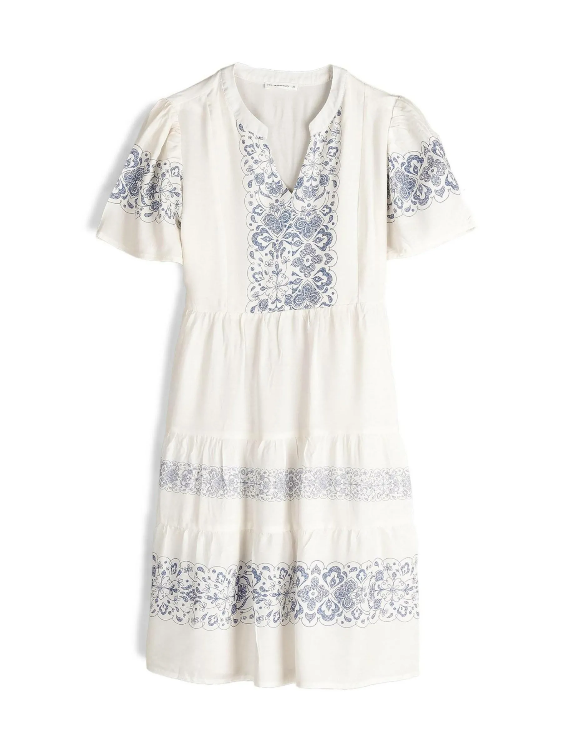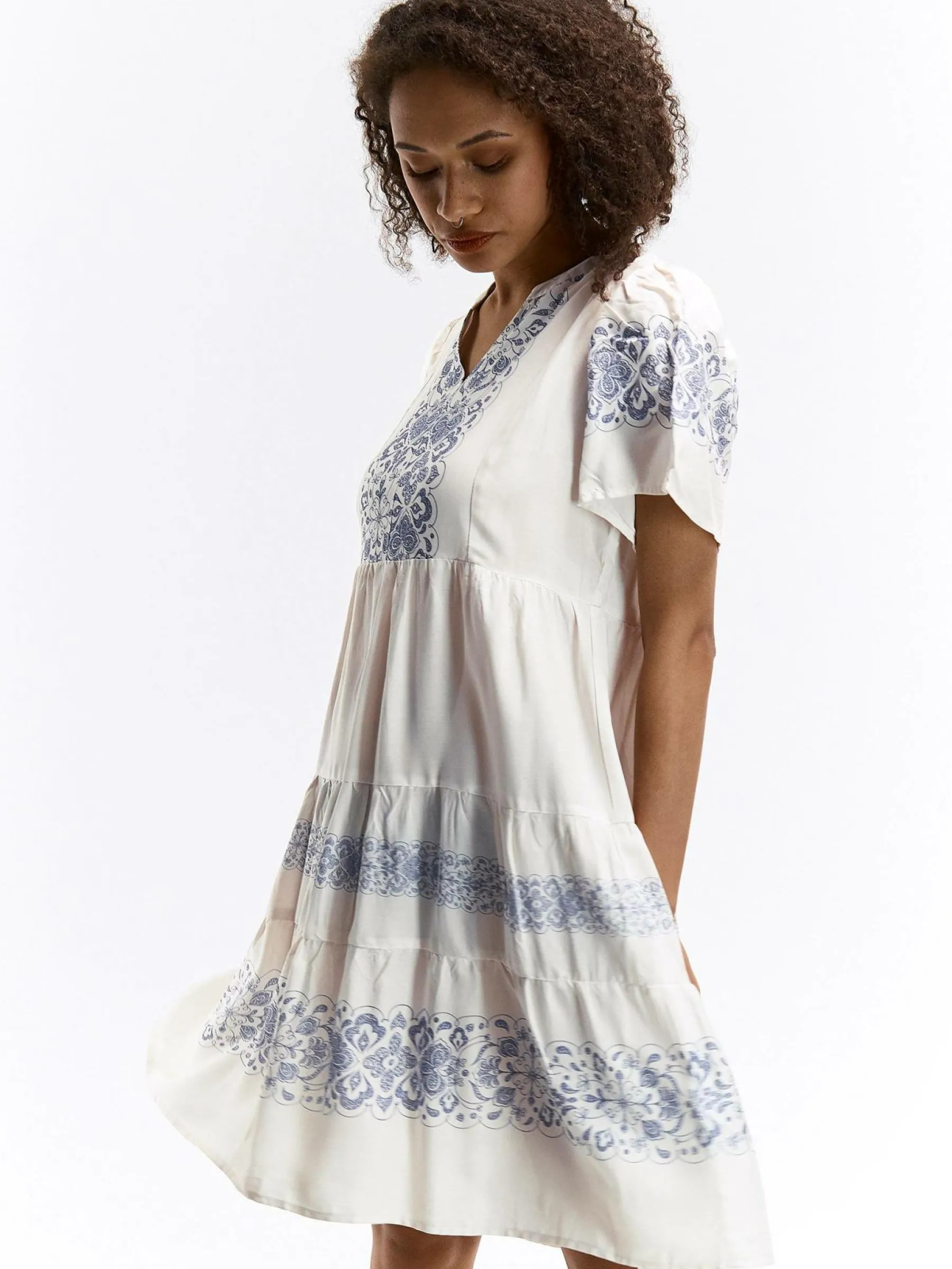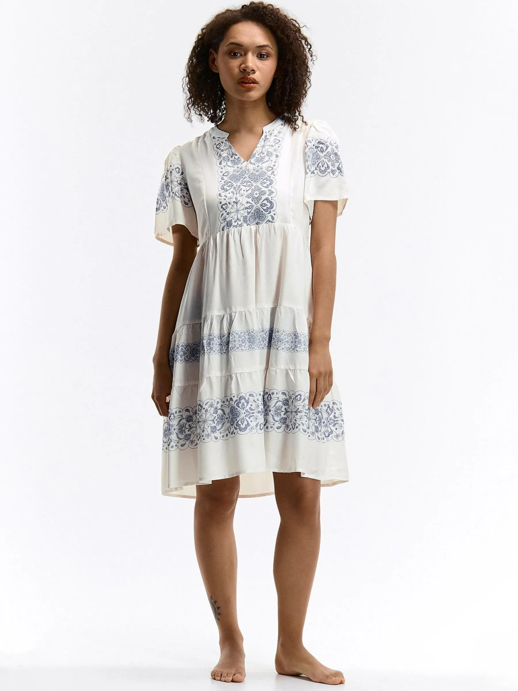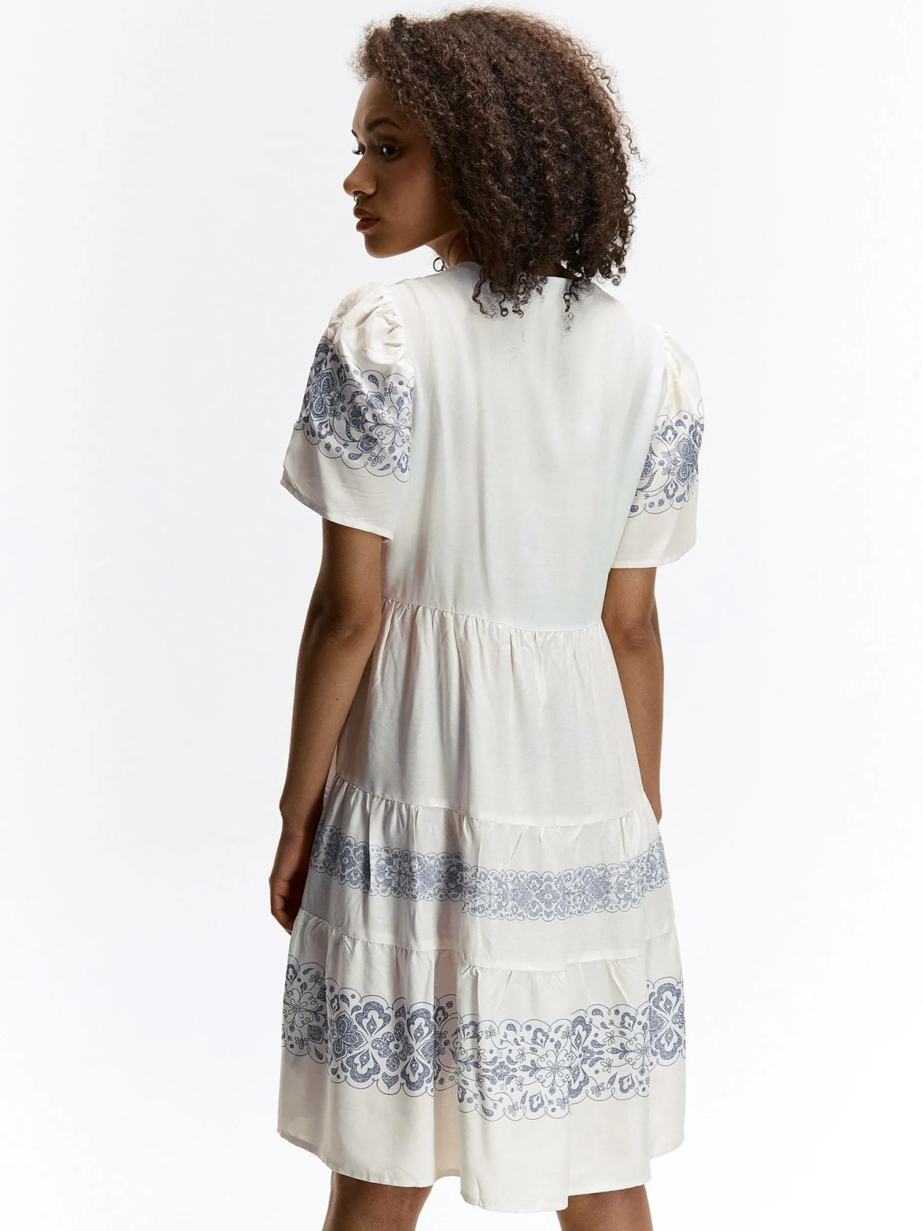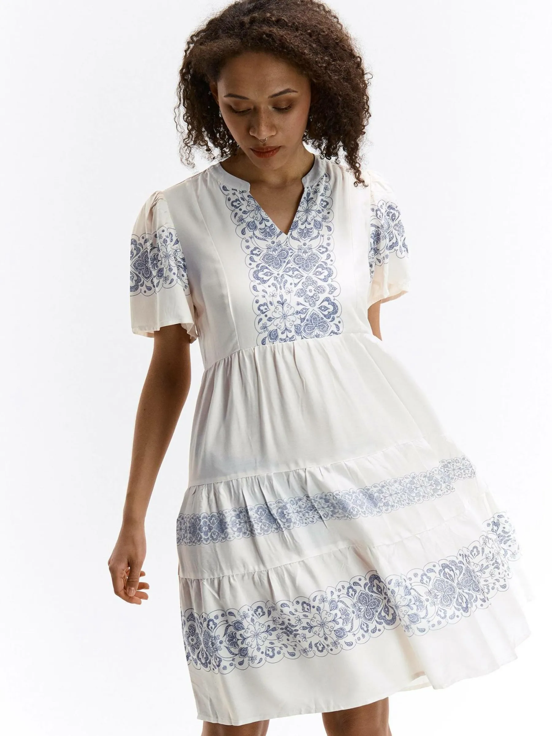 Kolor: beżowyKrój: z falbaną, asyTyp: sukienkaRekaw: krótki rękawDługość: miniPattern style: wzorzysteDetal: nad…