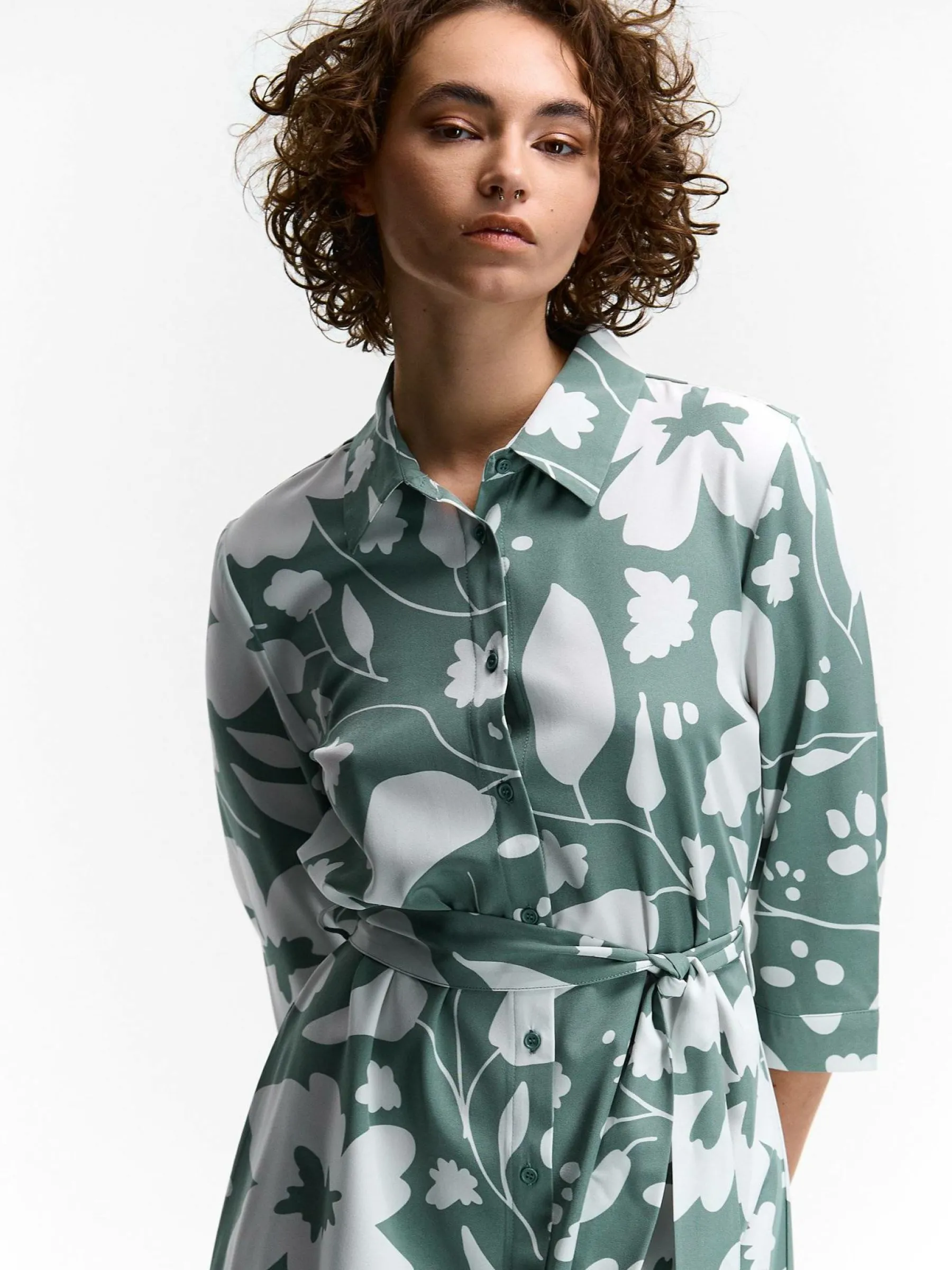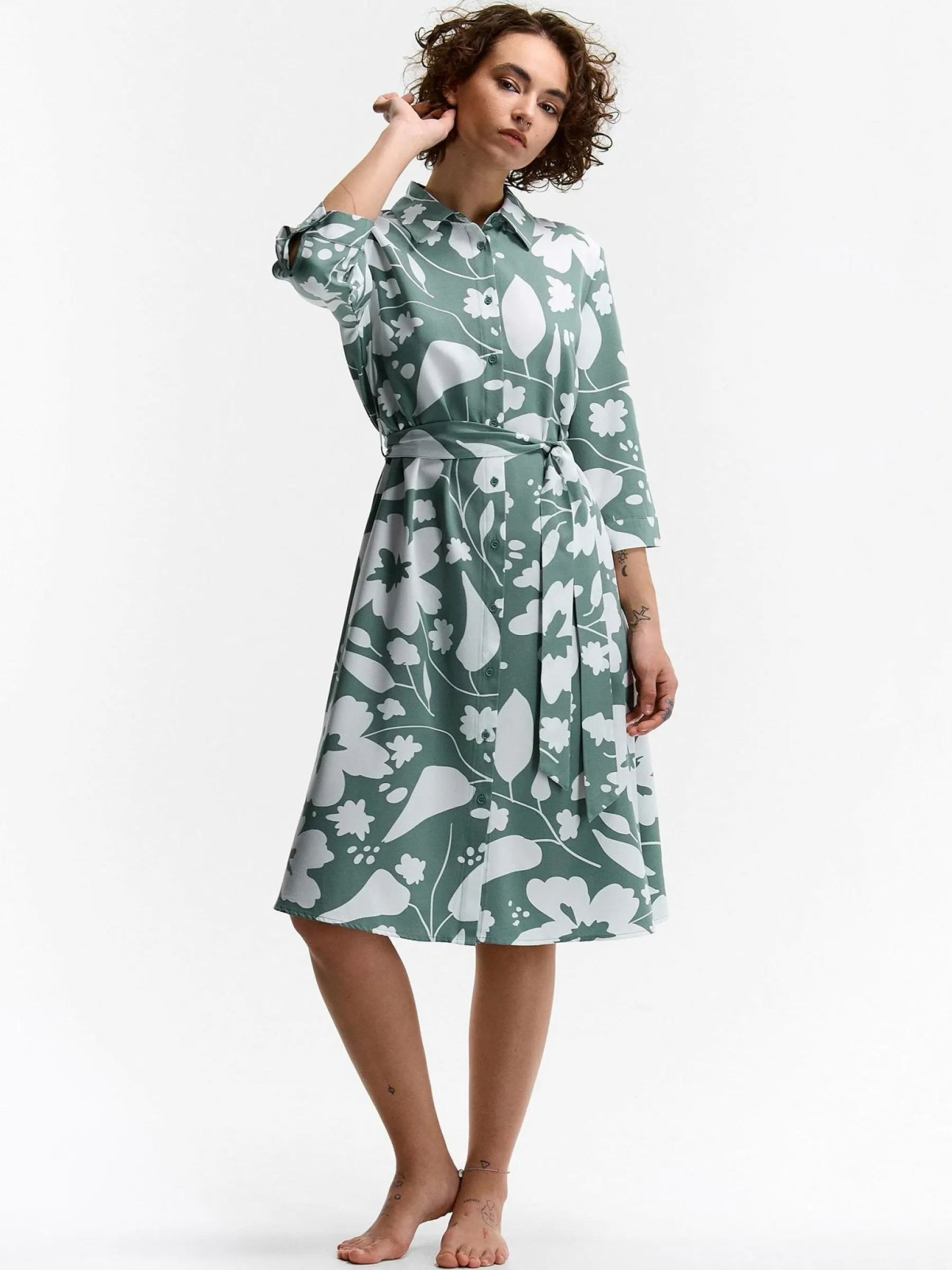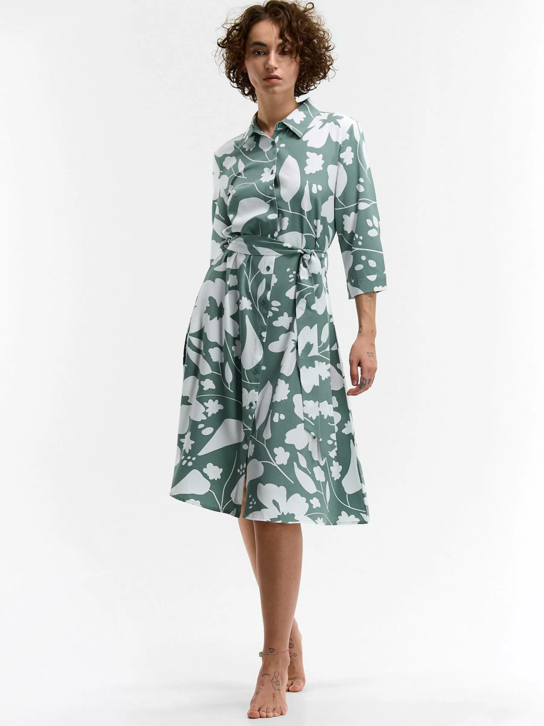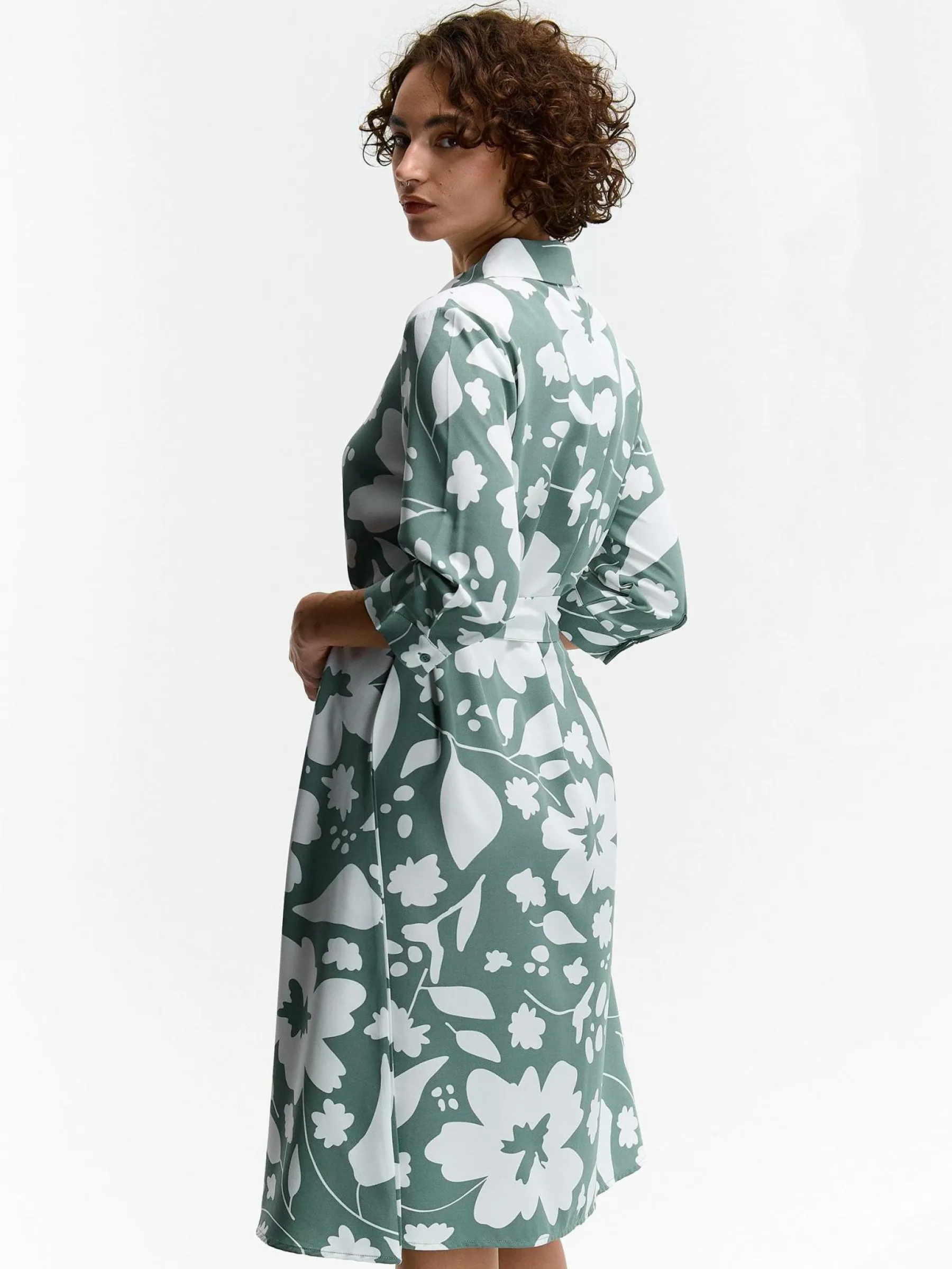 Kolor: zielonyKrój: koszuloweTyp: sukienkaRekaw: długi rękawDługość: midiPattern style: kwiatoweDetal: na guziki, …