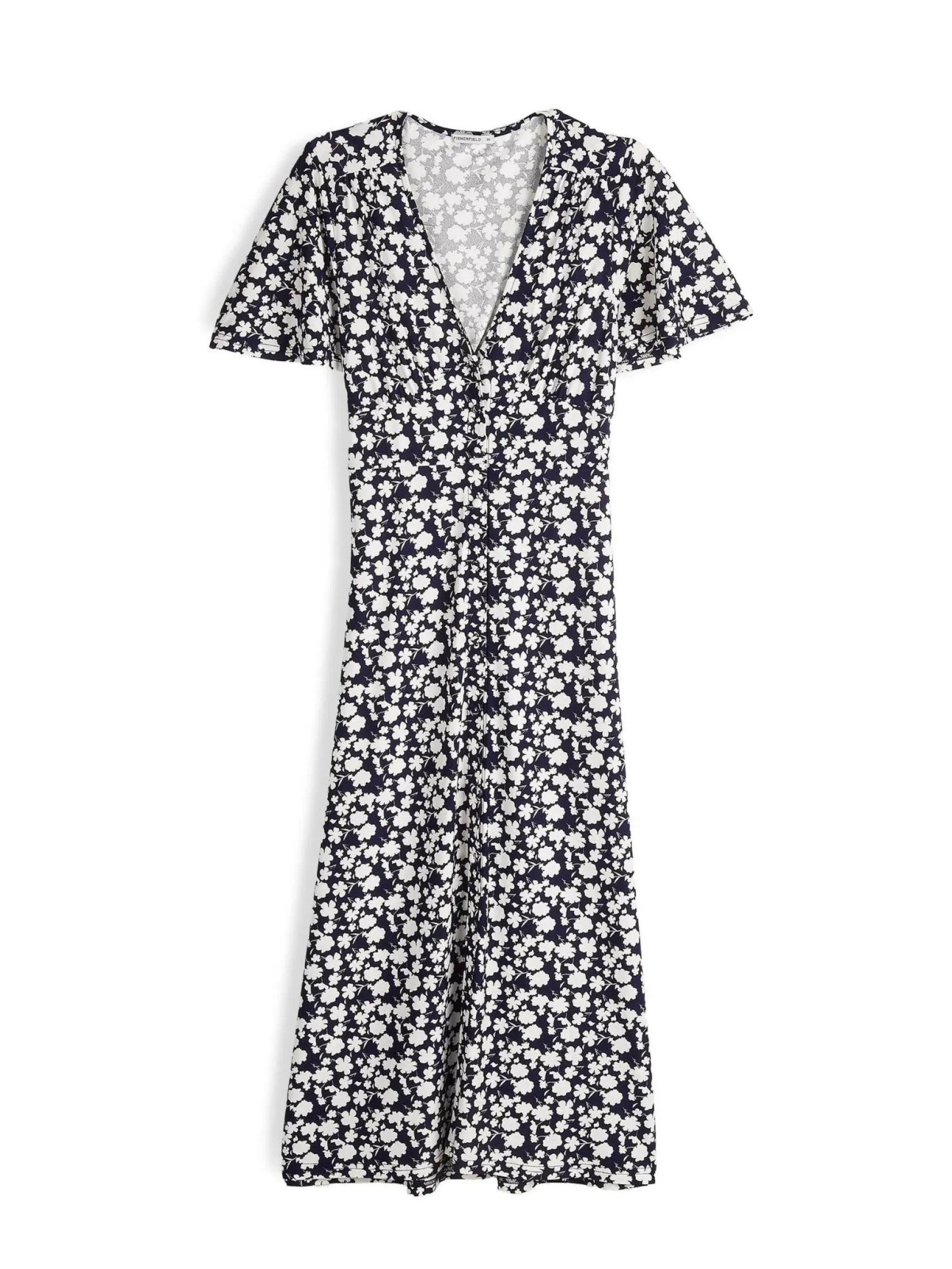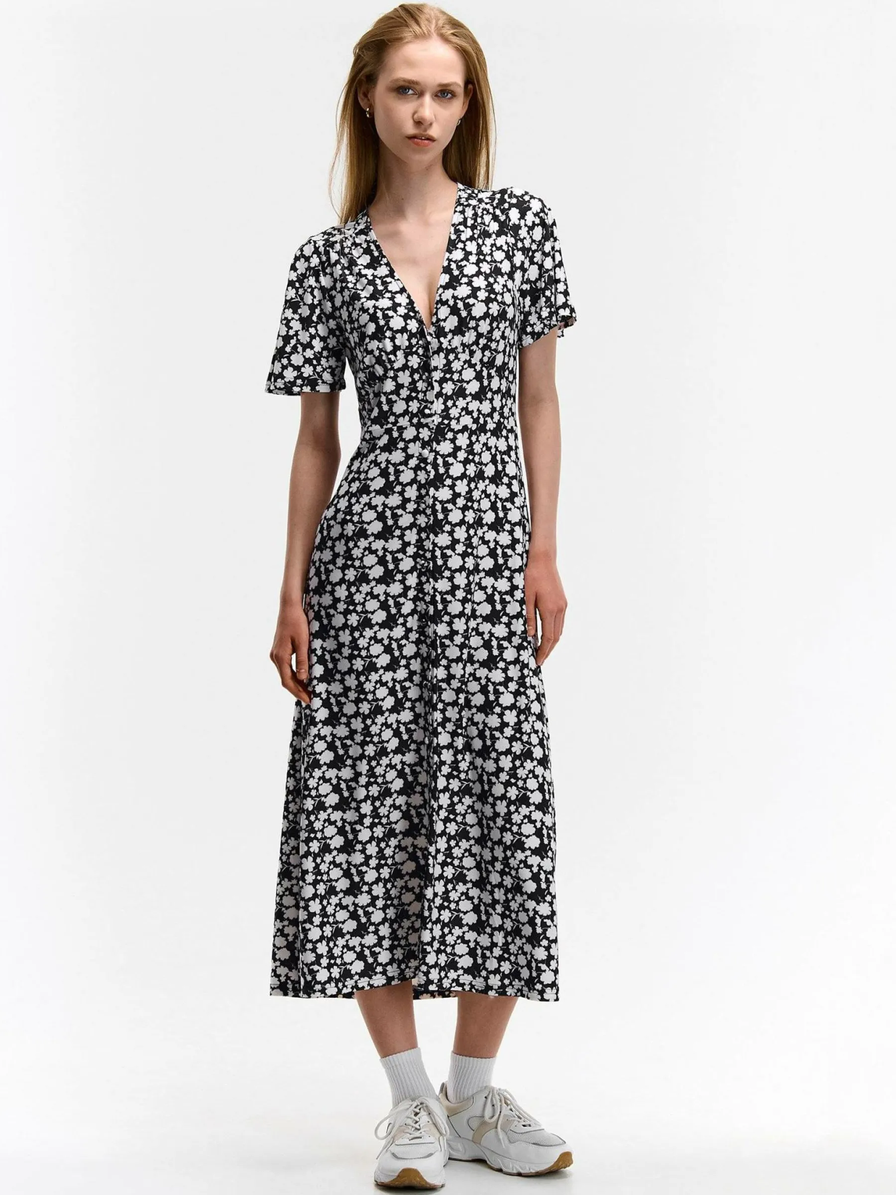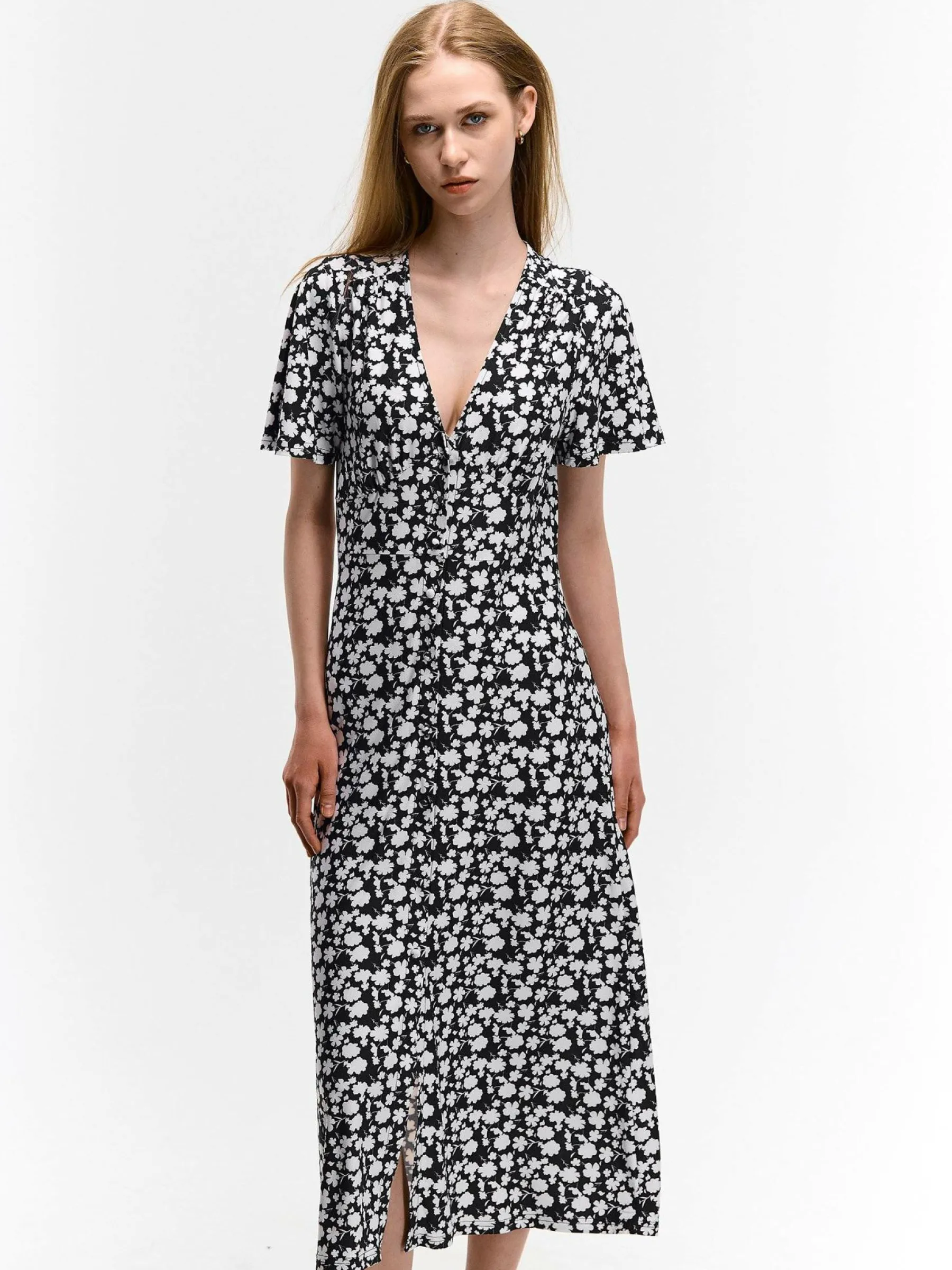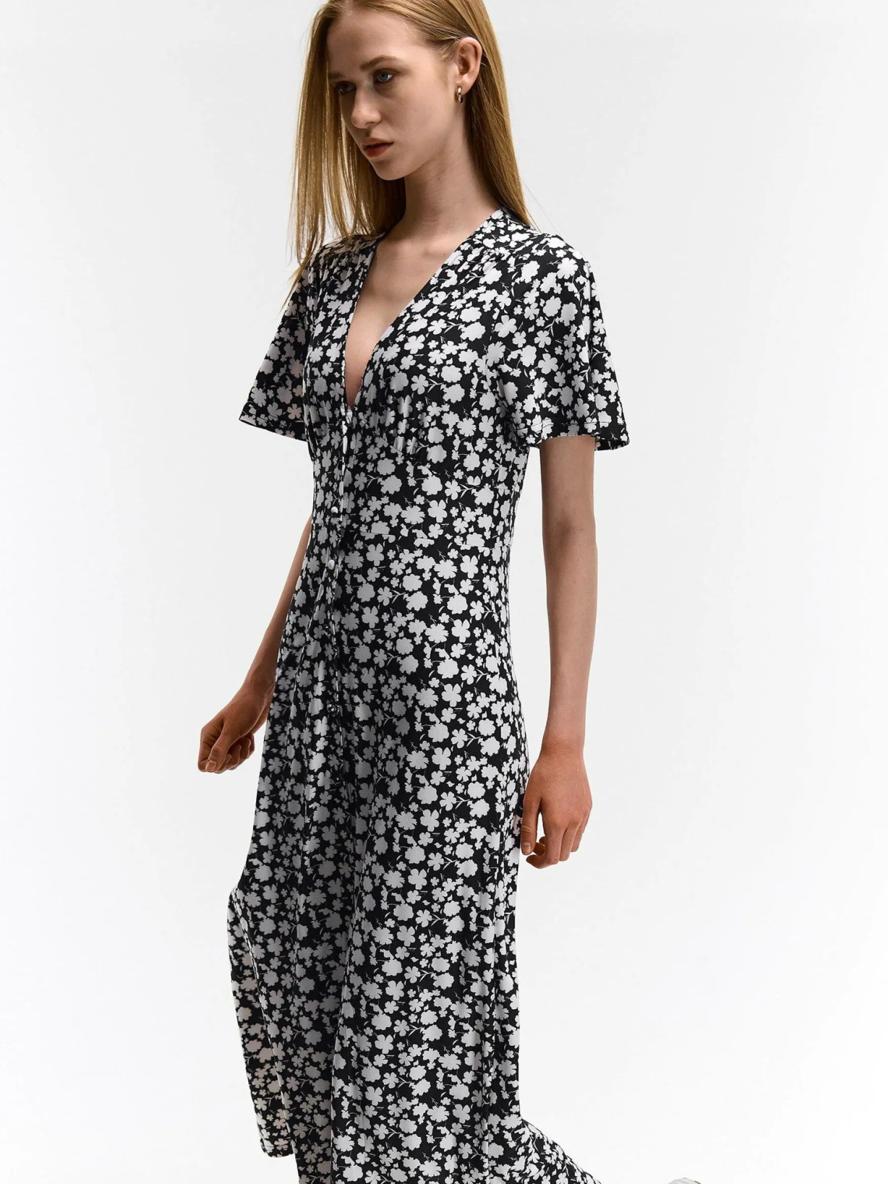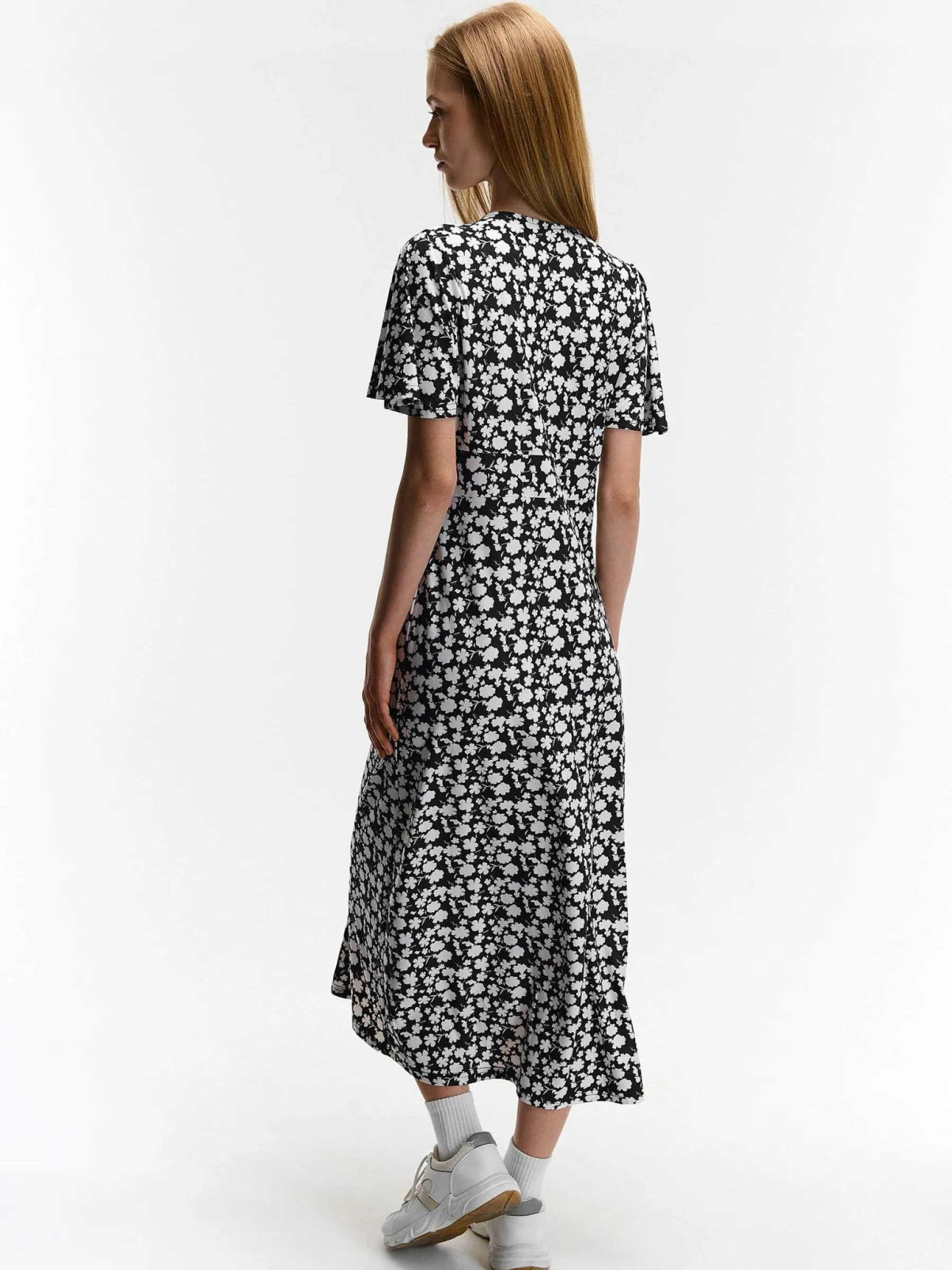 Kolor: granatowyKrój: z falbanąTyp: sukienkaRekaw: krótki rękawDługość: maxiPattern style: kwiatoweDetal: v-neck,…