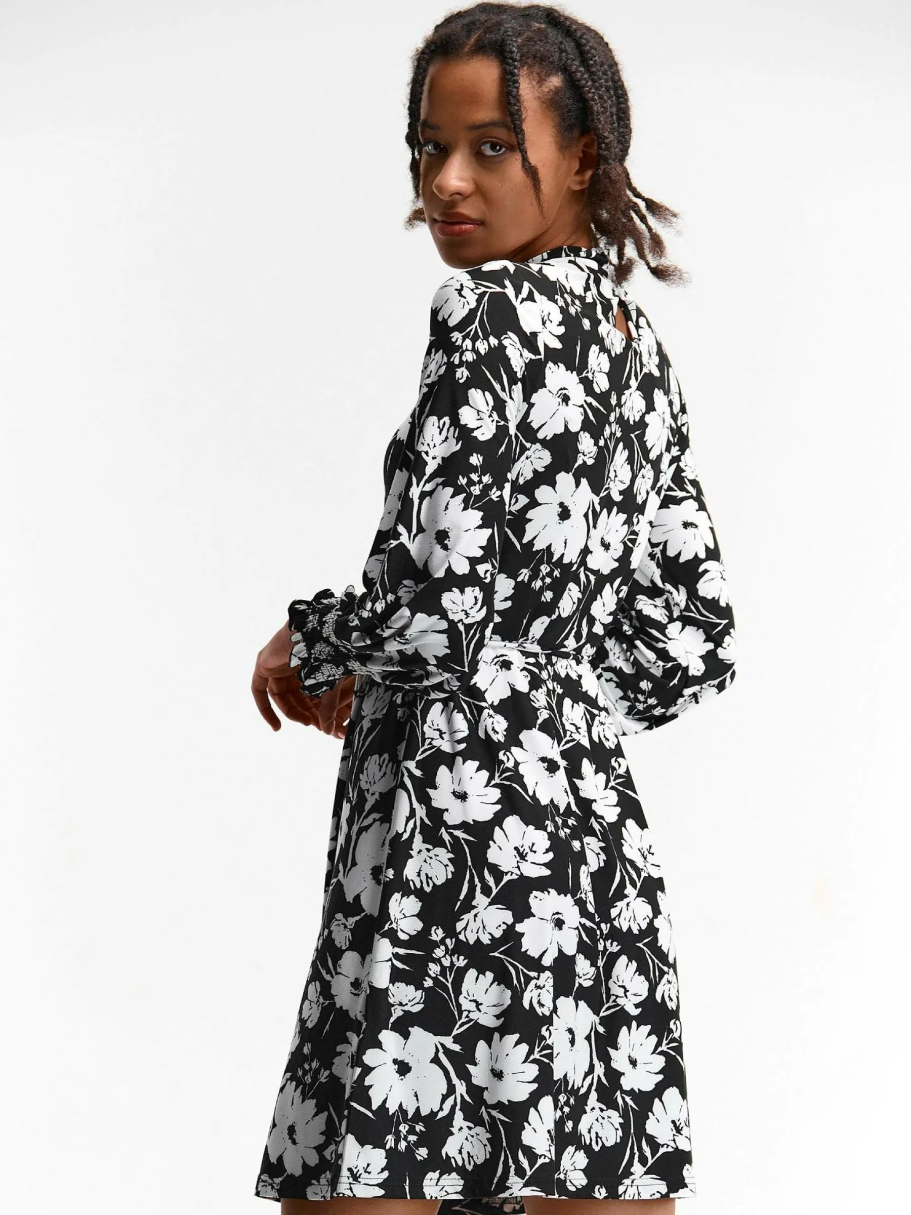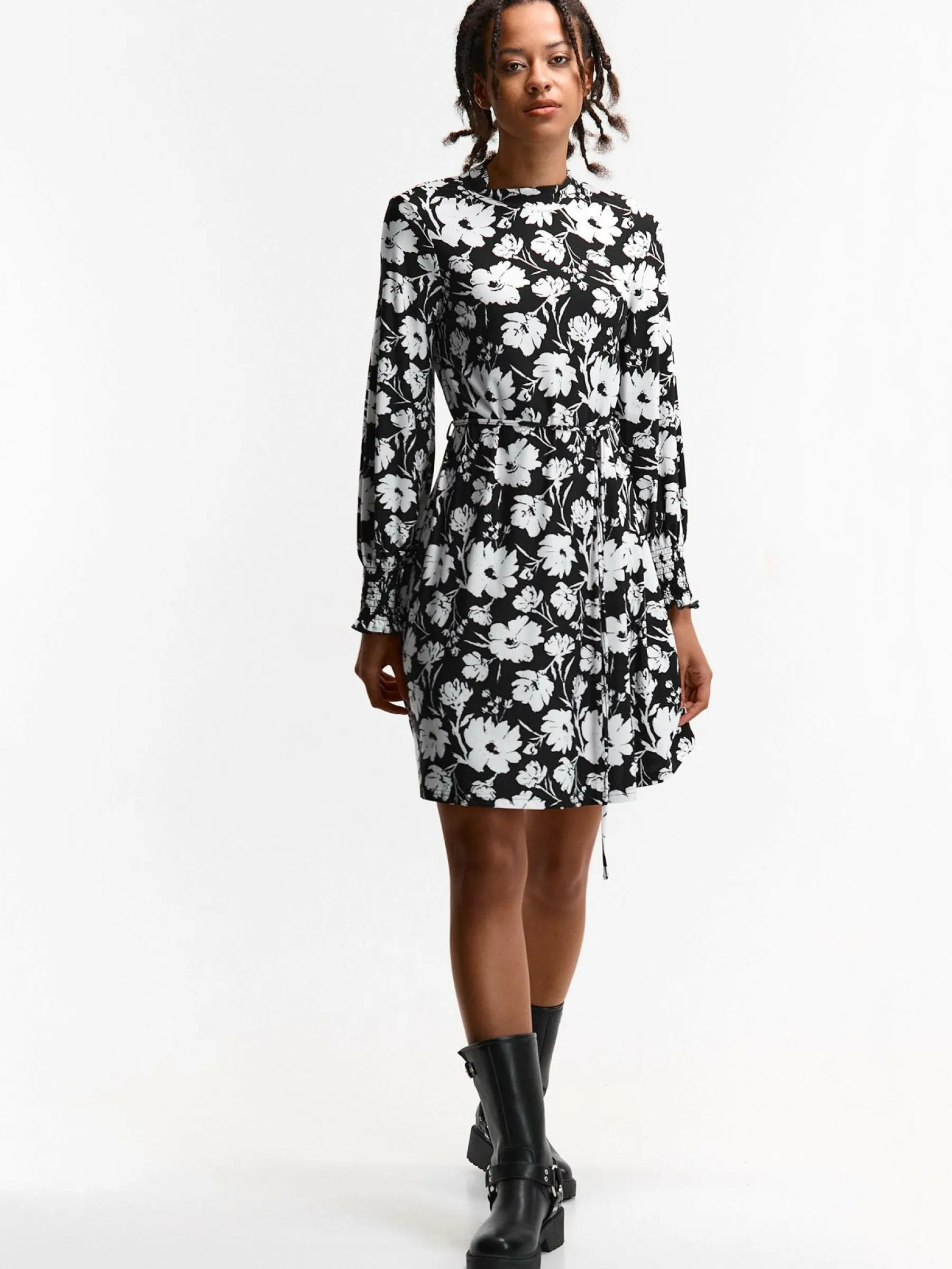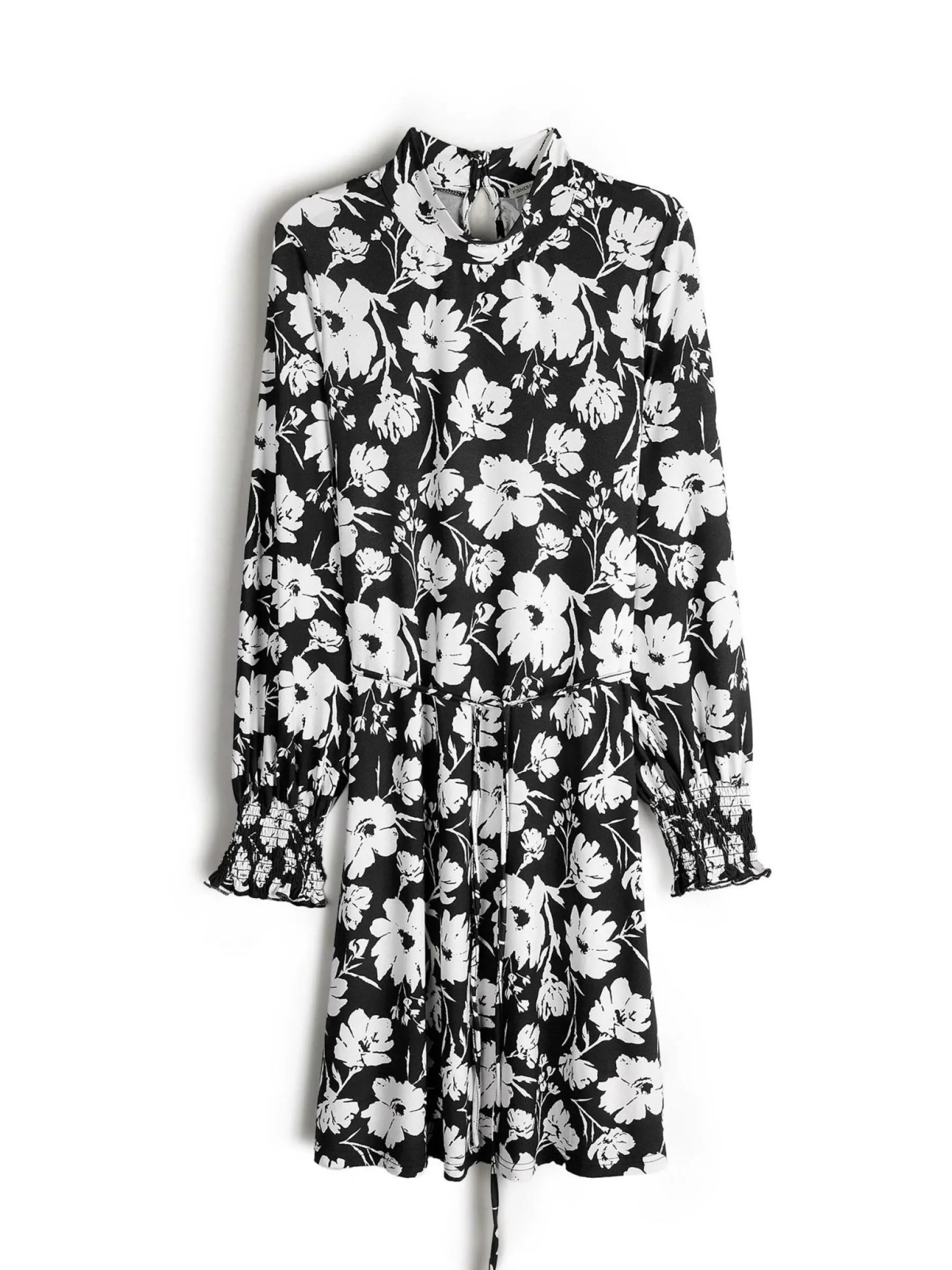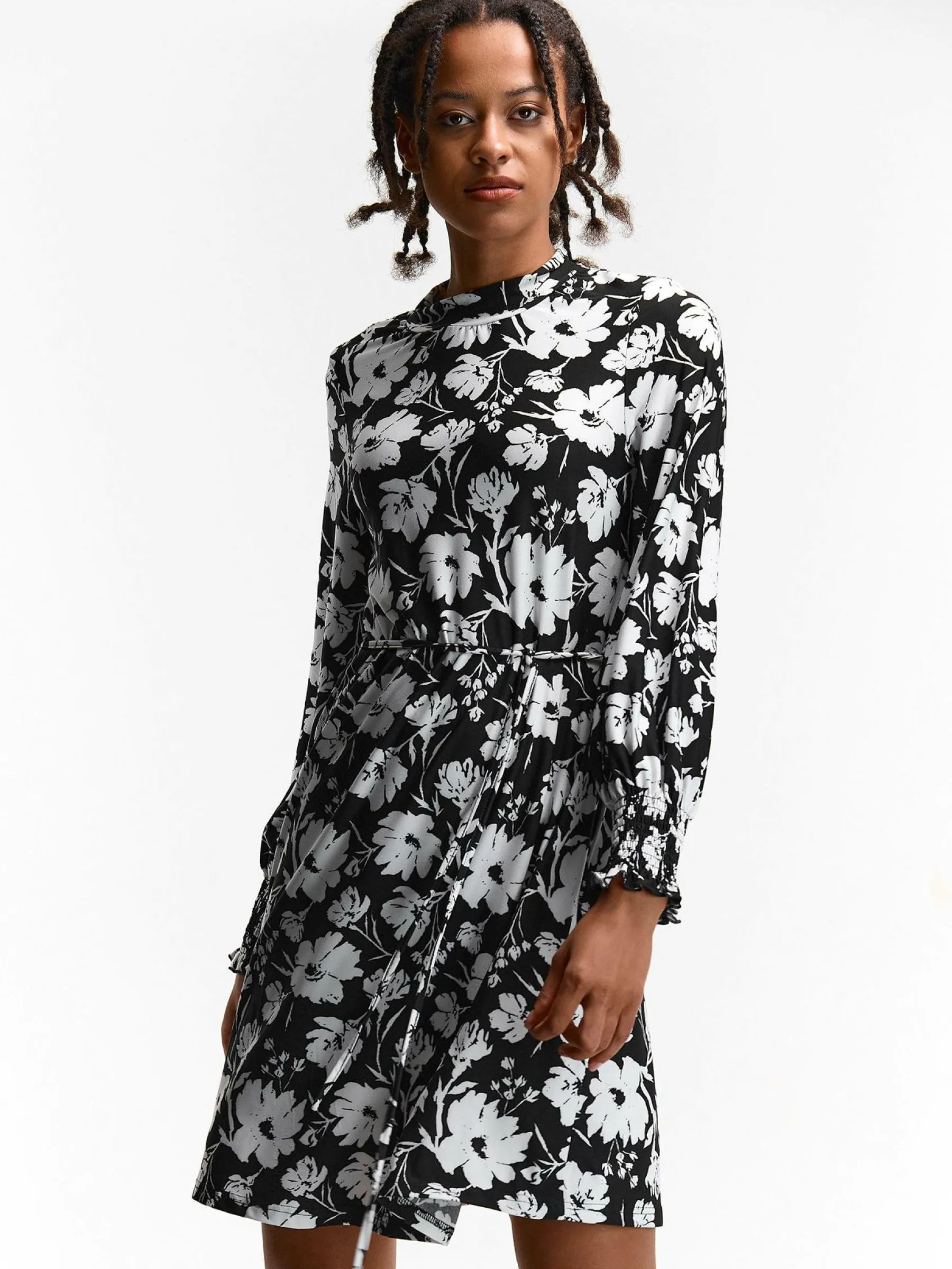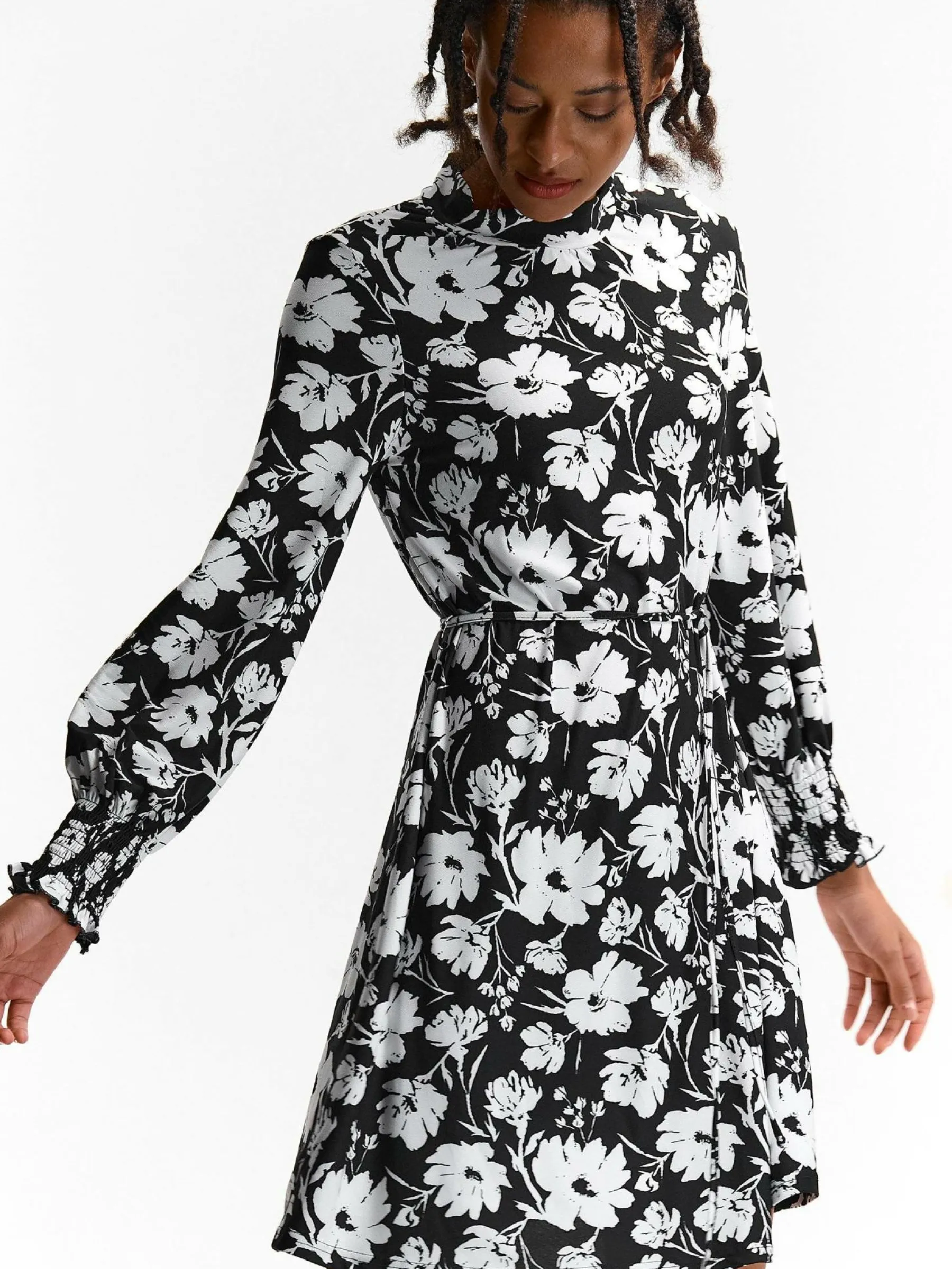 Kolor: czarnyKrój: asyTyp: sukienkaRekaw: długi rękawDługość: miniPattern style: kwiatowe, z nadrukiemDetal: z pas…