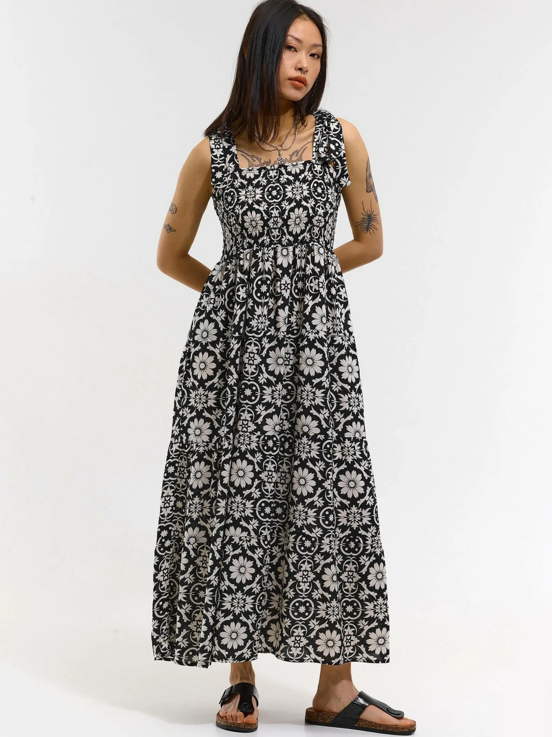 Kolor: czarnyKrój: z falbanąTyp: sukienkaRekaw: bez rękawówDługość: maxiPattern style: wzorzysteDetal: z falbanka…