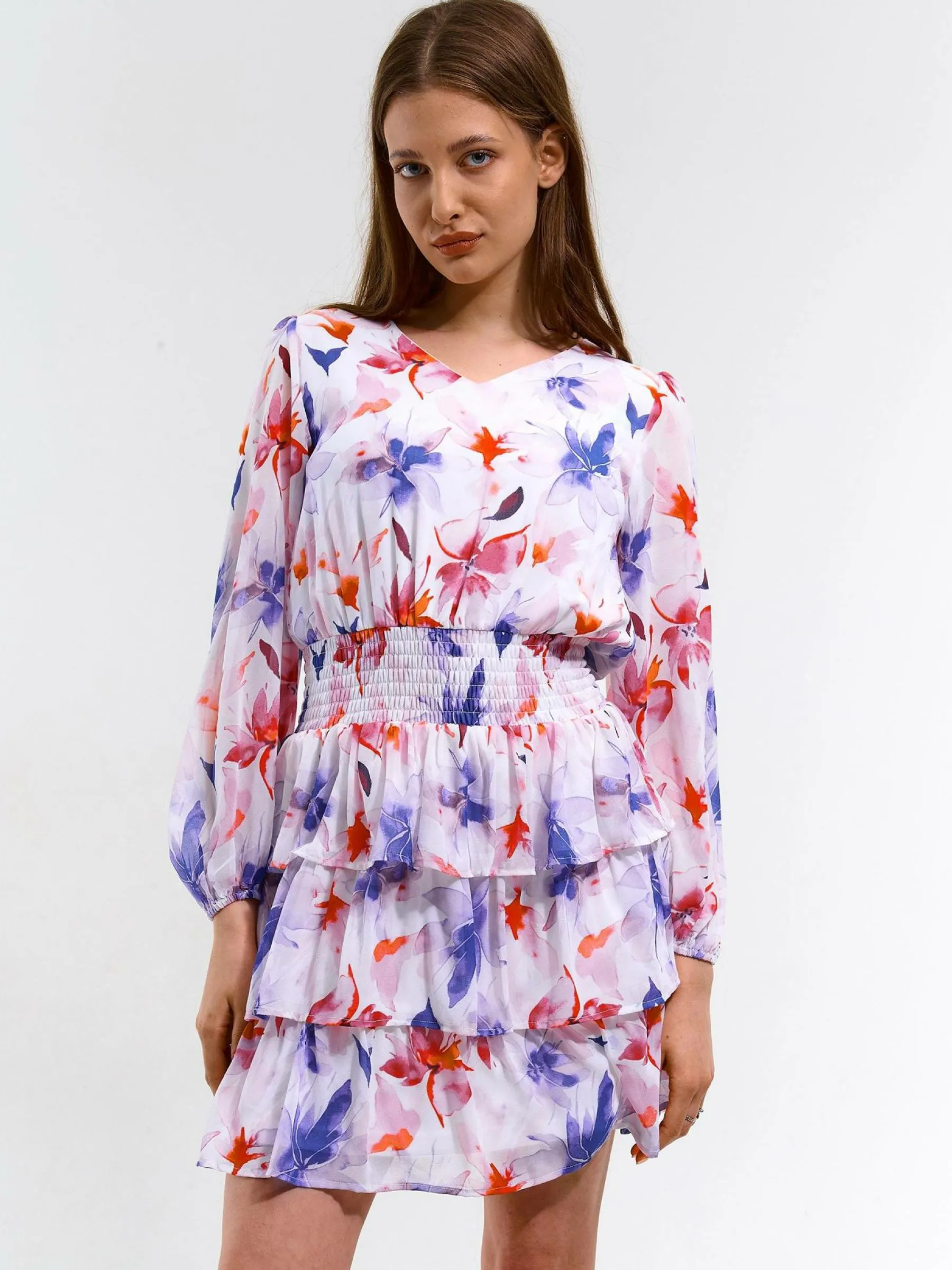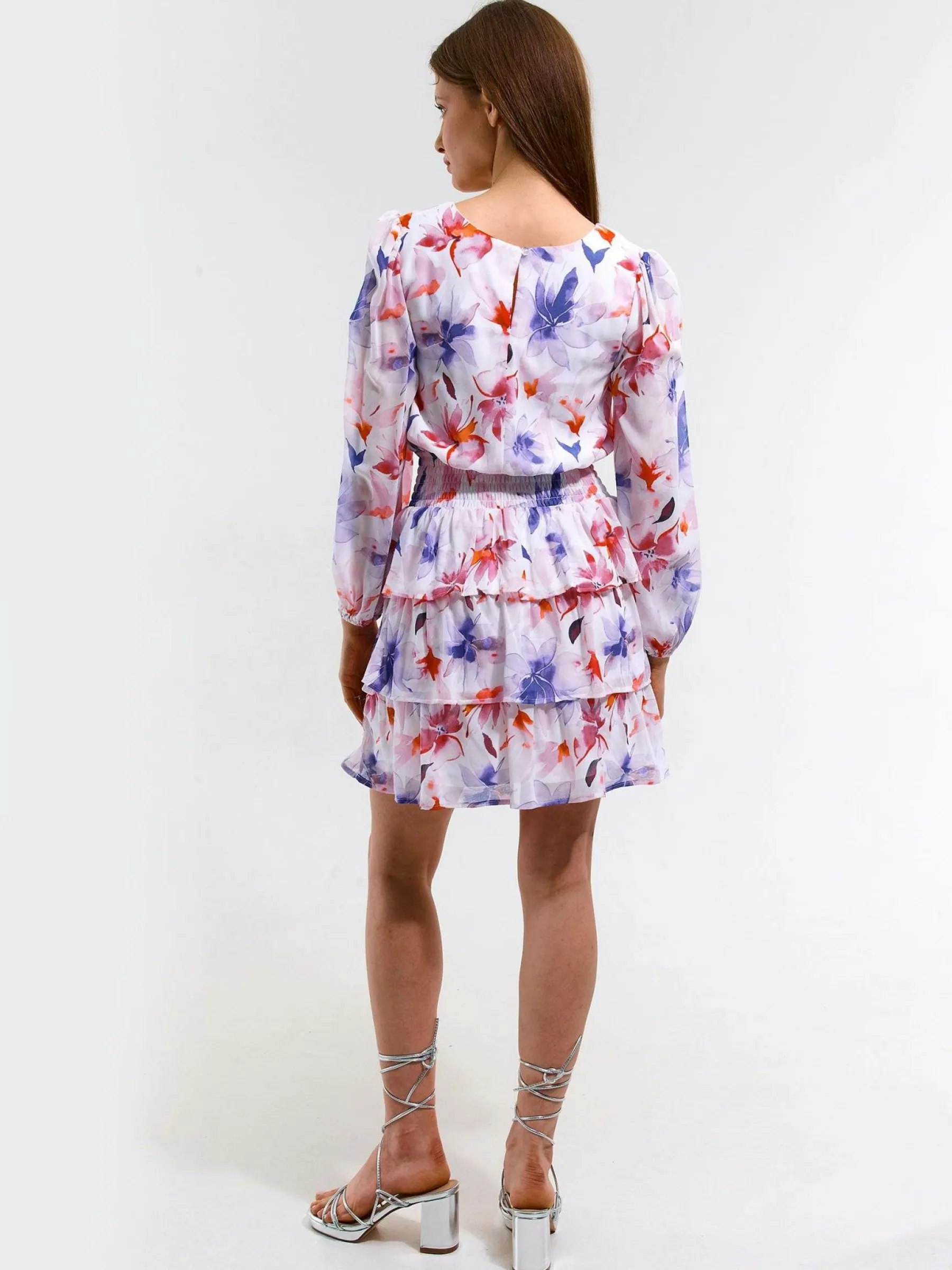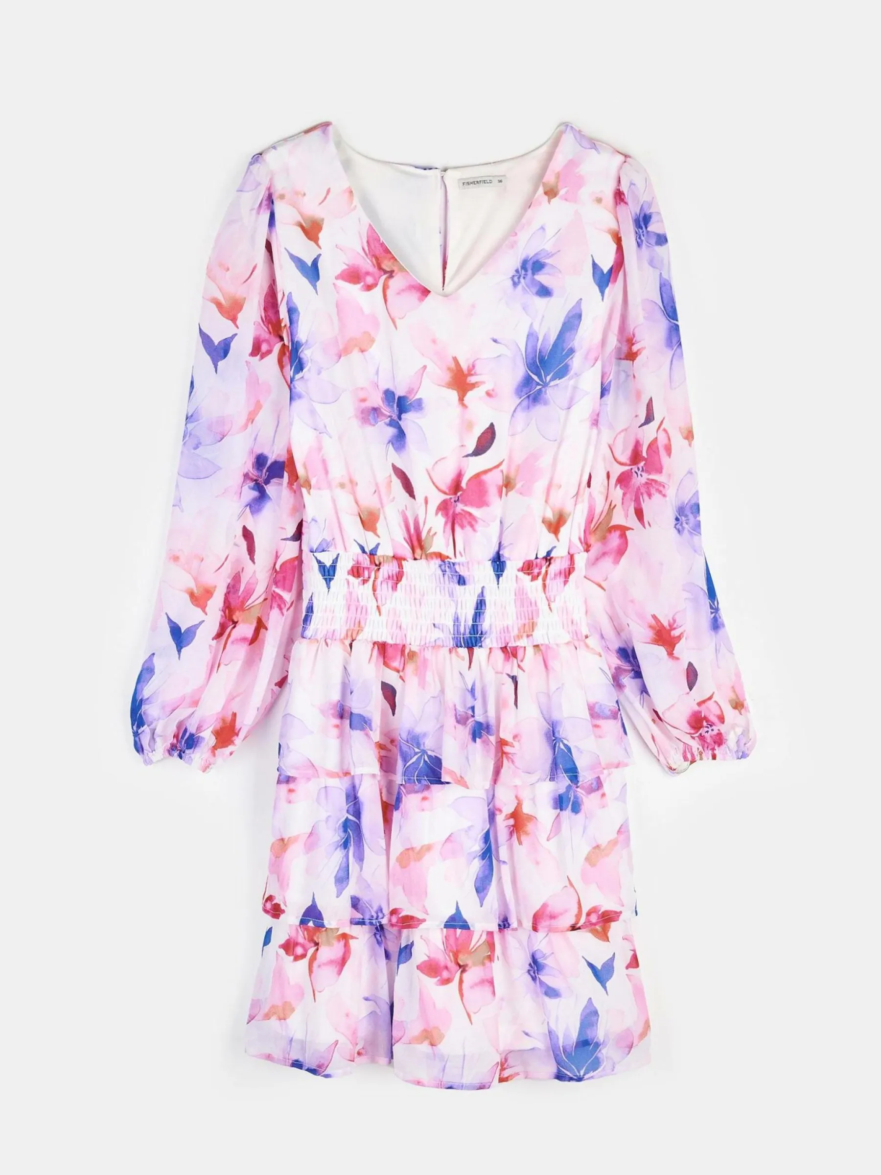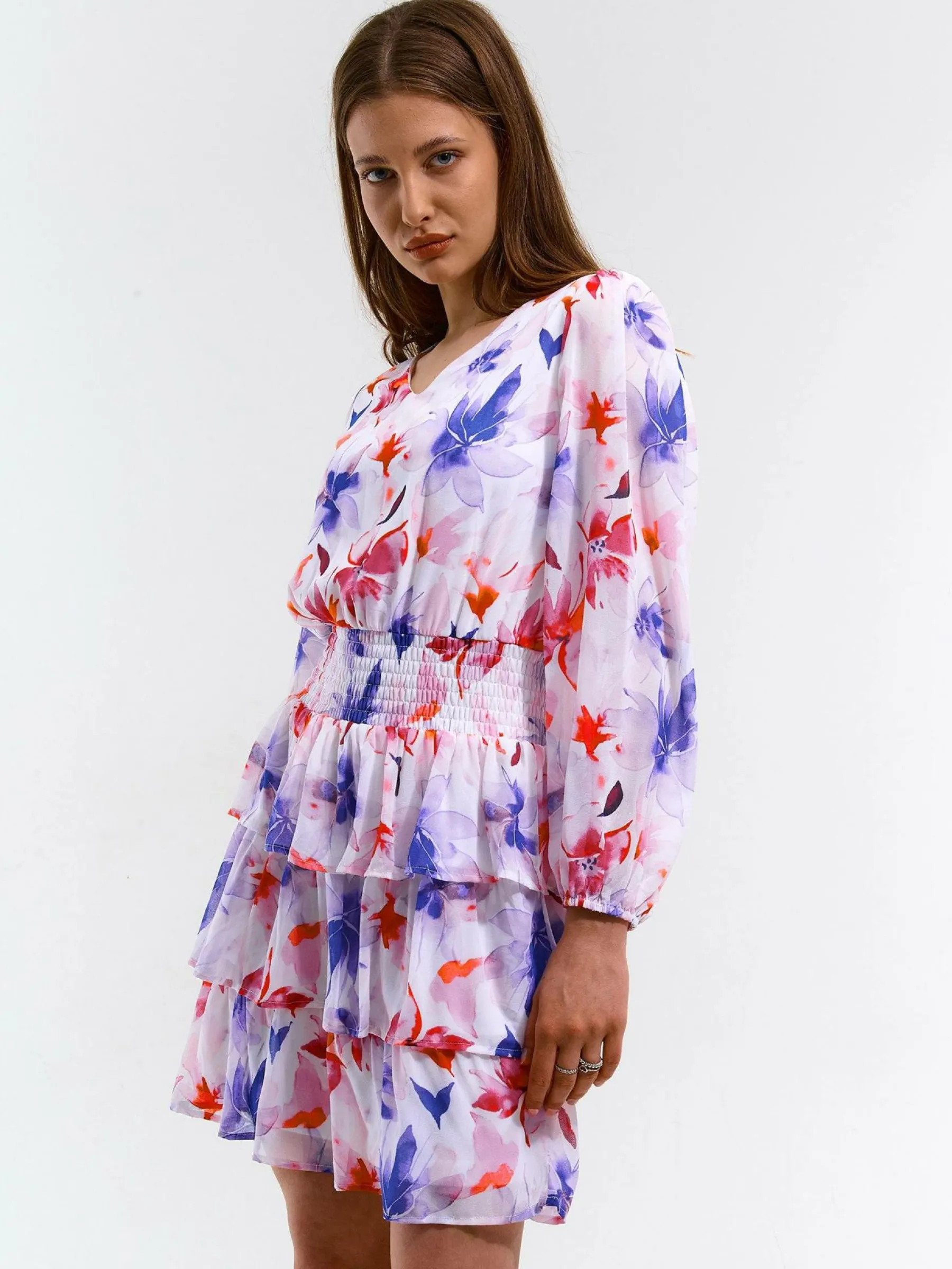 Kolor: białyKrój: z falbanąTyp: sukienkaRekaw: długi rękawDługość: miniPattern style: kwiatoweDetal: v-neck, nad…