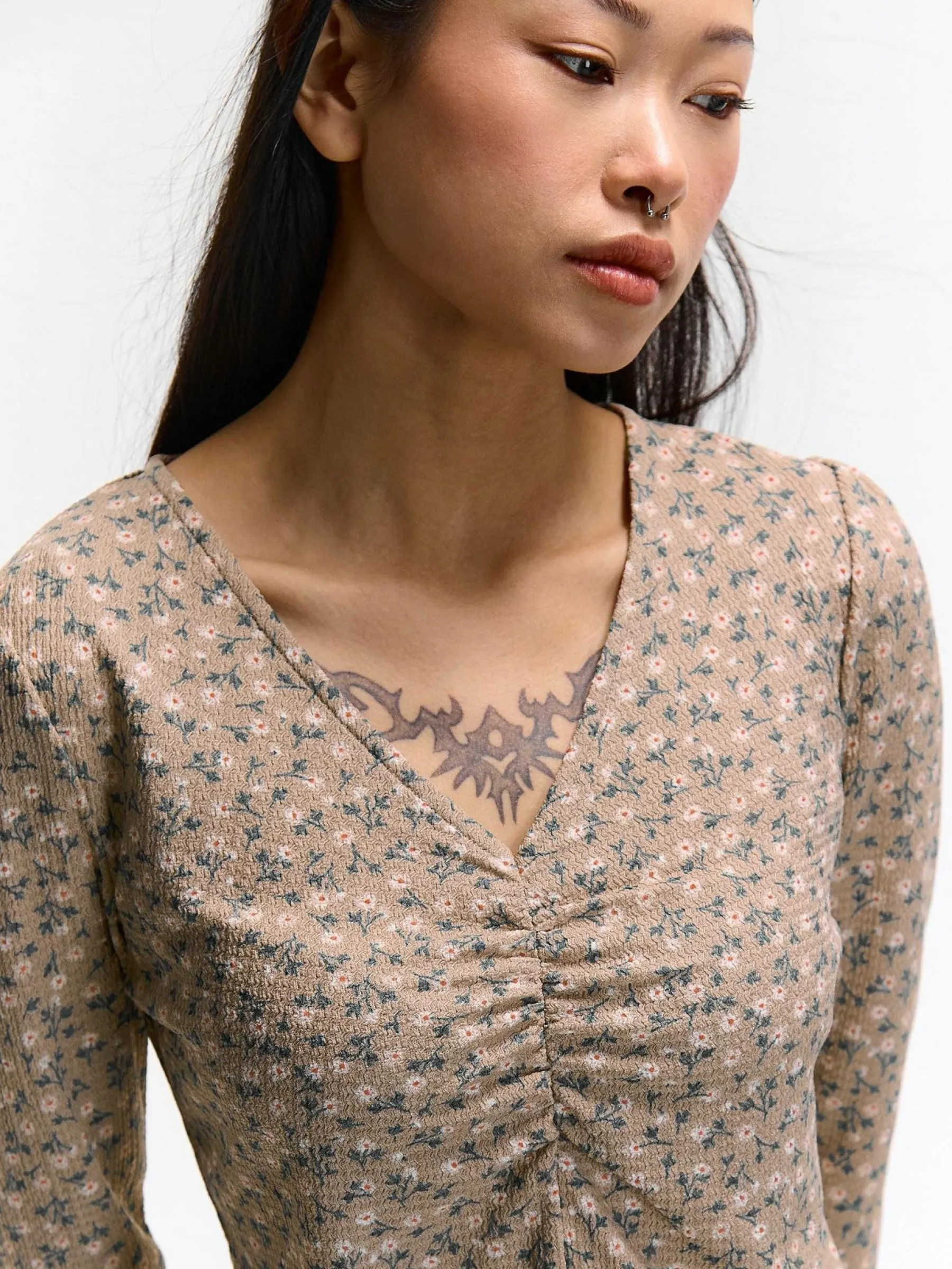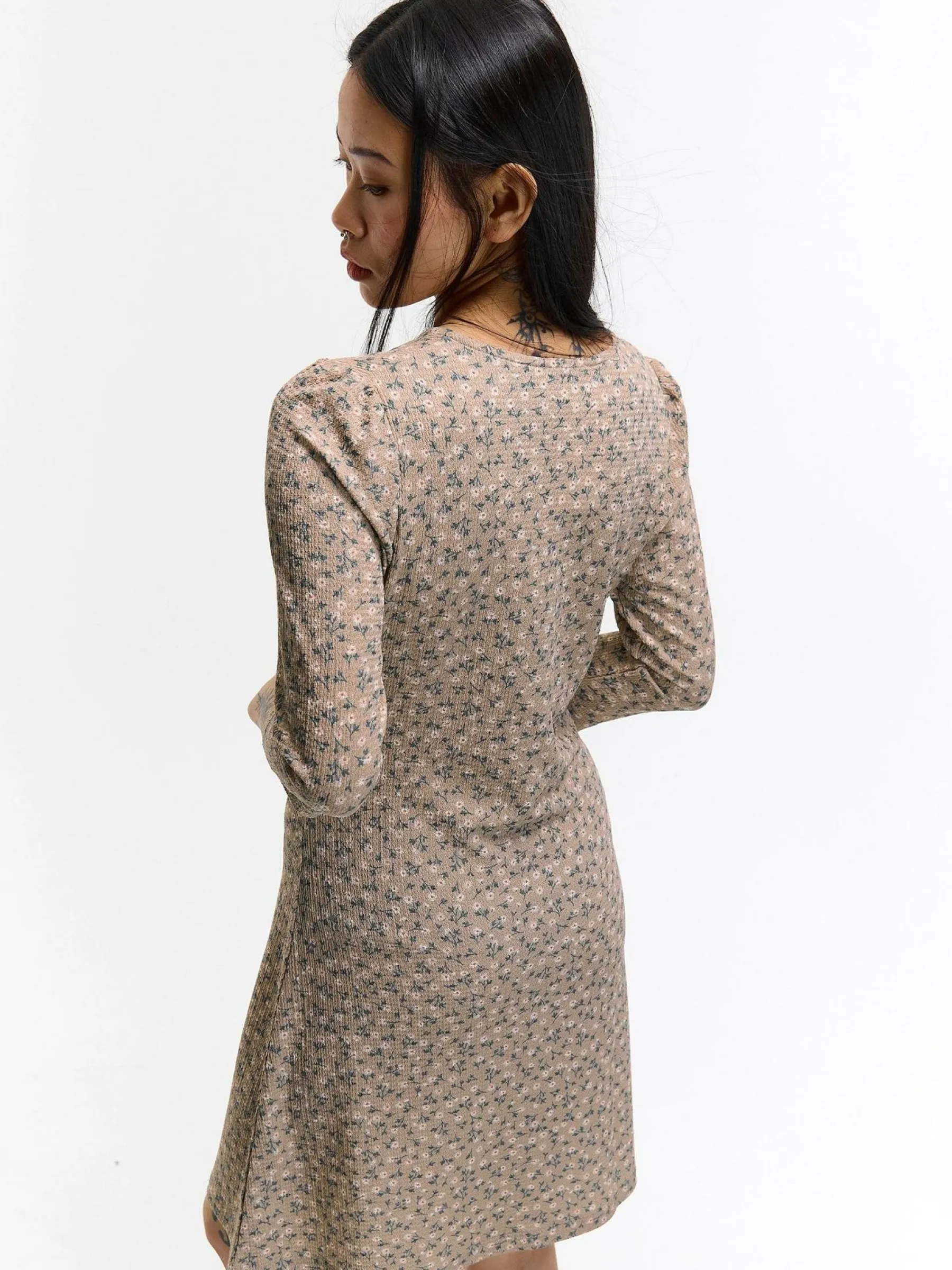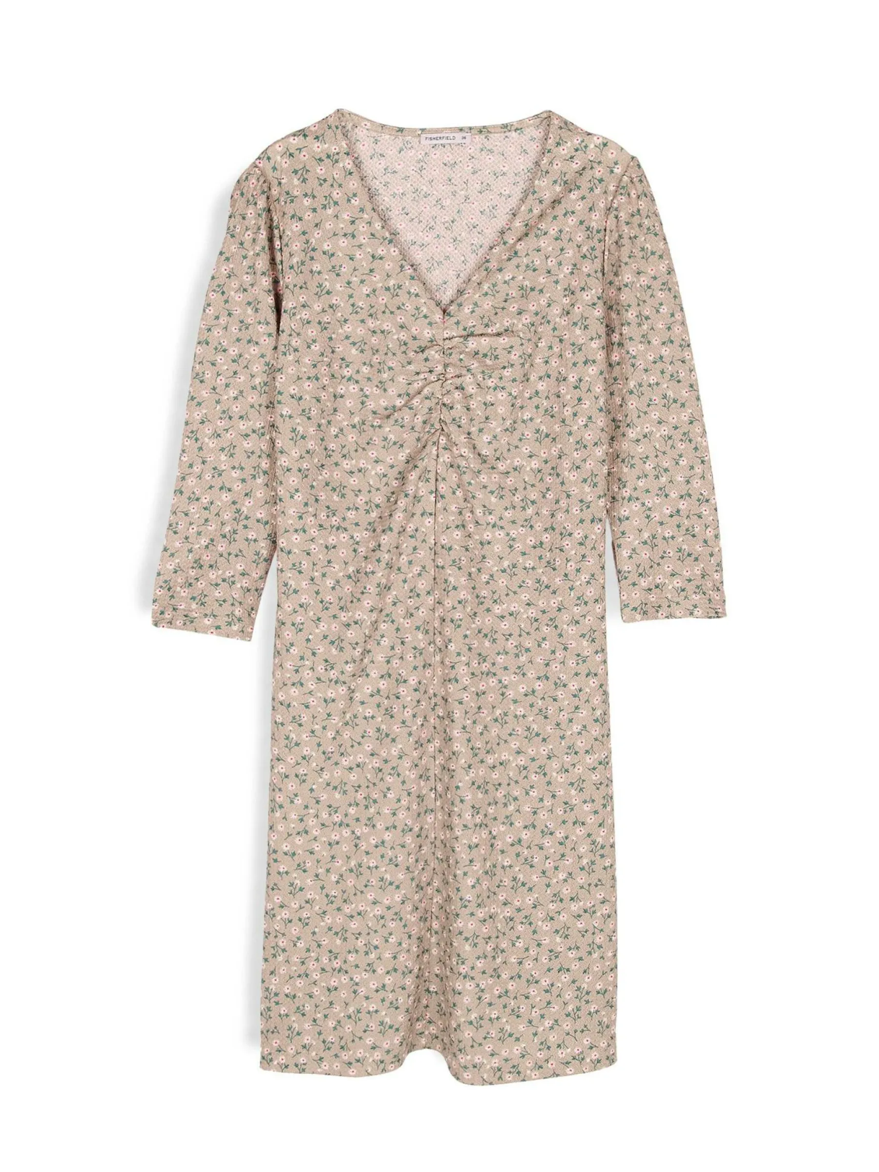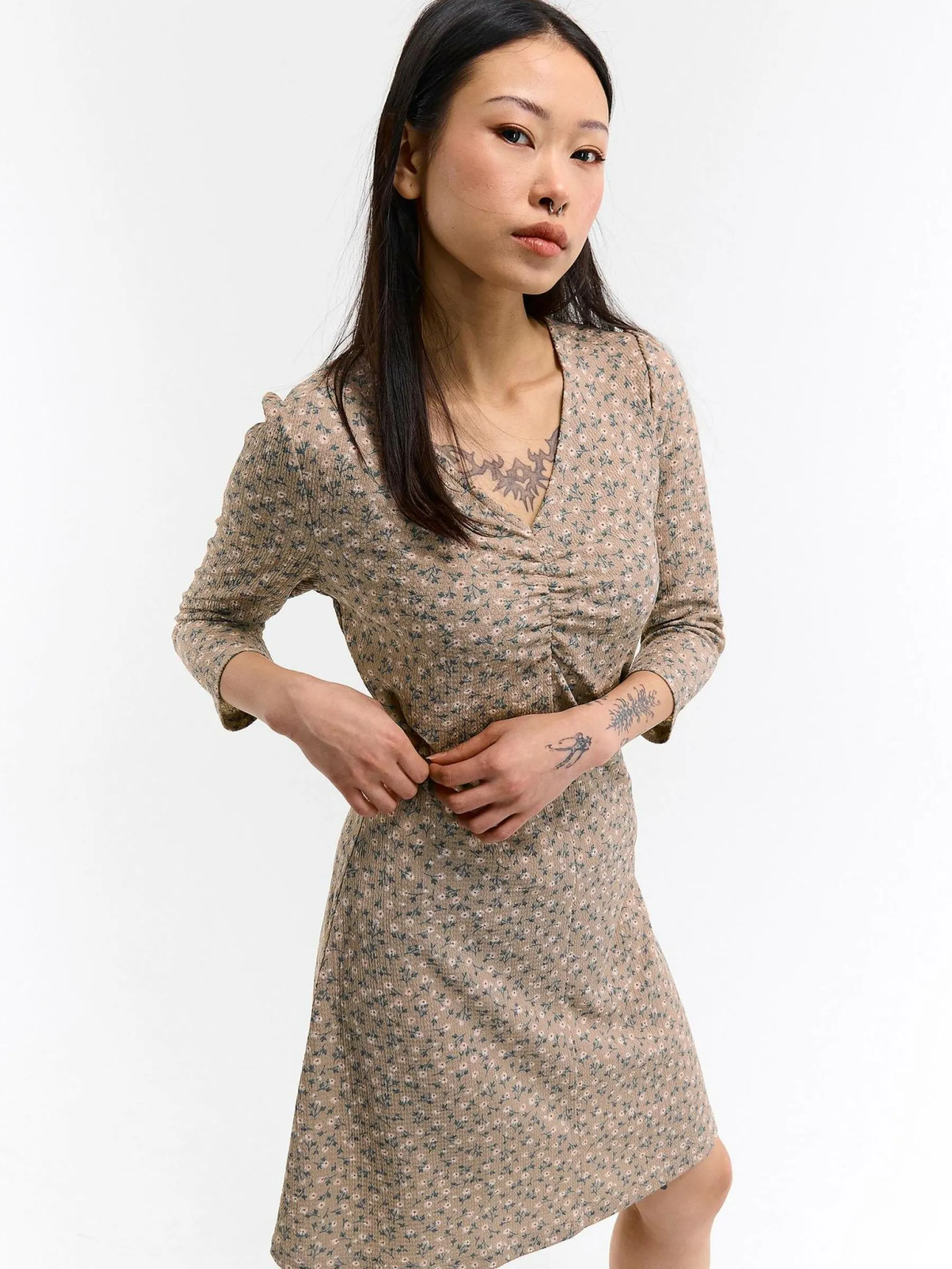 Kolor: beżowyKrój: z marszczeniemTyp: sukienkaRekaw: rękaw 3/4Długość: miniPattern style: z nadrukiem, kwiatoweDet…