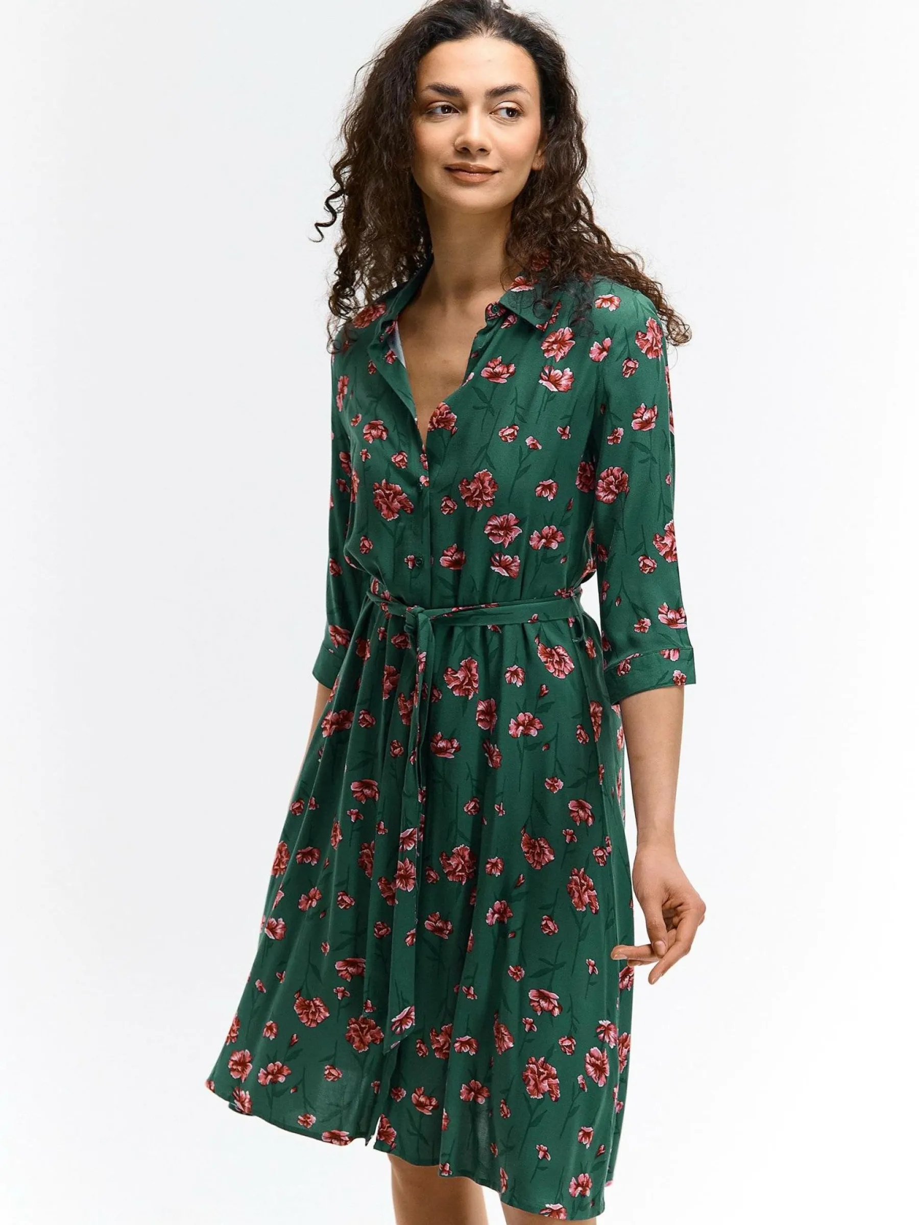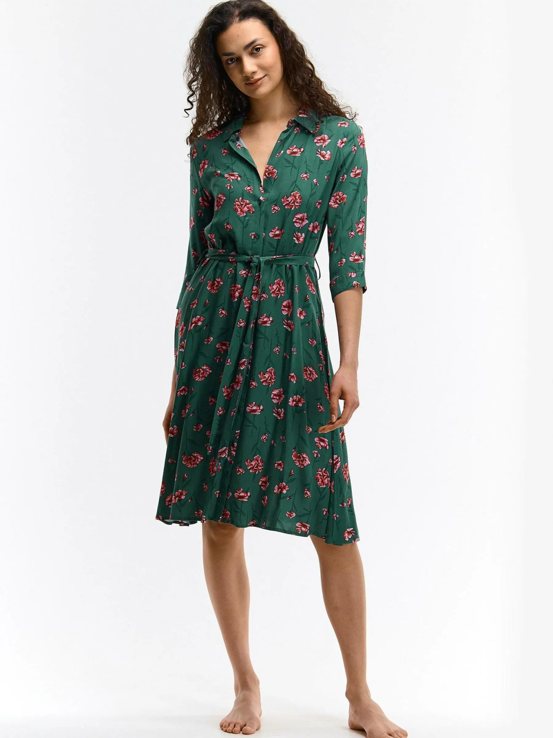 Kolor: zielonyKrój: koszuloweTyp: sukienkaRekaw: długi rękawDługość: midiPattern style: kwiatoweDetal: na guziki, …