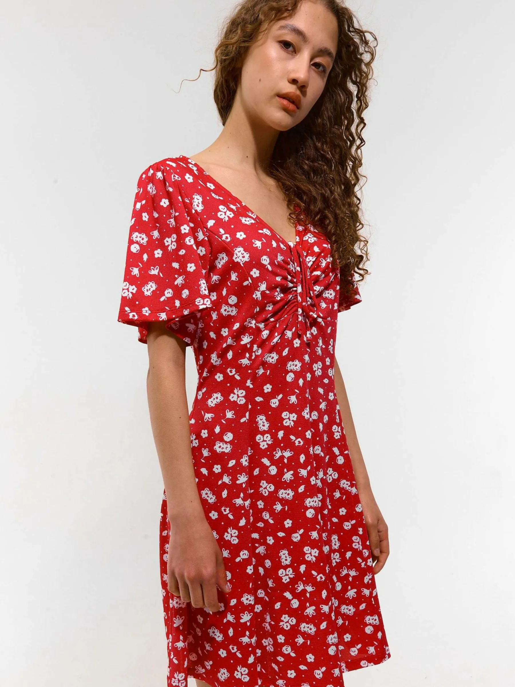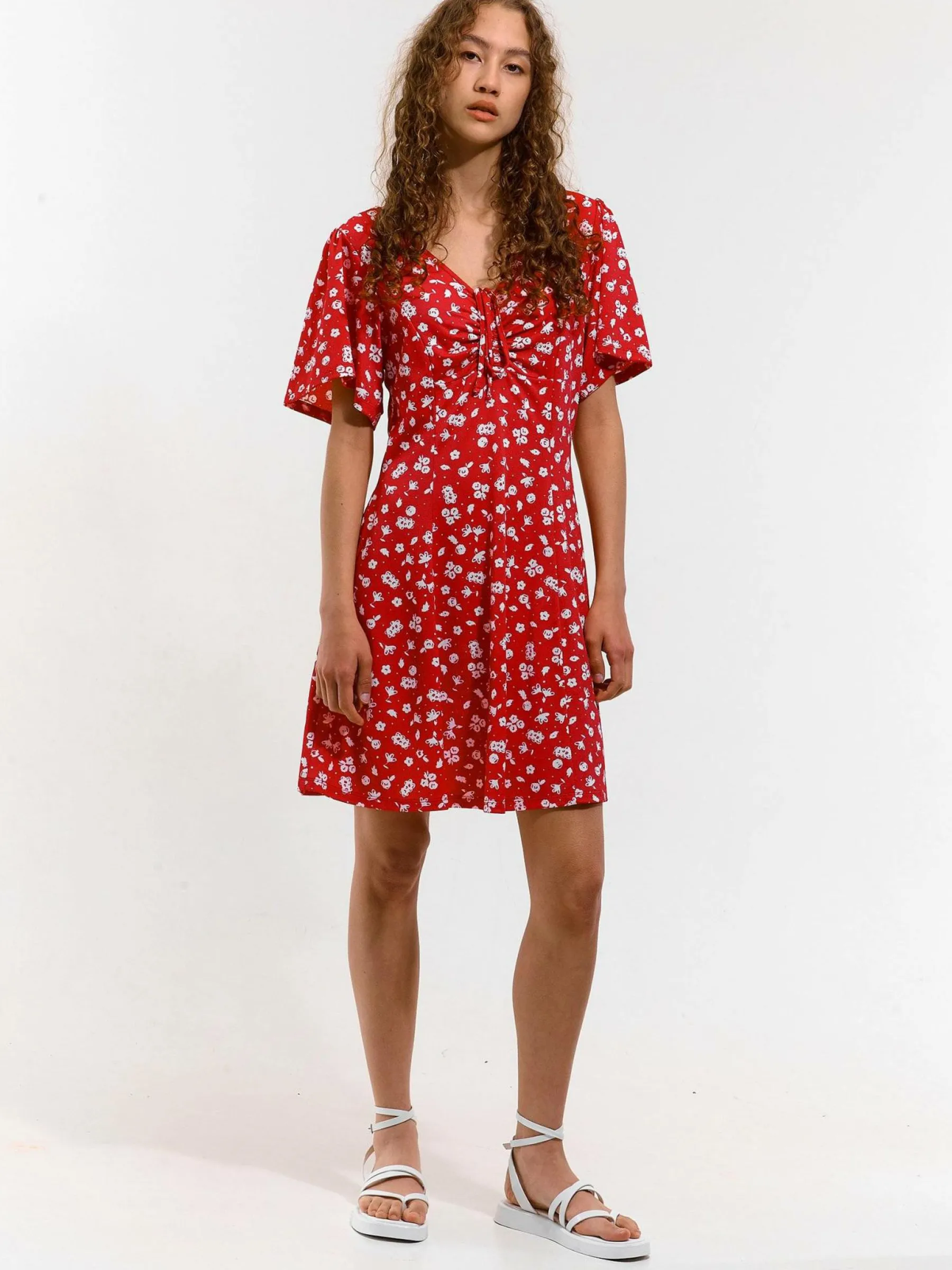 Kolor: różowyKrój: z falbanąTyp: sukienkaRekaw: krótki rękawDługość: miniPattern style: kwiatoweDetal: ze sznur…
