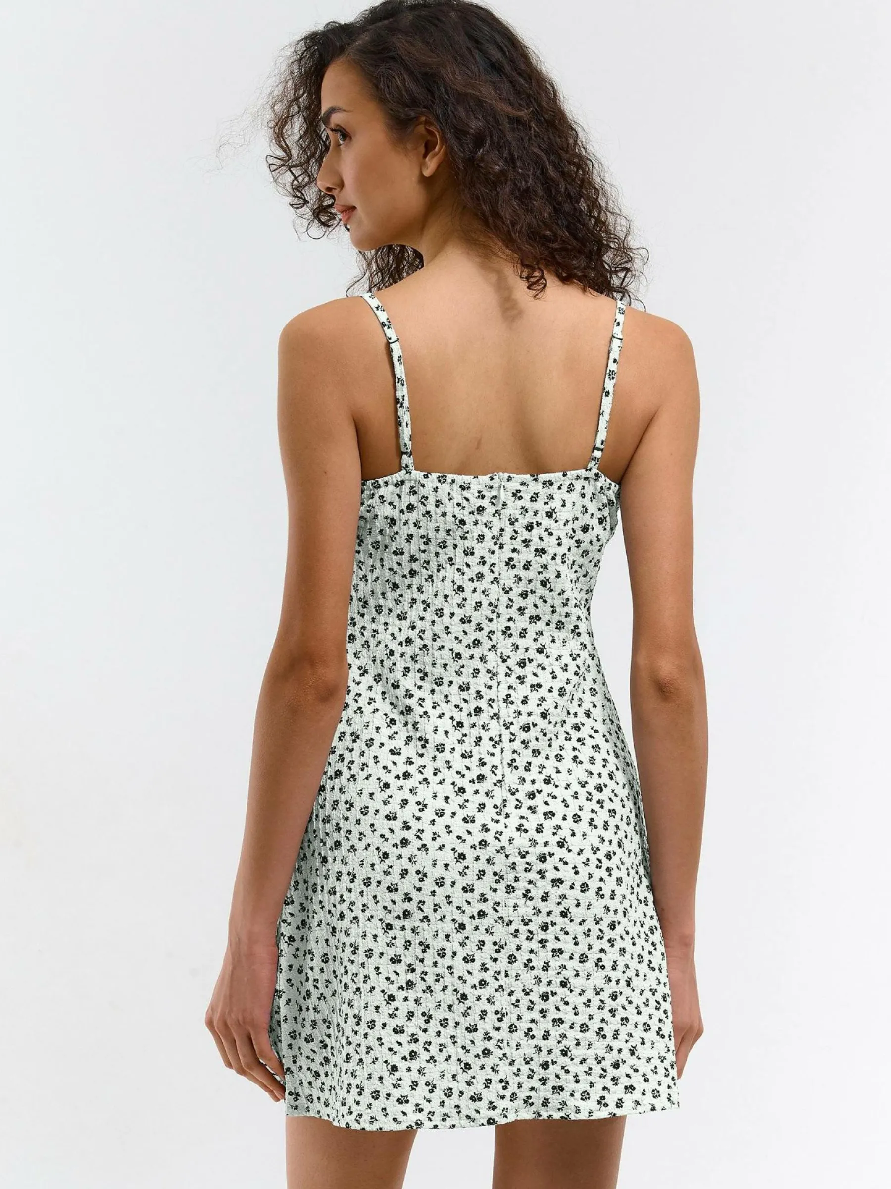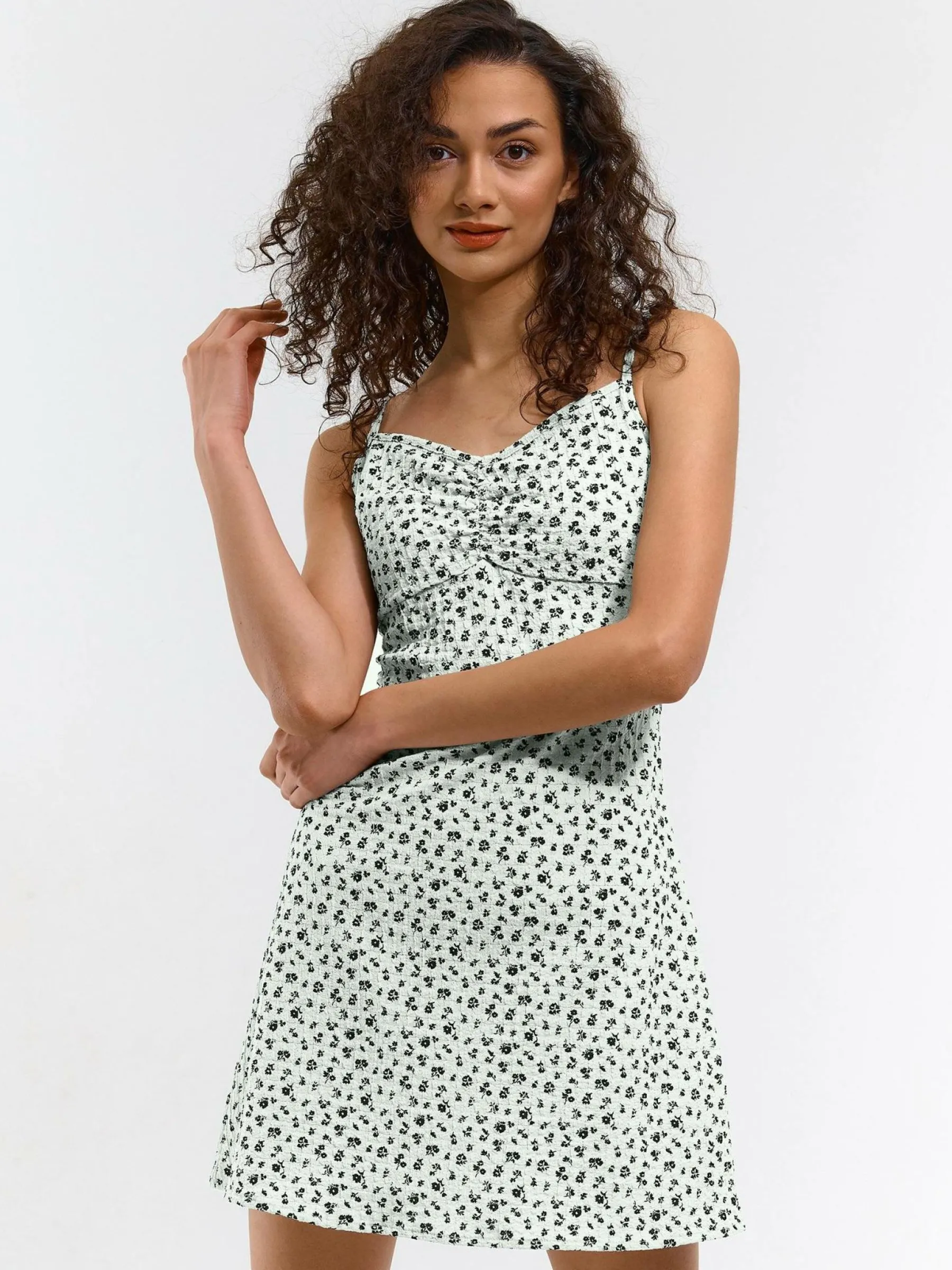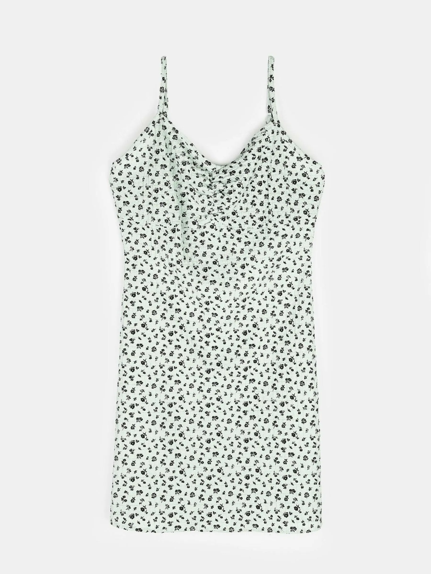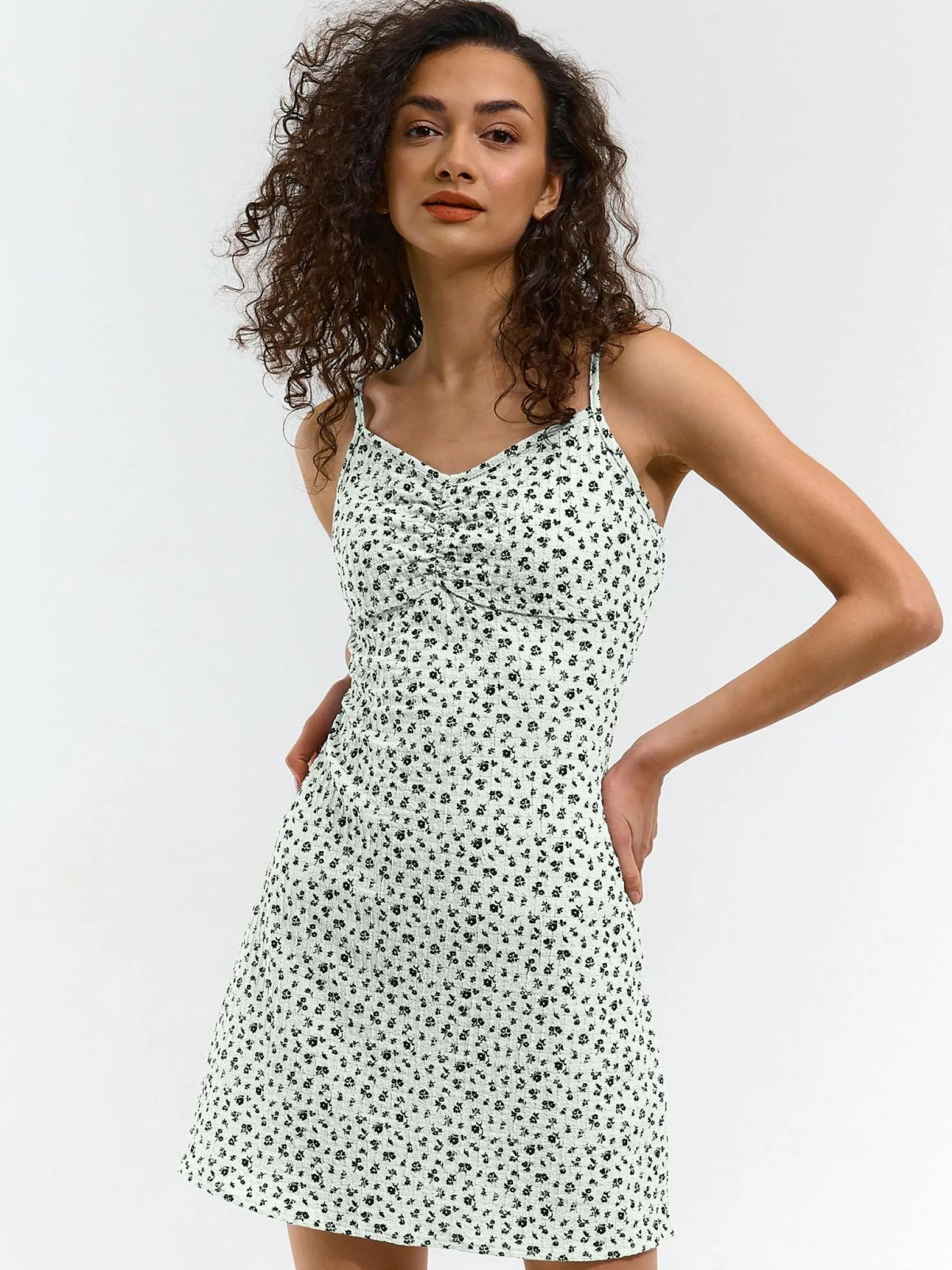 Kolor: niebieskiKrój: regularTyp: sukienkaRekaw: bez rękawówDługość: miniPattern style: kwiatoweDetal: z falbankam…