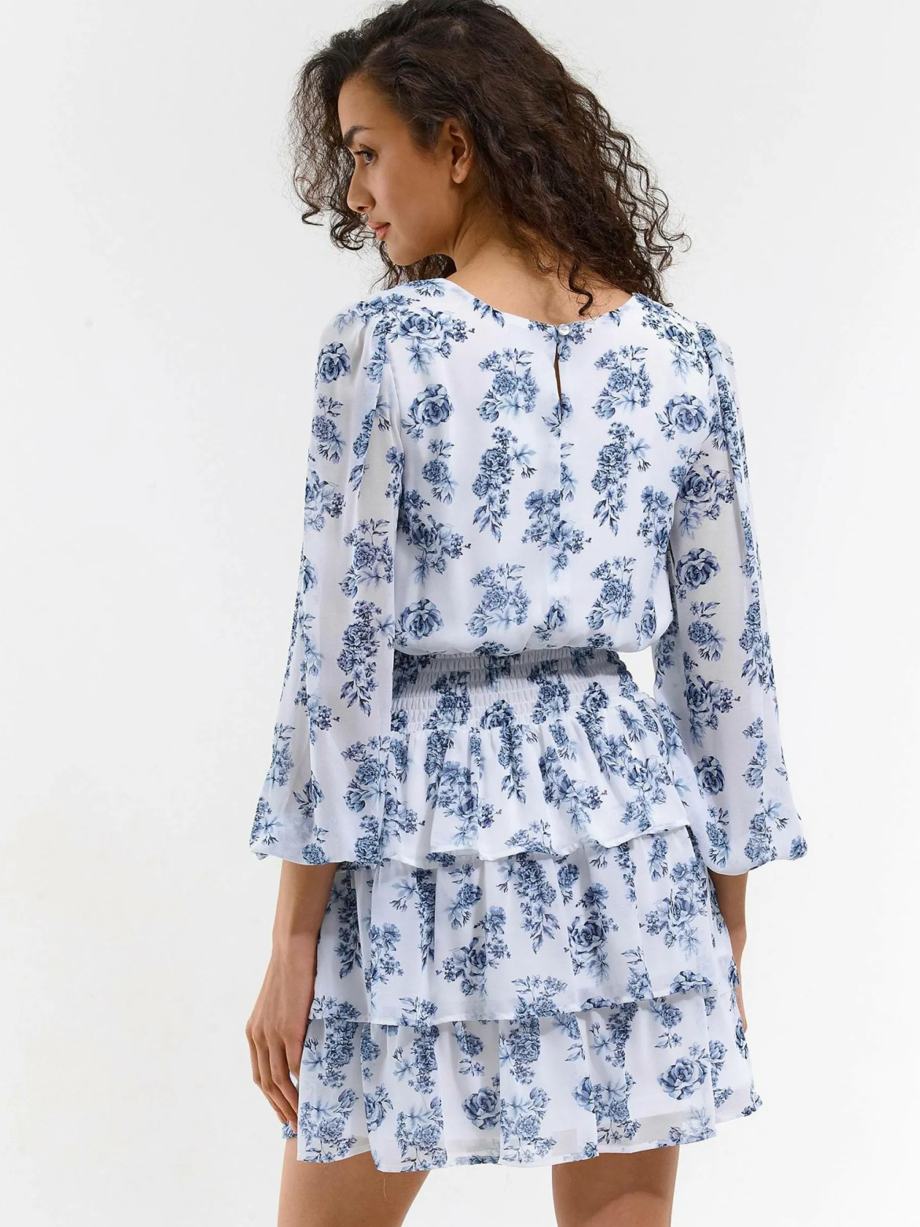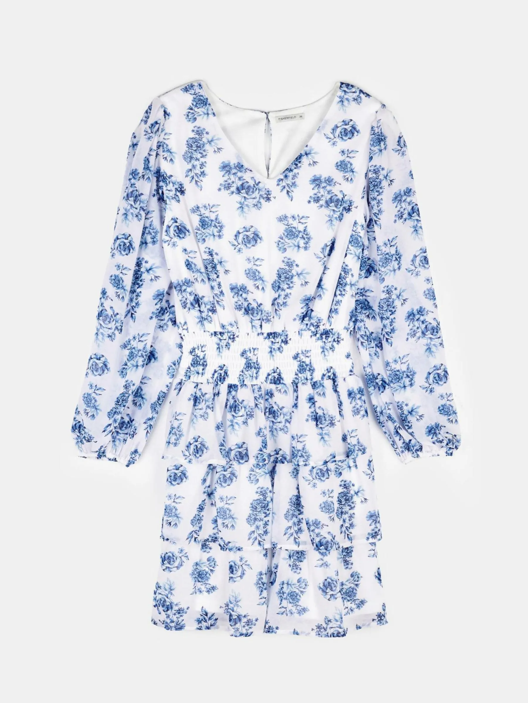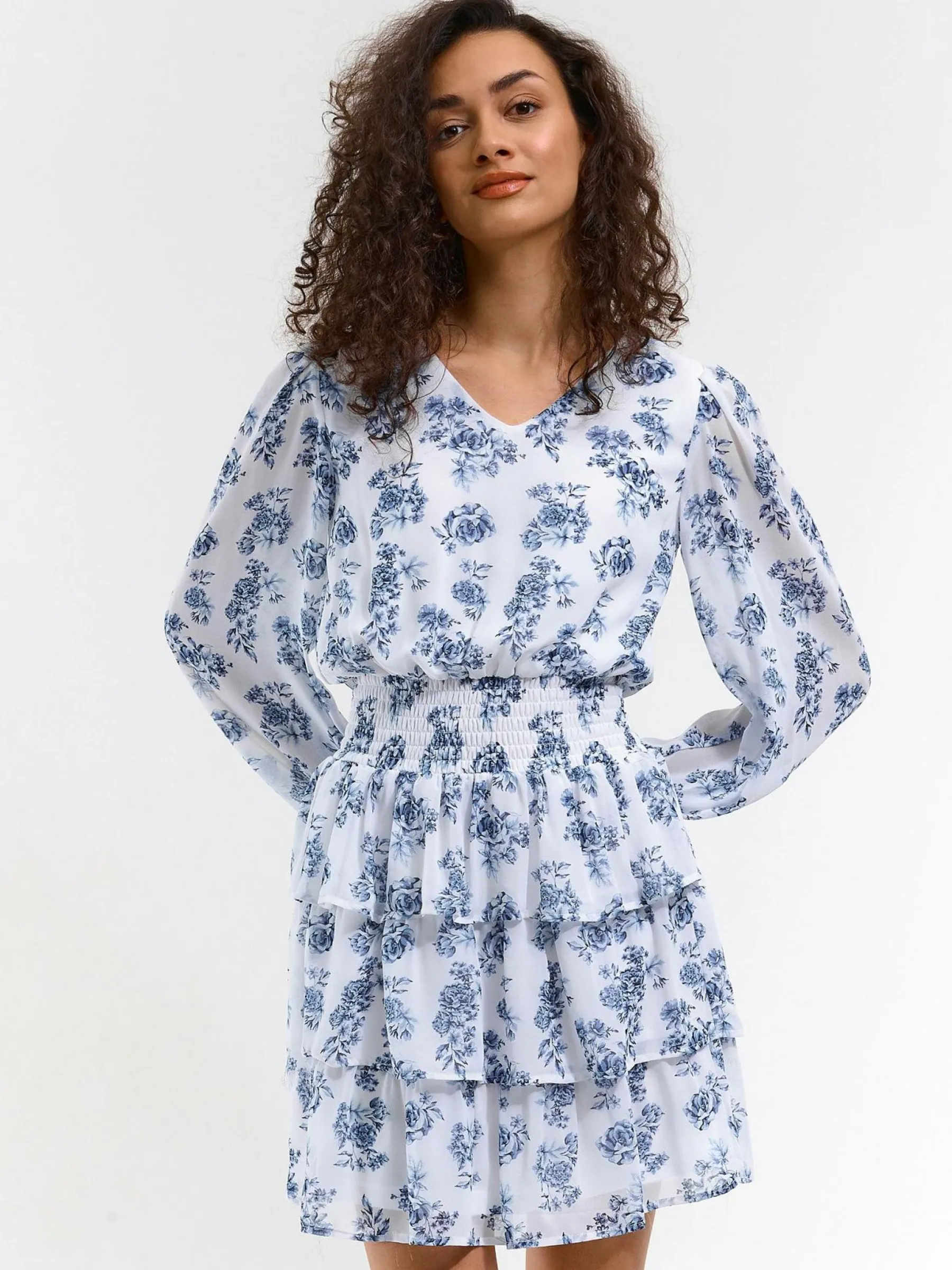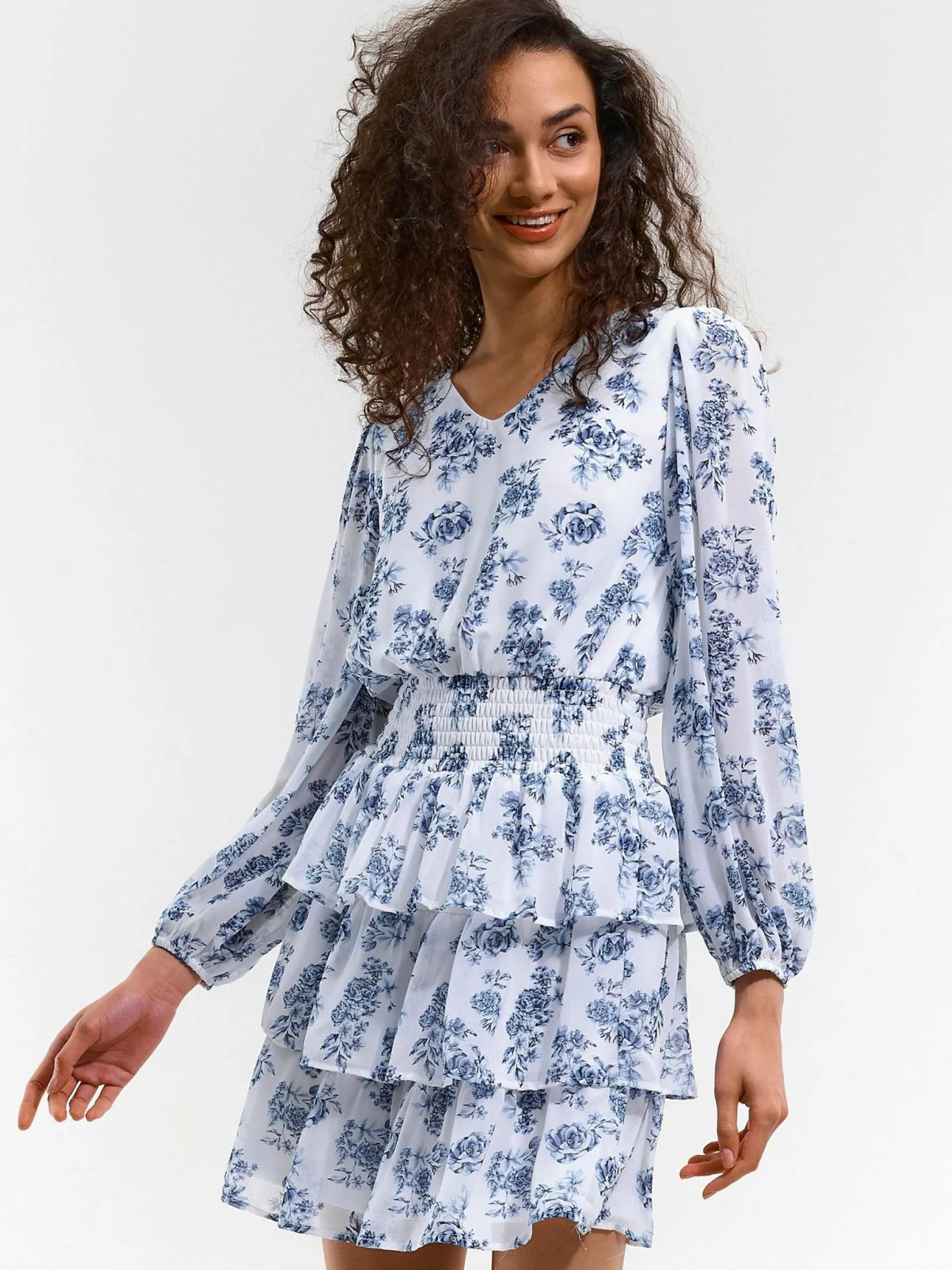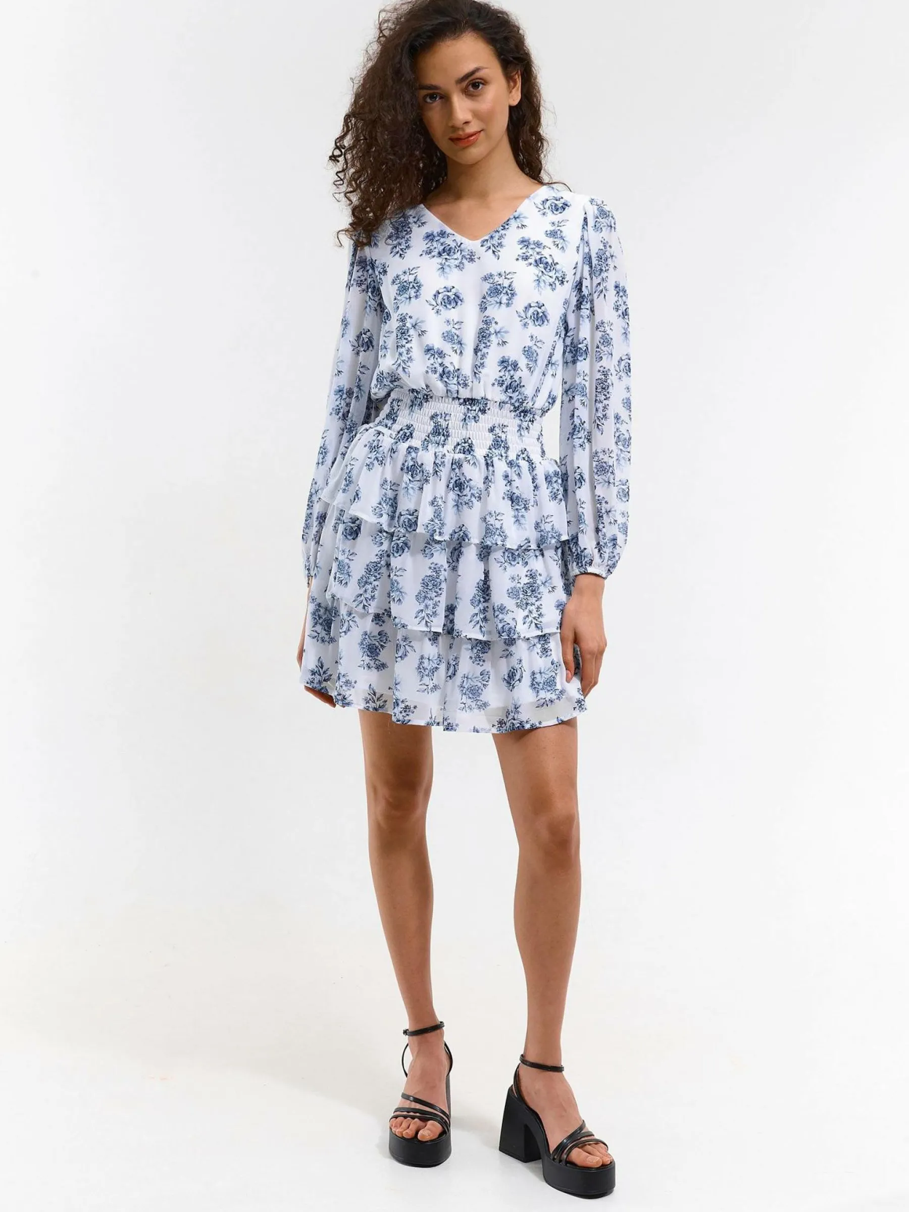 Kolor: białyKrój: z falbanąTyp: sukienkaRekaw: długi rękawDługość: miniPattern style: kwiatoweDetal: nad głową…