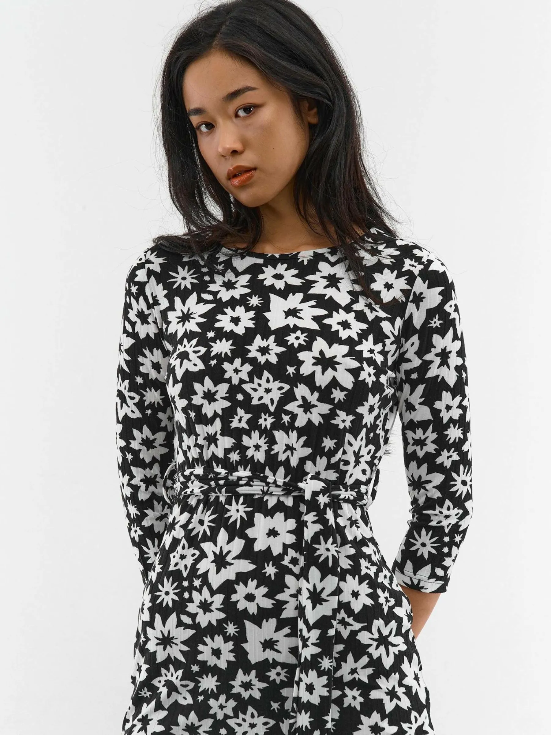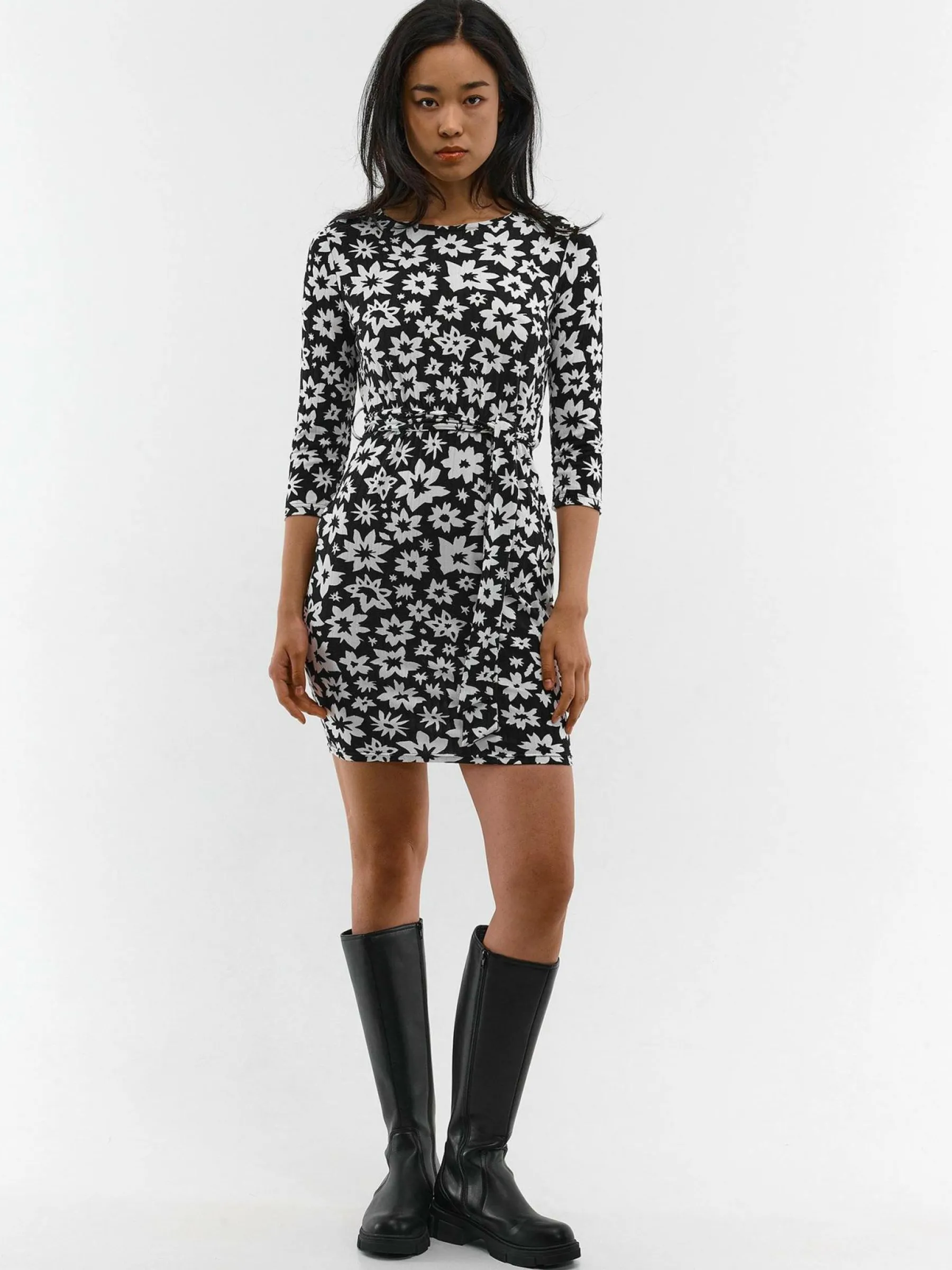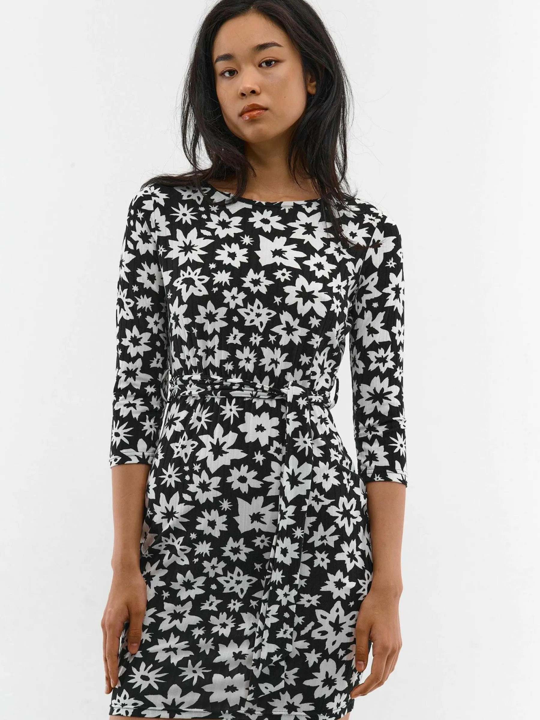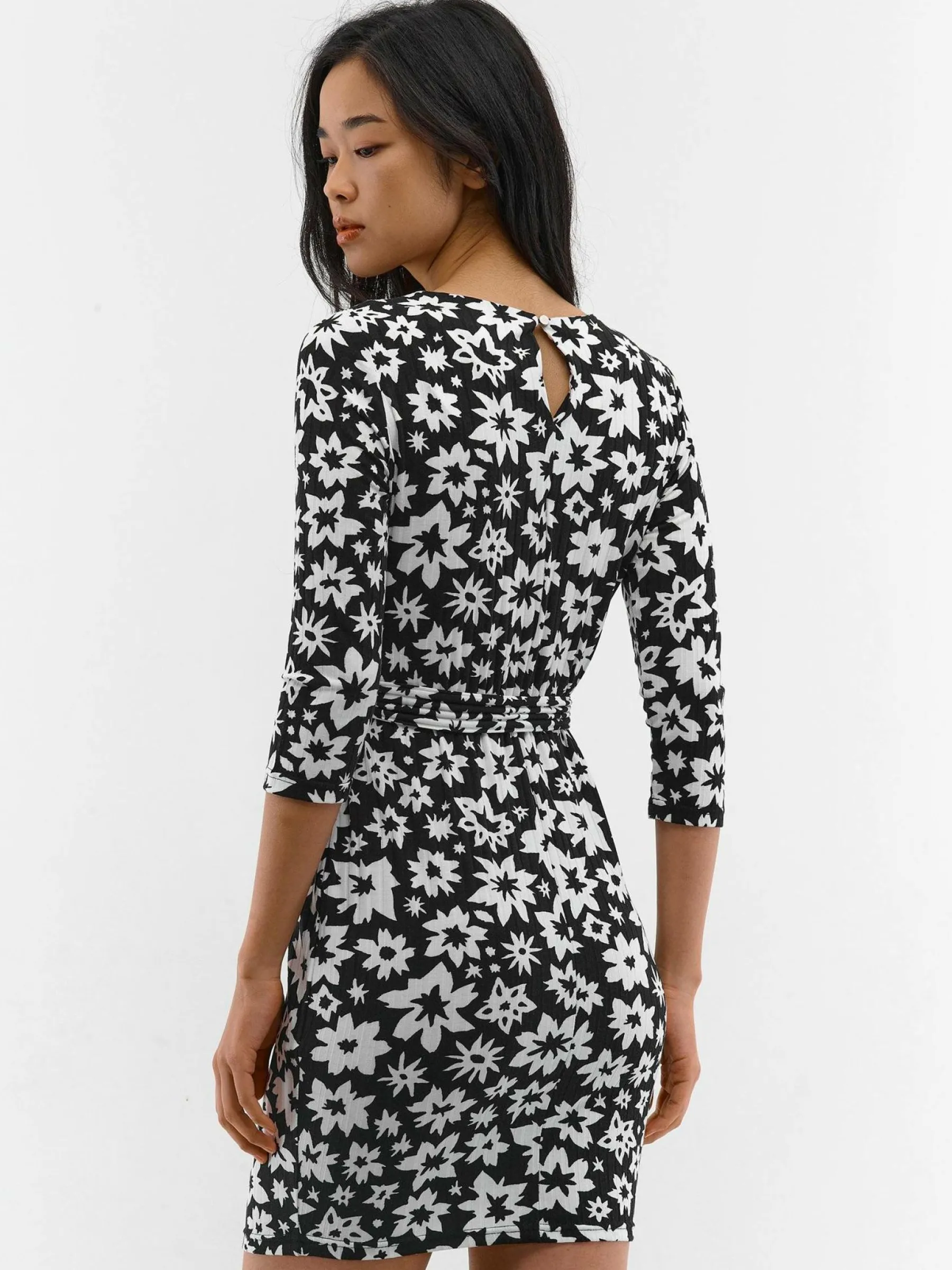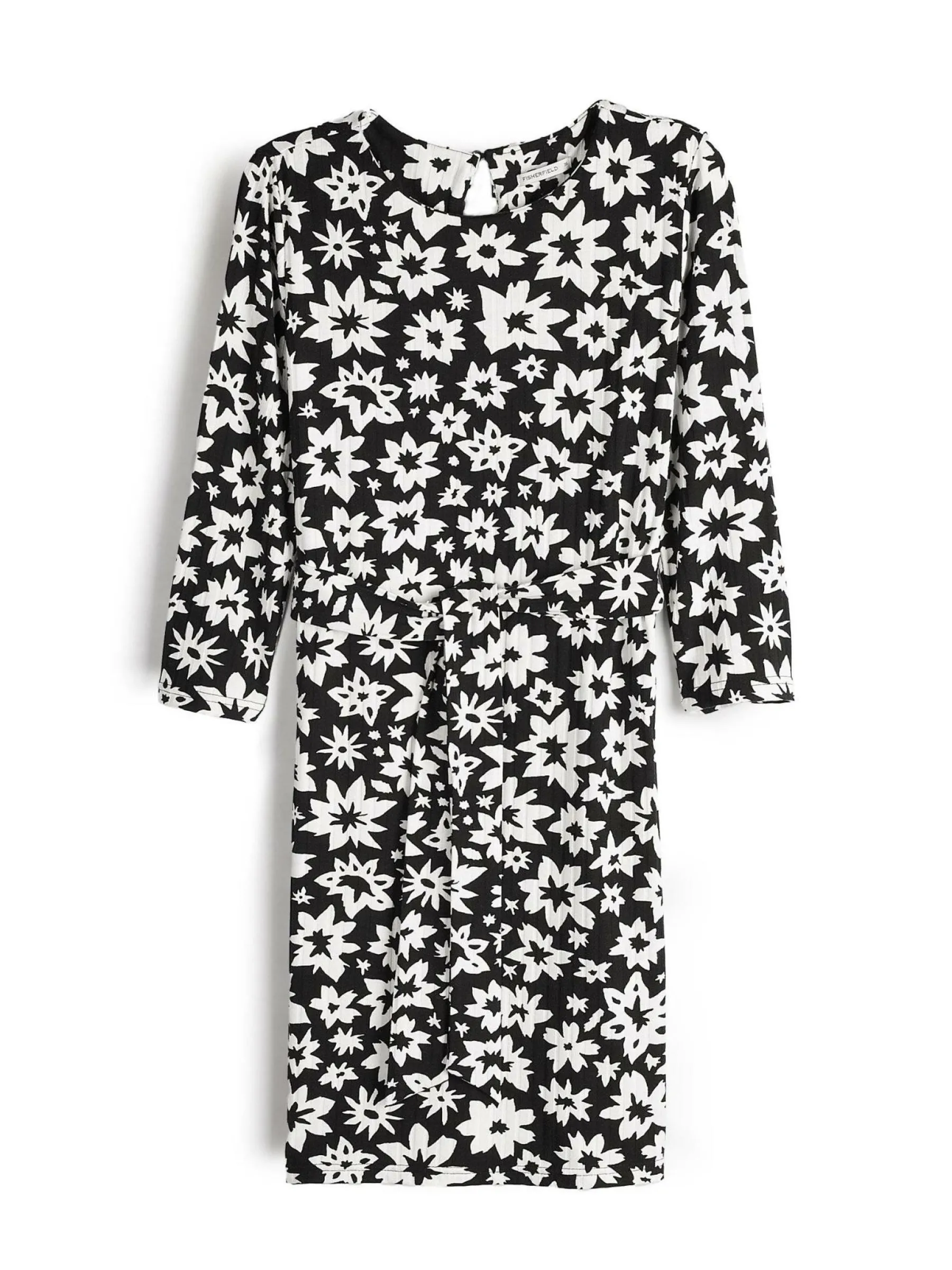 Kolor: czarnyKrój: asyTyp: sukienkaRekaw: rękaw 3/4Długość: miniPattern style: z nadrukiem, kwiatoweDetal: z paskie…