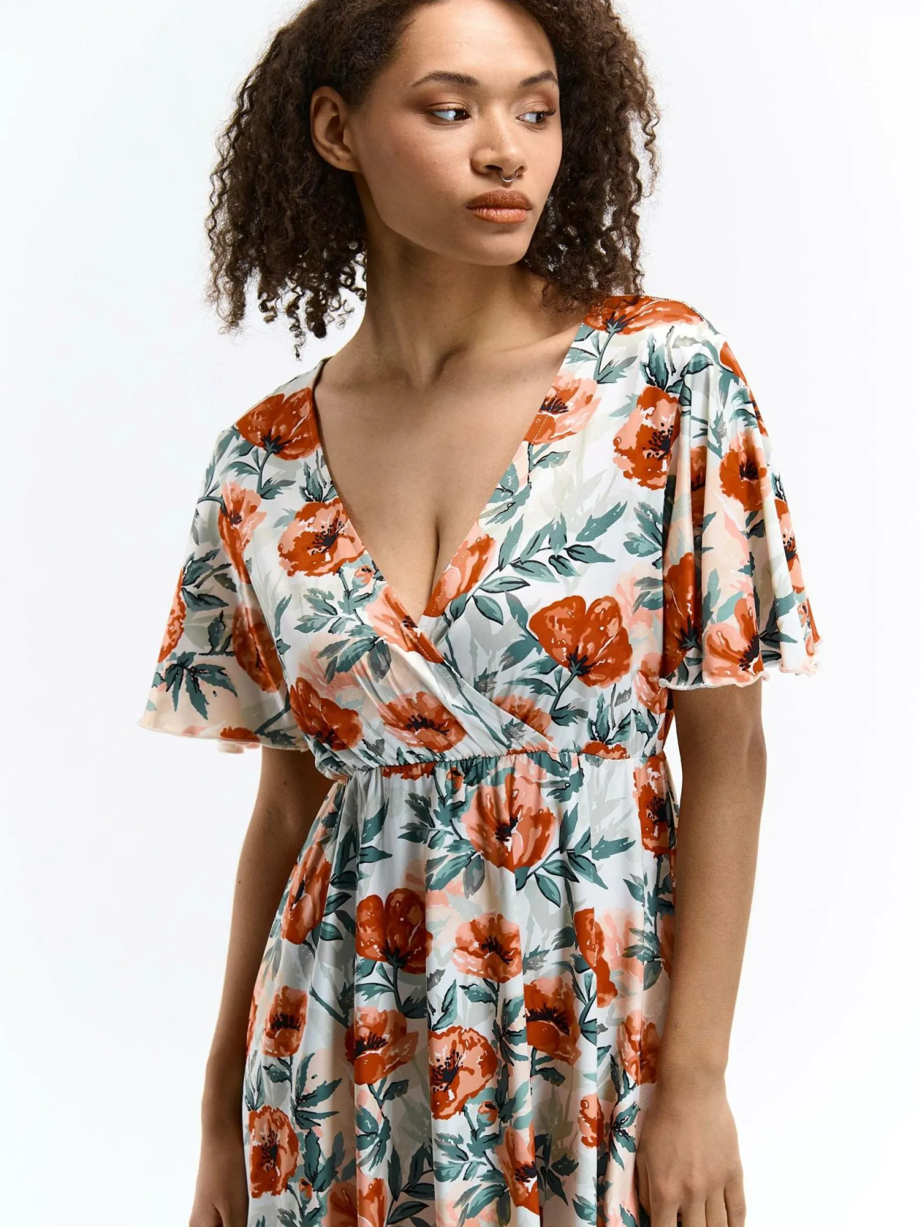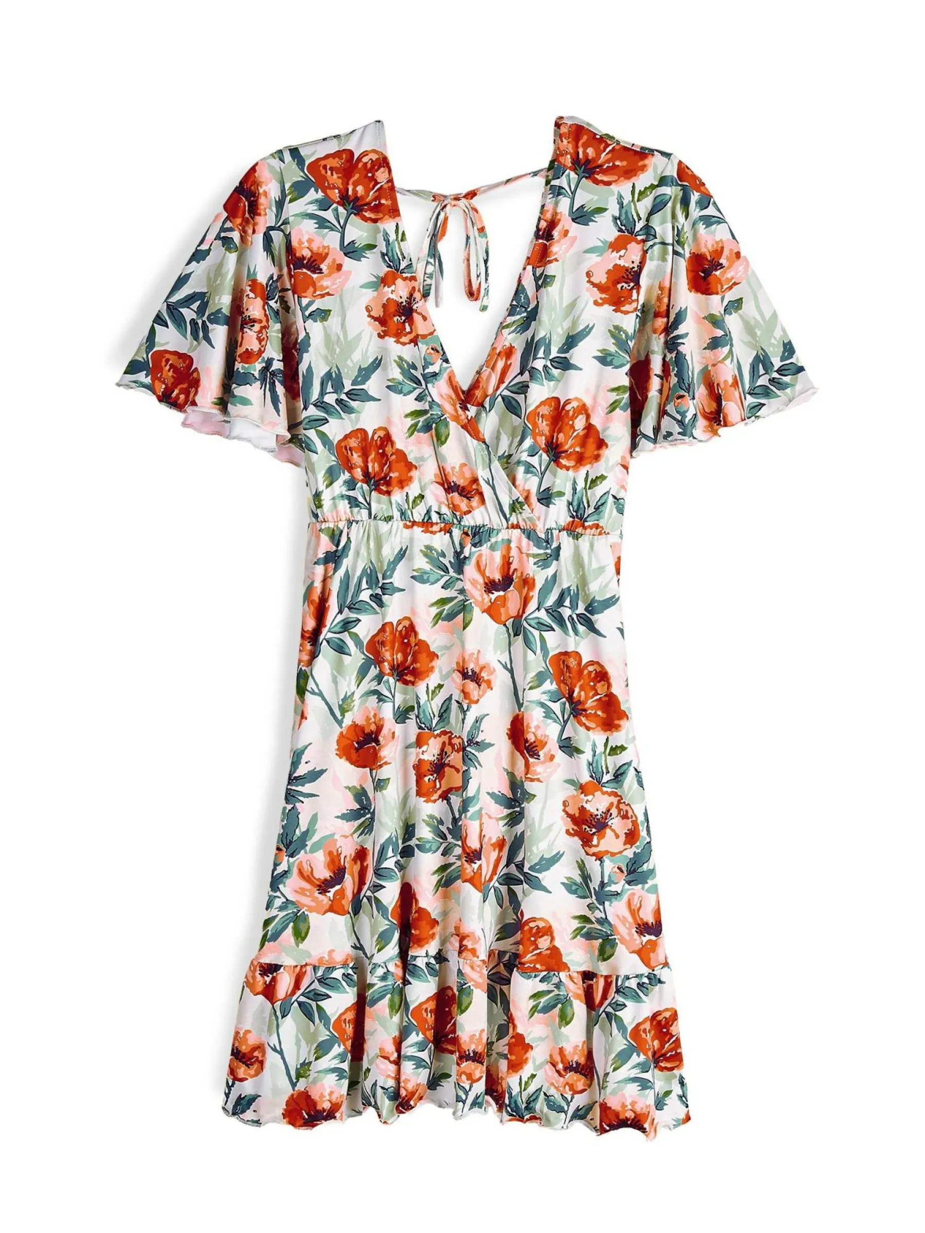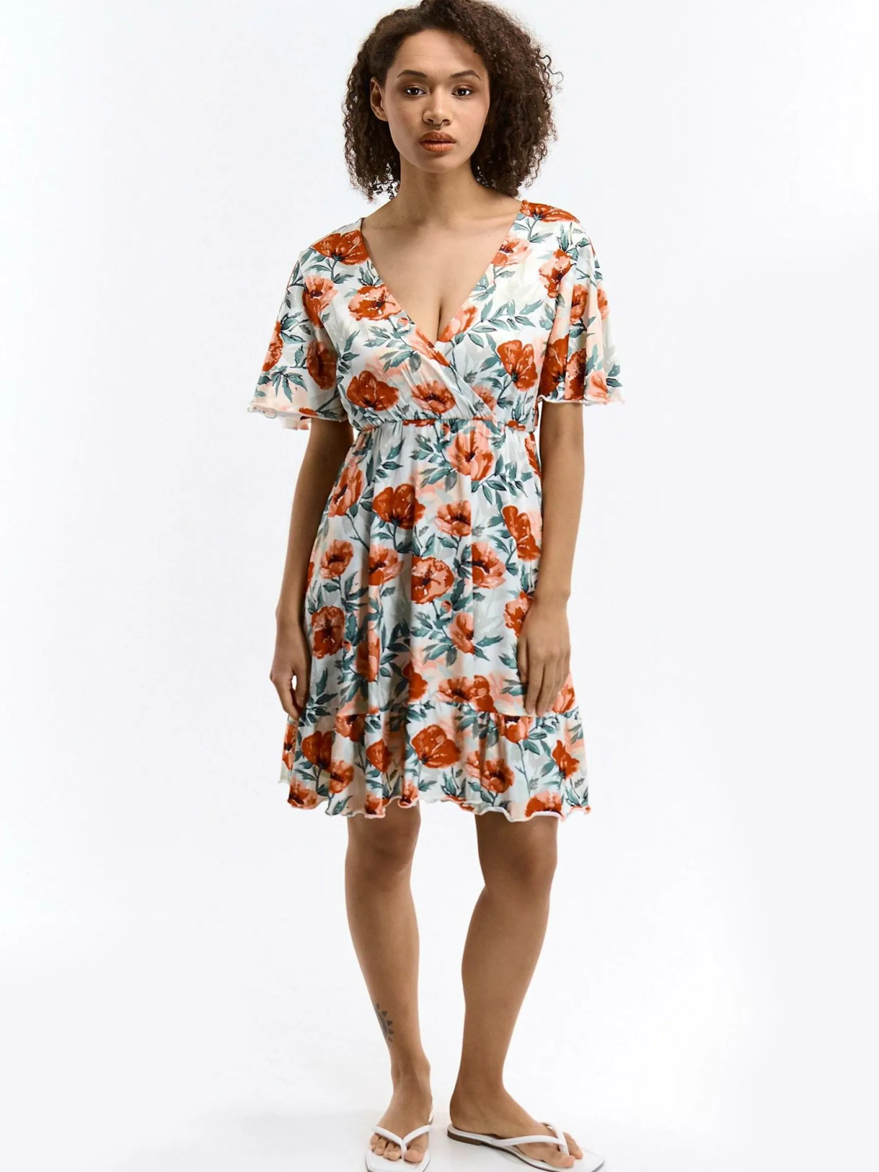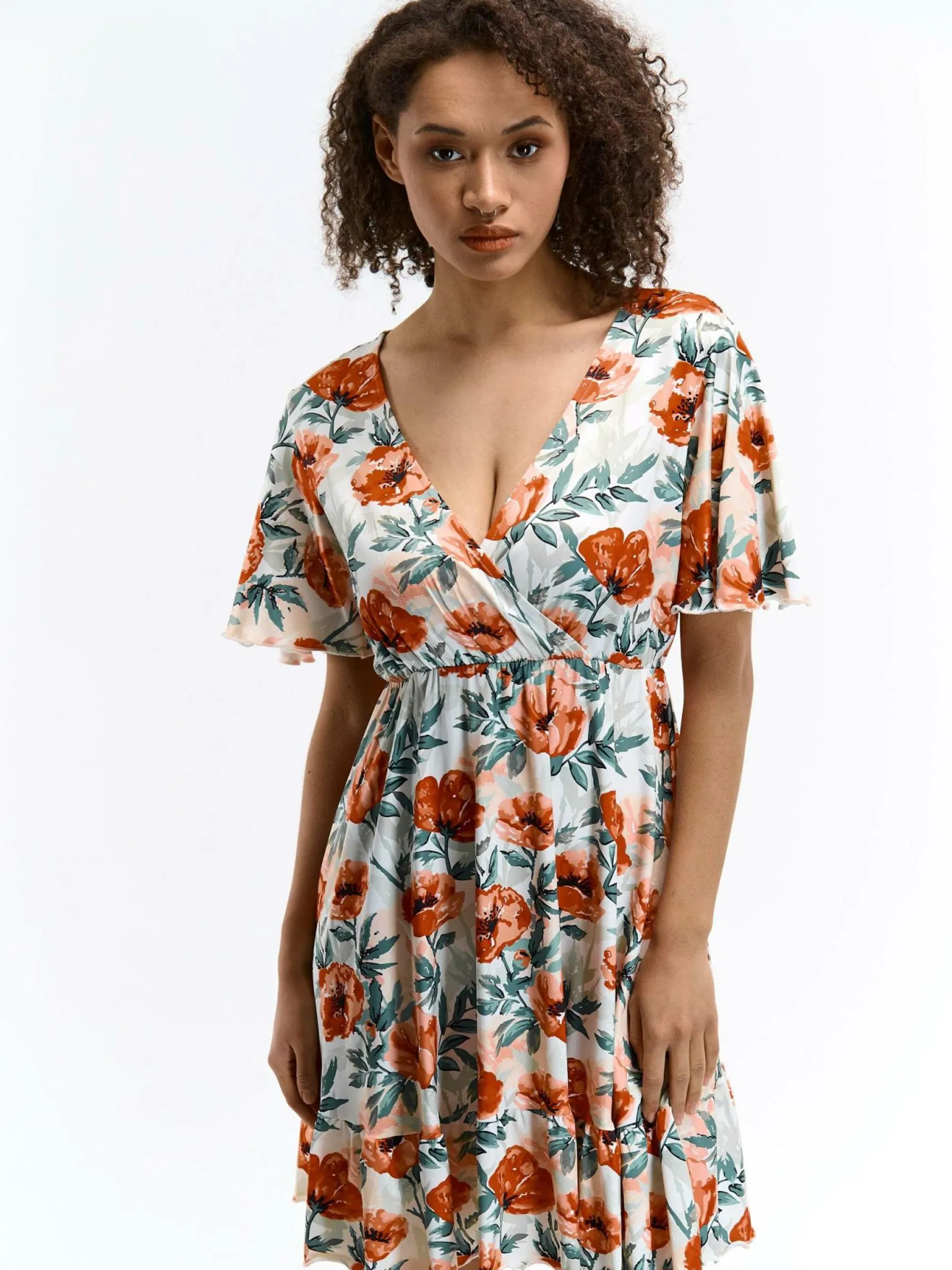 Kolor: białyKrój: kopertówki, asyTyp: sukienkaRekaw: krótki rękawDługość: miniPattern style: kwiatoweDetal: nad …
