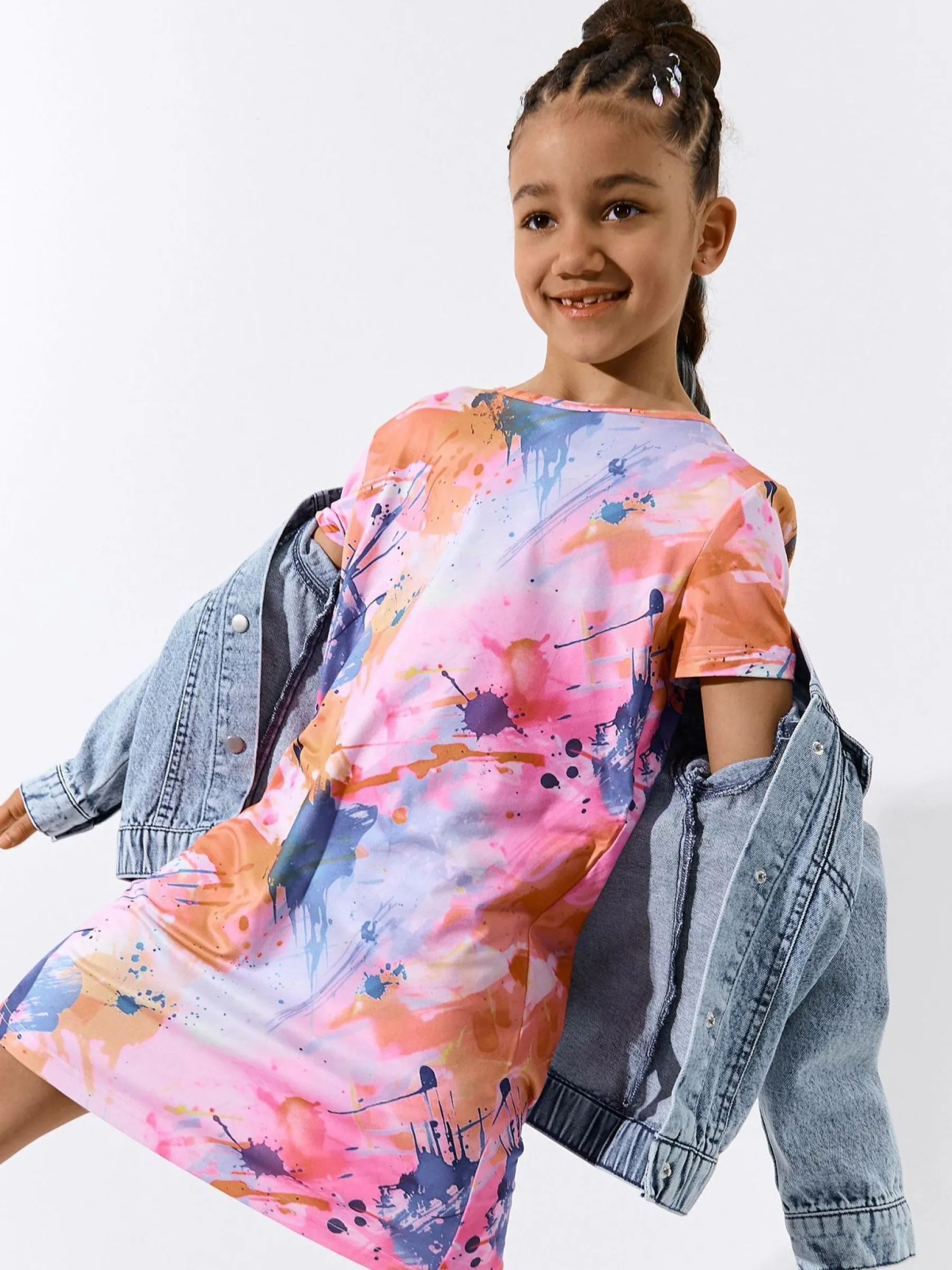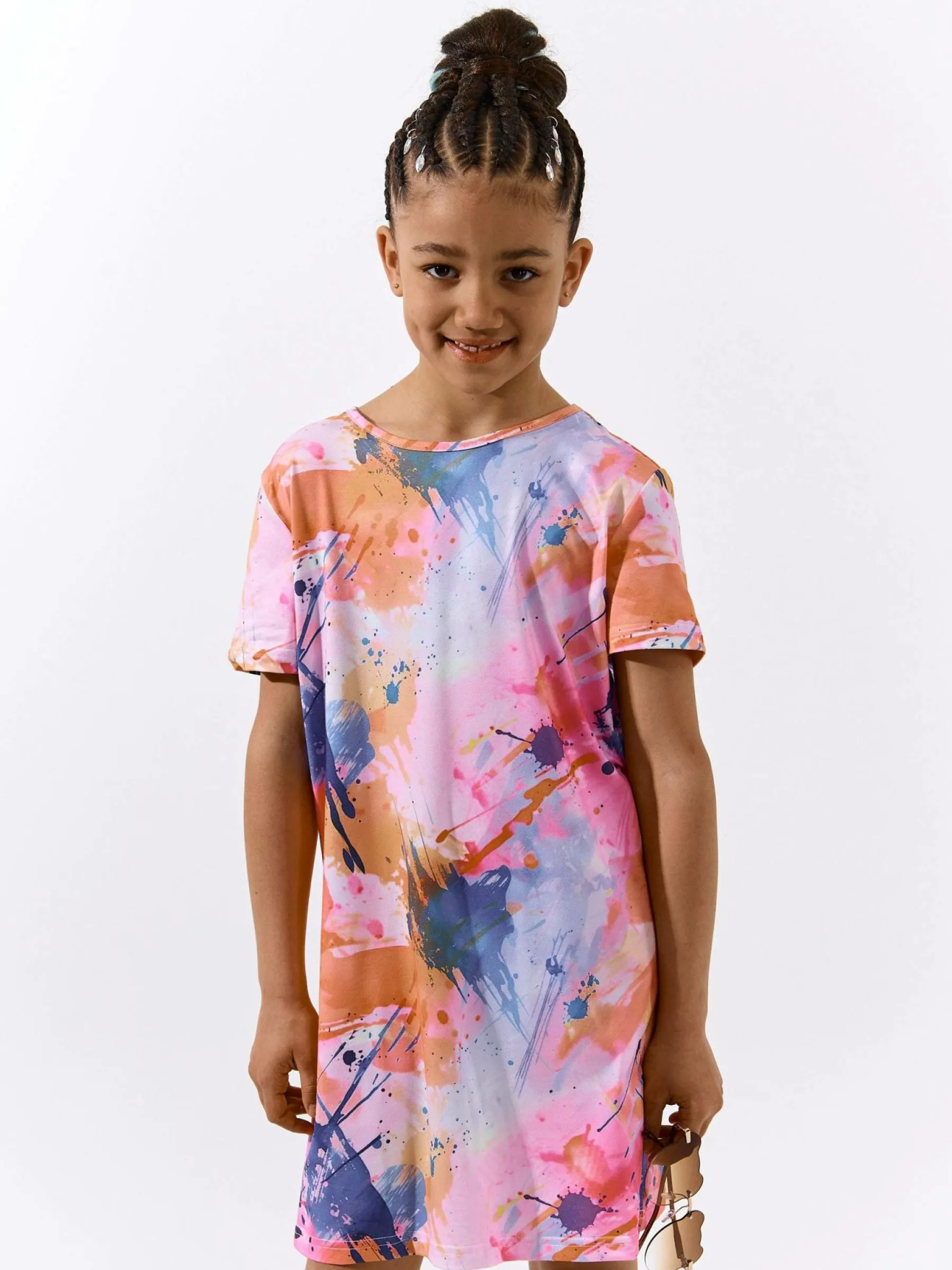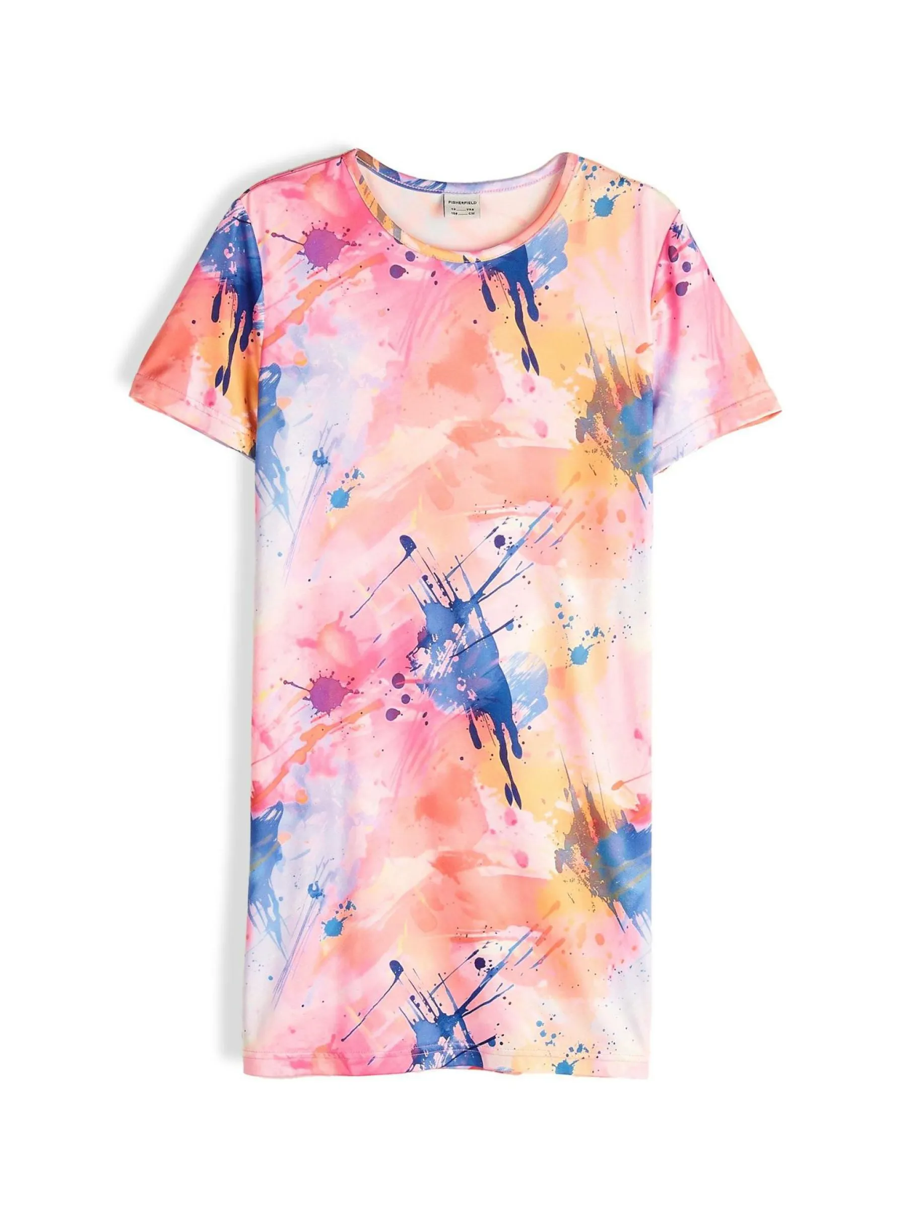 Kolor: różowyKrój: regularTyp: sukienkaRekaw: krótki rękawDługość: miniPattern style: z nadrukiemDetal: nad gło…