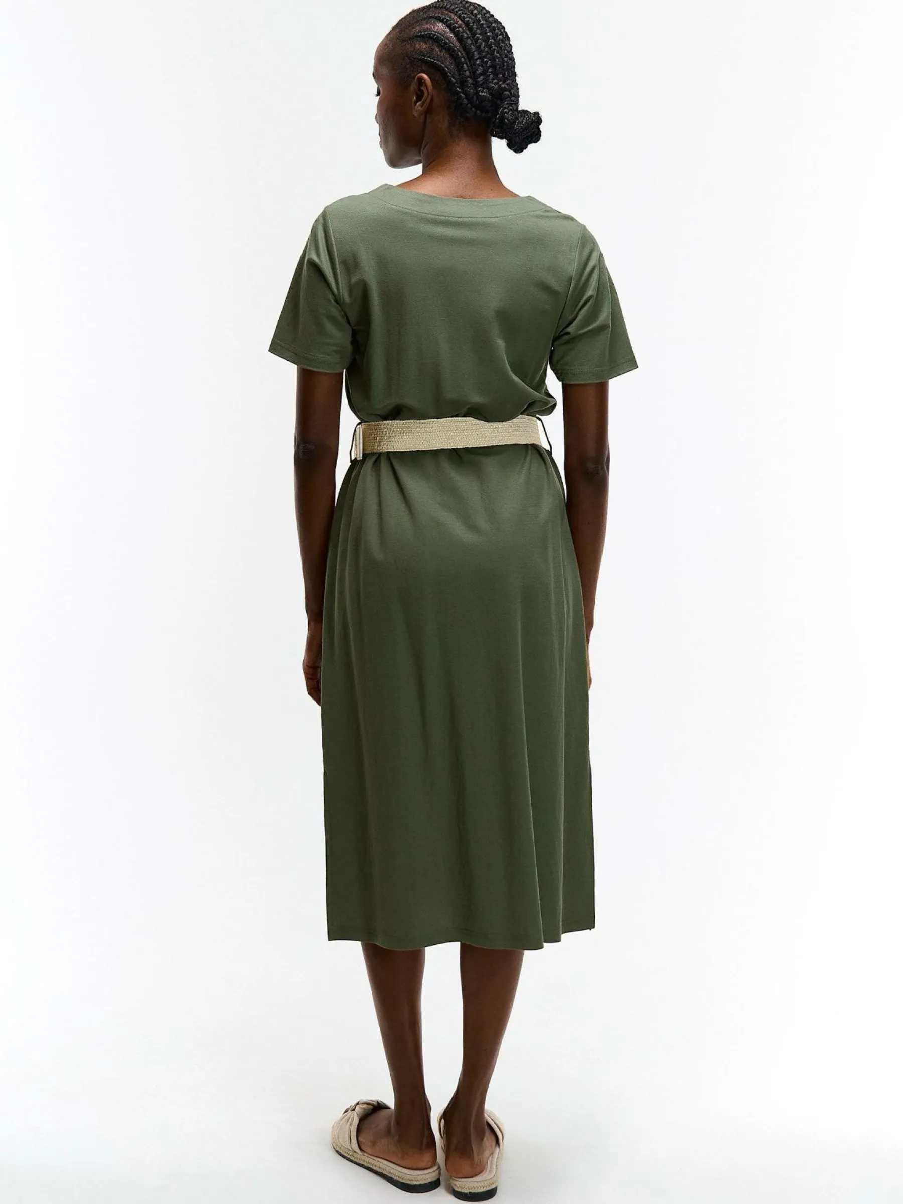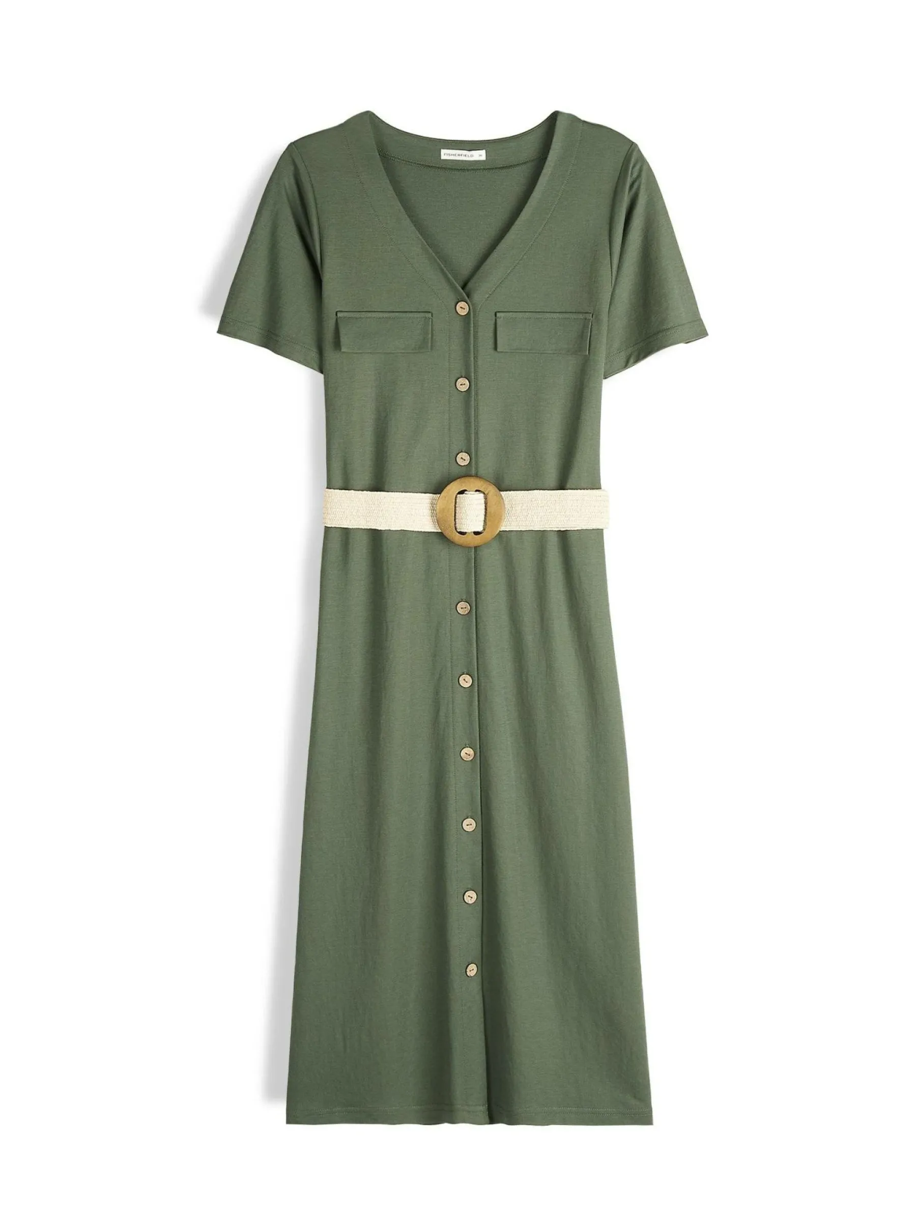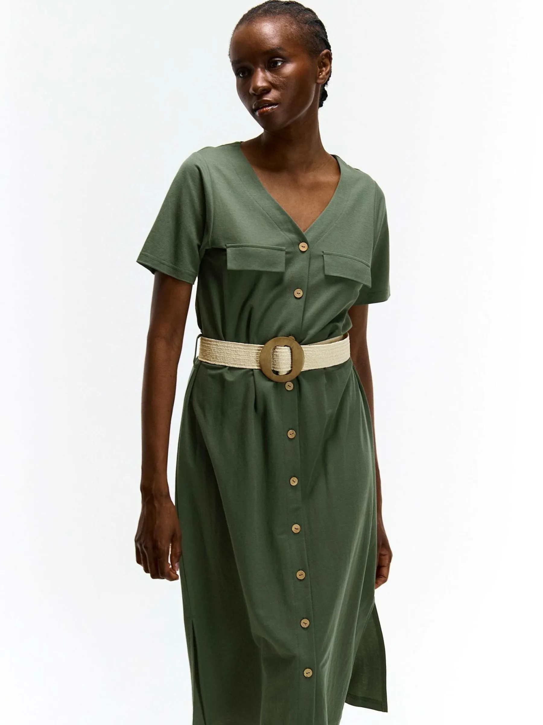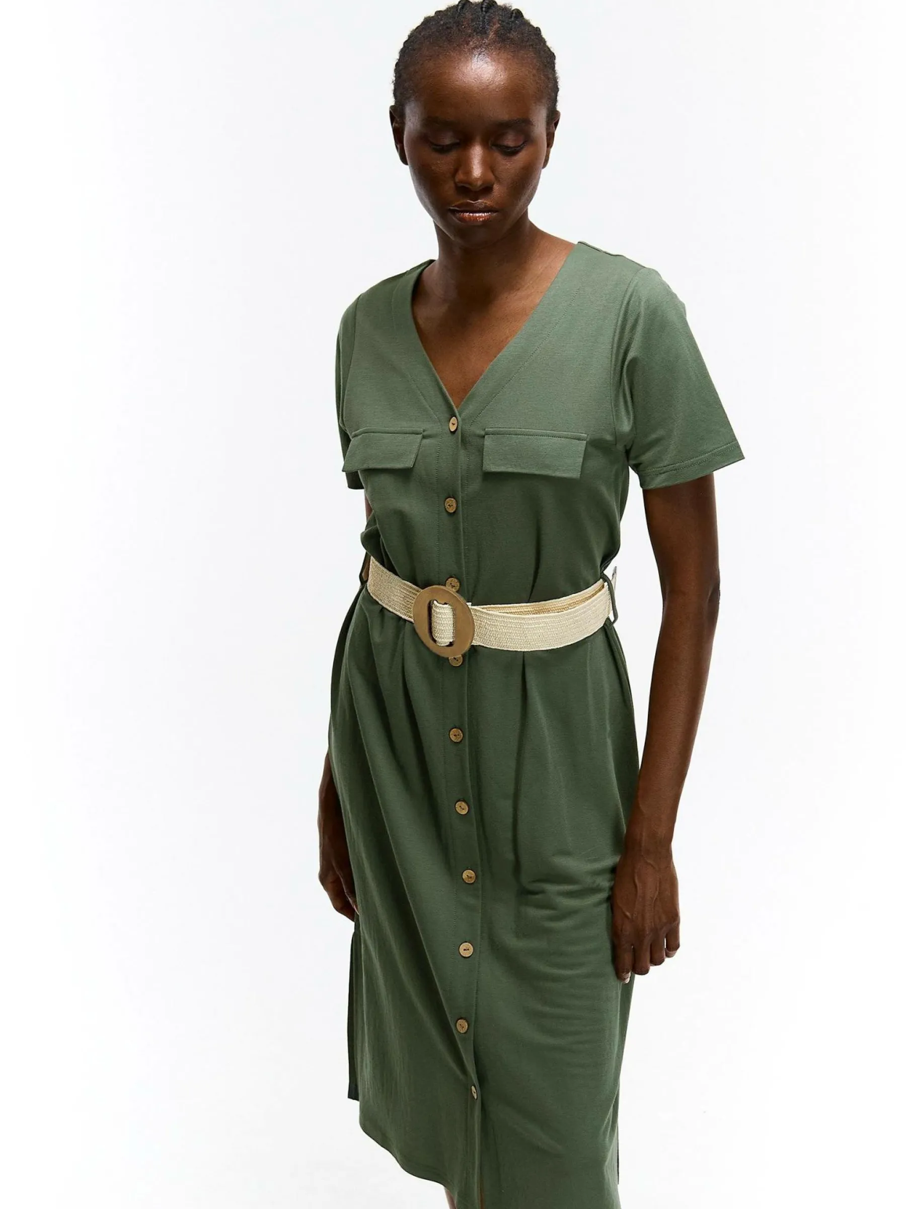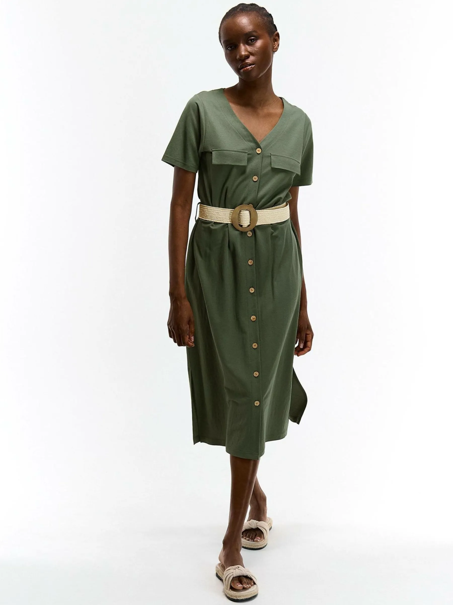 Kolor: khakiKrój: koszuloweTyp: sukienkaRekaw: krótki rękawDługość: midiPattern style: pojedynczy kolorDetal: na g…