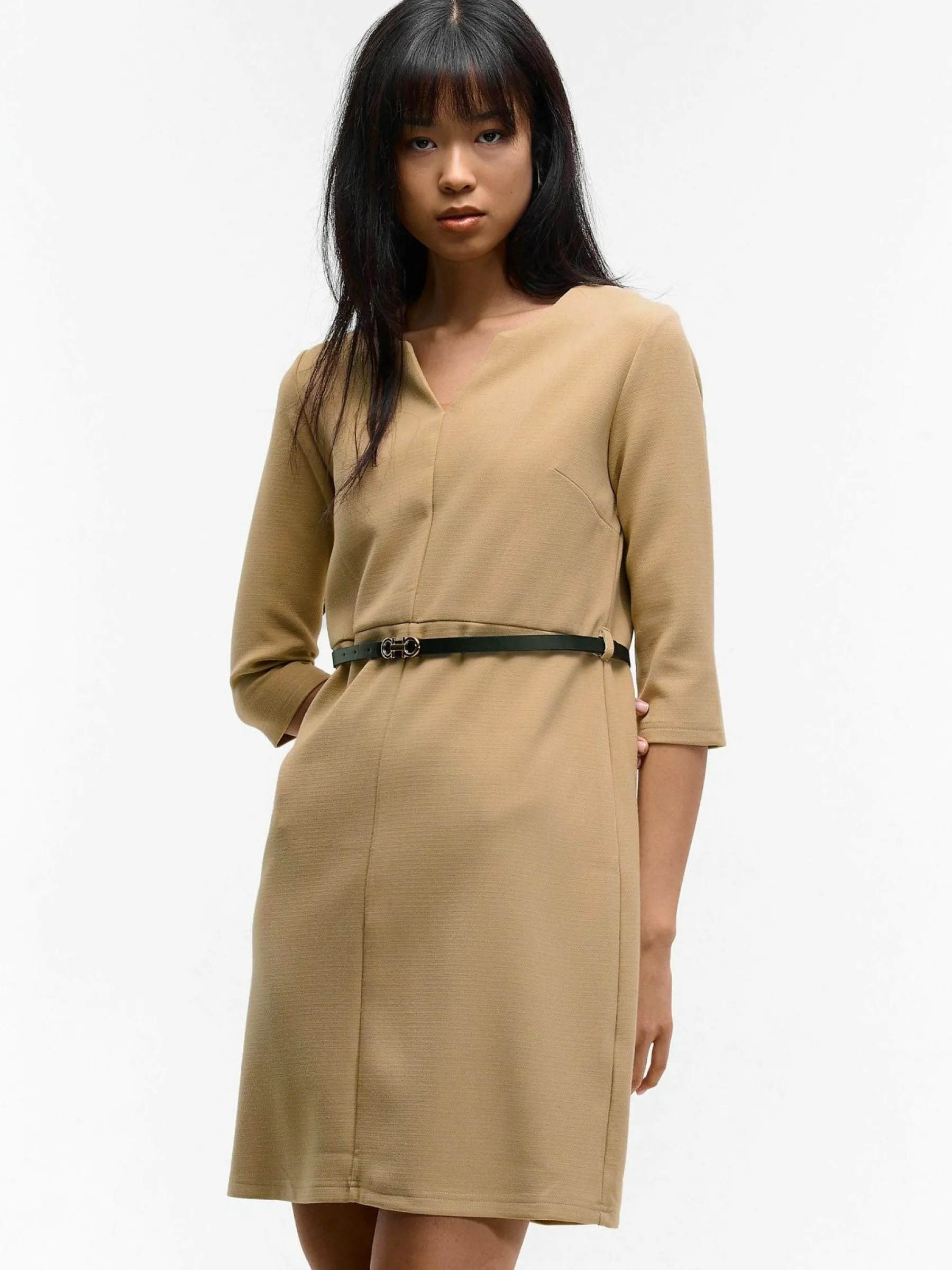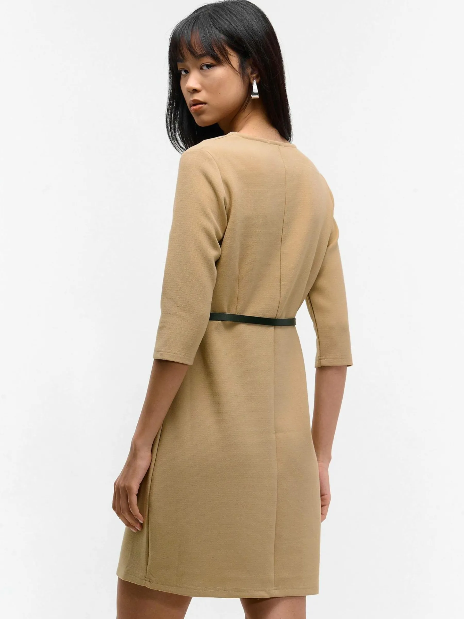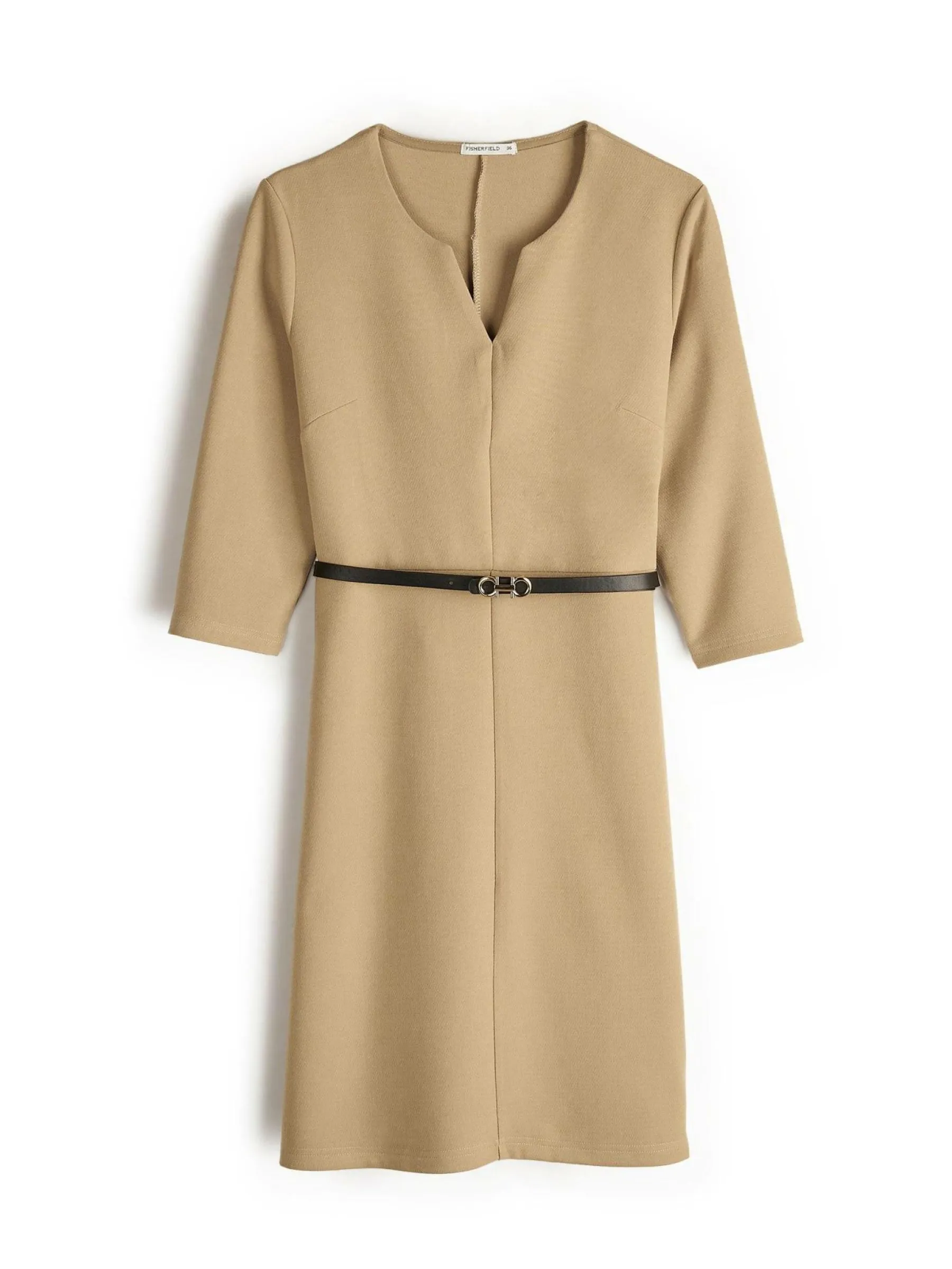 Kolor: beżowyKrój: regularTyp: sukienkaRekaw: rękaw 3/4Długość: miniPattern style: pojedynczy kolorDetal: z paskie…