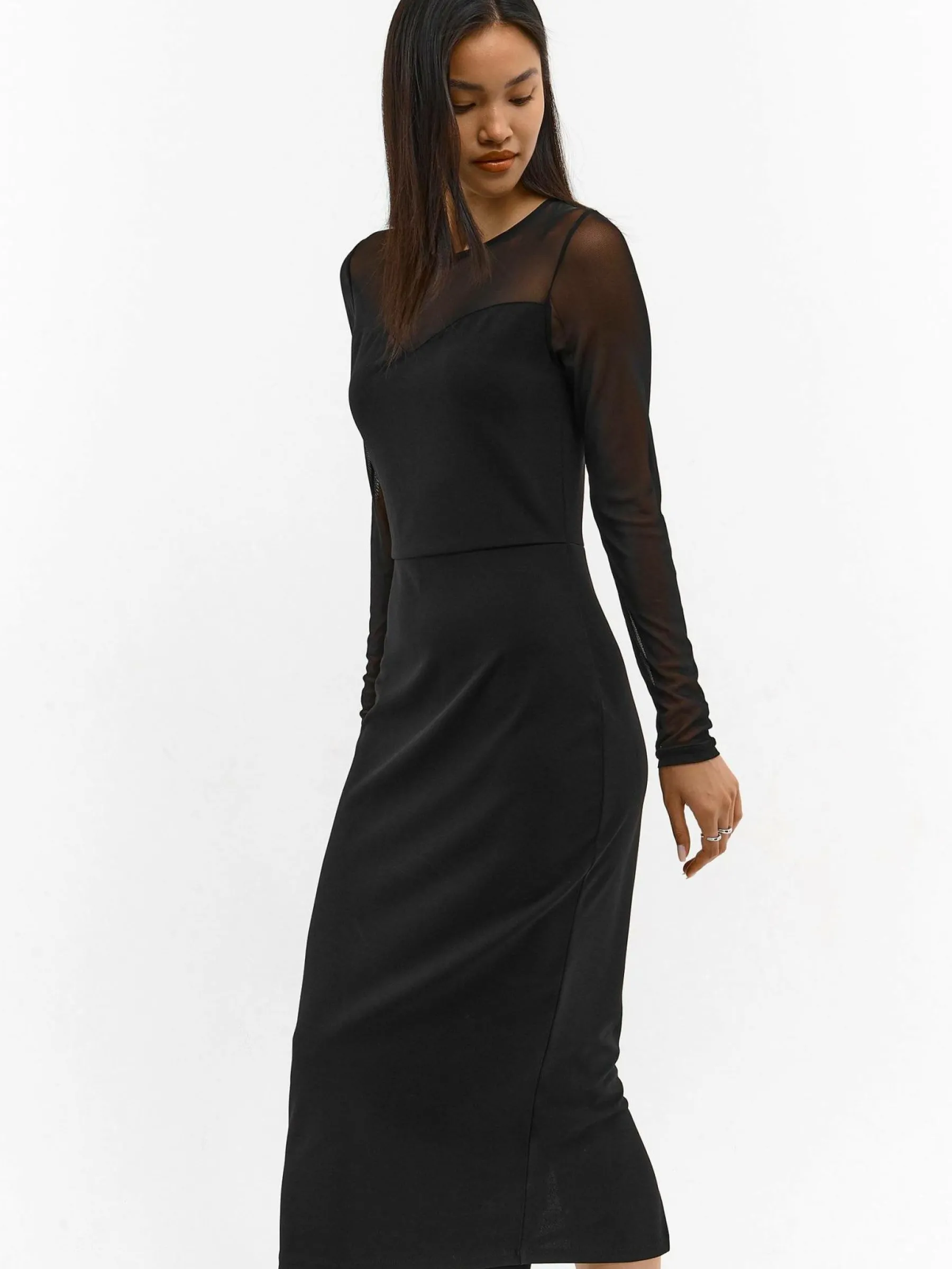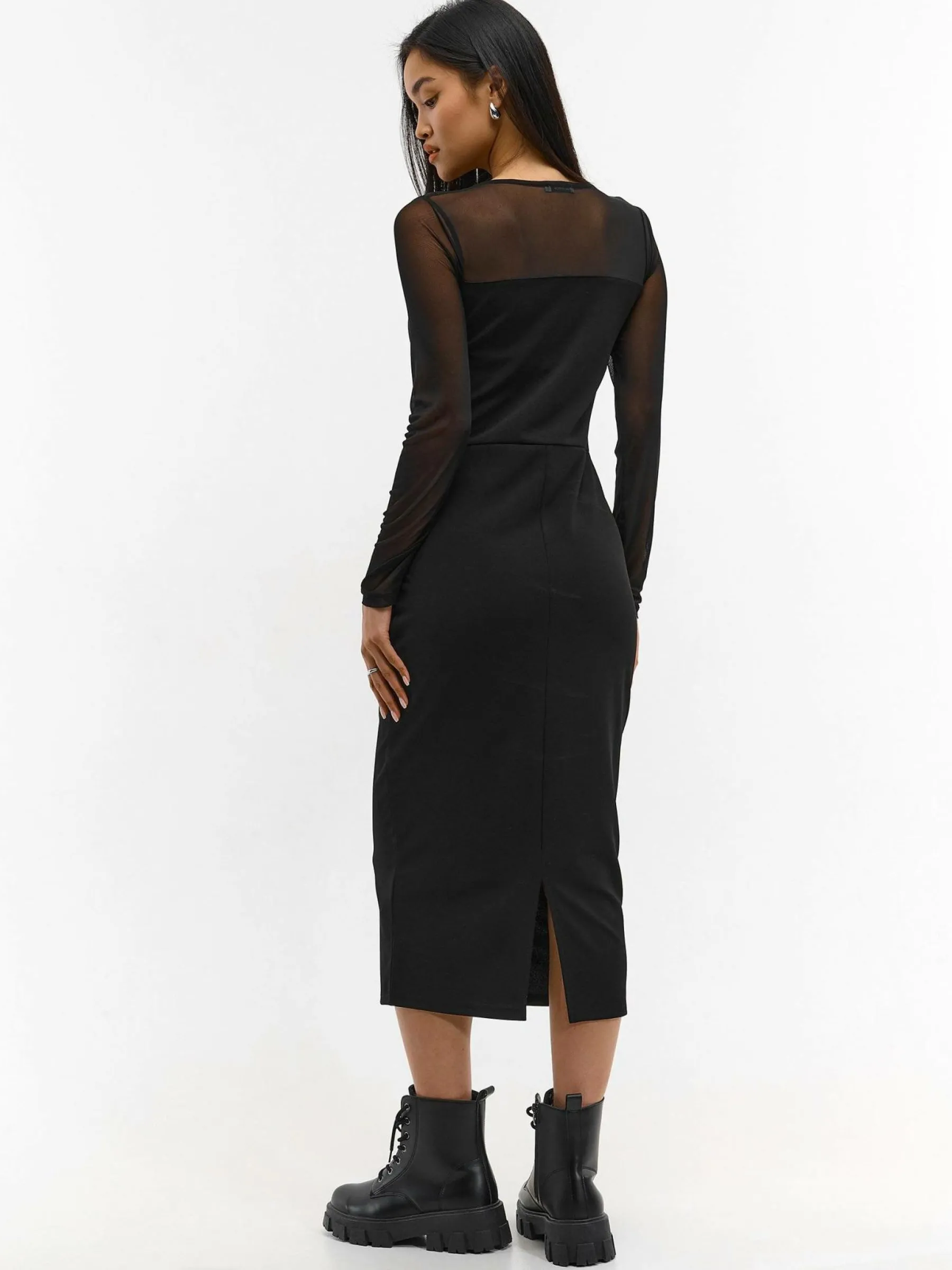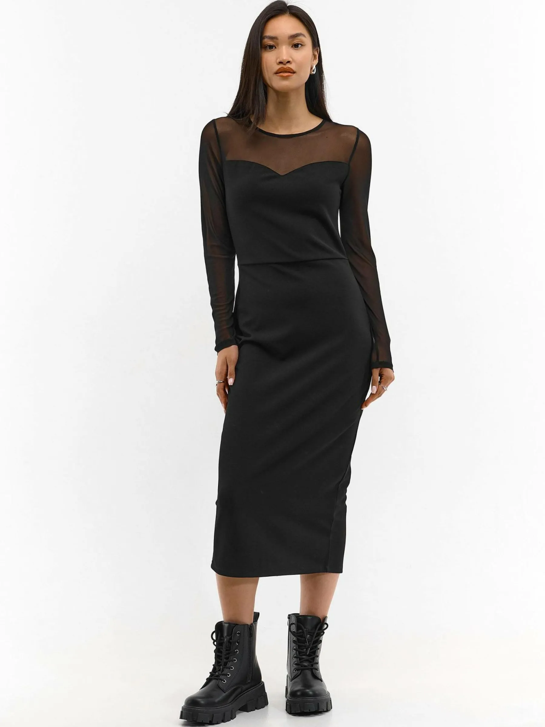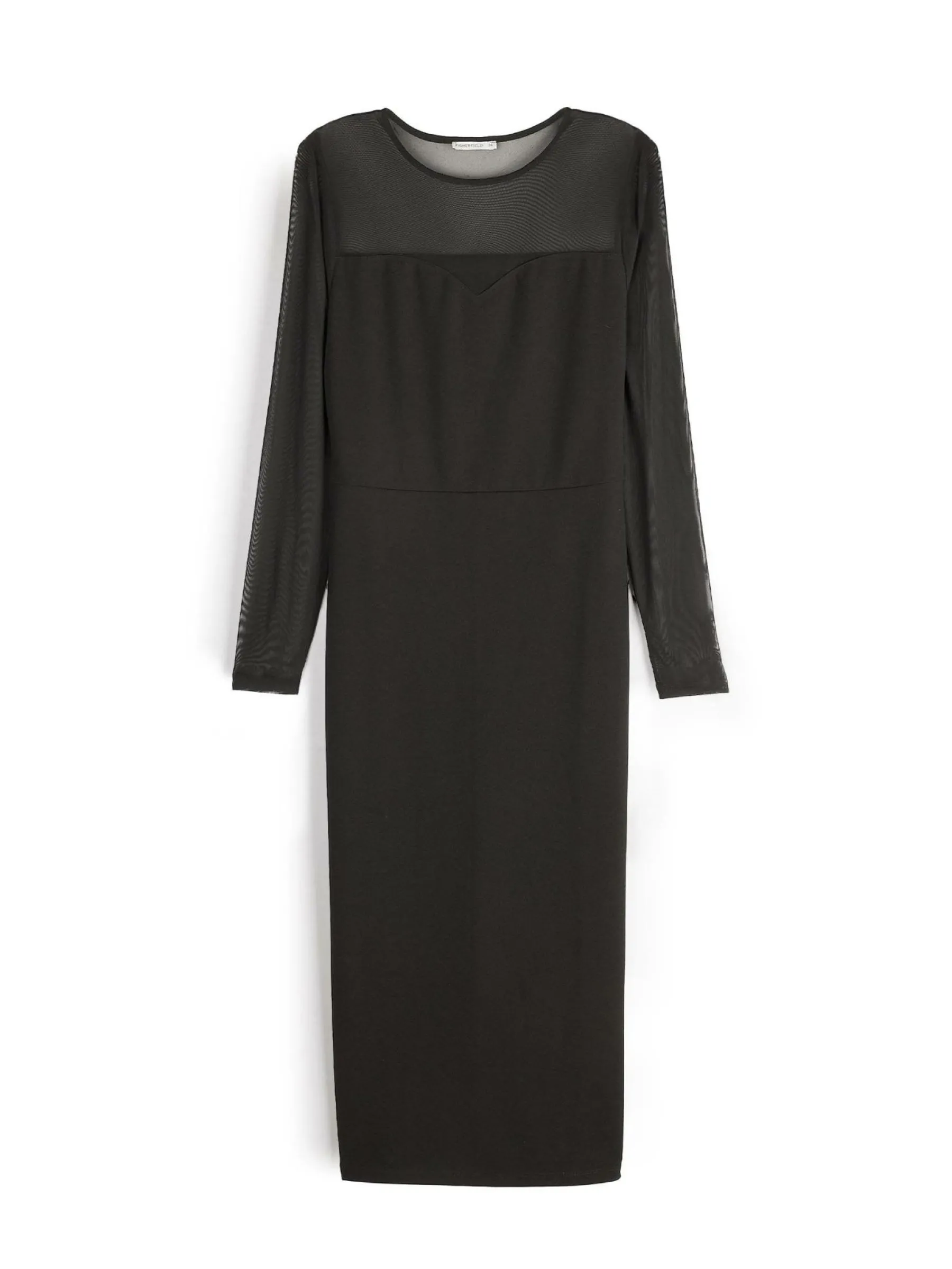 Kolor: czarnyKrój: ołówkoweTyp: sukienkaRekaw: długi rękawDługość: midiPattern style: pojedynczy kolorDetal: z r…
