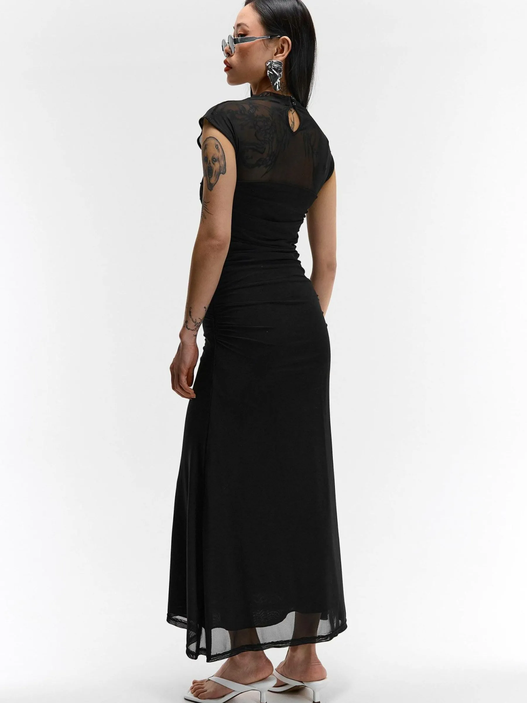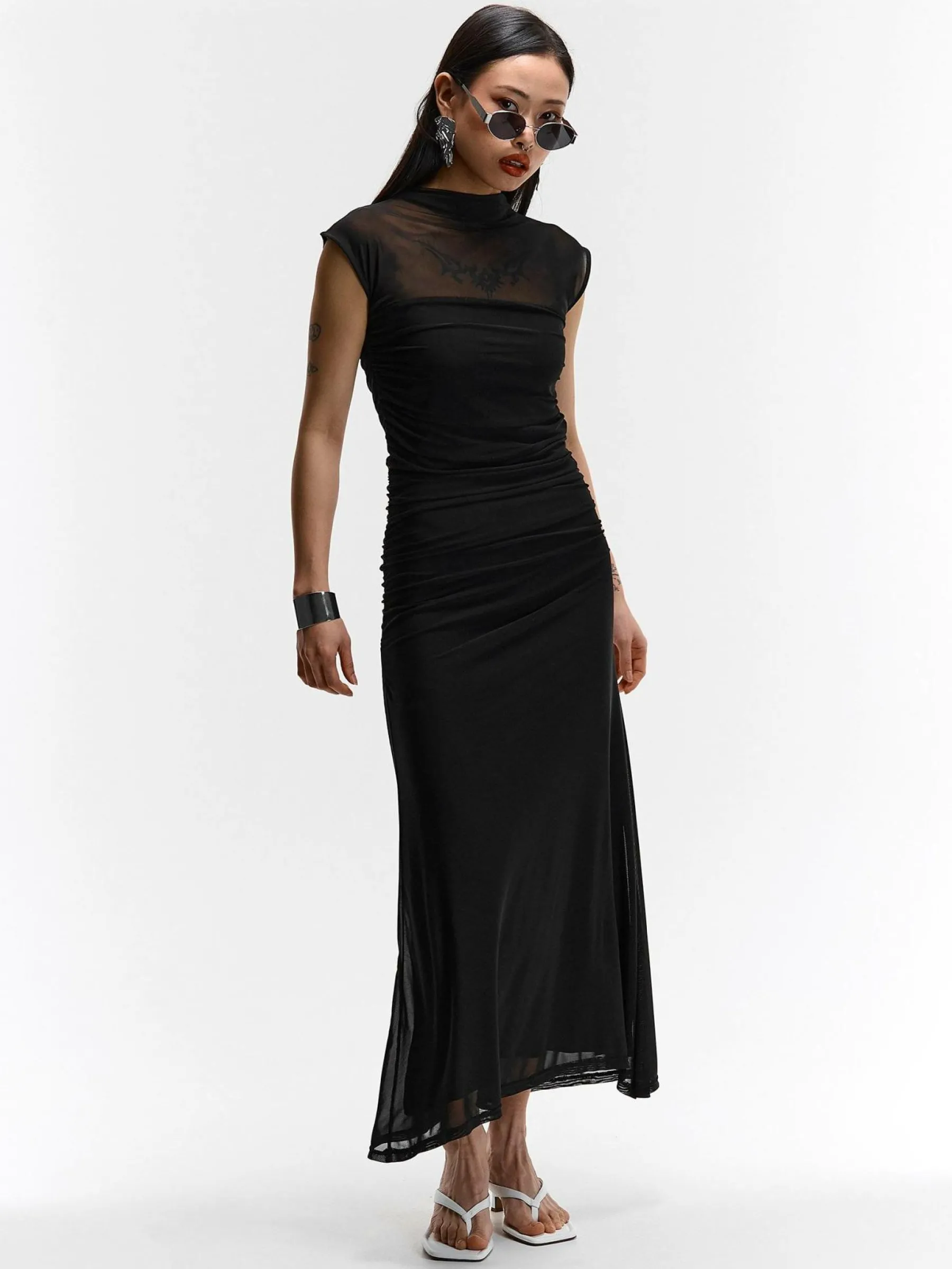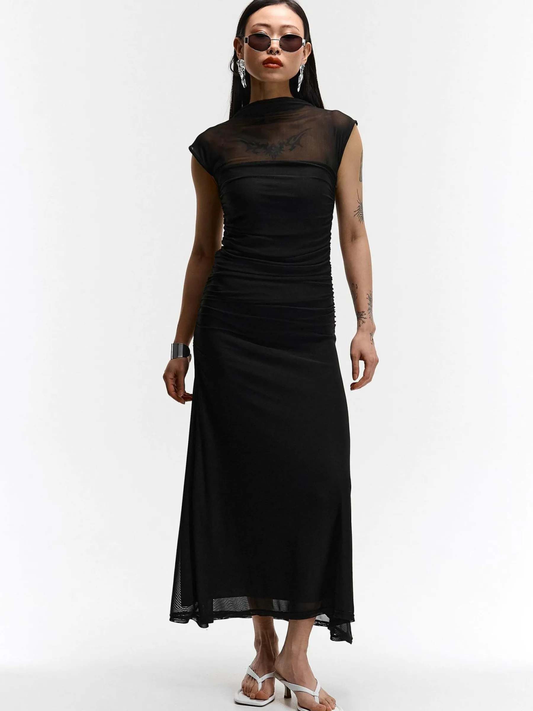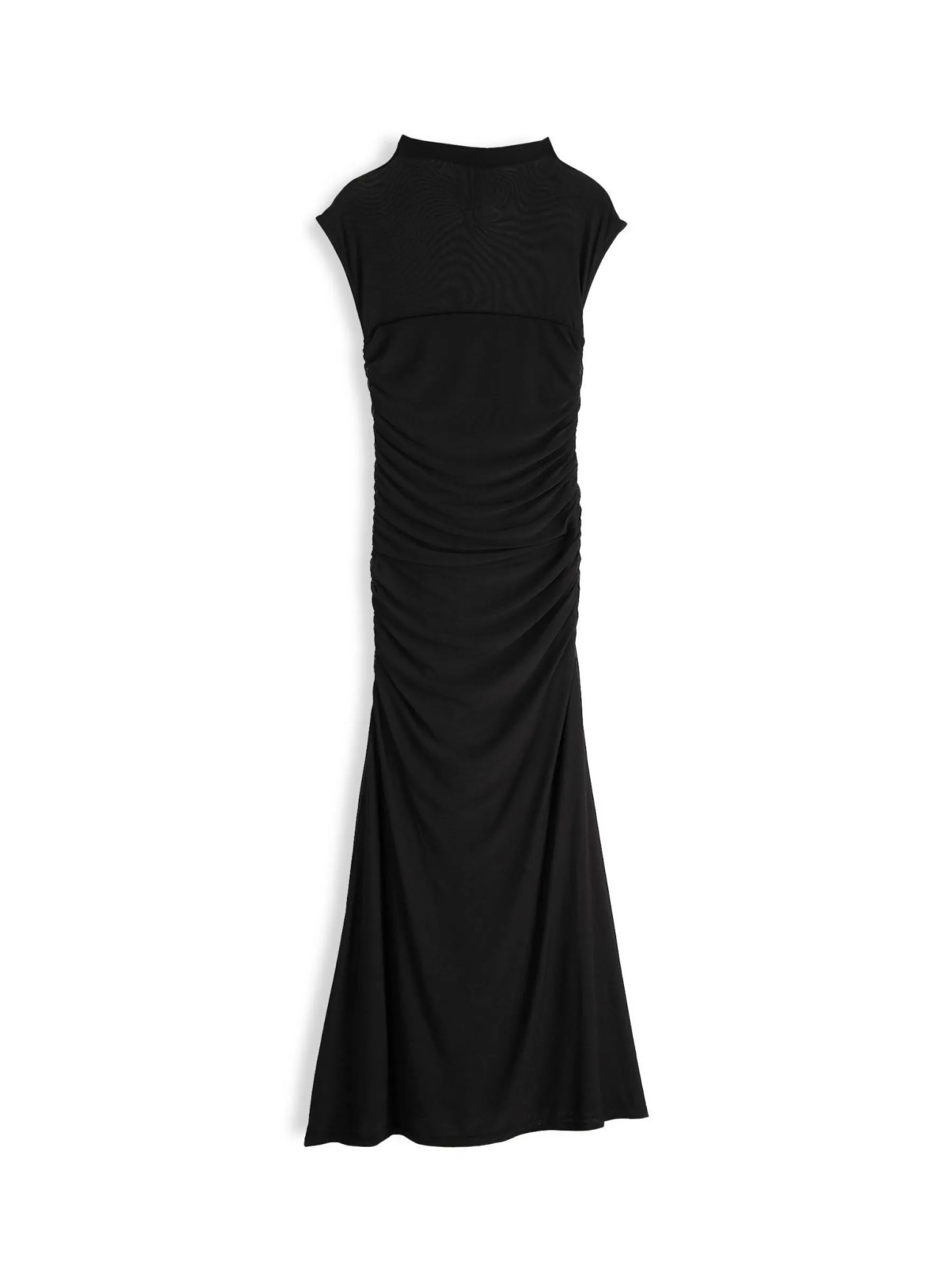 Kolor: czarnyKrój: z marszczeniemTyp: sukienkaRekaw: bez rękawówDługość: maxiPattern style: pojedynczy kolorDetal:…
