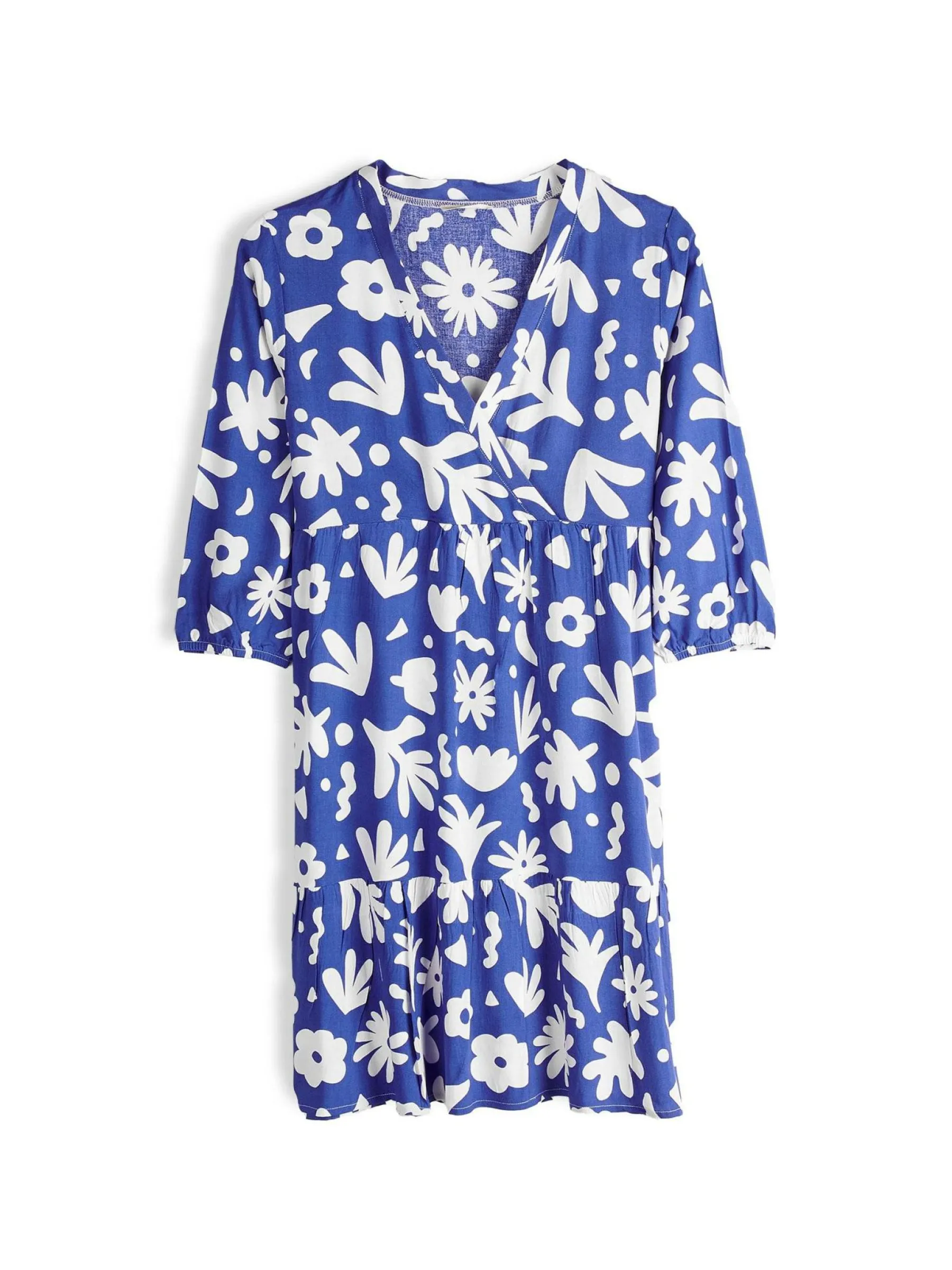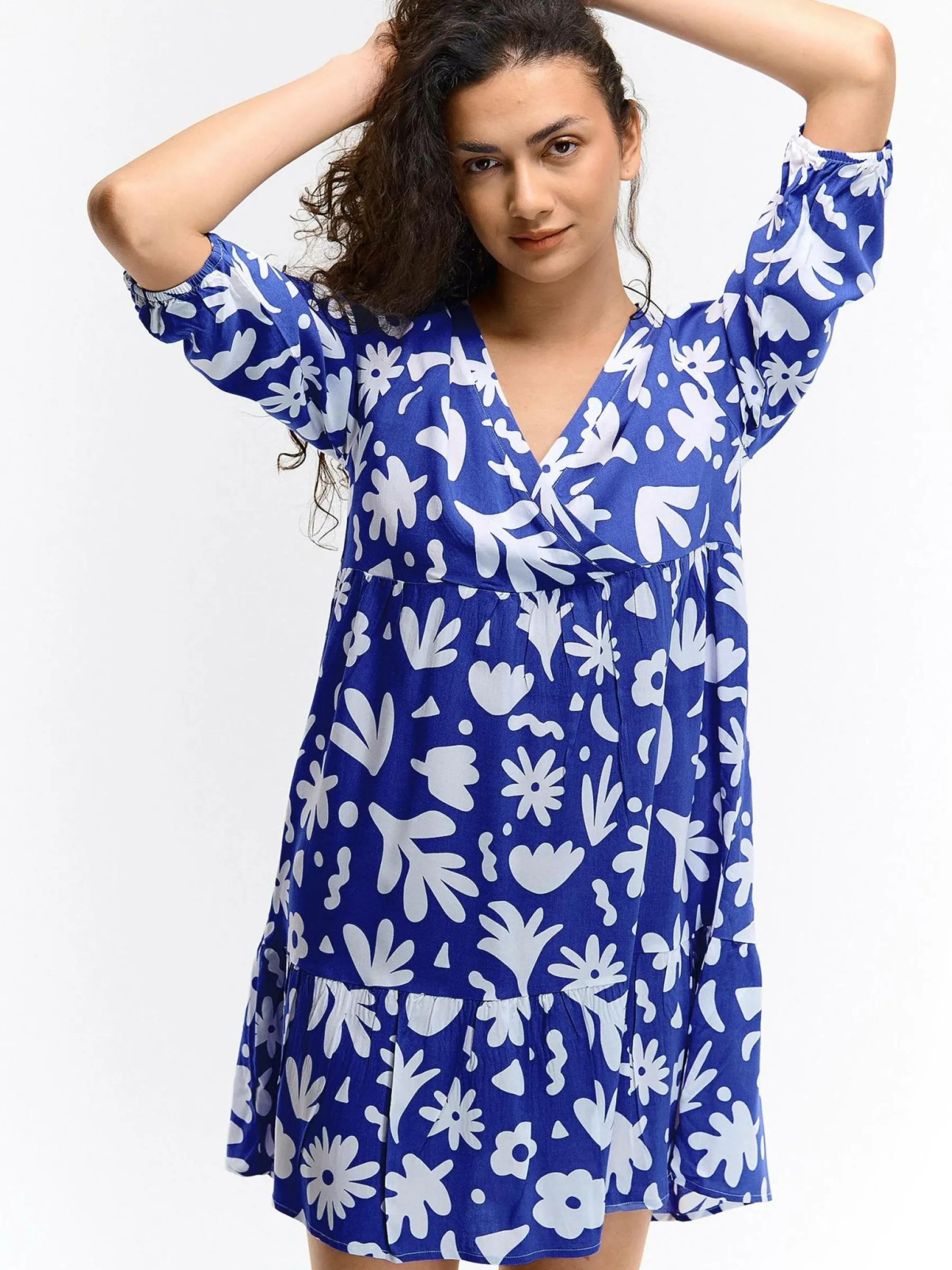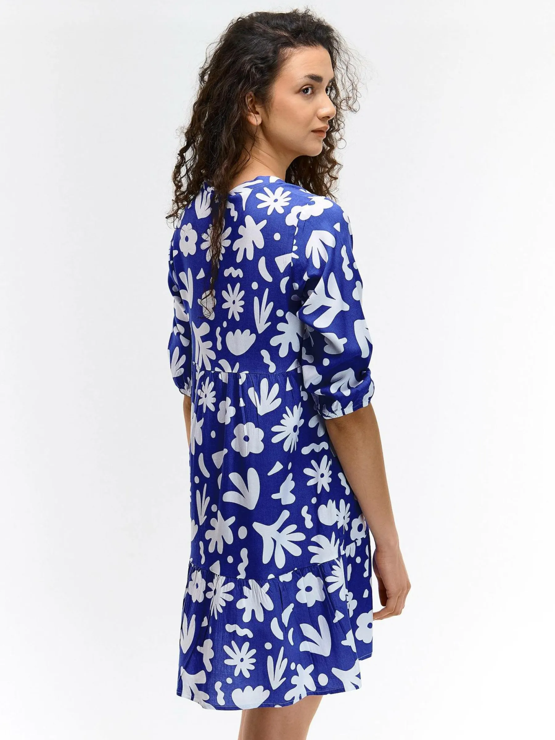 Kolor: niebieskiKrój: z falbanąTyp: sukienkaRekaw: rękaw 3/4Długość: miniPattern style: z nadrukiemDetal: v-neck, …