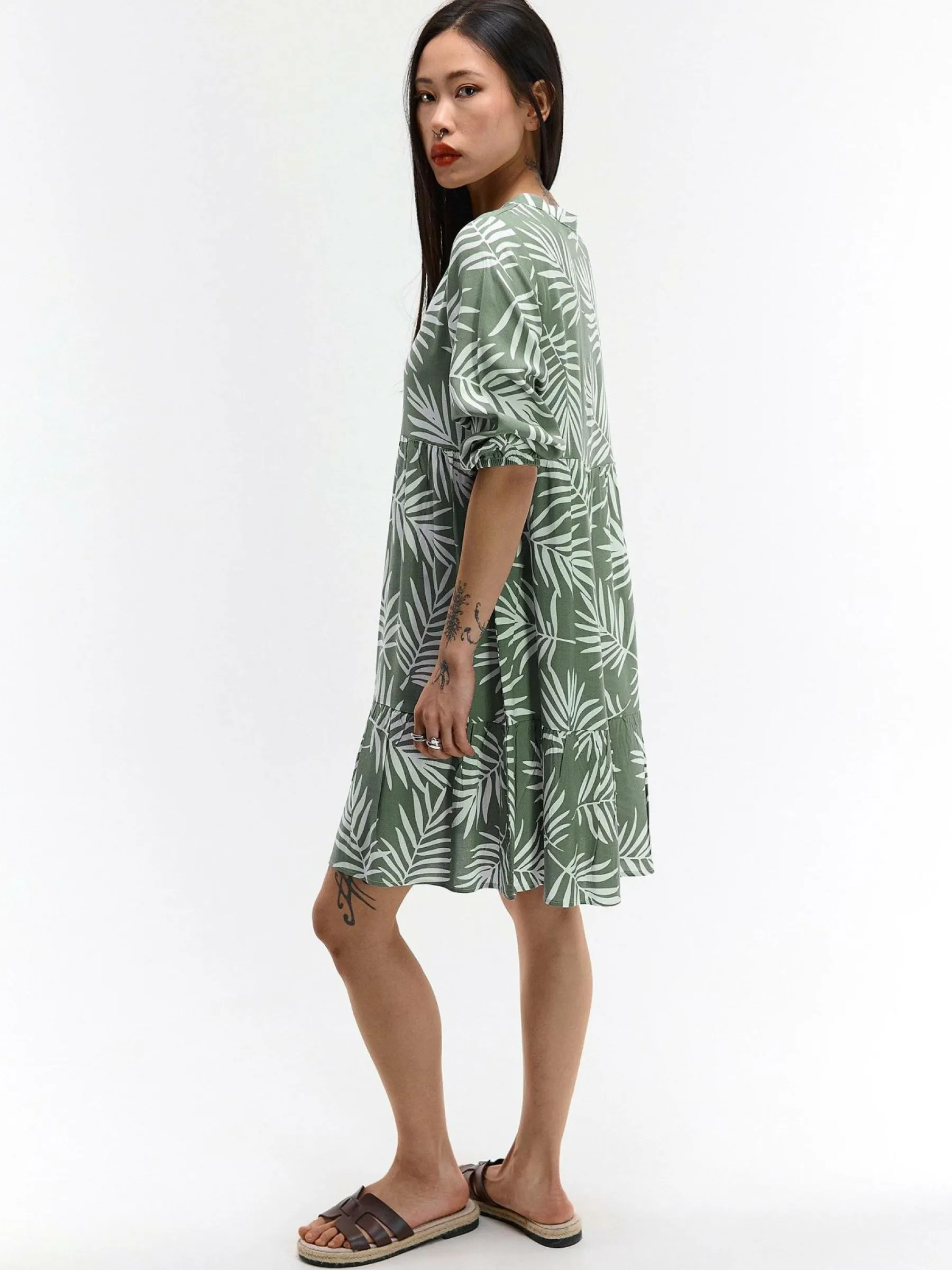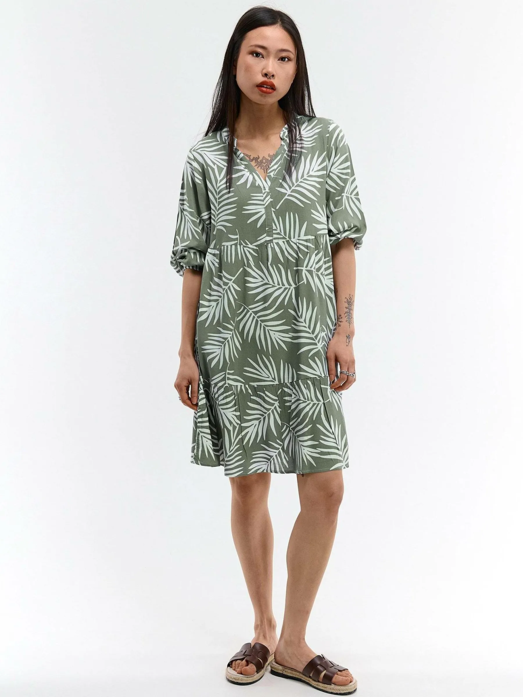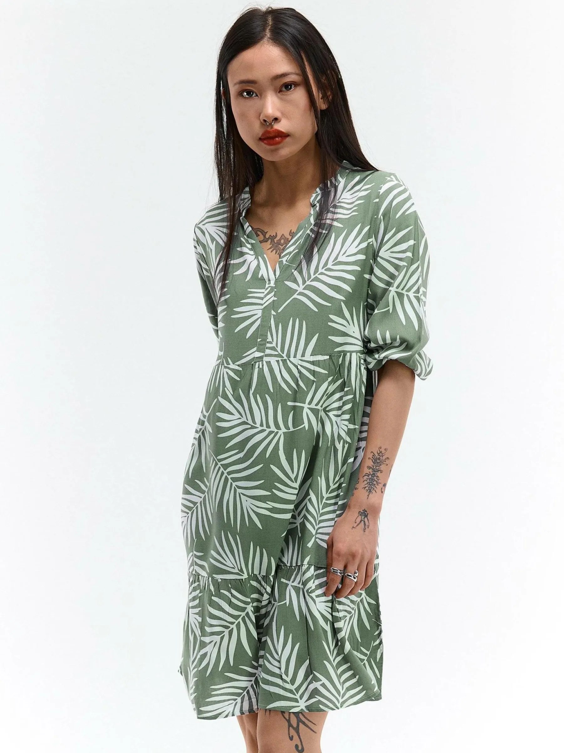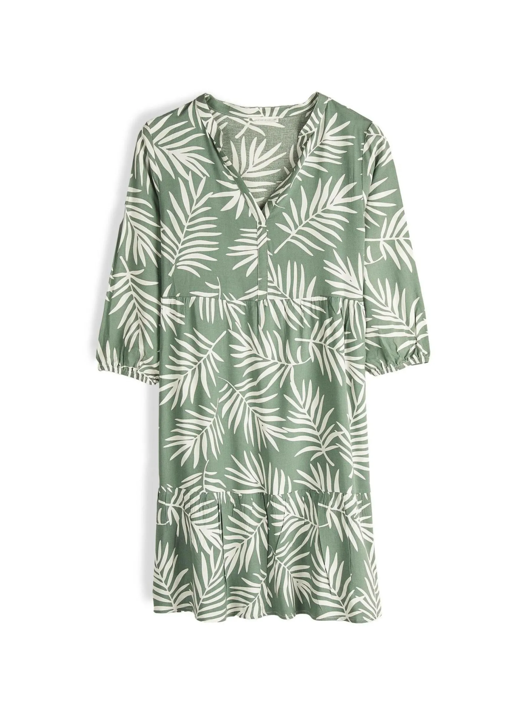 Kolor: zielonyKrój: z falbanąTyp: sukienkaRekaw: rękaw 3/4Długość: miniPattern style: z nadrukiemDetal: v-neck, na…